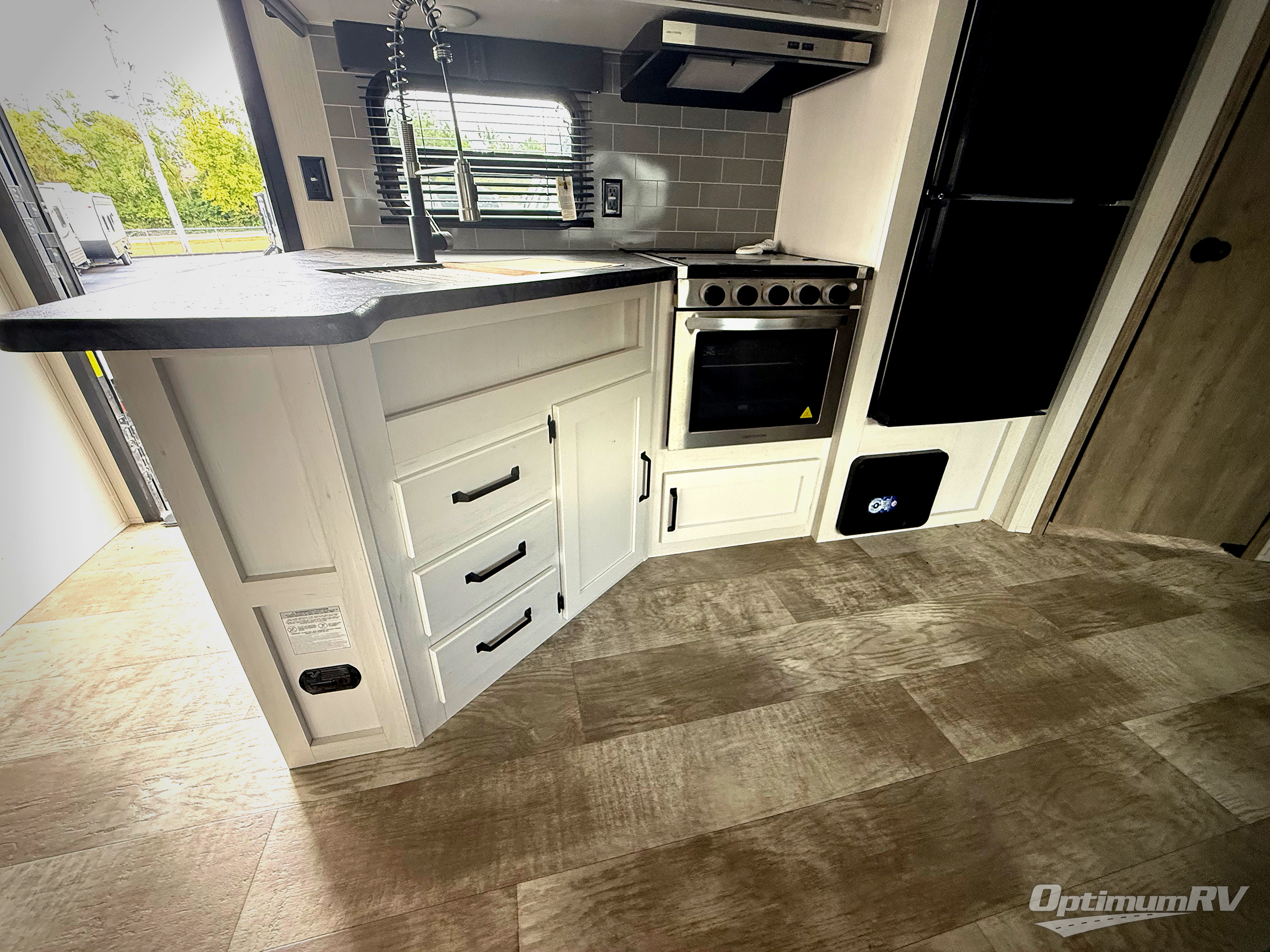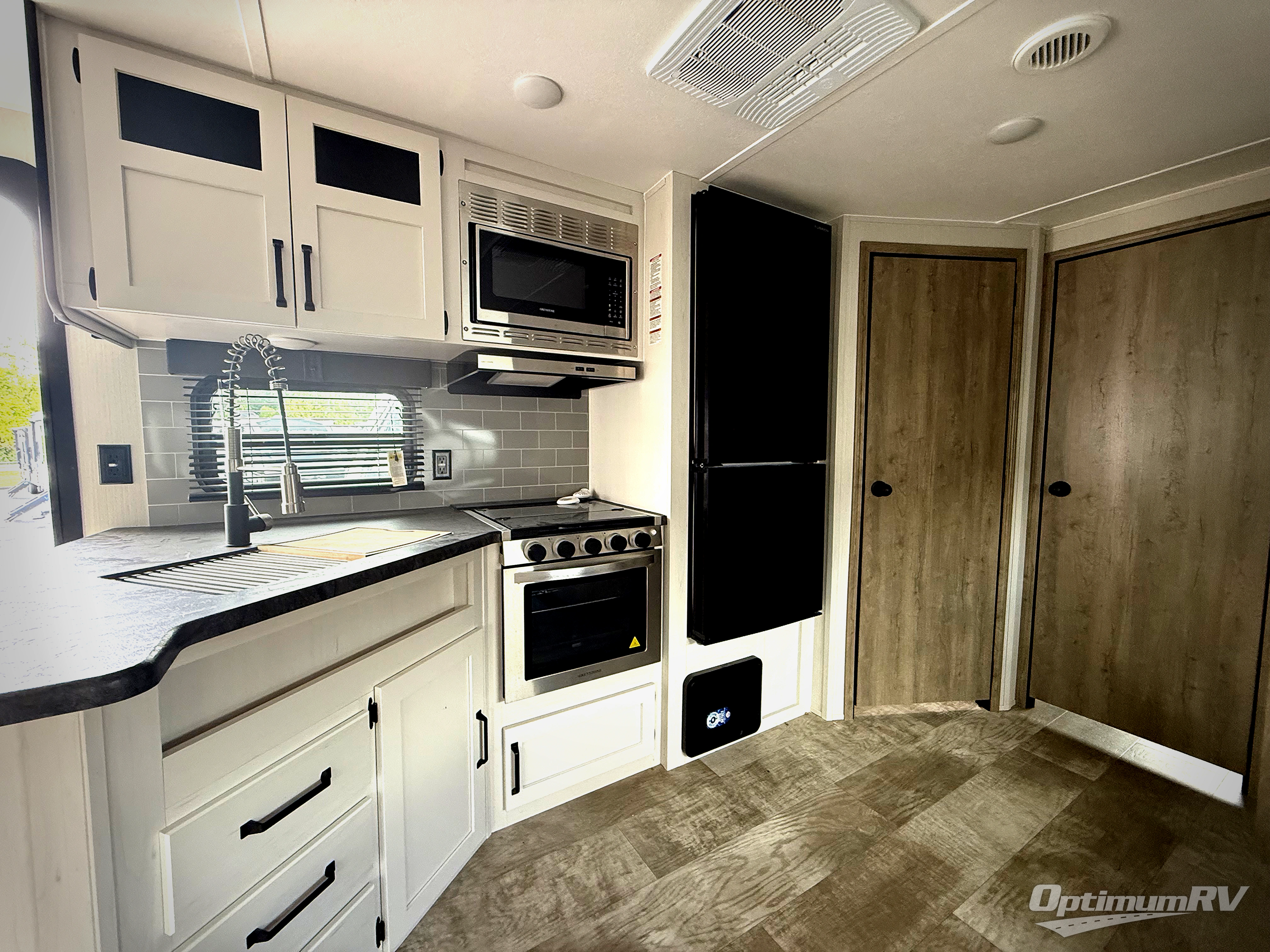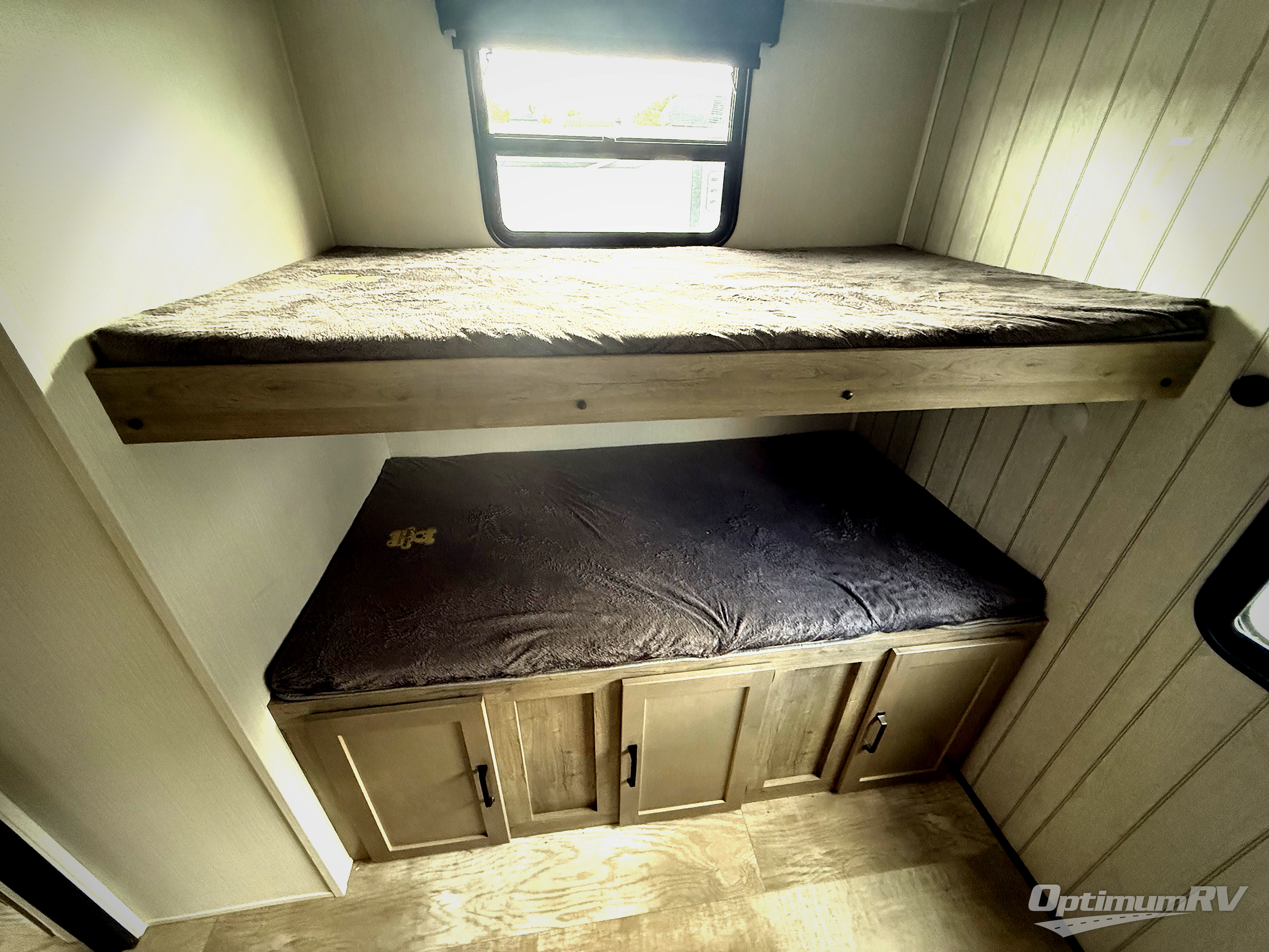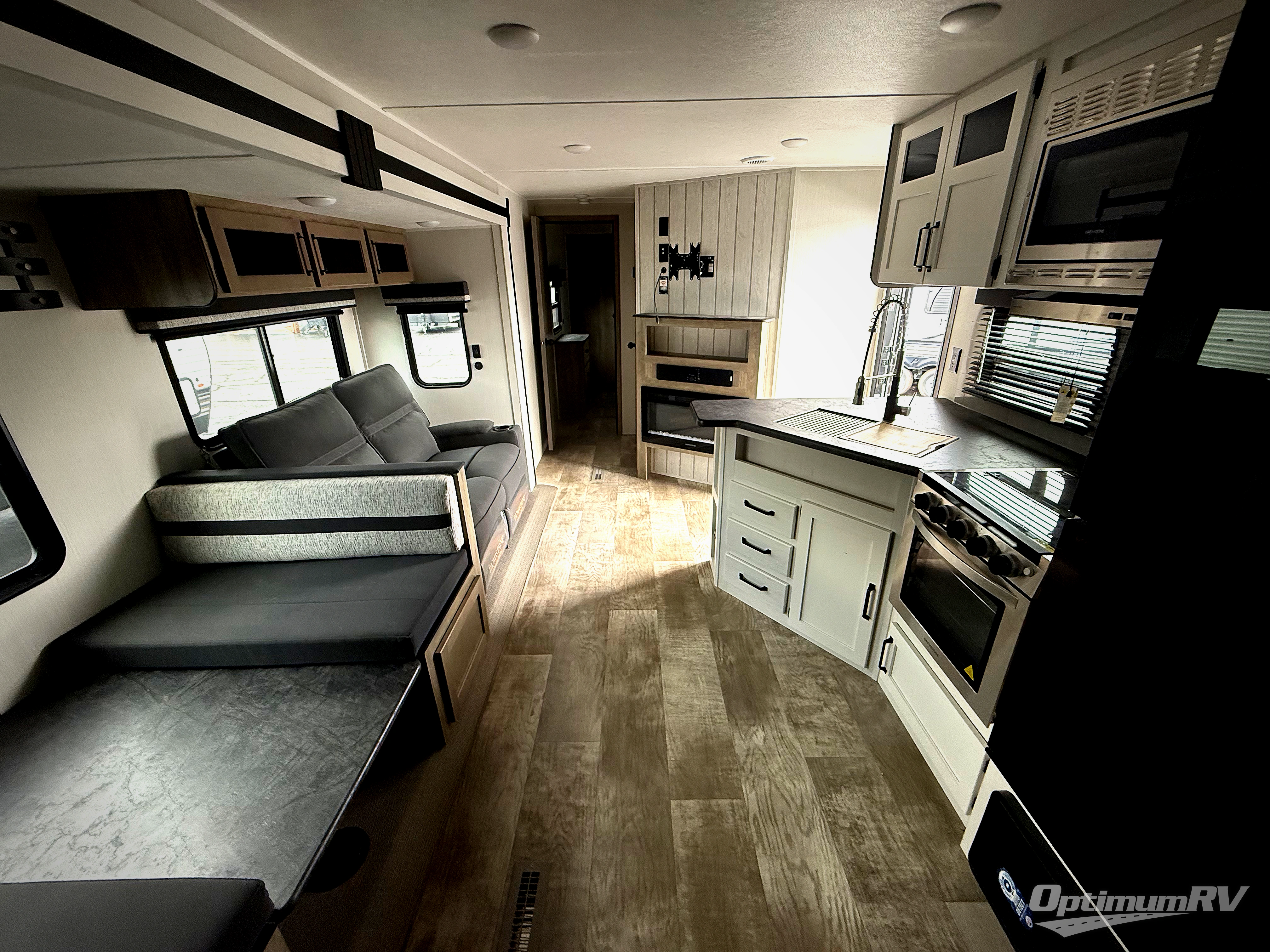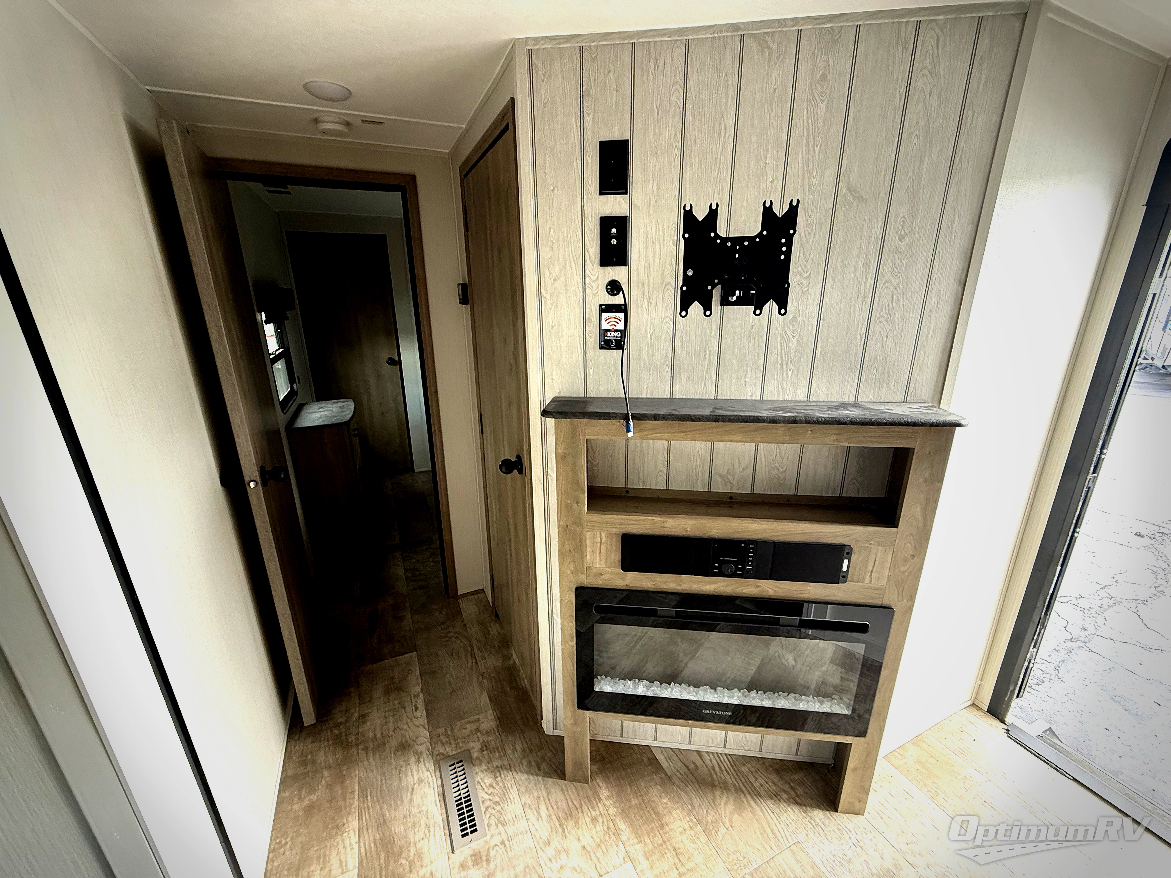 With dual entry doors and a bath and a half, you will have the ultimate in convenience with this travel trailer! The bedroom also has a front closet to keep your clothes looking their best and a queen bed slide for you to sleep your best. Everyone can freshen up in the full bathroom with the 34" x 34" radius shower and fill their bellies with scrambled eggs cooked on the three burner cooktop. Enjoy your meals, play games, and even sleep at the booth dinette or relax on the sofa while watching a movie with the entertainment center and fireplace. And your guests will love the rear private bunkhouse with three bunks, a jiffy sofa, and a slide out for more space! This model also includes an optional outside mini kitchen with a griddle!