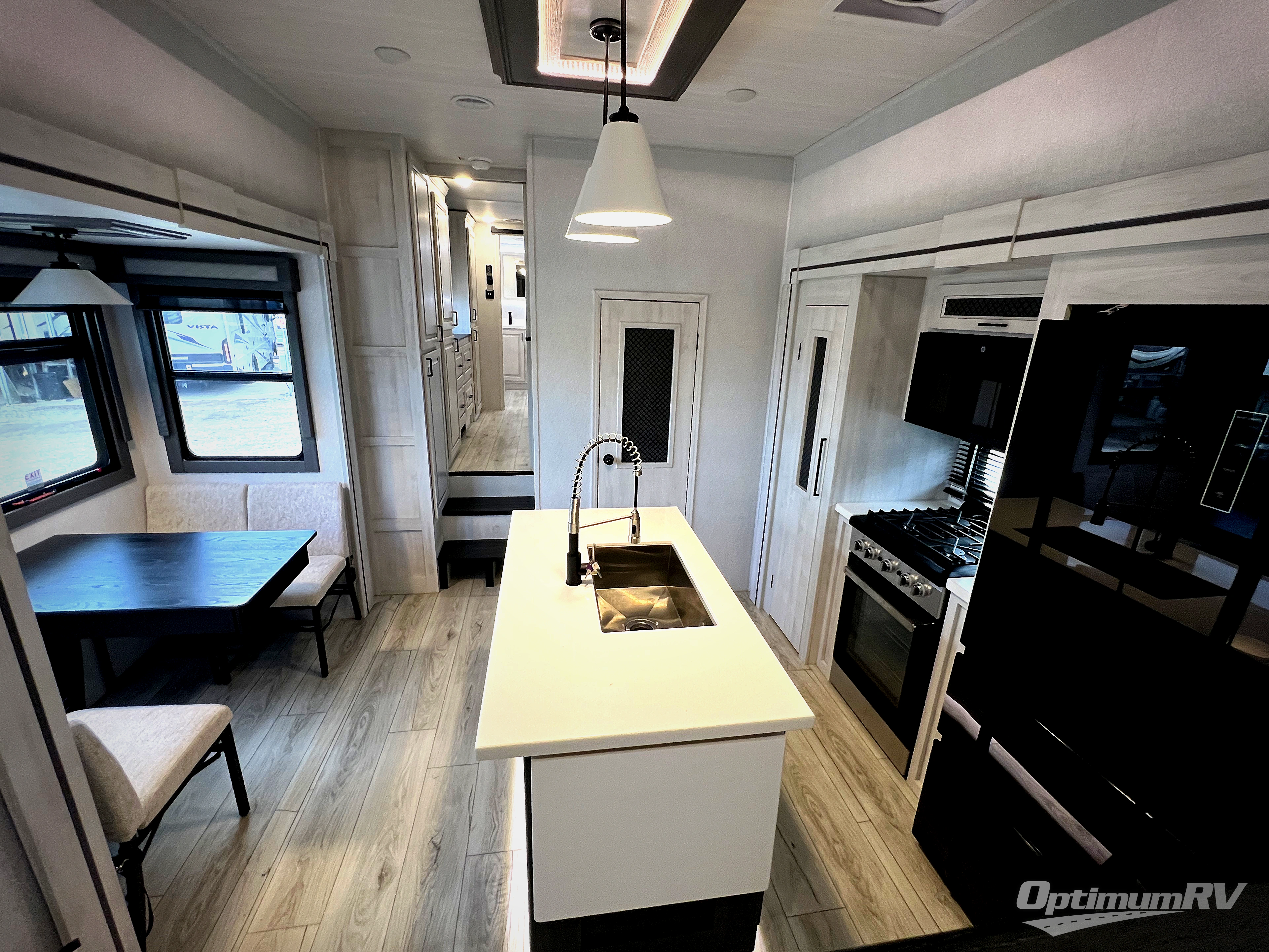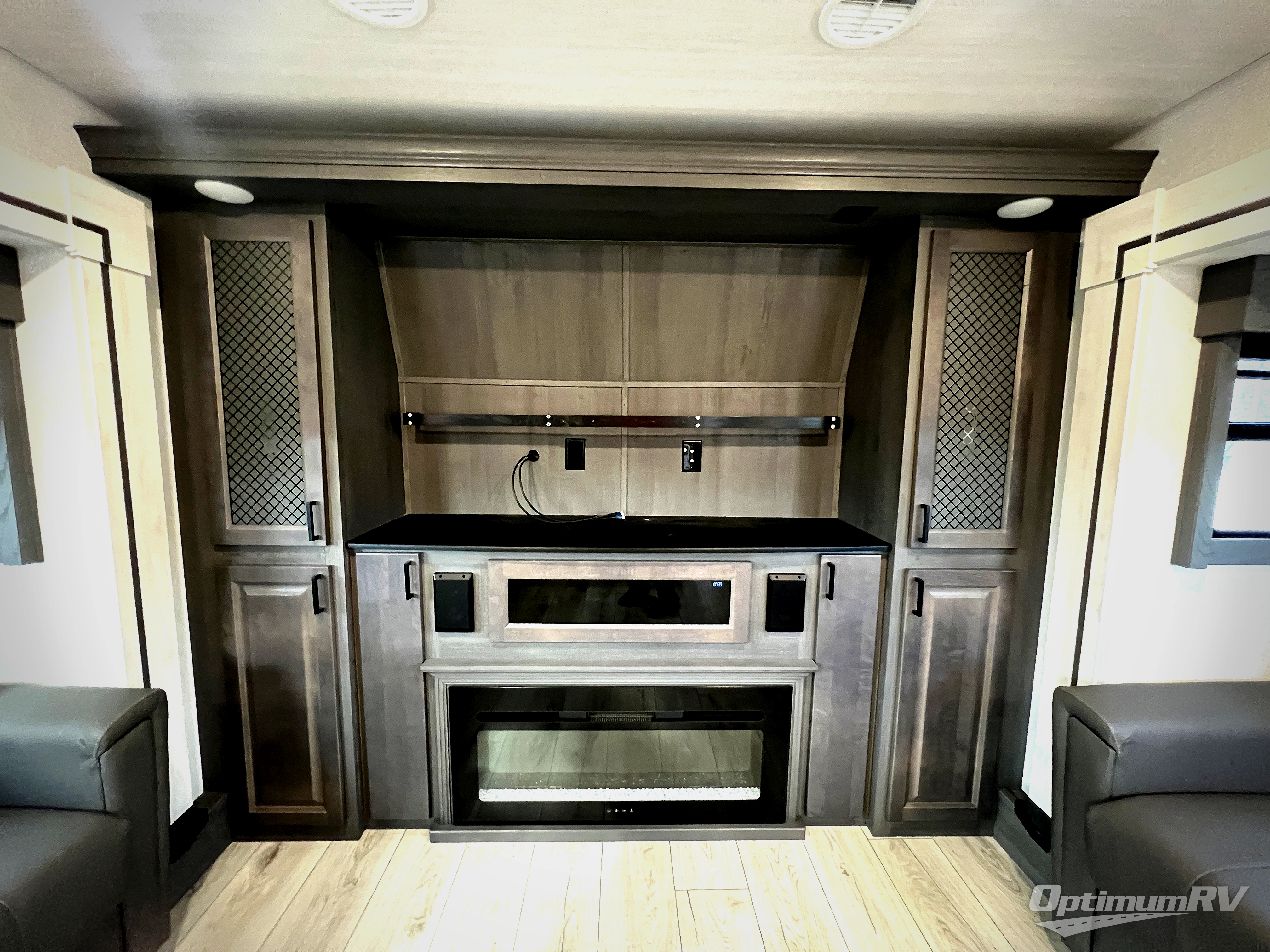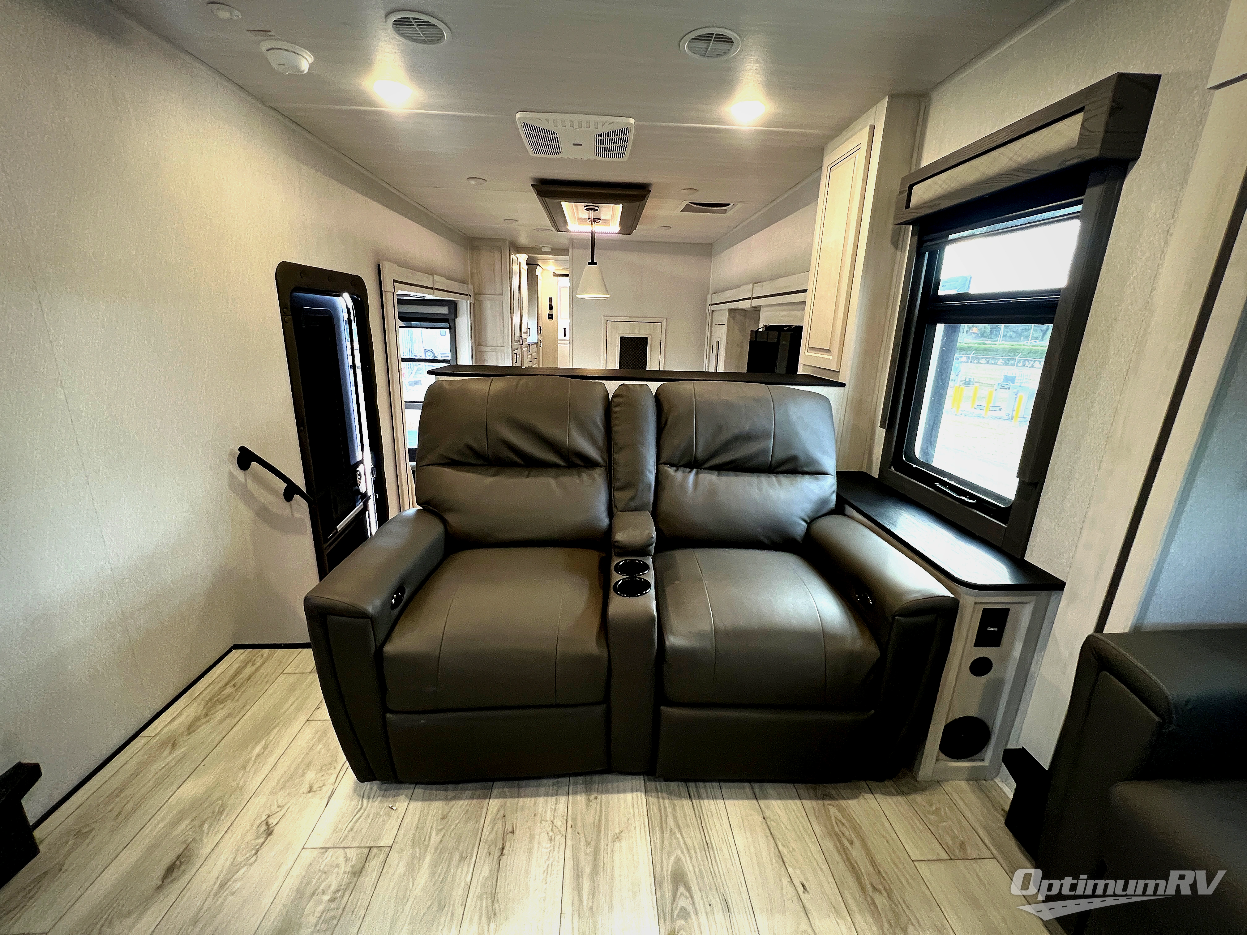 If you've been looking for a luxury fifth wheel to call your new home away from home, take a look at this Ahara! The front living area will be a favorite hangout spot with its dual hide-a-bed sofa, theater seating, and 65" TV with a fireplace. And since there are dual opposing slides here, your guests will have plenty of space to fold down the sofas at night for a great night's rest. If you're looking for your bedroom, head to the back and you'll enjoy a king bed slide out, a dresser with TV, two closets, plus your own full rear bath. The dual bath sinks are sure to come in handy when you're both getting ready for bed, and the spacious shower with a skylight will provide natural light as you clean up in the morning. There is even a closet with washer and dryer prep if you plan to go full-time. In the morning you can prepare breakfast on the four burner cooktop or in the 30" over-the-range residential microwave, and the 16 cu. ft. 12V French door refrigerator includes a double drawer freezer to hold more food. There is a free-standing dinette, a hutch to store nice dishes, and the half bath is located off of this room for convenience!