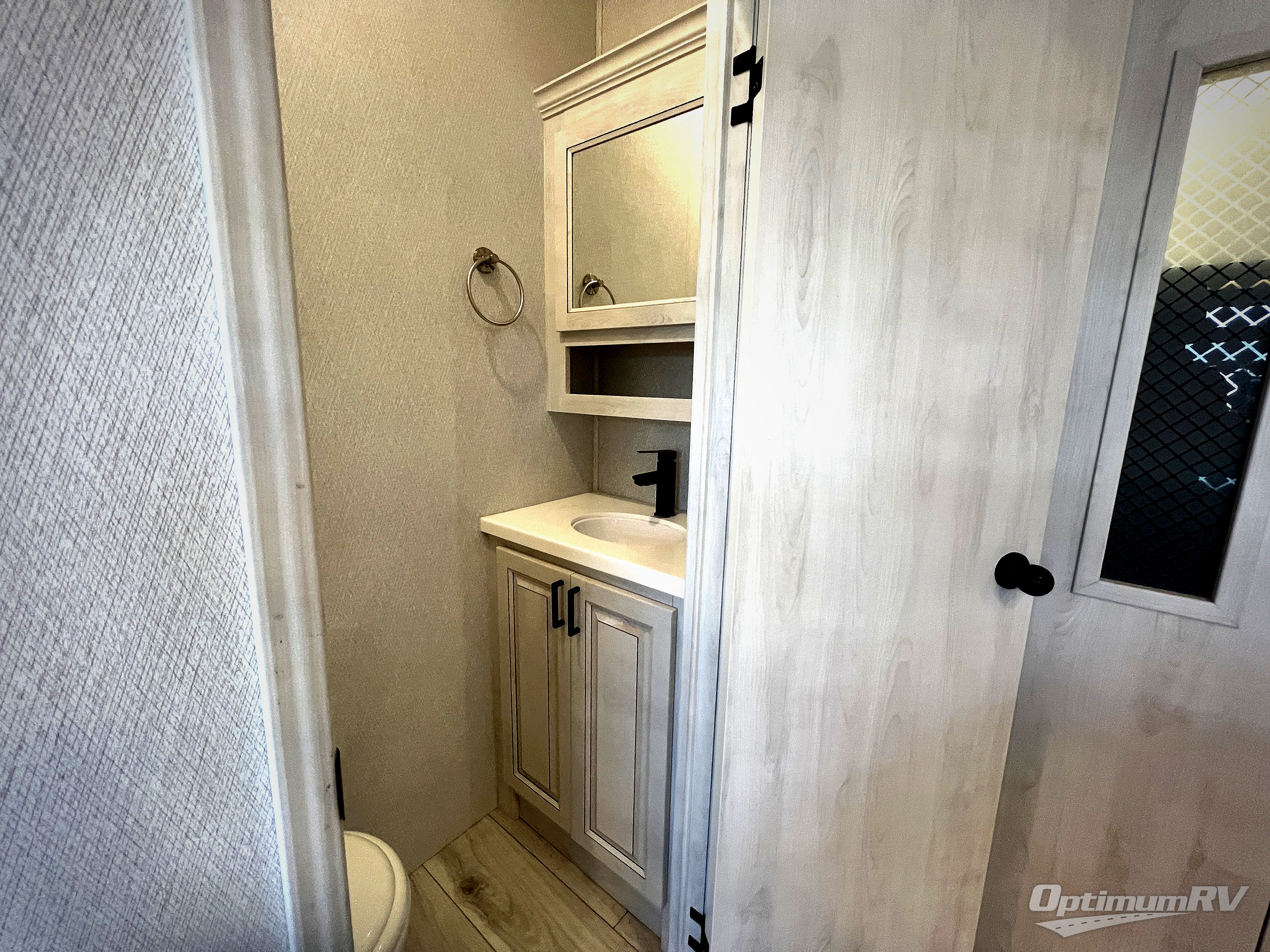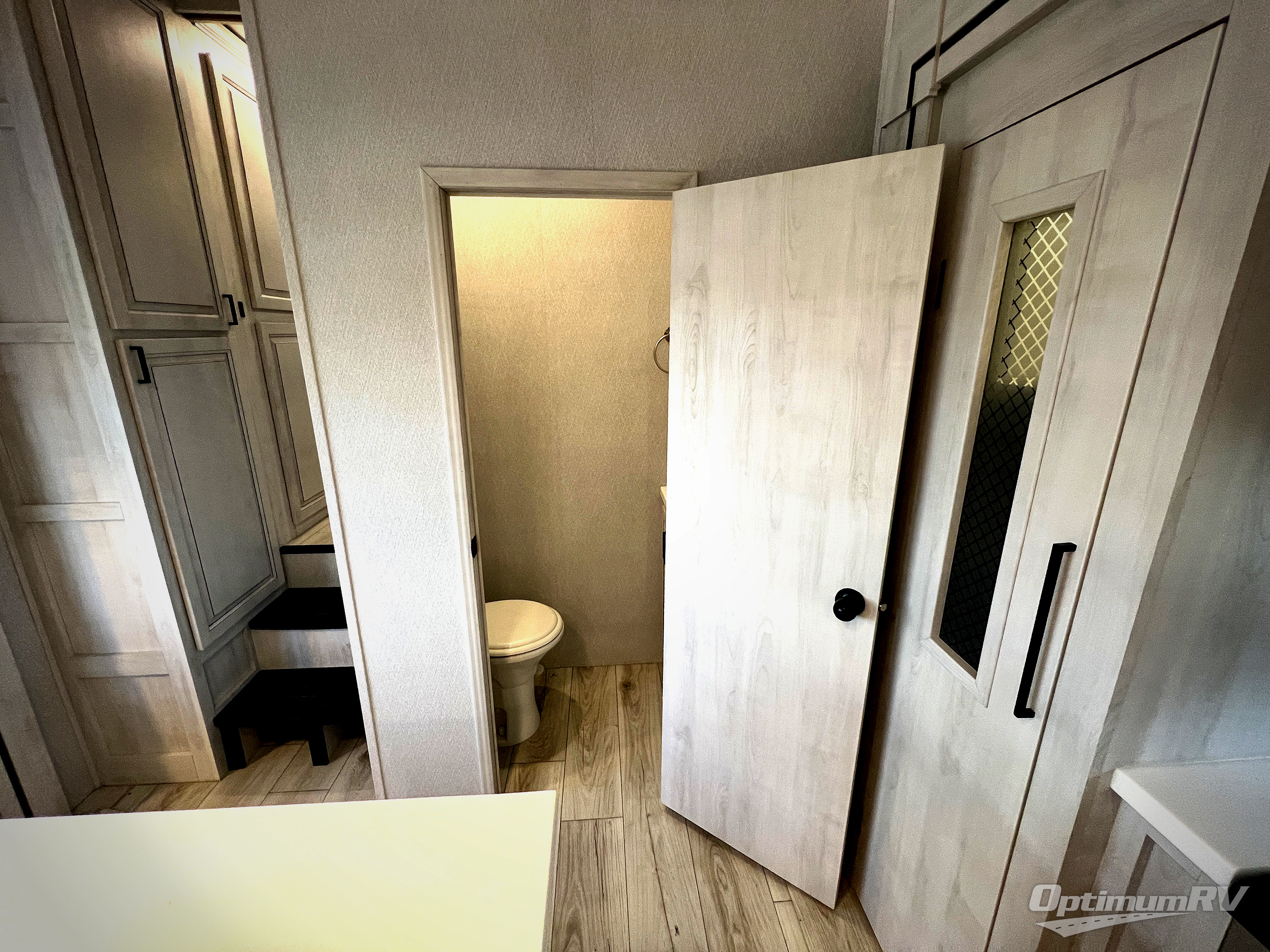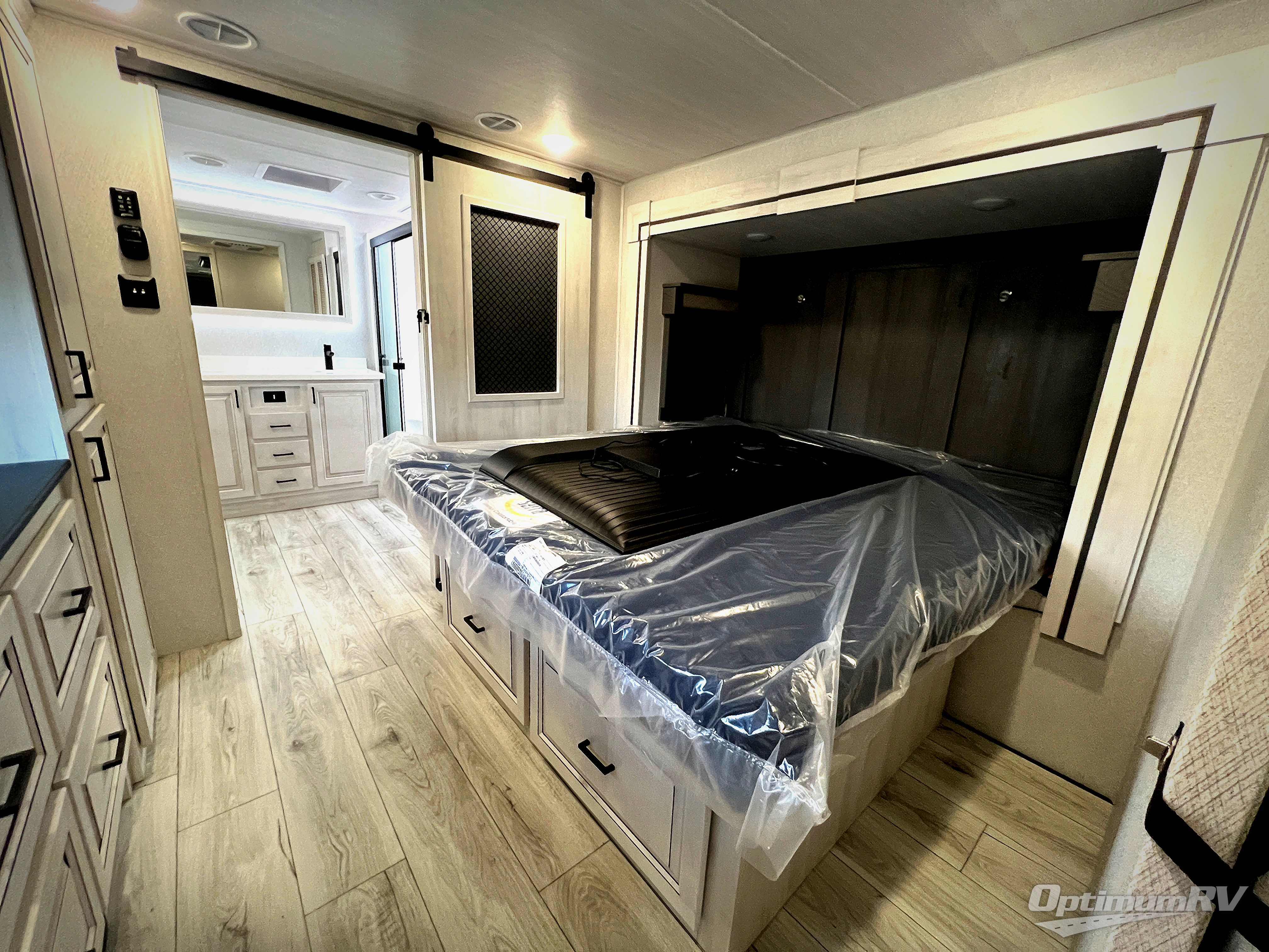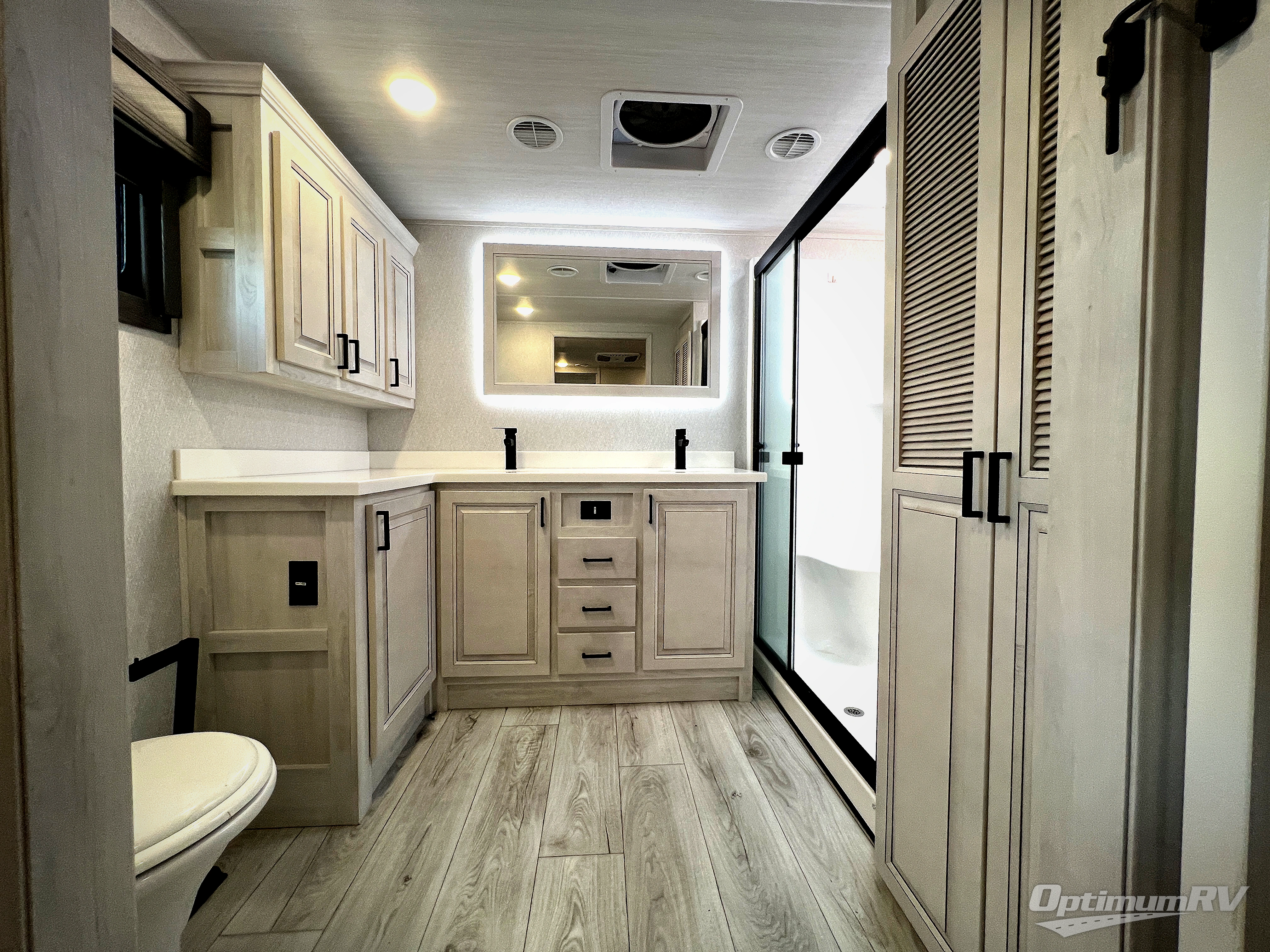 If you've been looking for a luxury fifth wheel to call your new home away from home, take a look at this Ahara! The front living area will be a favorite hangout spot with its dual hide-a-bed sofa, theater seating, and 65" TV with a fireplace. And since there are dual opposing slides here, your guests will have plenty of space to fold down the sofas at night for a great night's rest. If you're looking for your bedroom, head to the back and you'll enjoy a king bed slide out, a dresser with TV, two closets, plus your own full rear bath. The dual bath sinks are sure to come in handy when you're both getting ready for bed, and the spacious shower with a skylight will provide natural light as you clean up in the morning. There is even a closet with washer and dryer prep if you plan to go full-time. In the morning you can prepare breakfast on the four burner cooktop or in the 30" over-the-range residential microwave, and the 16 cu. ft. 12V French door refrigerator includes a double drawer freezer to hold more food. There is a free-standing dinette, a hutch to store nice dishes, and the half bath is located off of this room for convenience!