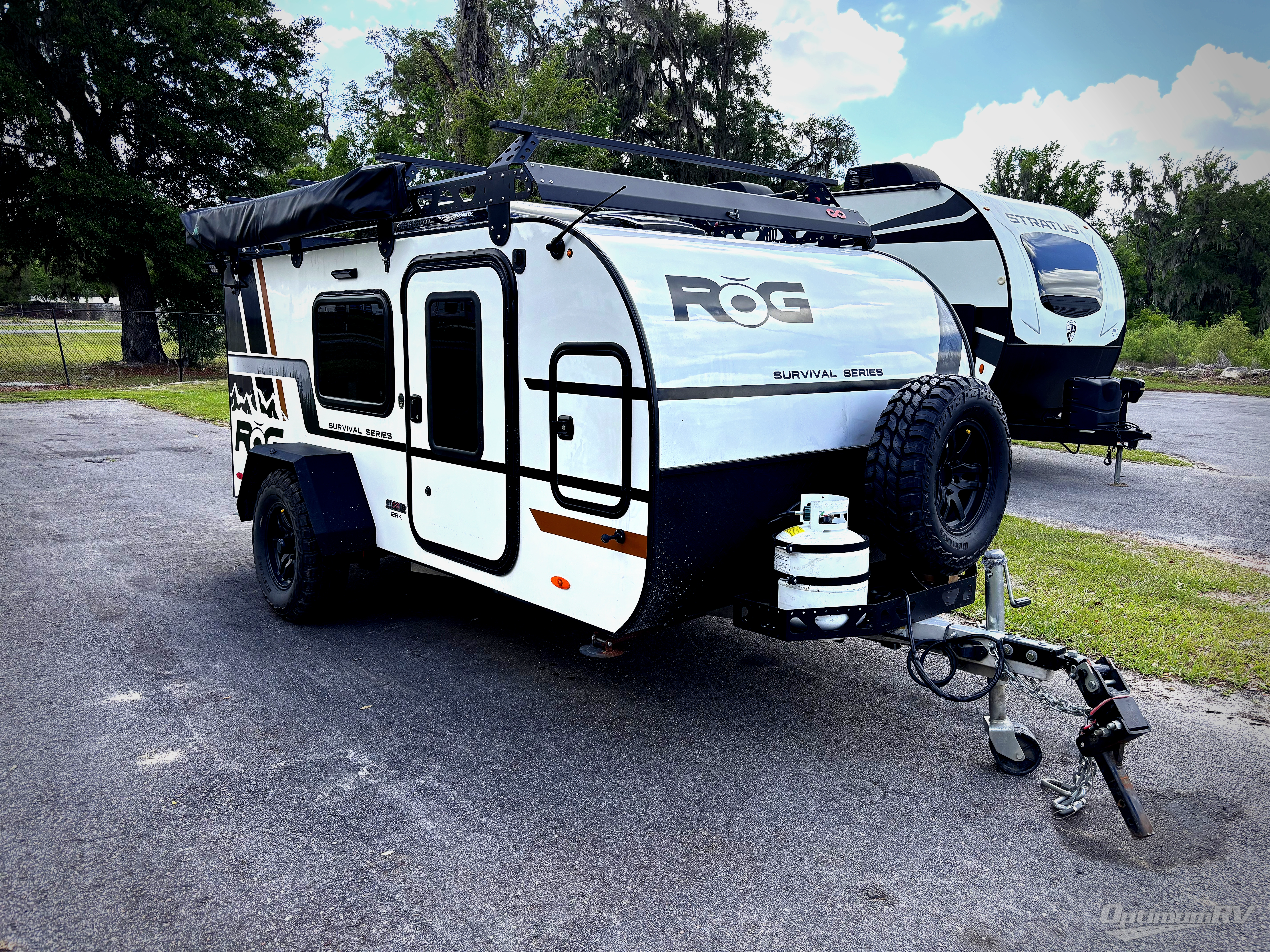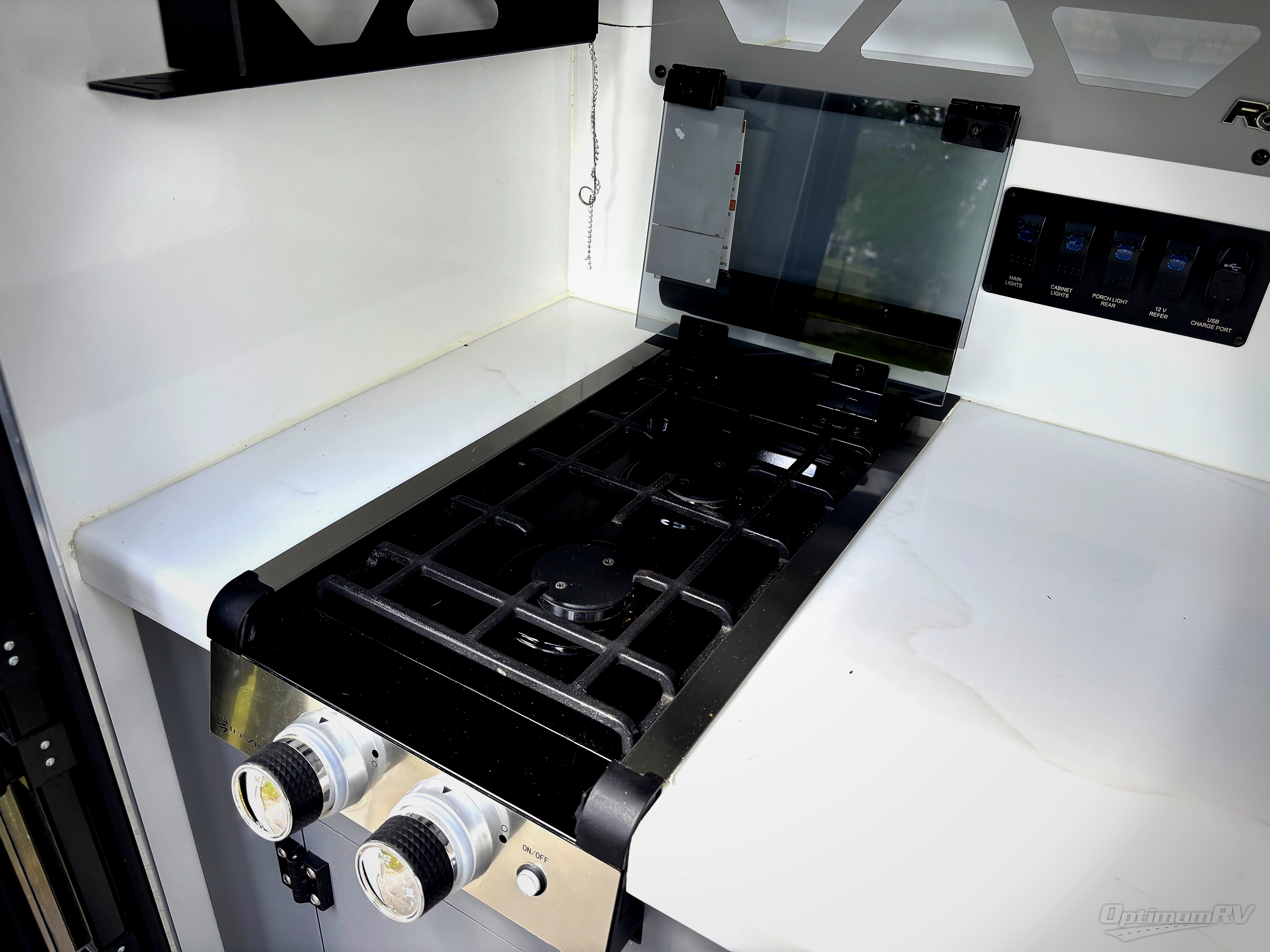 You will be so excited to test out this ROG travel trailer for yourself! The interior has great storage solutions to keep your camp gear secure. The rear outdoor kitchen has convenient amenities to help you eat well while you're away. You'll find a two-burner stove with cast-iron grates and a 3.3 cu. ft. 12V refrigerator to cook and store food. And the queen/futon mattress is sure to bring a great night's rest!