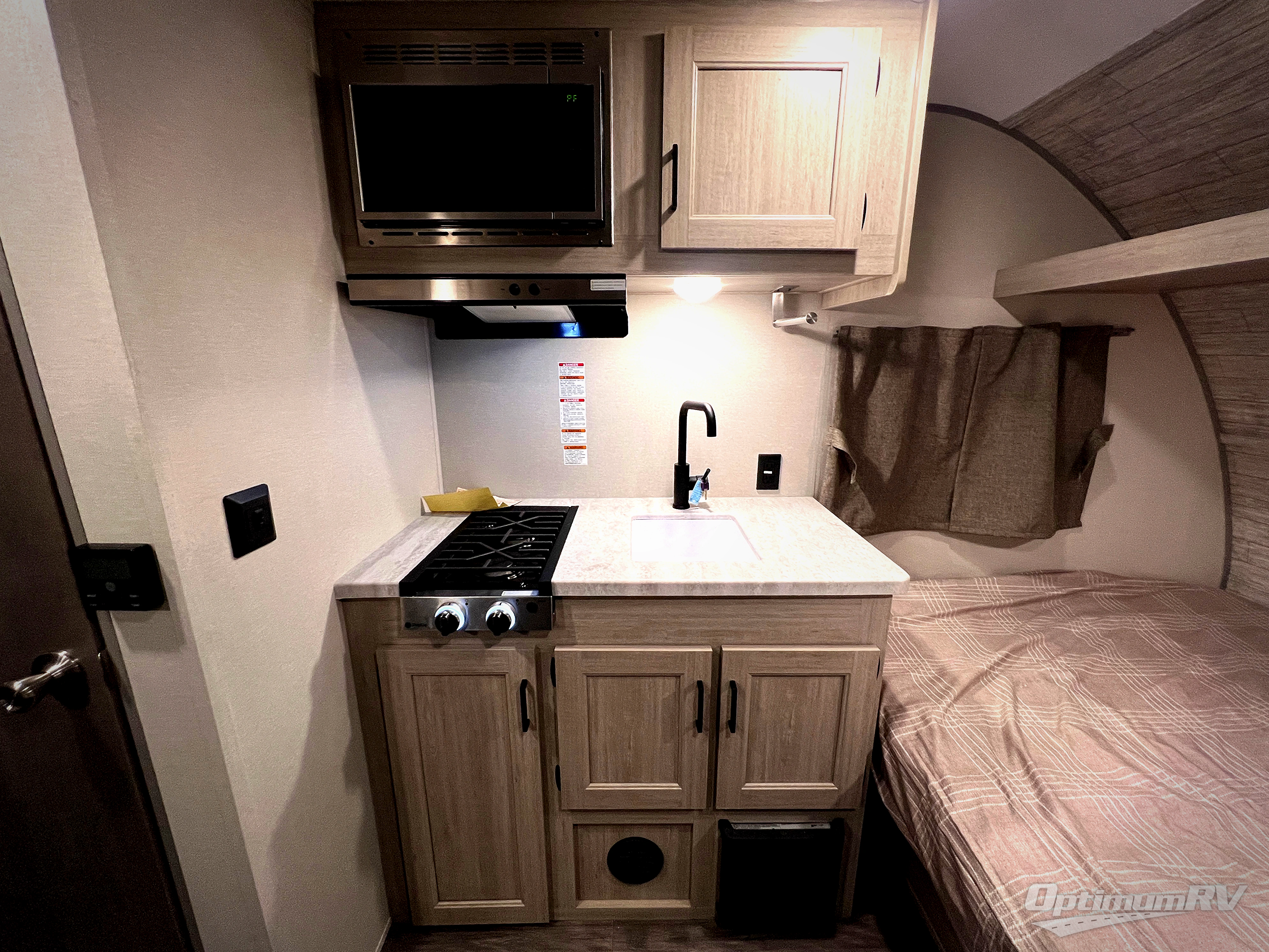 This lightweight travel trailer includes everything you need for comfortable camping trips at the lake. You can make your meals on the two burner cooktop or in the stainless steel microwave, and a 3.3 cu. ft. 12V refrigerator will keep leftovers fresh. A front queen bed provides a great night's rest, and there is a 29" booth dinette that will double as both dining and additional sleeping space. And a private bath with a 24" x 32" shower and toilet will let you easily freshen up without having to use the camp's facilities!