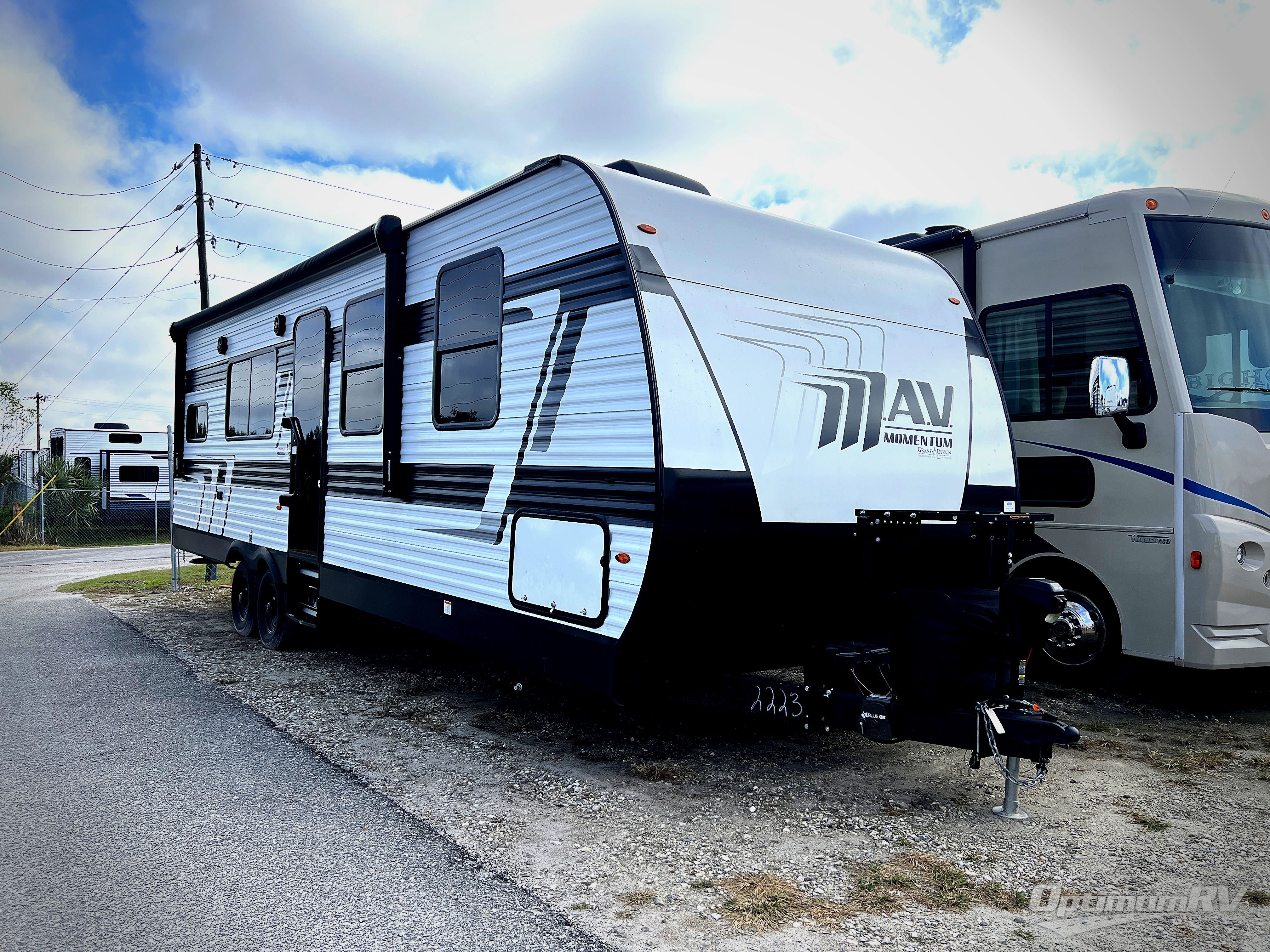 You will love this Momentum MAV toy hauler travel trailer! The front bedroom features a queen bed, and there is plenty of room to walk around. The sliding solid bedroom door helps with space. Overhead storage and a pair of nightstands are convenient storage, plus there is a wardrobe with both drawers and space to hang items. The kitchen offers a microwave, stainless steel sink, and an 8 cu. ft. 12V refrigerator. In the garage, you'll find rollover sofas with a table and a top bed for guests to sleep on. The ramp door/patio will provide additional living space once your toys are unloaded, and the pull down screen will keep bugs out!