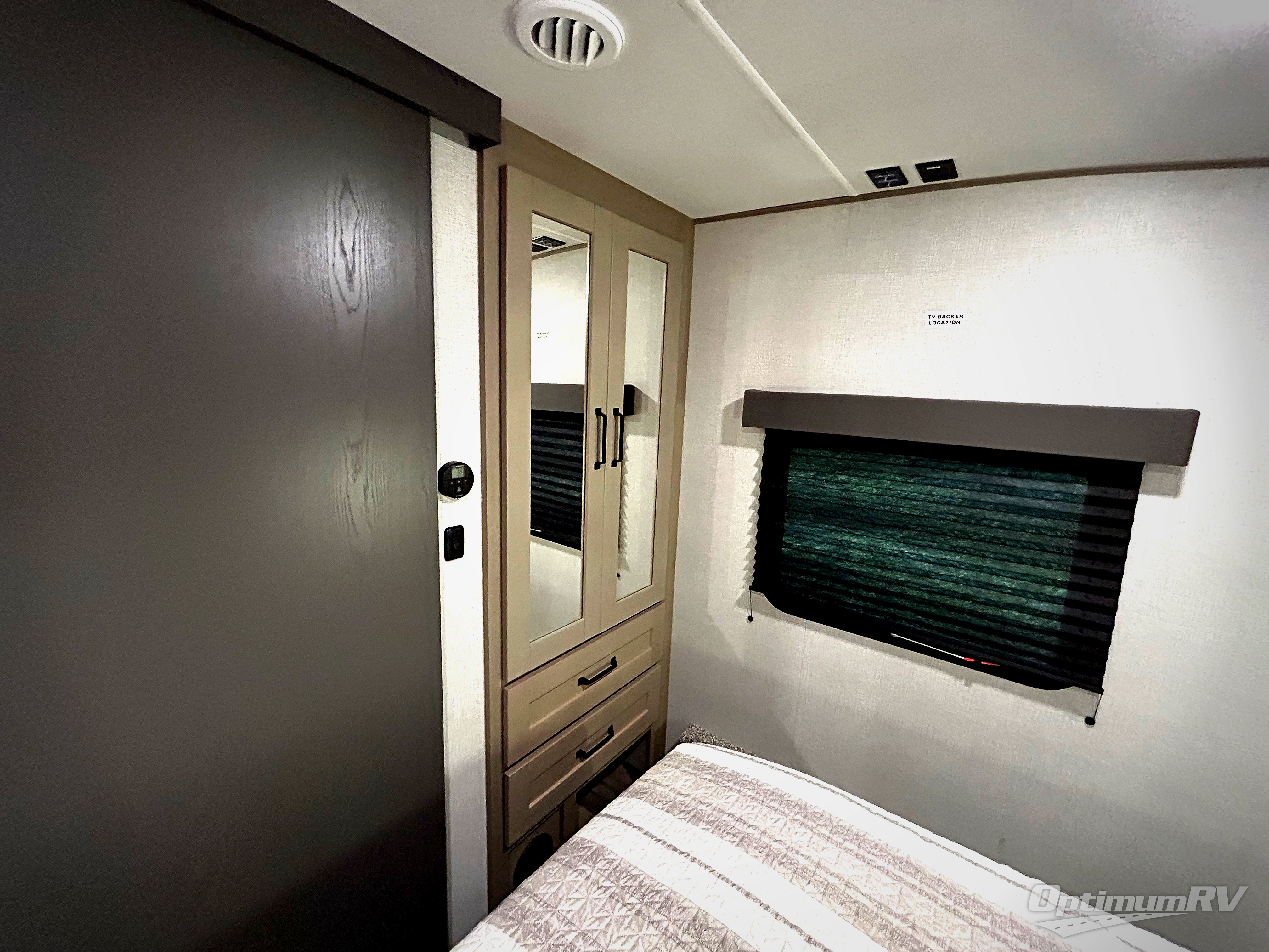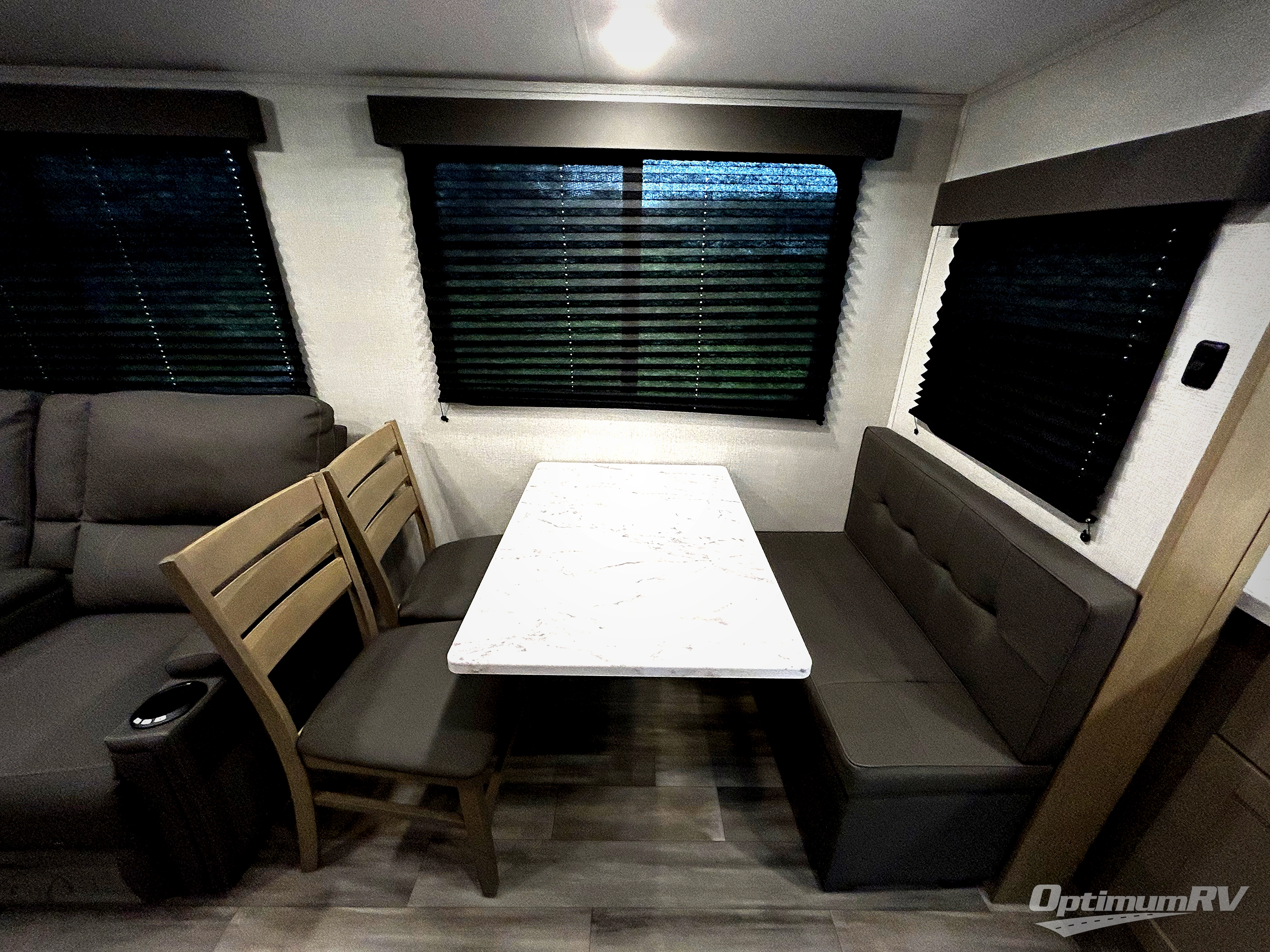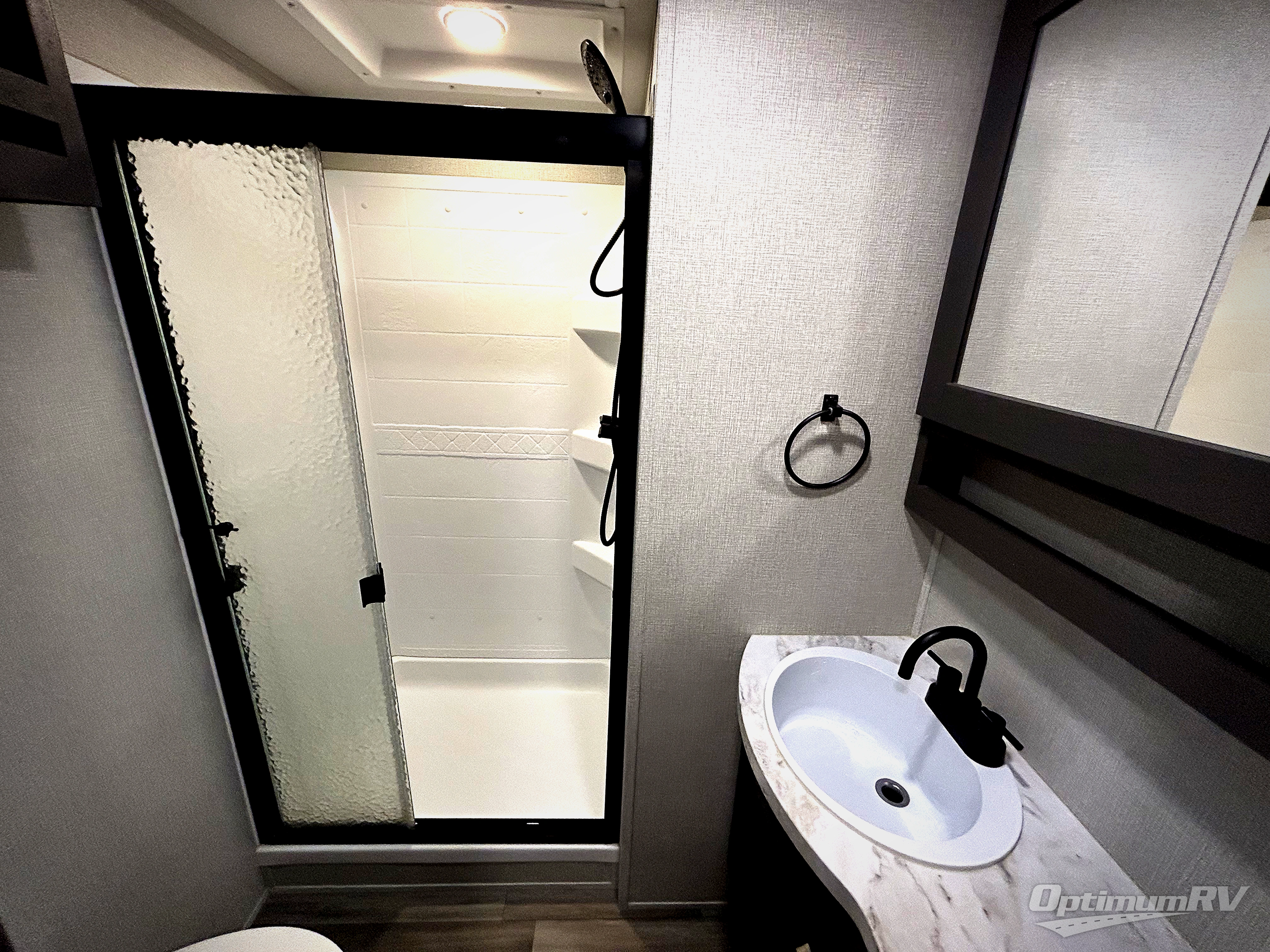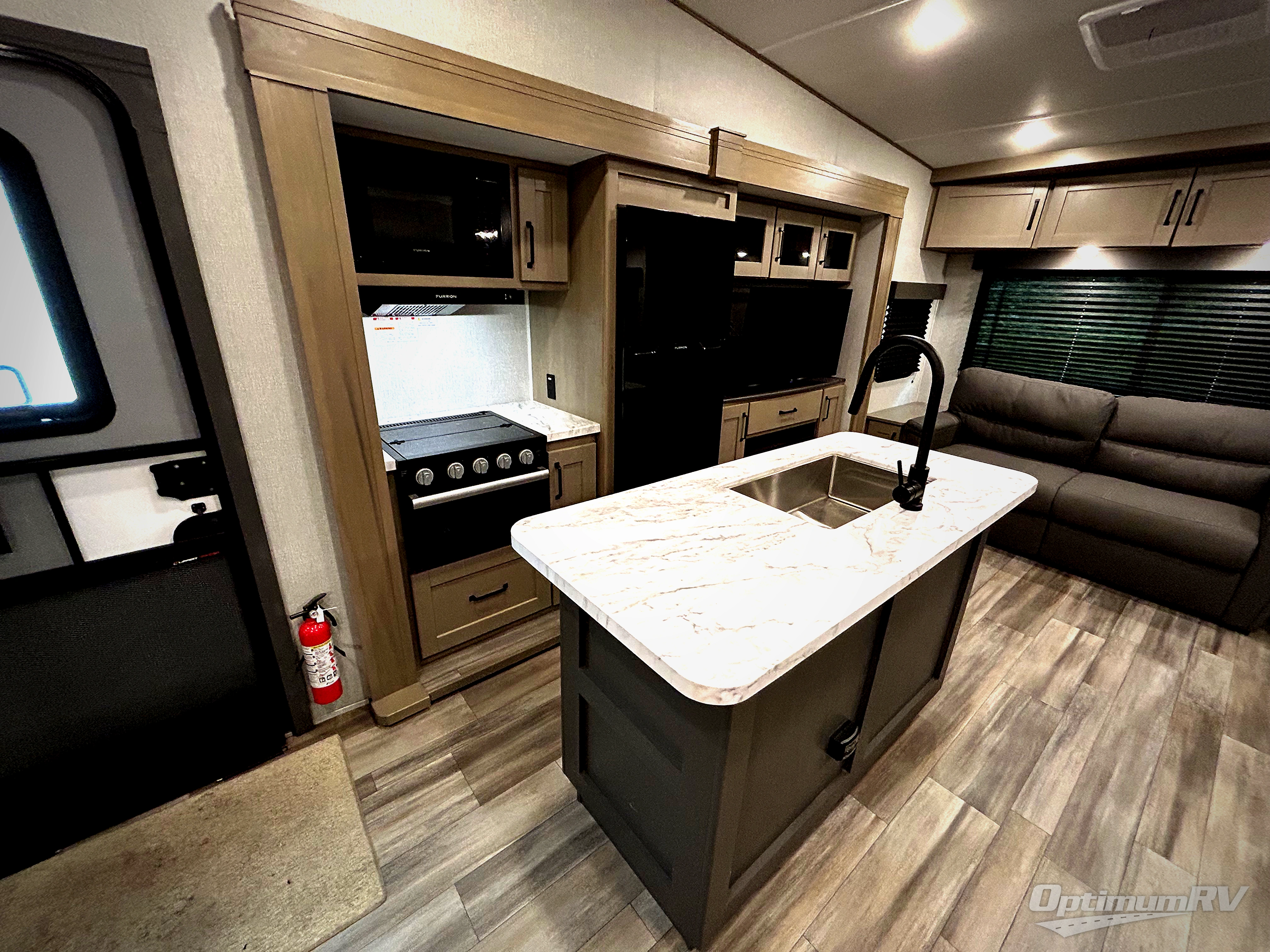 You'll love the amount of space you have in this fifth wheel thanks to the dual opposing slides in the rear living area/kitchen. Your friends and family can relax on the tri-fold sofa or theater seating across from the high-definition 40" LED TV. There is also a booth dinette or you can choose the optional swivel dinette if you prefer that seating. The chef of your group will appreciate having a kitchen island that will provide more counter space, plus there is a hutch with overhead cabinets for nice dishes. A full bath onboard lets you clean up each day and the front private bedroom includes a queen bed just like at home. You'll also love spending time outdoors under the electric awning, and there is an unobstructed pass-thru storage for fishing poles, hiking gear, and camp chairs!