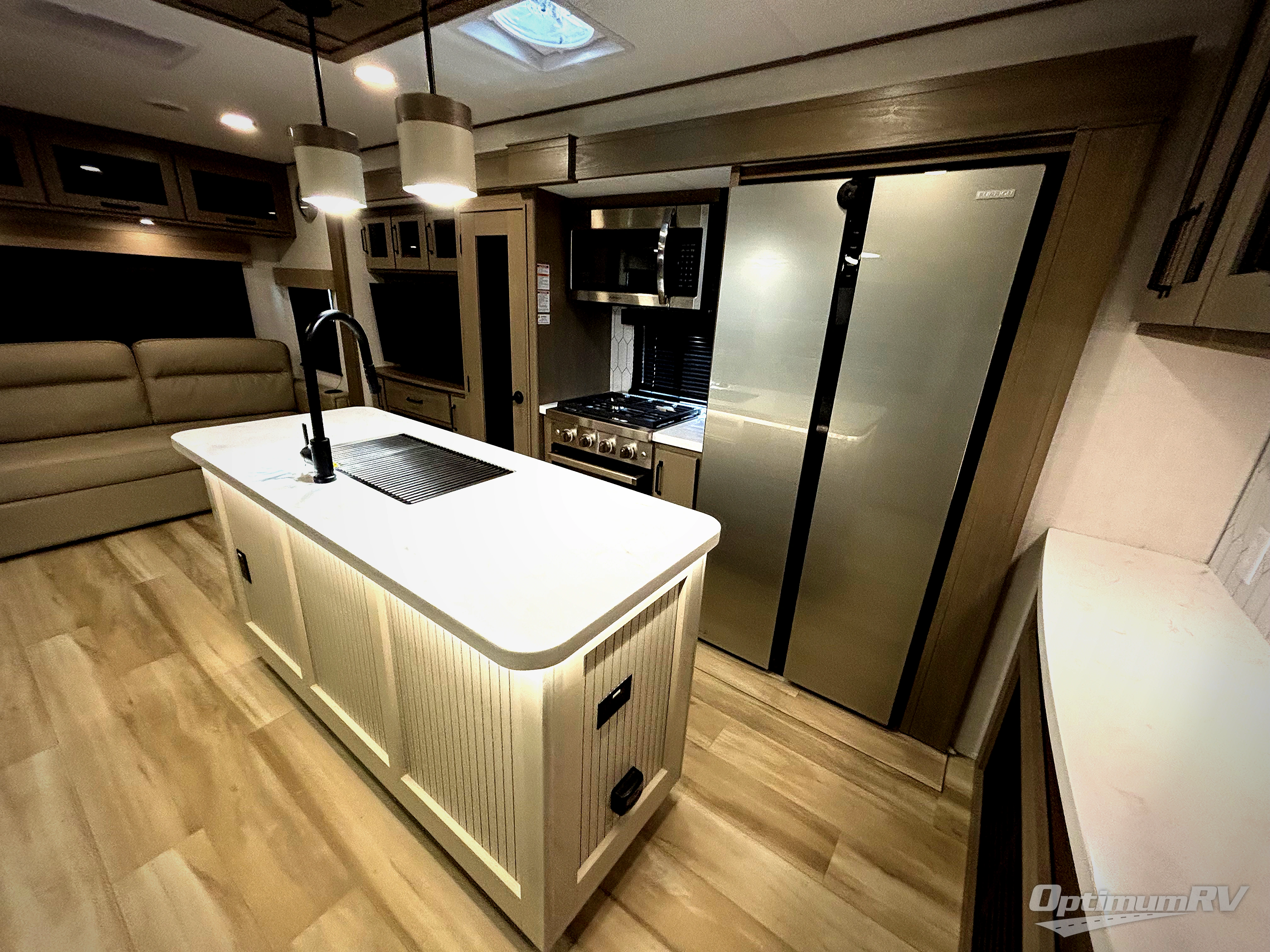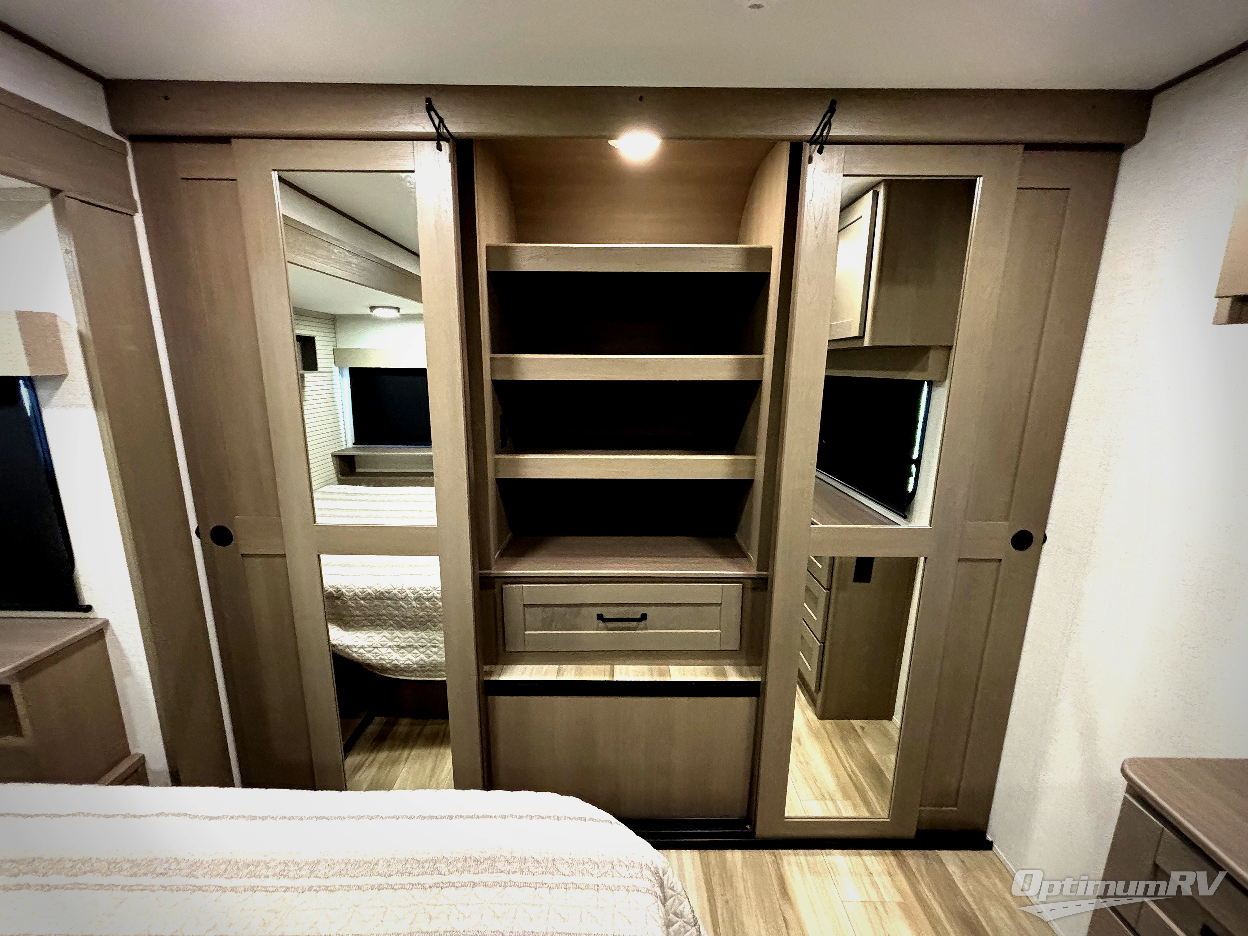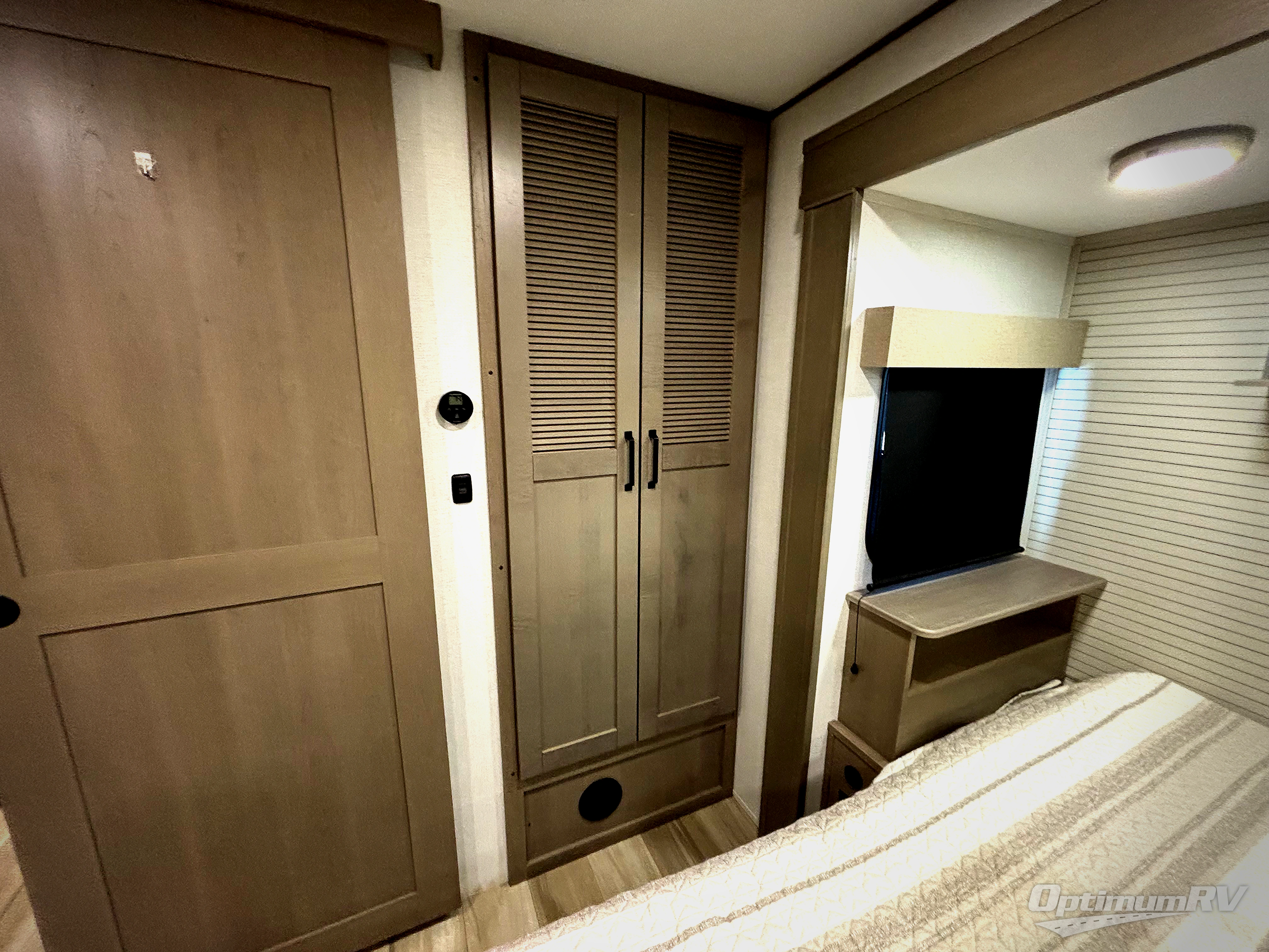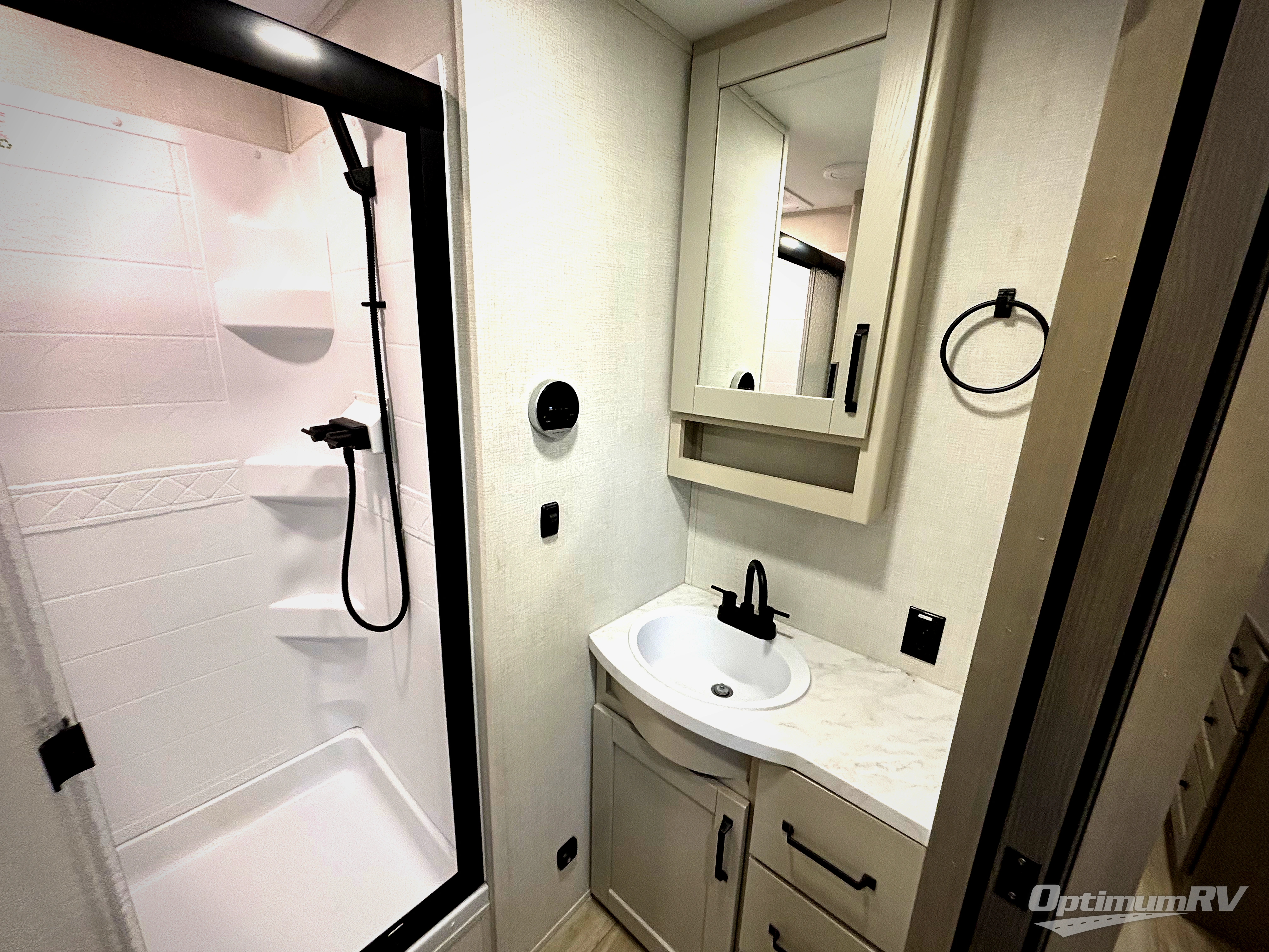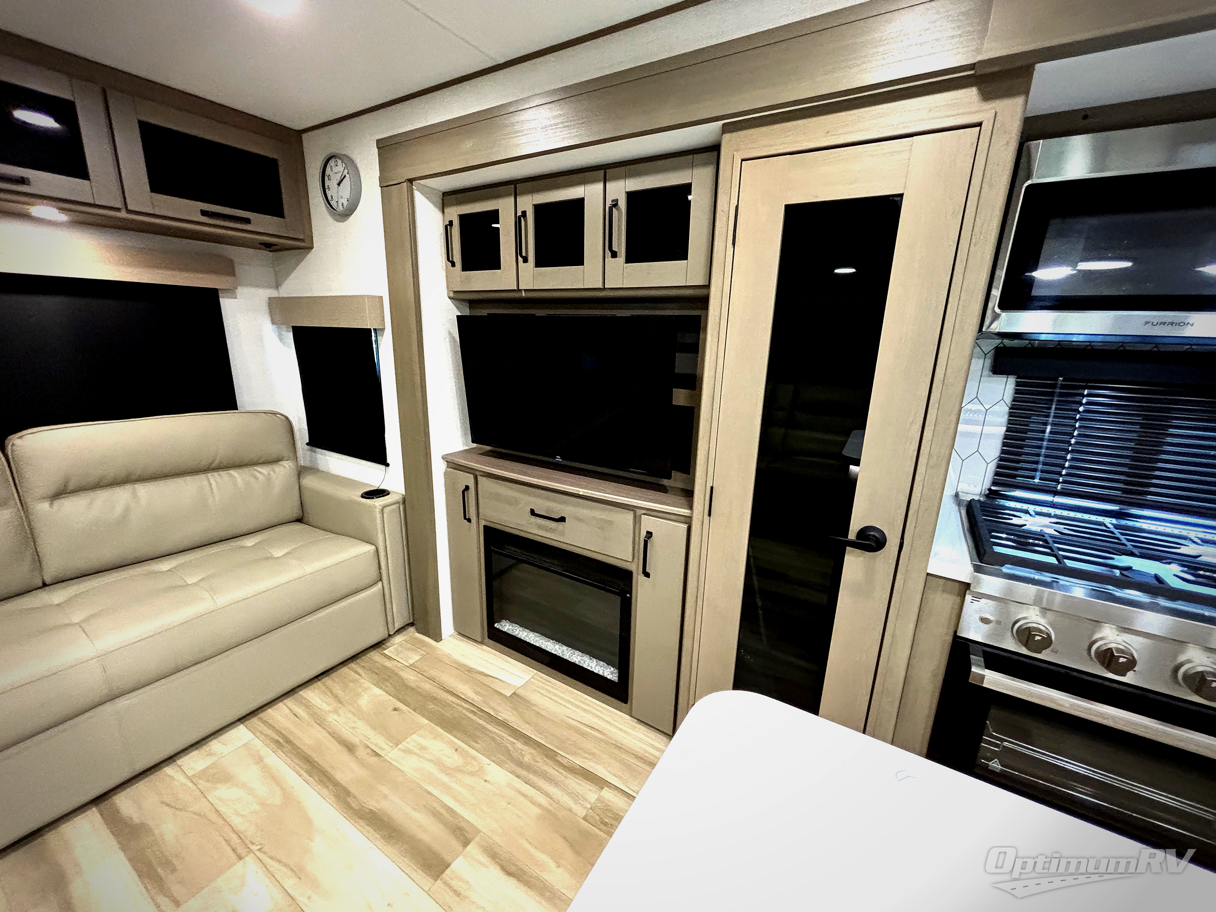 This rear living travel trailer will be perfect for extended stays at the campground or quick weekend trips to the lake! Once you've unloaded your gear from the pass-thru storage, head inside to relax on the rear tri-fold sofa with an adjustable headrest or on the theater seating across from the 40" TV and fireplace. There is also a booth dinette where you can dine together, or you can choose the optional swivel dinette. The spacious kitchen island will make meal time easier than ever, plus there is a pantry and 16 cu. ft. 12V refrigerator for food storage. The full bath is right next to the front private bedroom for easy nighttime use, and speaking of nighttime, you're sure to sleep soundly on the queen bed slide. There is also a large front closet, TV prep, plus washer and dryer prep if you choose to add these appliances.