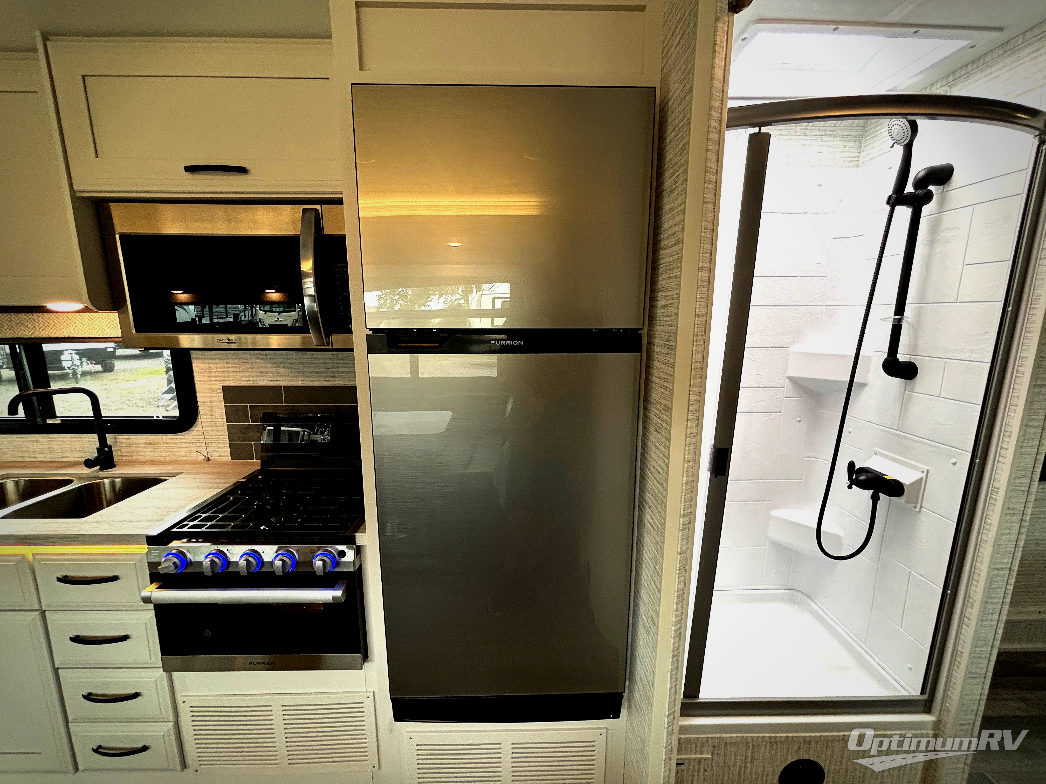 Explore new places as you travel in this coach with the comforts of home and the conveniences you are accustom to. In the rear bedroom, you will appreciate privacy when you close the divider to enjoy the walk-around queen bed with storage for your clothes. There is a private toilet and sink with the shower right across the hall so two people can freshen up at once. The chef will love the galley kitchen which is spacious thanks to the furniture slide out. The Furrion all-in-one cooktop along with the residential-size microwave, plus the 10 cu. ft. refrigerator will give the cook everything for warm meals for two or more. The driver and passenger seats swivel to become a part of the living area seating, and the cab-over bunk her will be a big plus for the little ones. You can also choose the optional theater seating in place of the sofa if you're not needing the additional sleeping space.