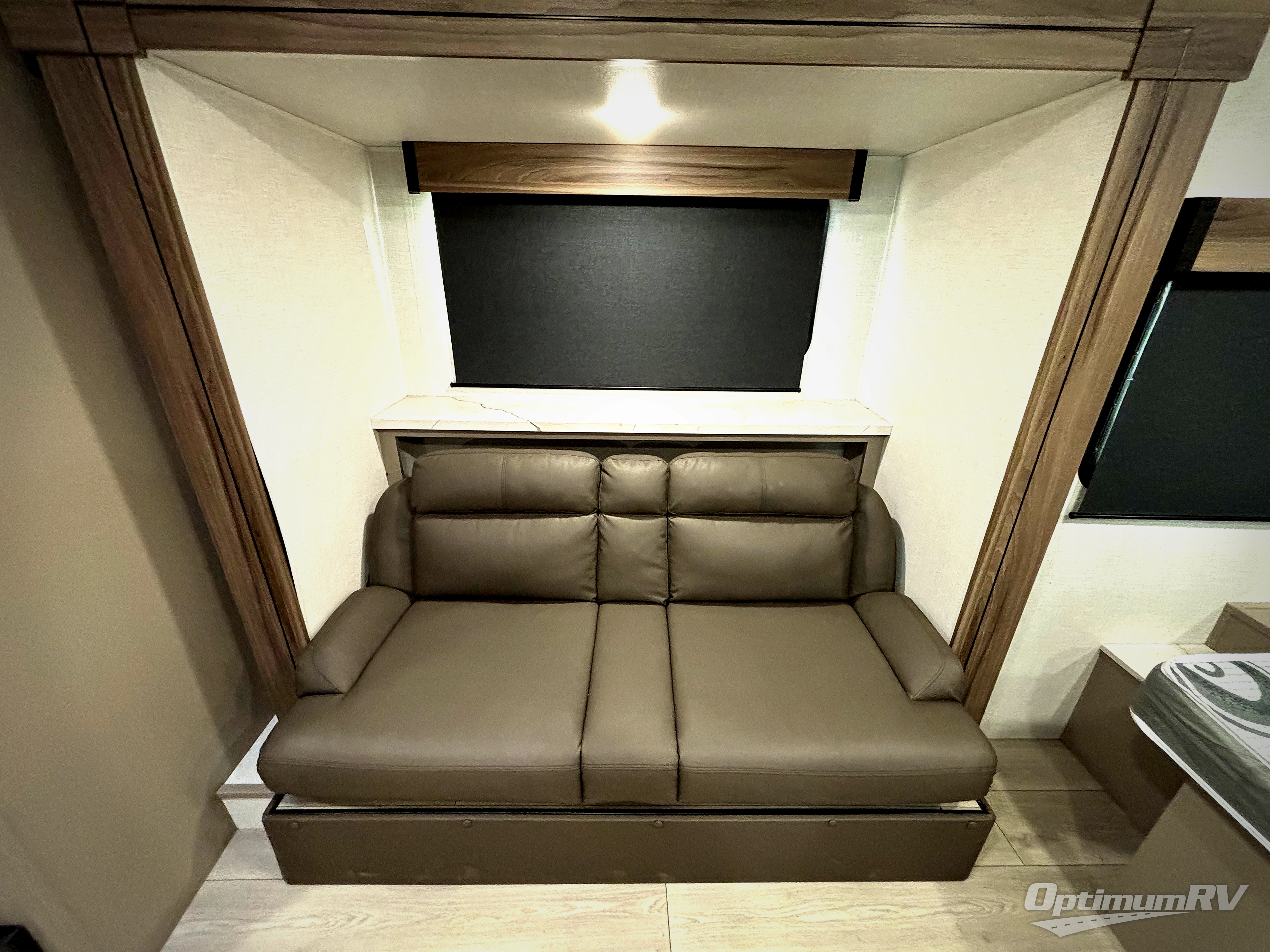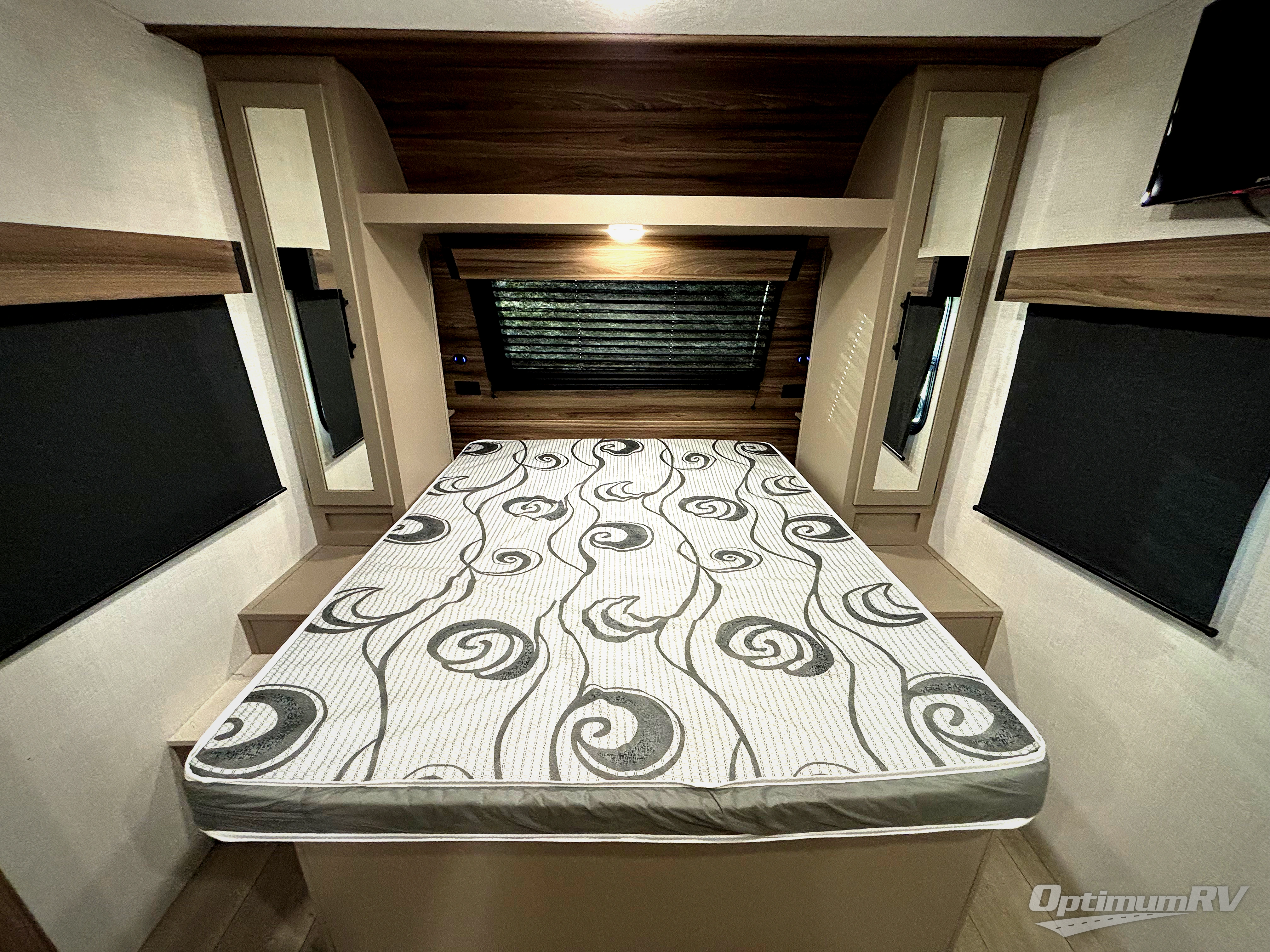 If you're wanting to upgrade from a tent to a travel trailer, this unit will be perfect for two to three campers. Instead of an air mattress, you'll sleep soundly on the front RV queen bed, and there are dual bedroom wardrobes so you don't have to live out of suitcases. The full rear bath is sure to come in handy, especially at night and you'll find more storage space here in the bath closet. When you're not wanting to grill on an open flame outdoors, the 17" oven with a three burner cooktop and the microwave oven will let you cook meals for your crew. There is also a 64" Jackknife sofa slide that will provide seating space, sleeping space for a guest, and extra floor space!