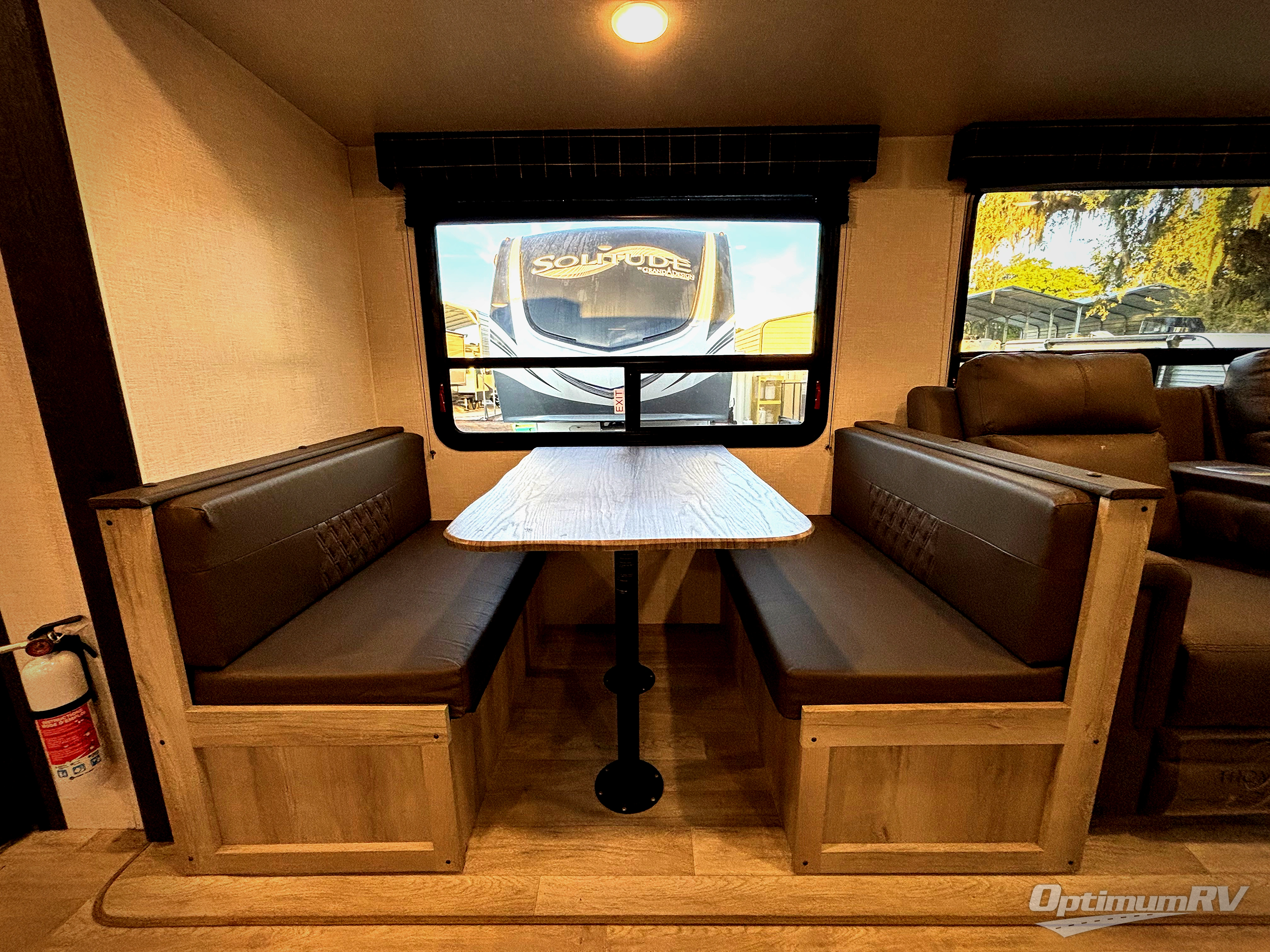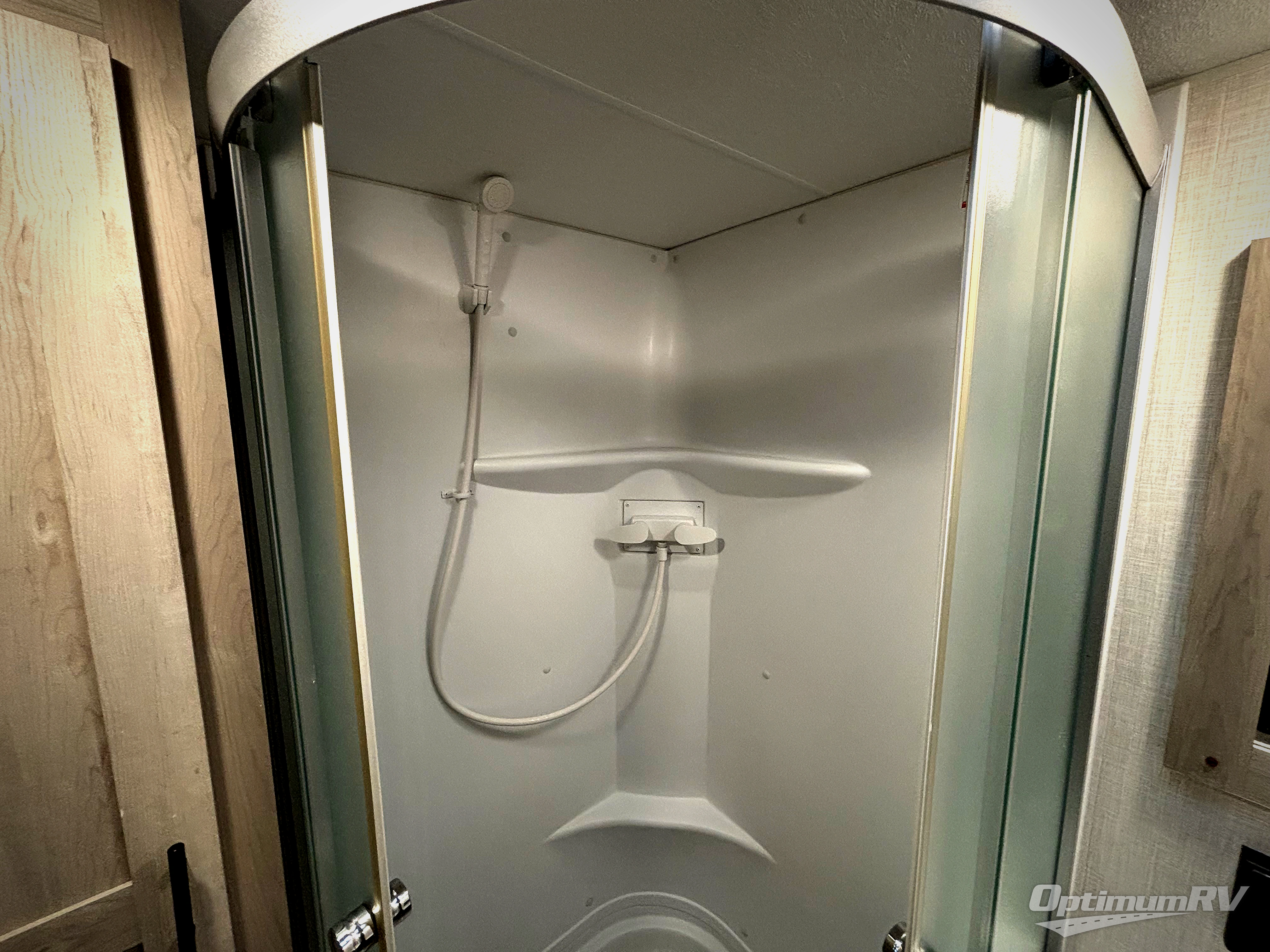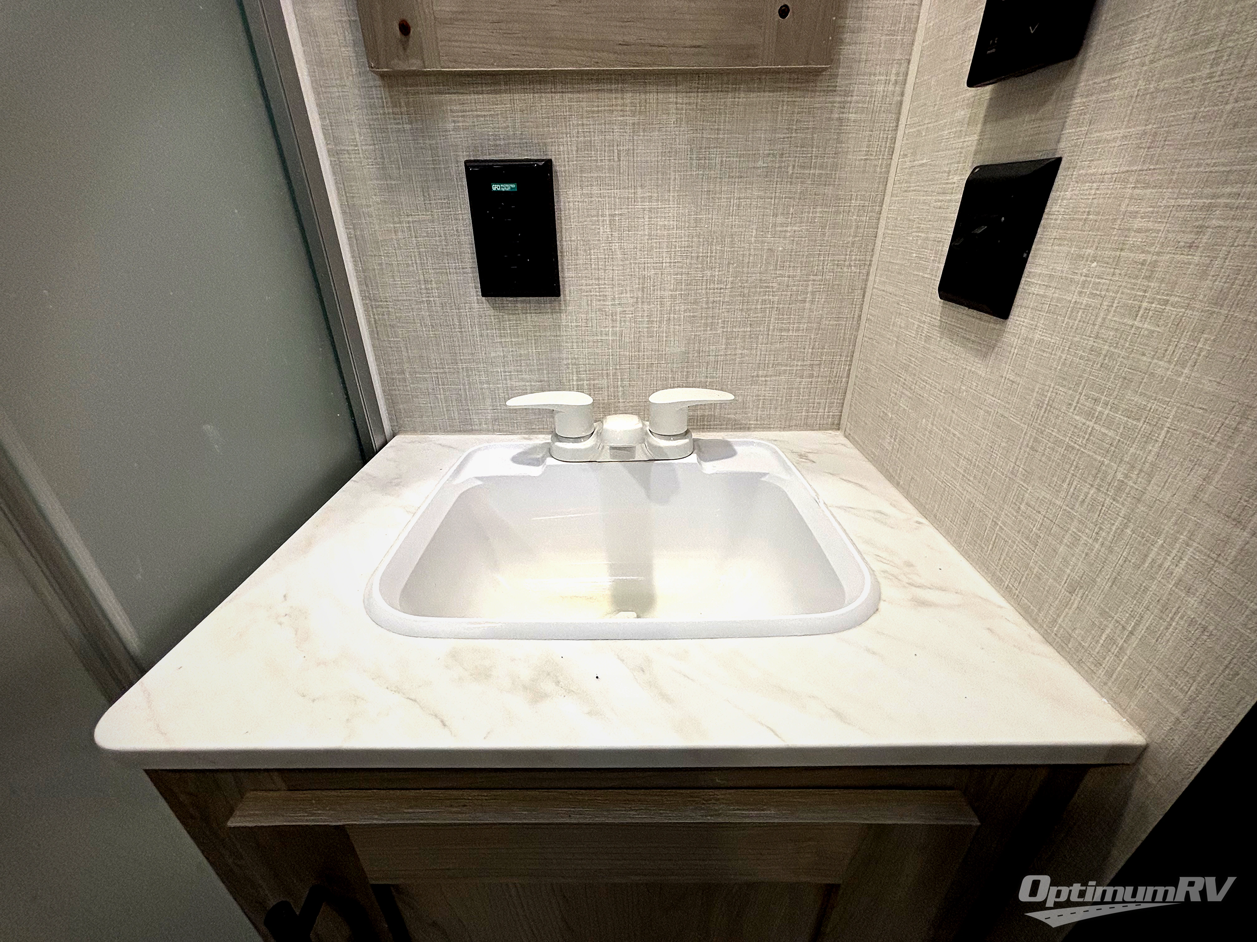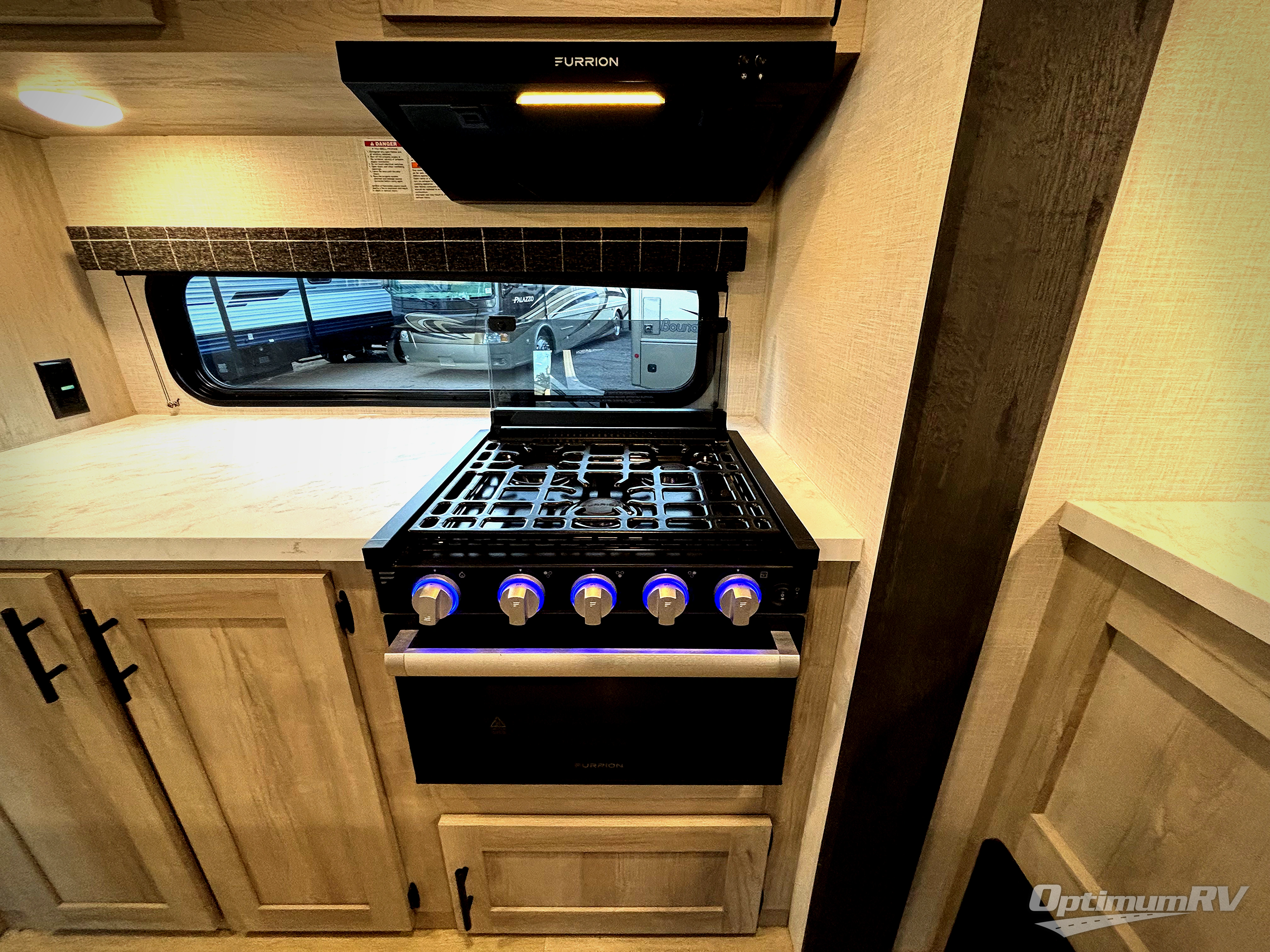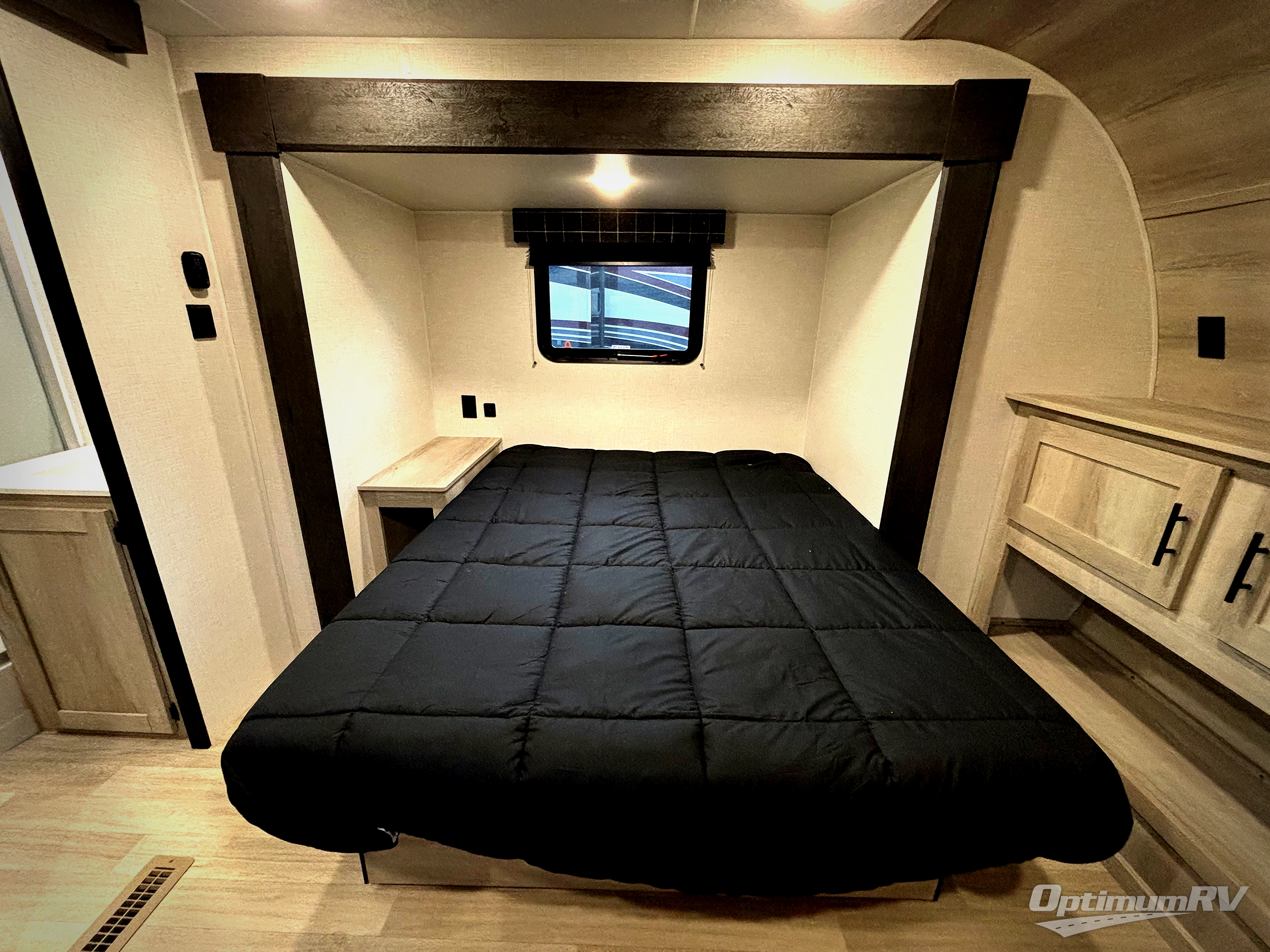 Wow! Check out the space you will have in this travel trailer with dual opposing slides in the rear living area, plus a slide out queen bed in the bedroom! The kitchen island will provide more counter space, along with the hutch/pantry that includes a microwave above. Your crew can relax on the theater seating, booth dinette, or 70" sofa after dinner is cleaned up, plus you have a 30" fireplace for a more at-home feel. This model also includes a 12' power awning so relax under during day!