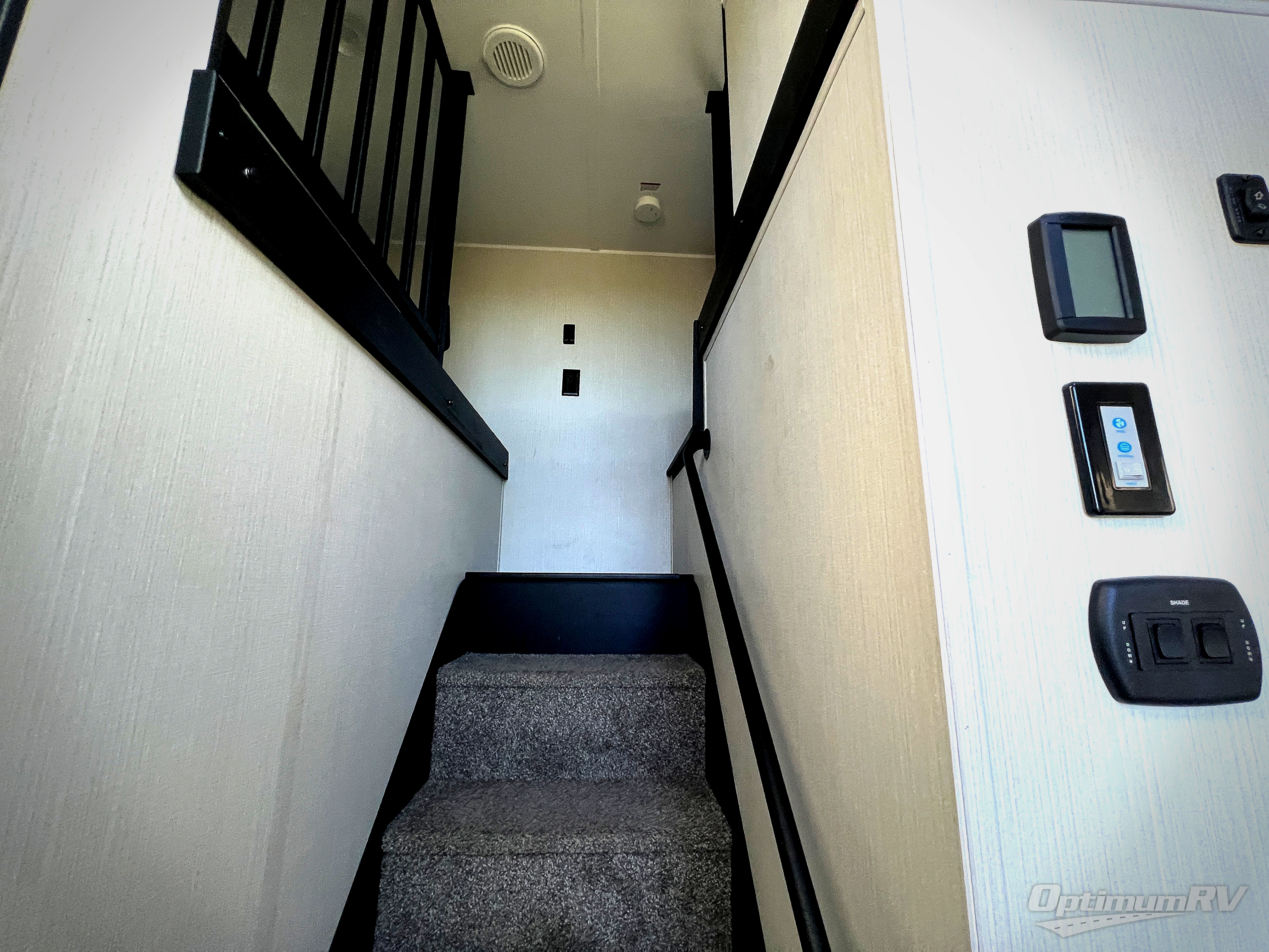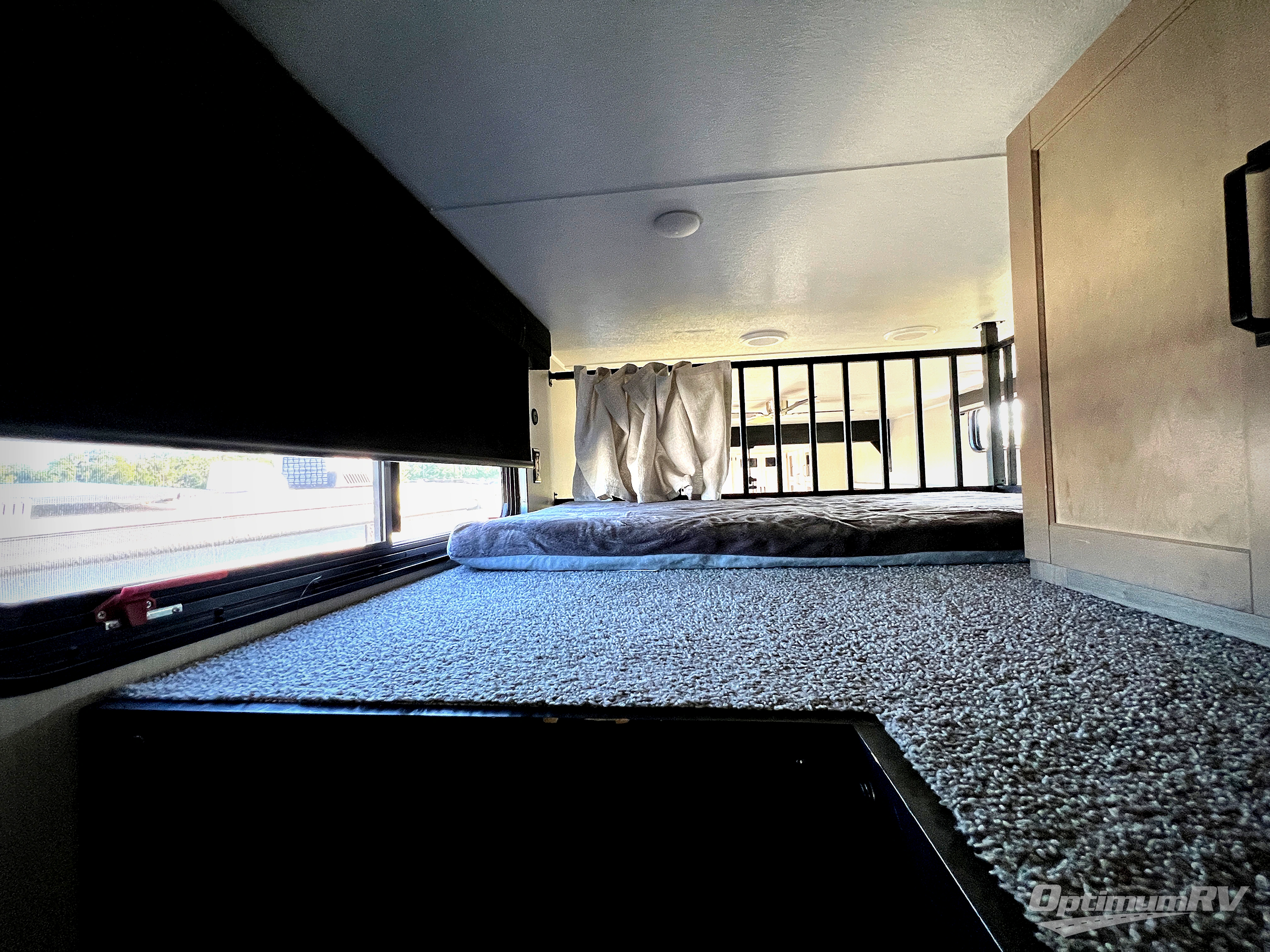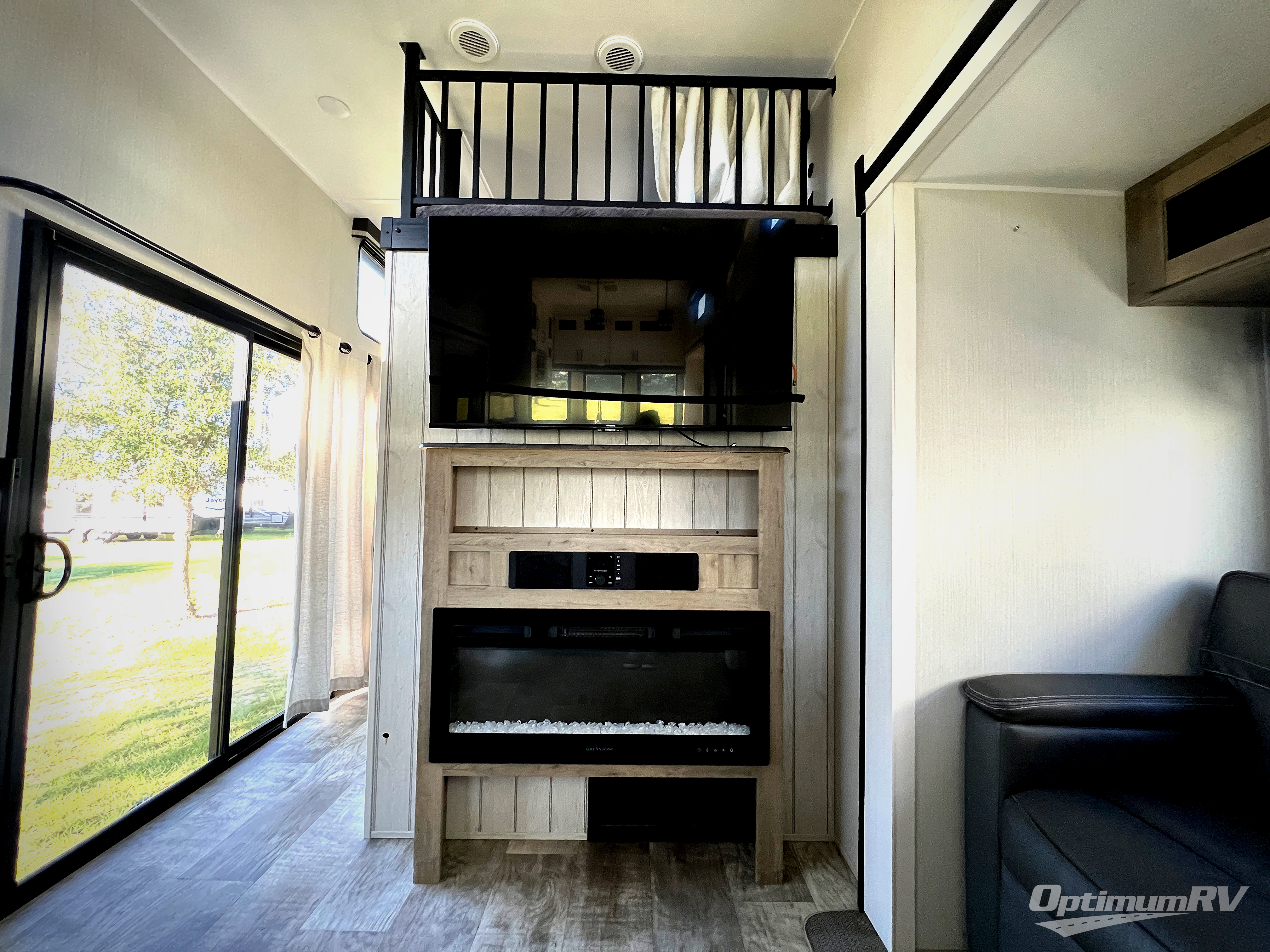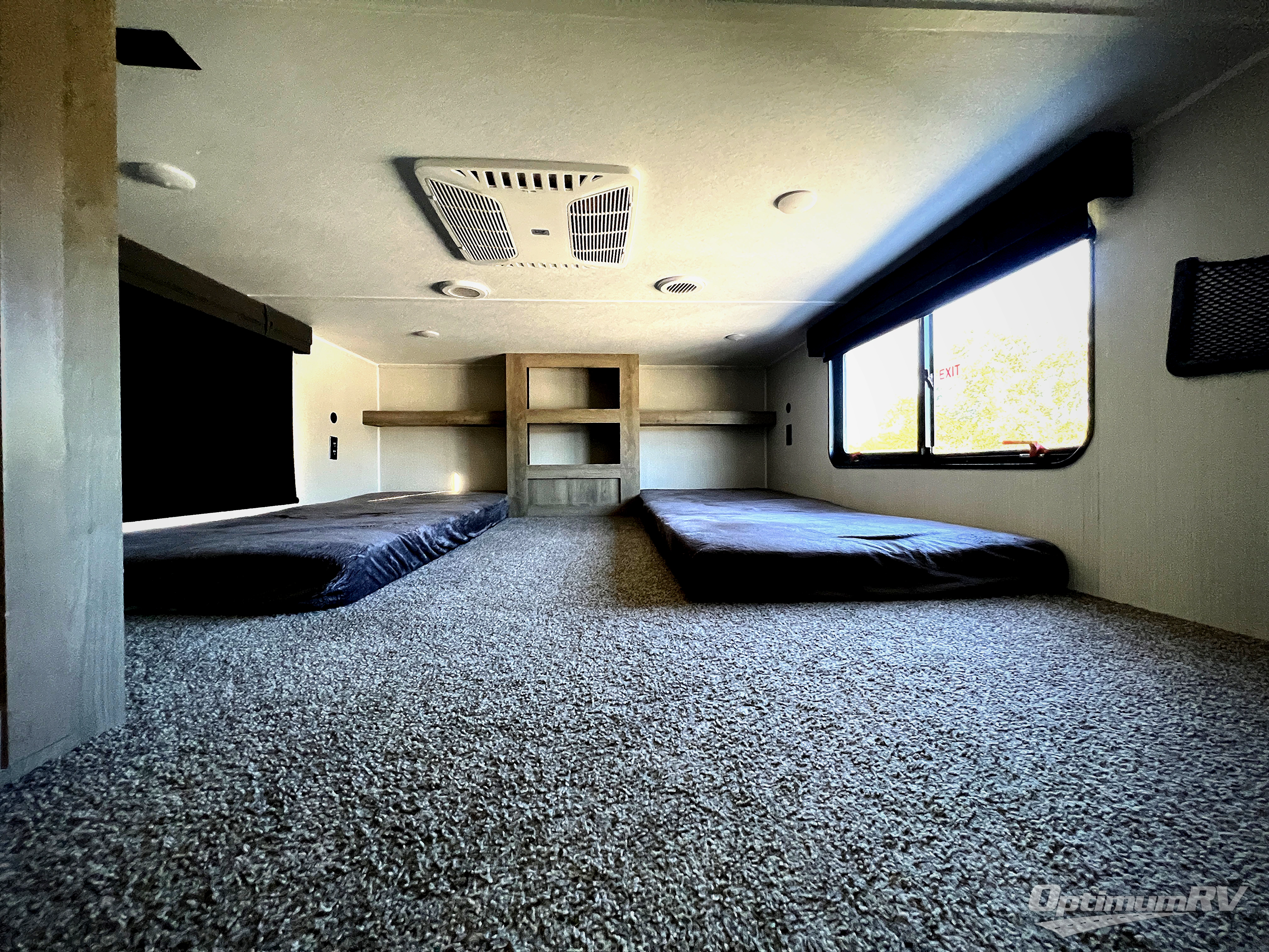 This is the perfect destination trailer for a larger group since it can sleep up to nine campers each night. The little ones will love the double loft areas with three bunk mats and storage space for their things, while you take the rear private bedroom. There is a king bed slide out here, along with a wardrobe/closet for your clothes, plus a second closet with the option to add washer and dryer prep. Everyone can meet in the middle living room to relax on the dual sofas or recliners across from the fireplace and entertainment center. Head to the front of the unit where you'll find the kitchen that includes ample counter space to prep meals, a residential style refrigerator and pantry for food storage, and a free-standing table to dine at. There is also a breakfast nook that overlooks the living area so you can visit with the cook and watch a movie at the same time!