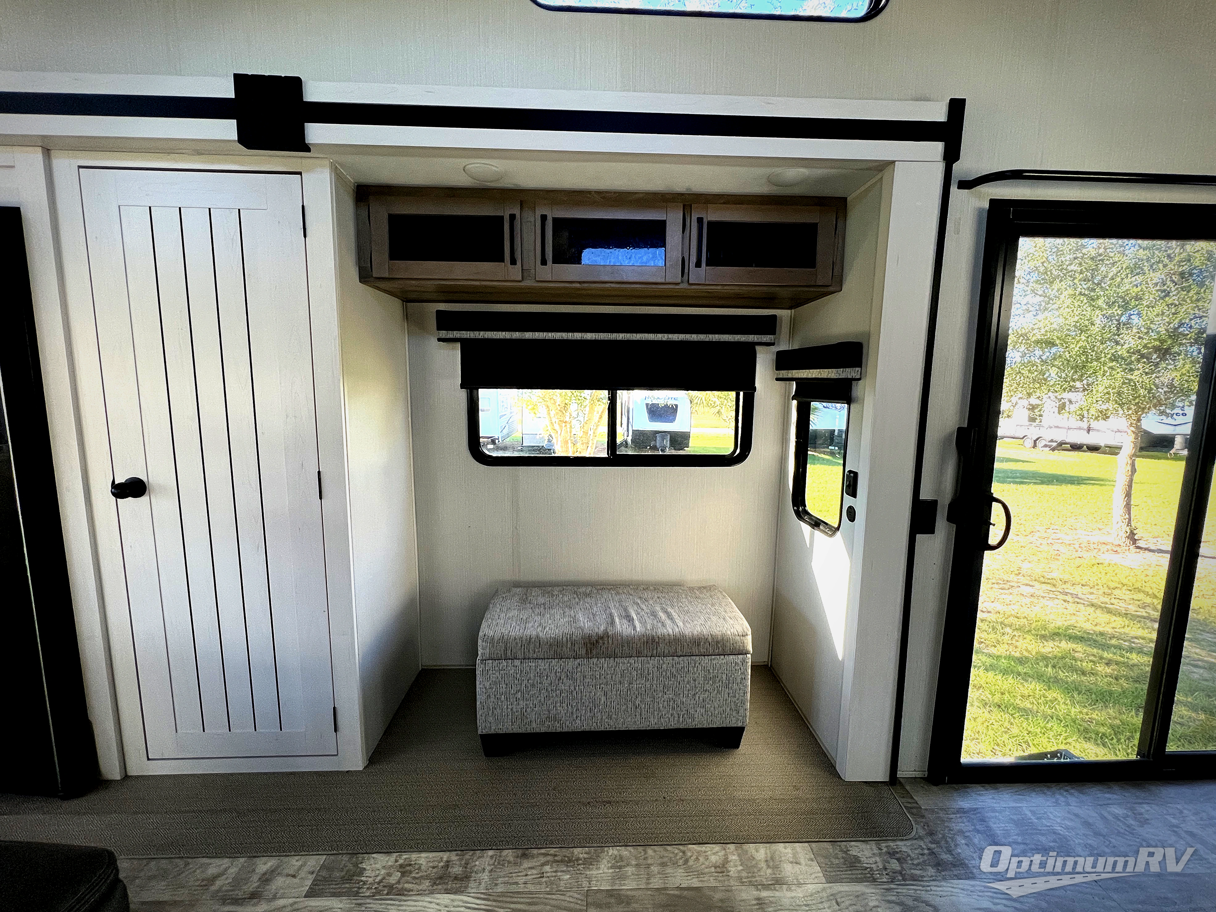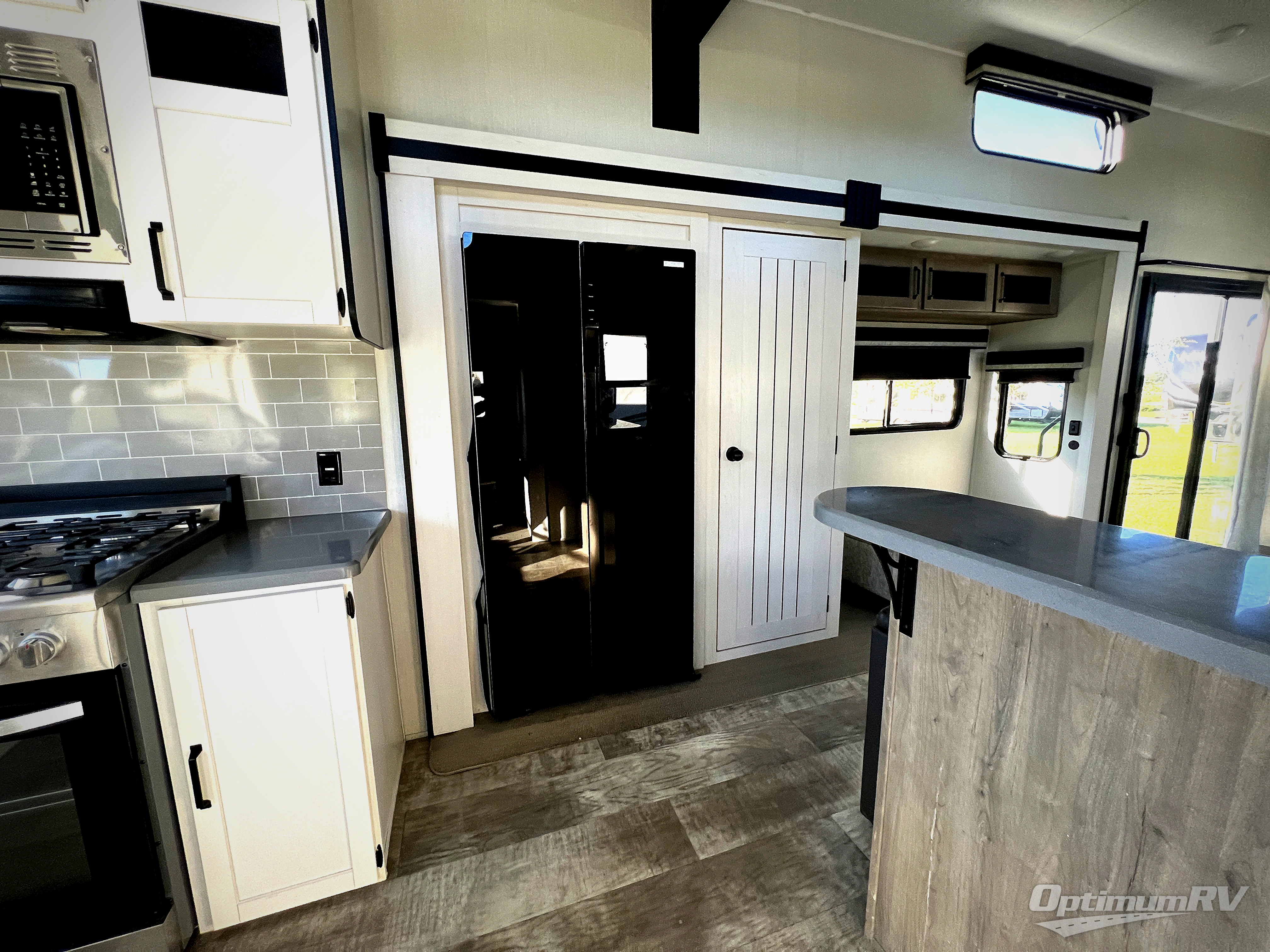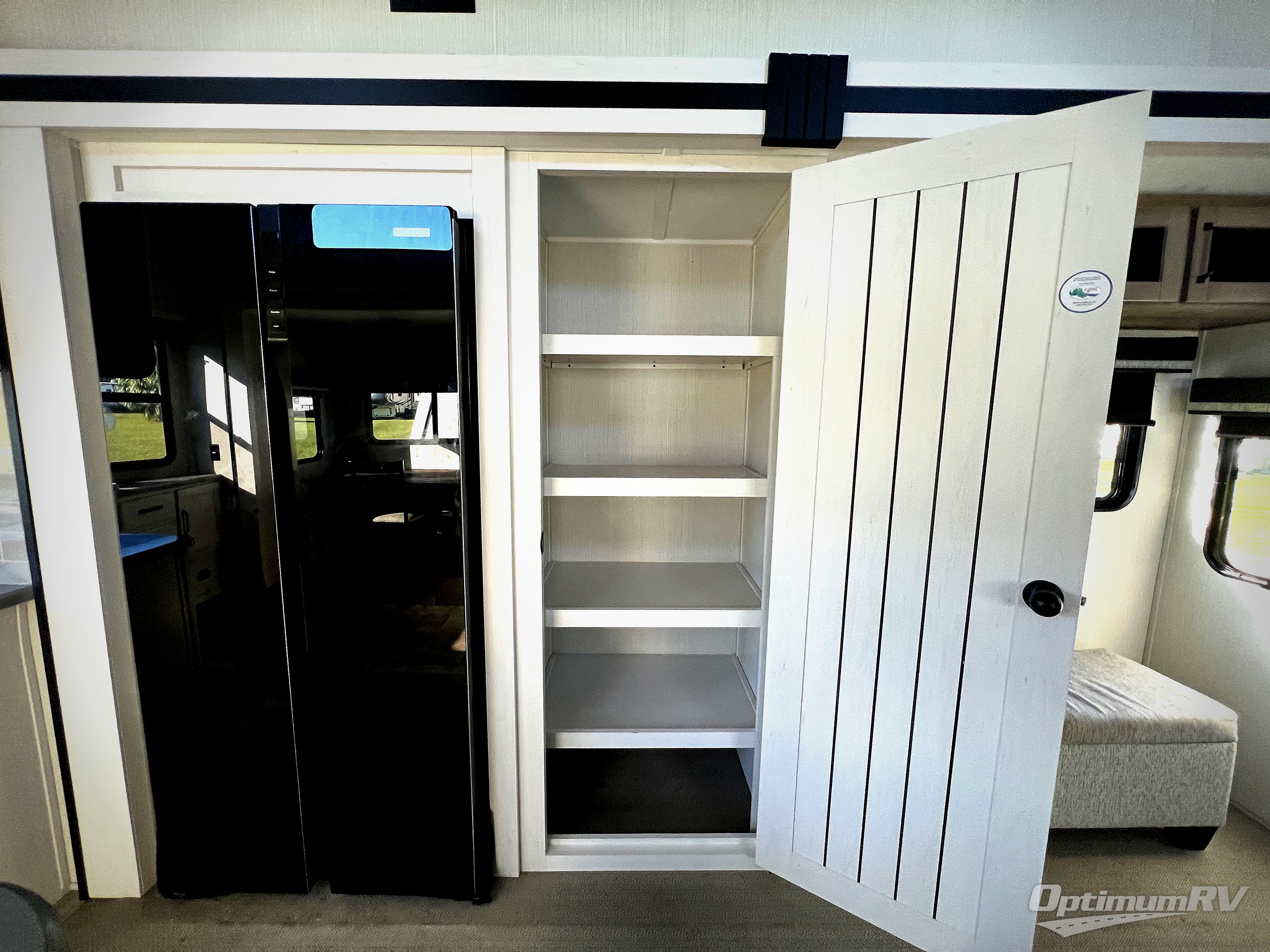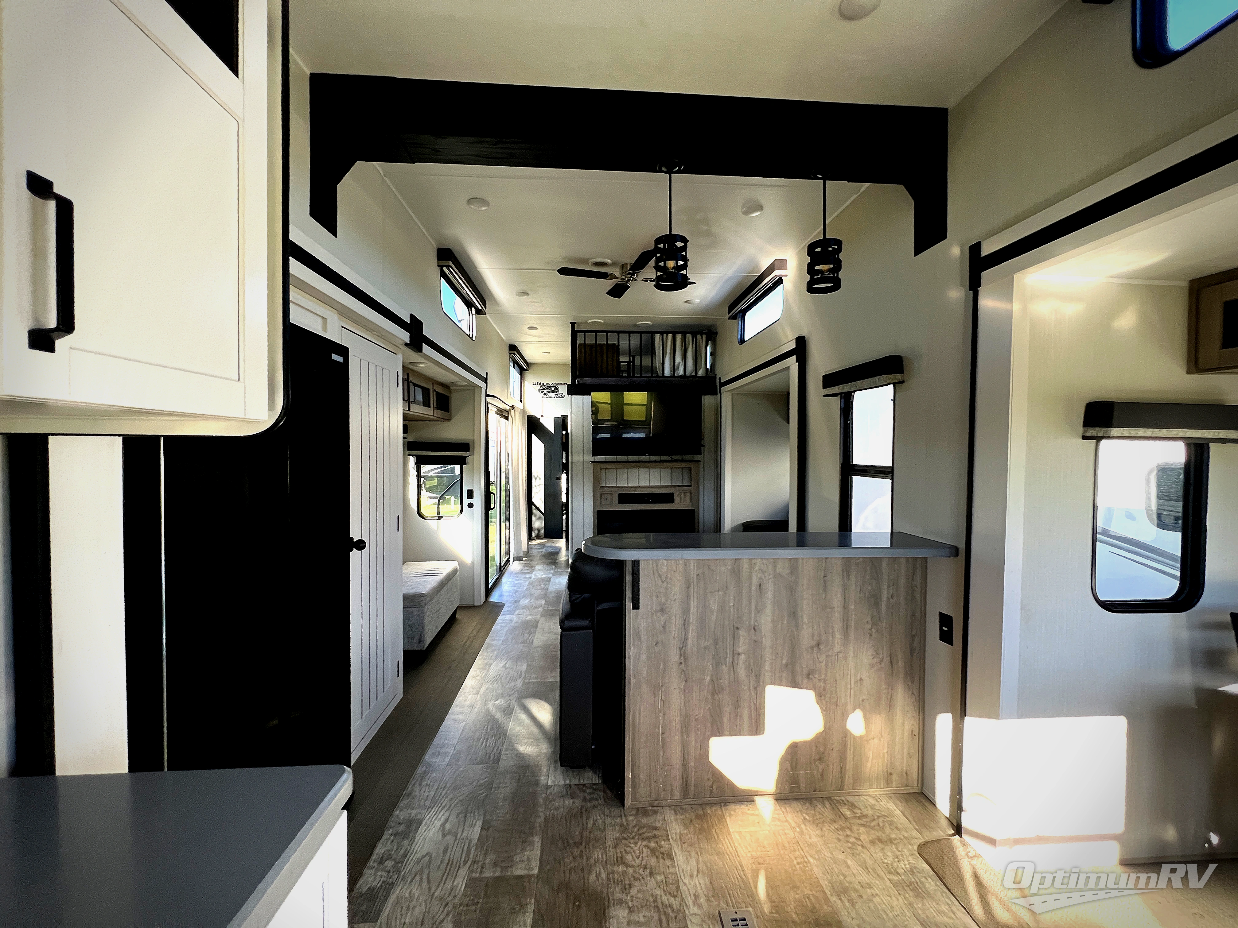 This is the perfect destination trailer for a larger group since it can sleep up to nine campers each night. The little ones will love the double loft areas with three bunk mats and storage space for their things, while you take the rear private bedroom. There is a king bed slide out here, along with a wardrobe/closet for your clothes, plus a second closet with the option to add washer and dryer prep. Everyone can meet in the middle living room to relax on the dual sofas or recliners across from the fireplace and entertainment center. Head to the front of the unit where you'll find the kitchen that includes ample counter space to prep meals, a residential style refrigerator and pantry for food storage, and a free-standing table to dine at. There is also a breakfast nook that overlooks the living area so you can visit with the cook and watch a movie at the same time!