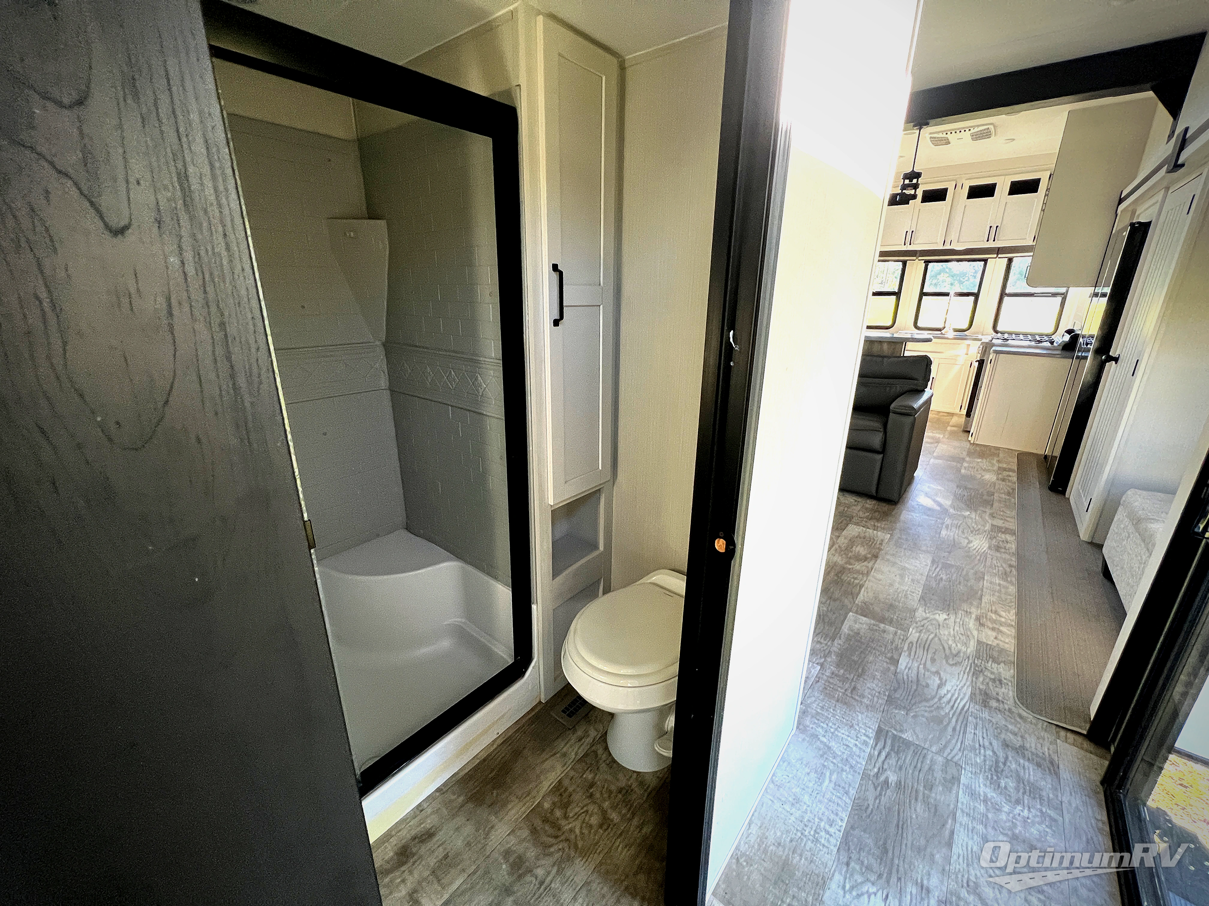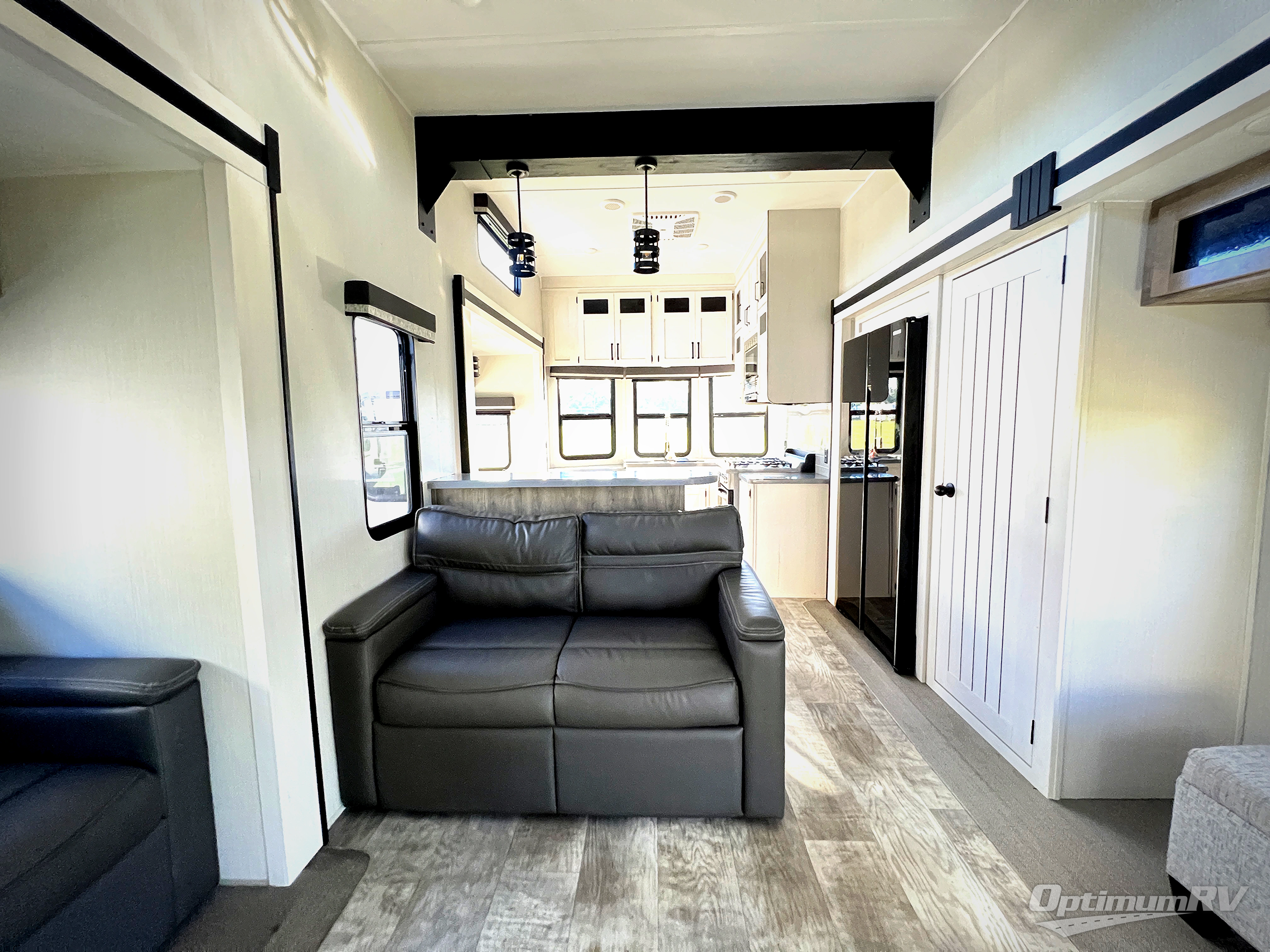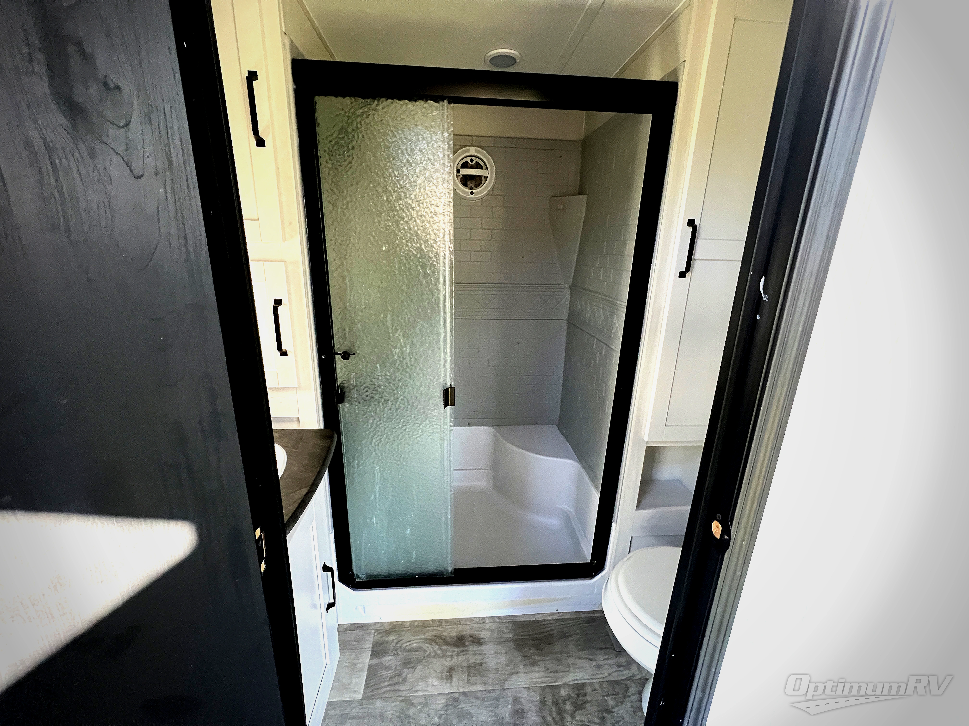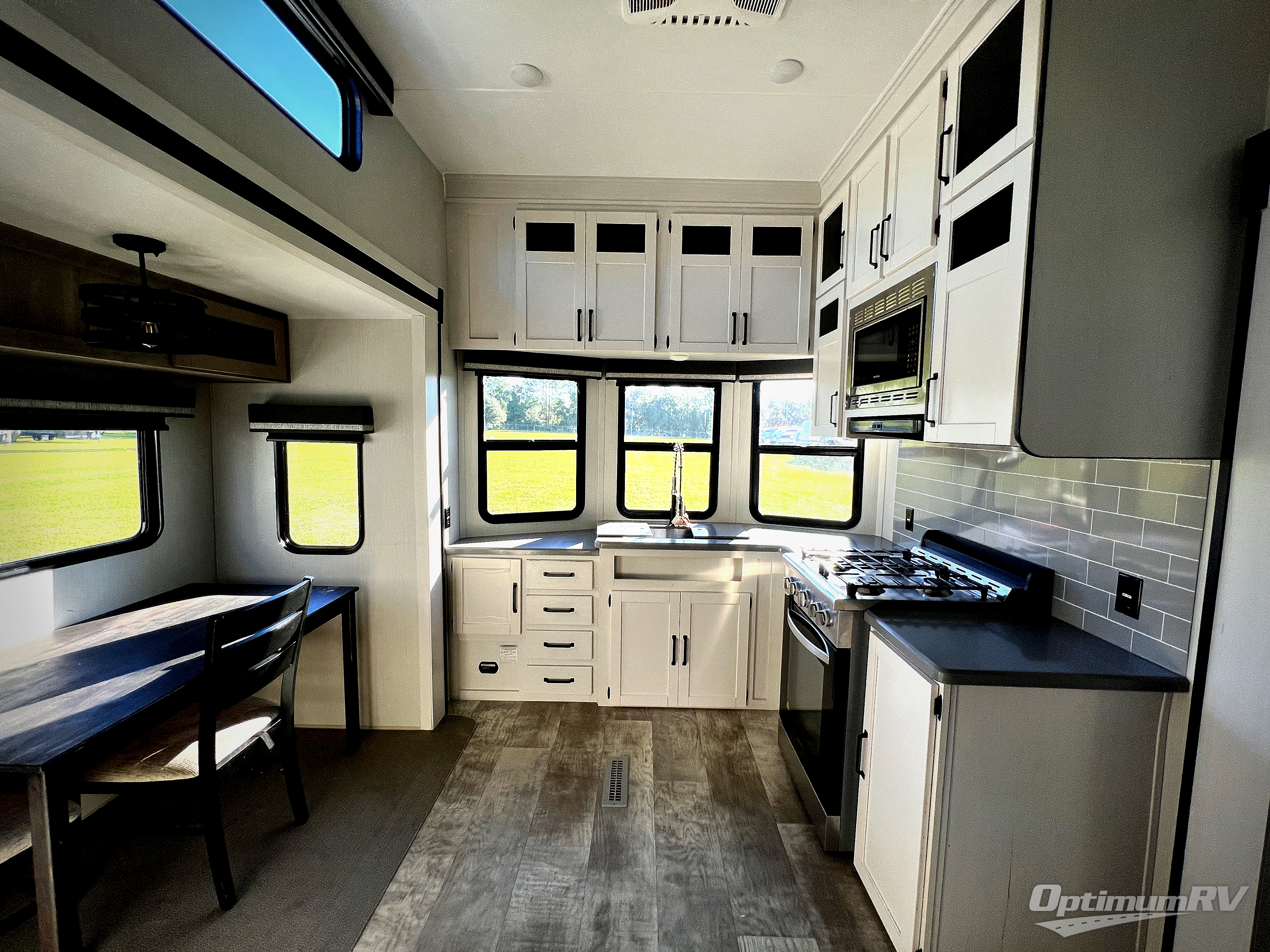 This is the perfect destination trailer for a larger group since it can sleep up to nine campers each night. The little ones will love the double loft areas with three bunk mats and storage space for their things, while you take the rear private bedroom. There is a king bed slide out here, along with a wardrobe/closet for your clothes, plus a second closet with the option to add washer and dryer prep. Everyone can meet in the middle living room to relax on the dual sofas or recliners across from the fireplace and entertainment center. Head to the front of the unit where you'll find the kitchen that includes ample counter space to prep meals, a residential style refrigerator and pantry for food storage, and a free-standing table to dine at. There is also a breakfast nook that overlooks the living area so you can visit with the cook and watch a movie at the same time!