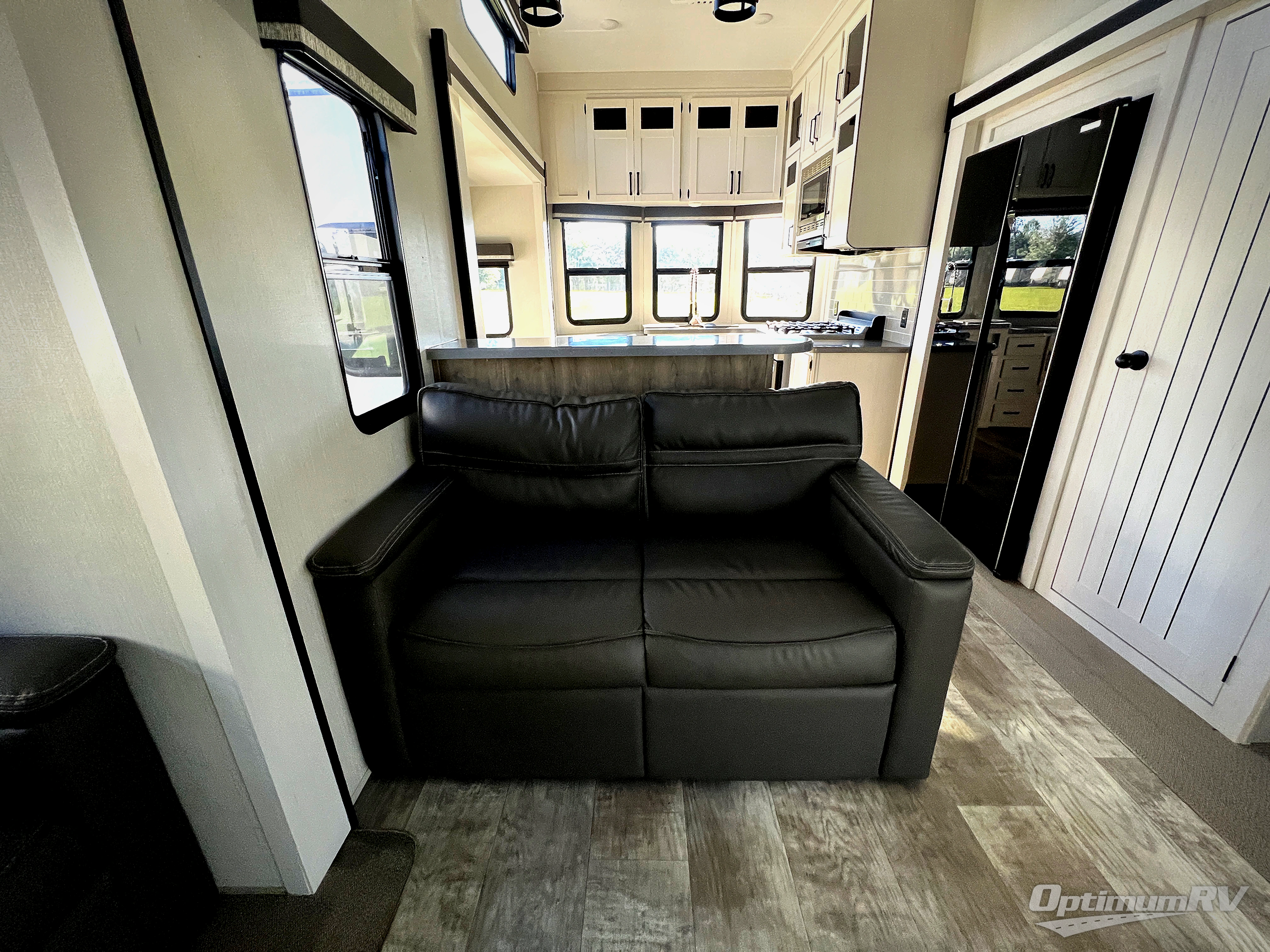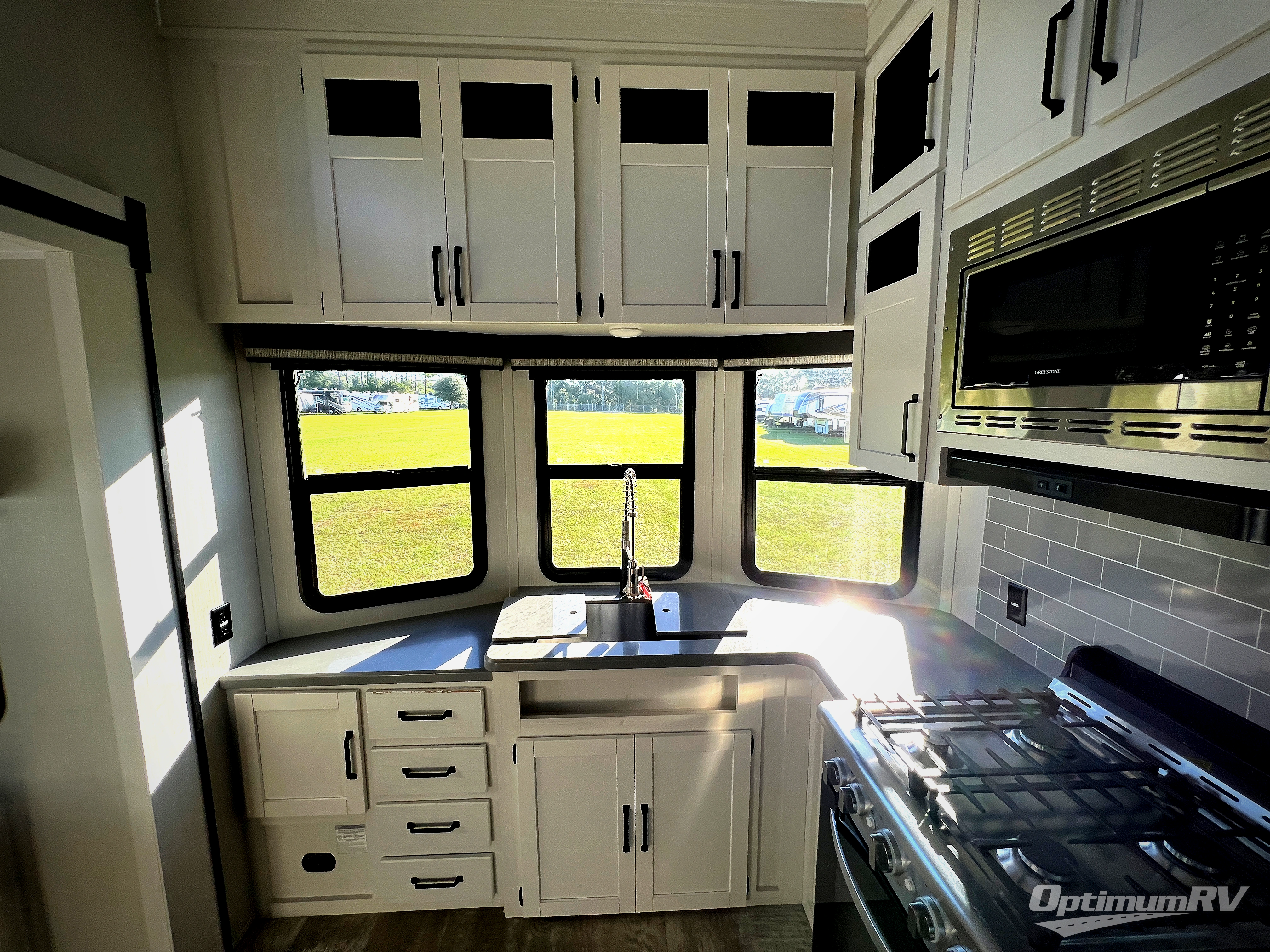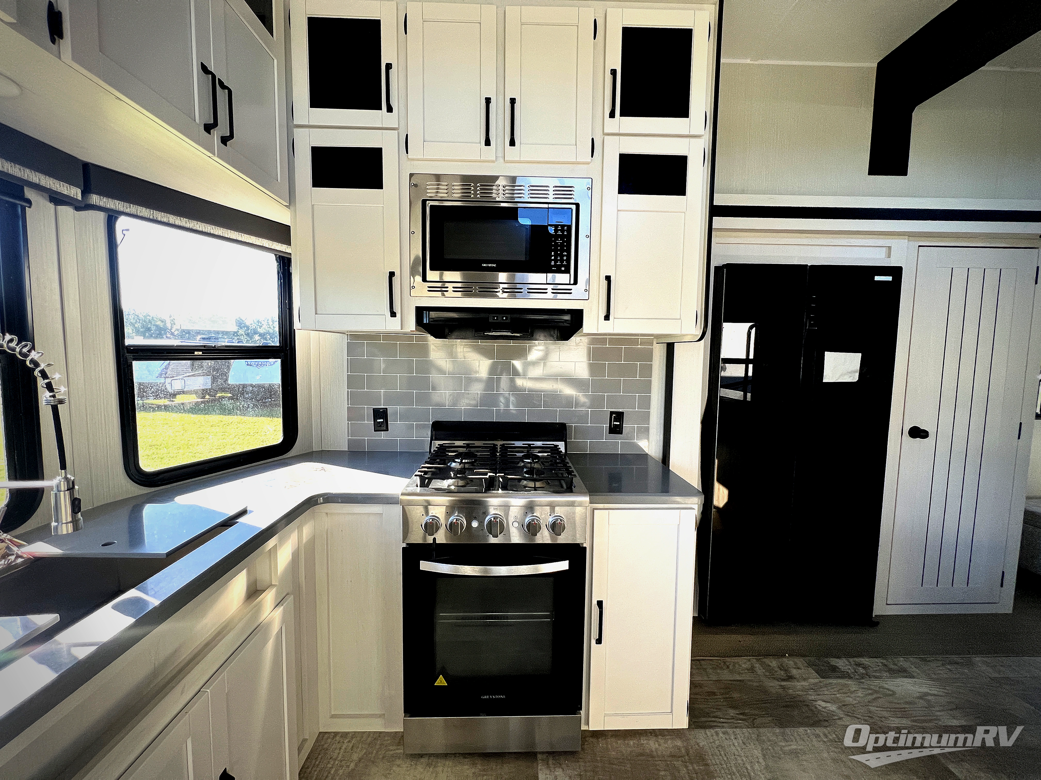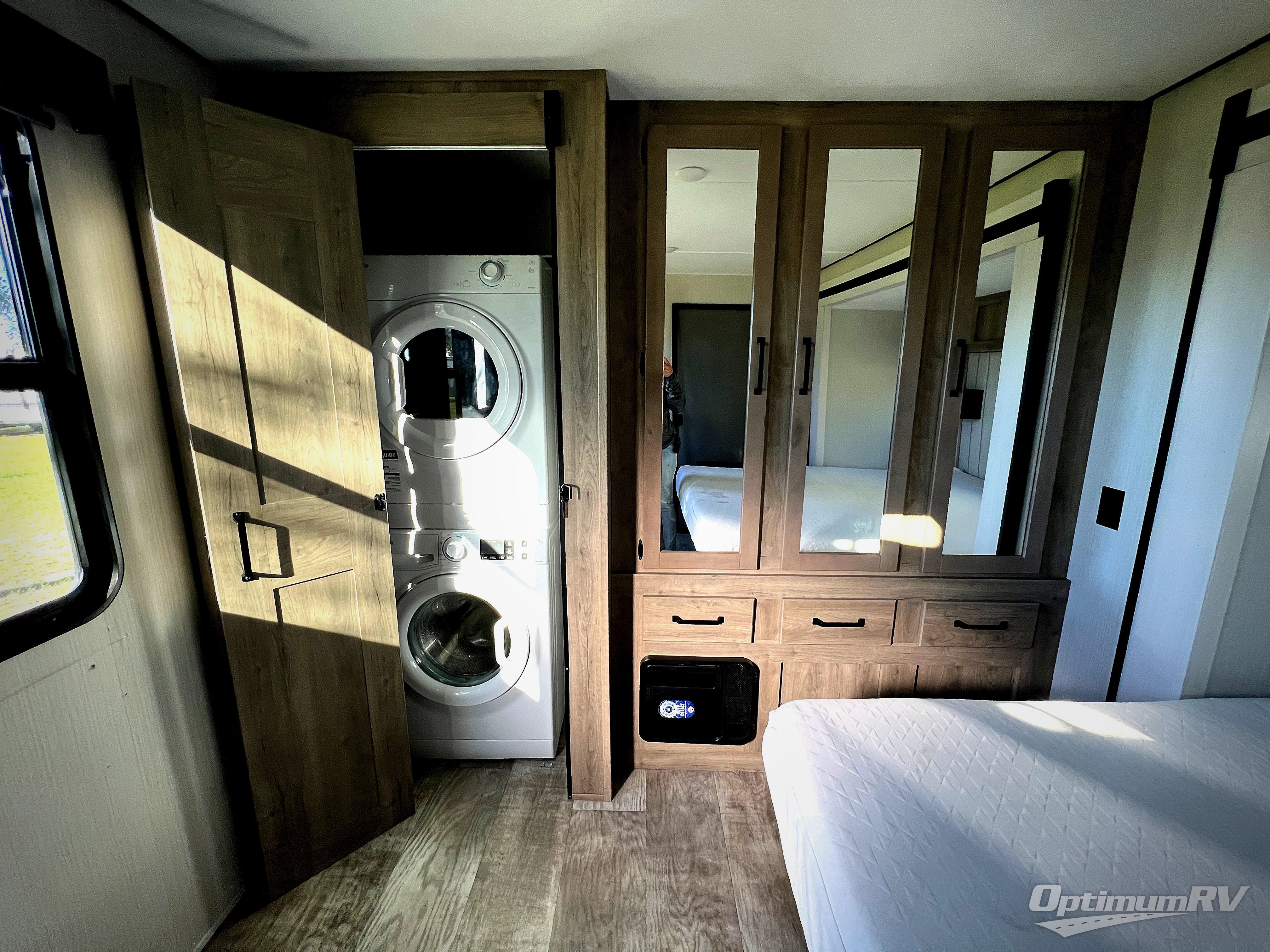 This is the perfect destination trailer for a larger group since it can sleep up to nine campers each night. The little ones will love the double loft areas with three bunk mats and storage space for their things, while you take the rear private bedroom. There is a king bed slide out here, along with a wardrobe/closet for your clothes, plus a second closet with the option to add washer and dryer prep. Everyone can meet in the middle living room to relax on the dual sofas or recliners across from the fireplace and entertainment center. Head to the front of the unit where you'll find the kitchen that includes ample counter space to prep meals, a residential style refrigerator and pantry for food storage, and a free-standing table to dine at. There is also a breakfast nook that overlooks the living area so you can visit with the cook and watch a movie at the same time!