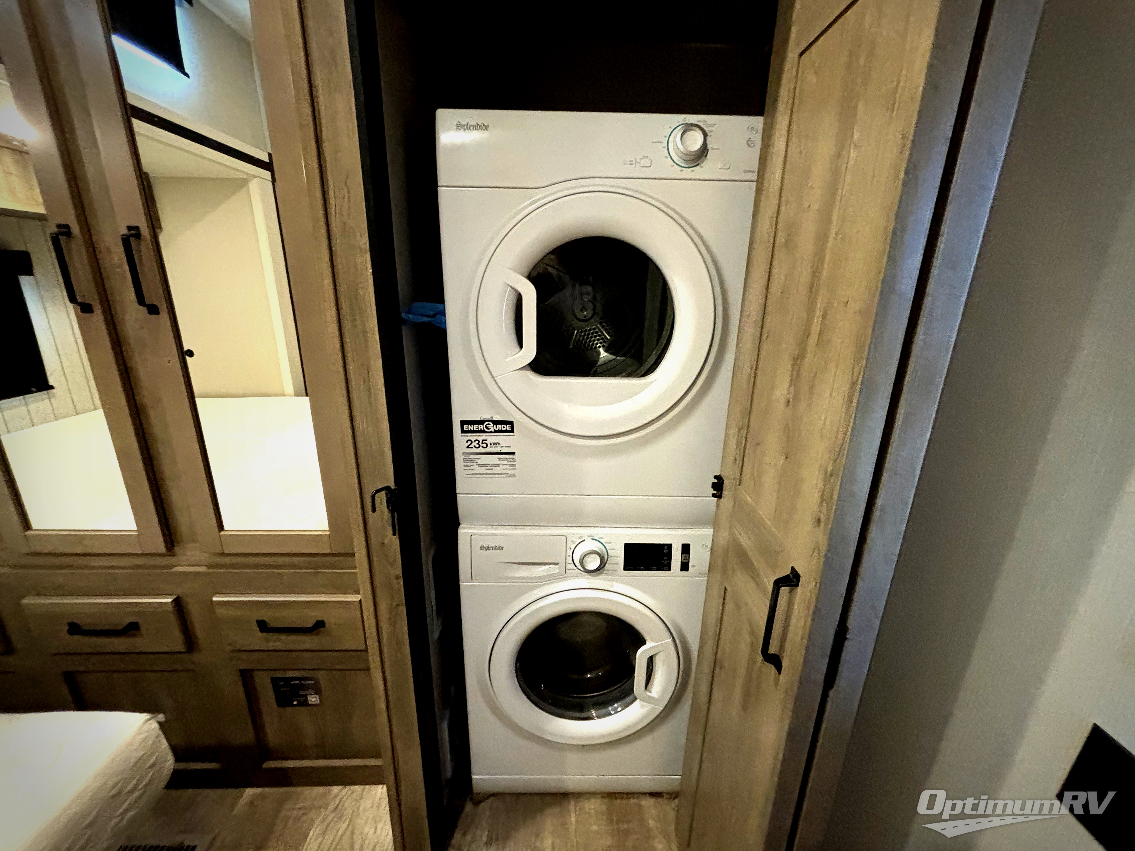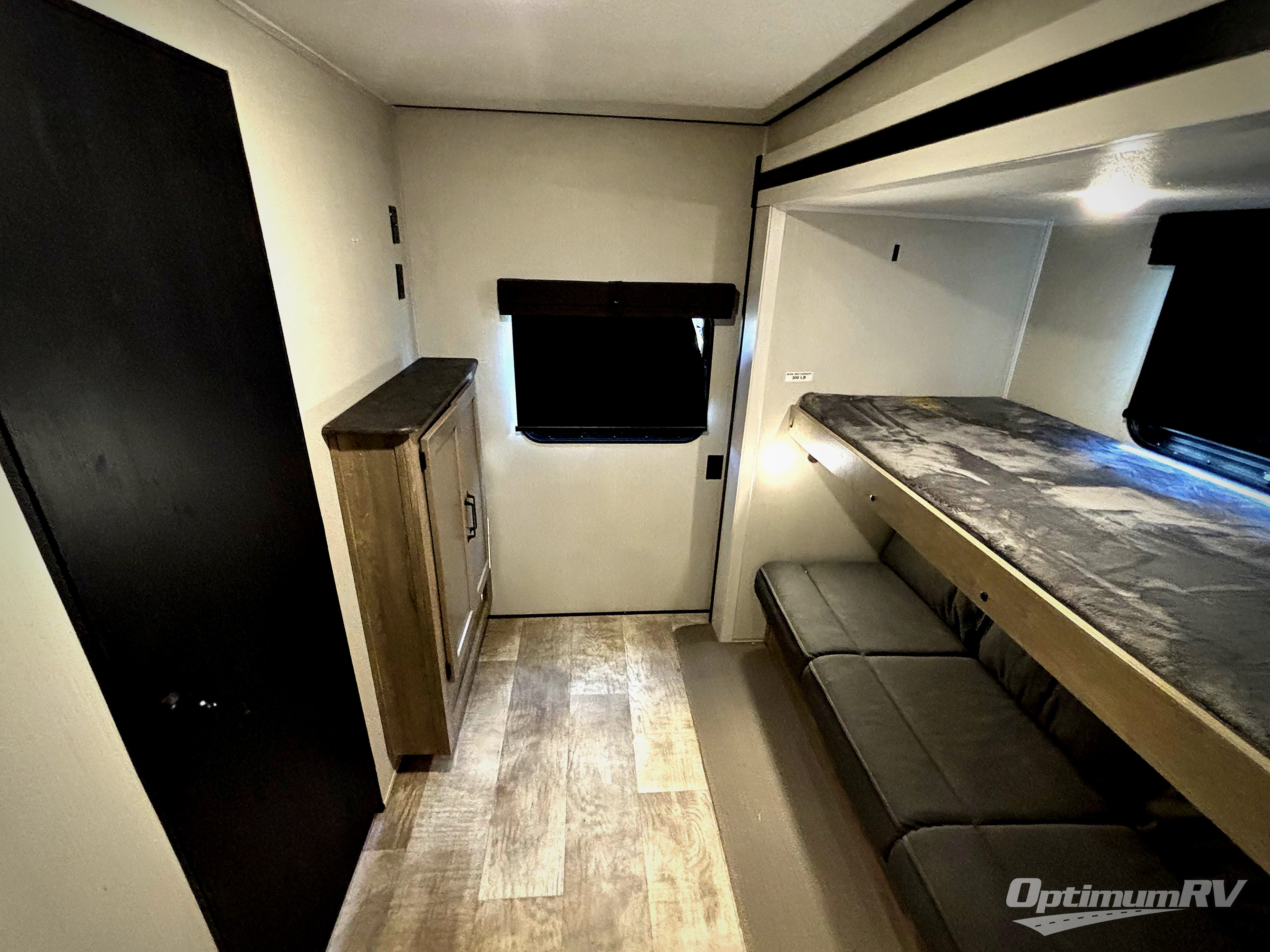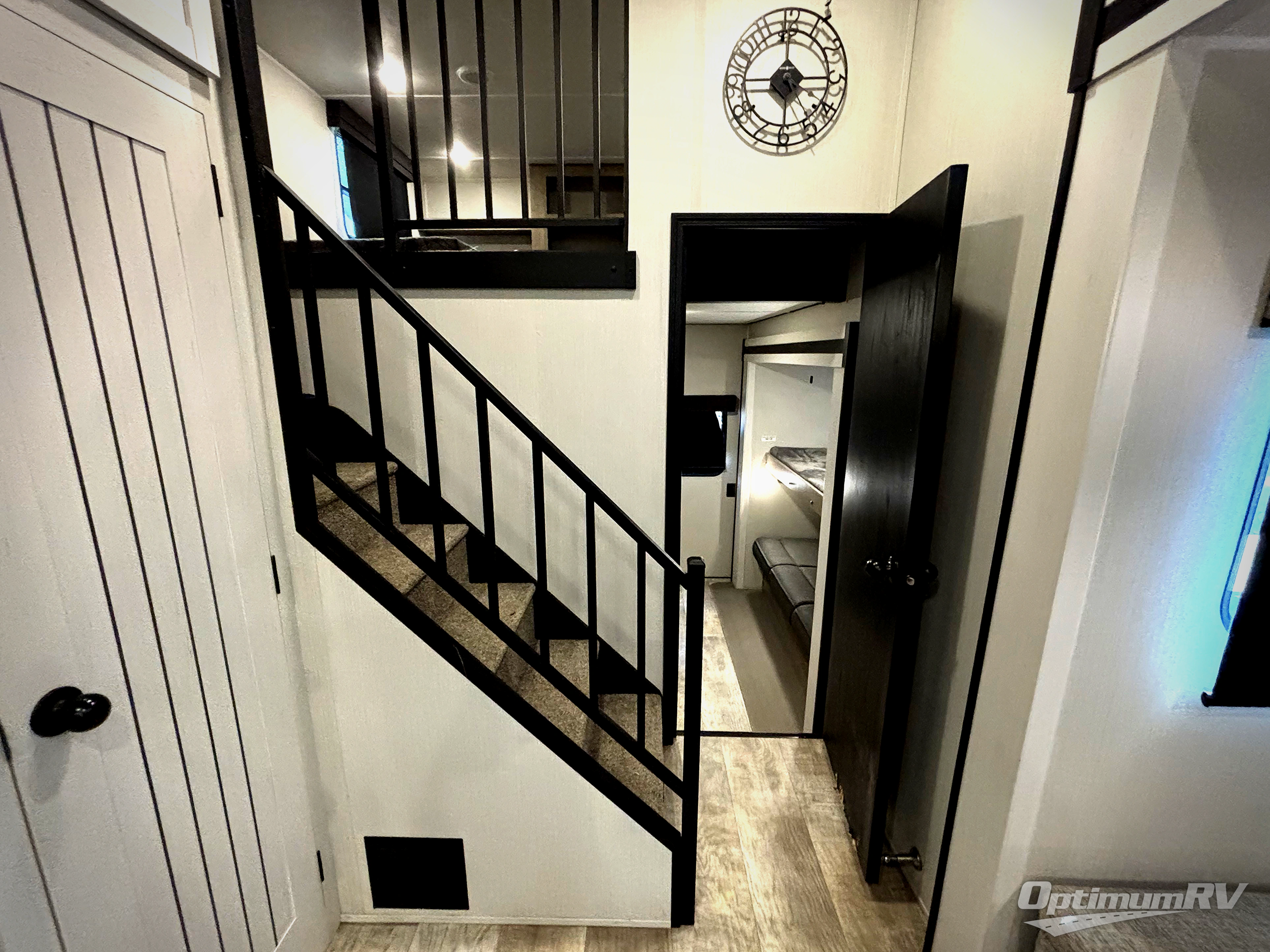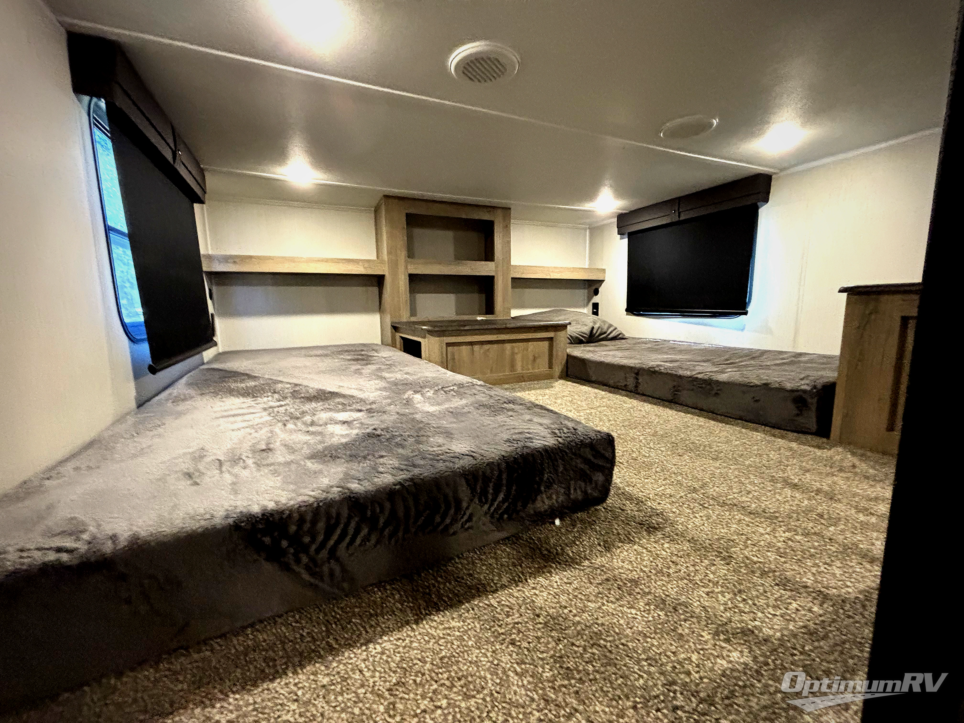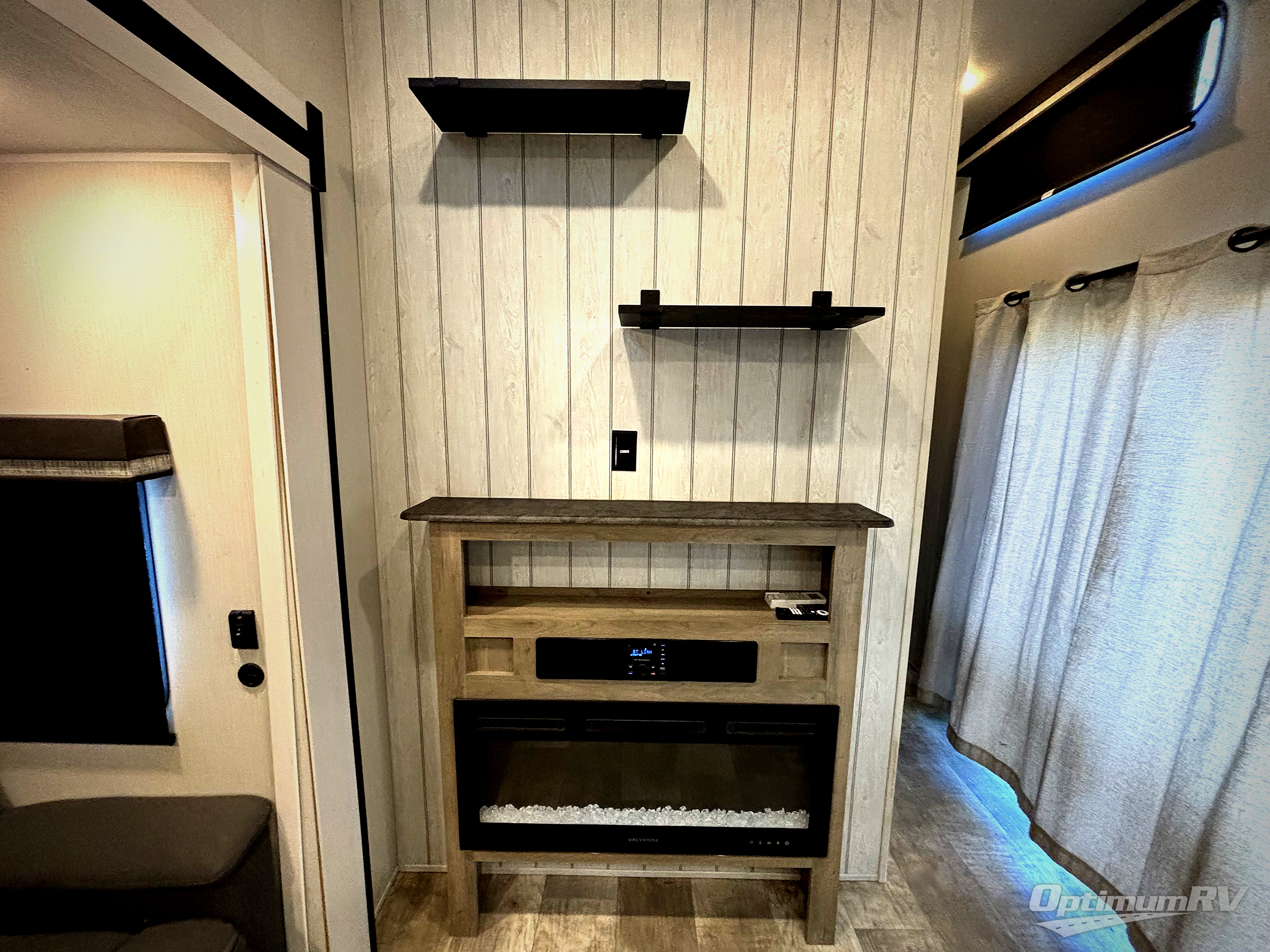 If you're planning to camp with a larger group or your family, this destination trailer will provide everything you're looking for! Your guests can take the rear bunkhouse suite that includes a slide out with a jiffy sofa and bunk bed, an entertainment center, and a full bath. You'll also find one of the dual entry doors here for added convenience. There are steps just outside the bunkhouse that lead to the loft with two bunk mats and storage space to keep this space tidy! The front private bedroom will be perfect for you with its king bed slide out, wardrobe/closet, and bedroom desk if you're needing to work from home. There is even a closet with the option to add washer and dryer prep. In the morning, everyone can meet in the combined middle living area and kitchen. A large slide out here houses the free-standing table and sofa, and the fireplace is close by to make it feel a little more like home!