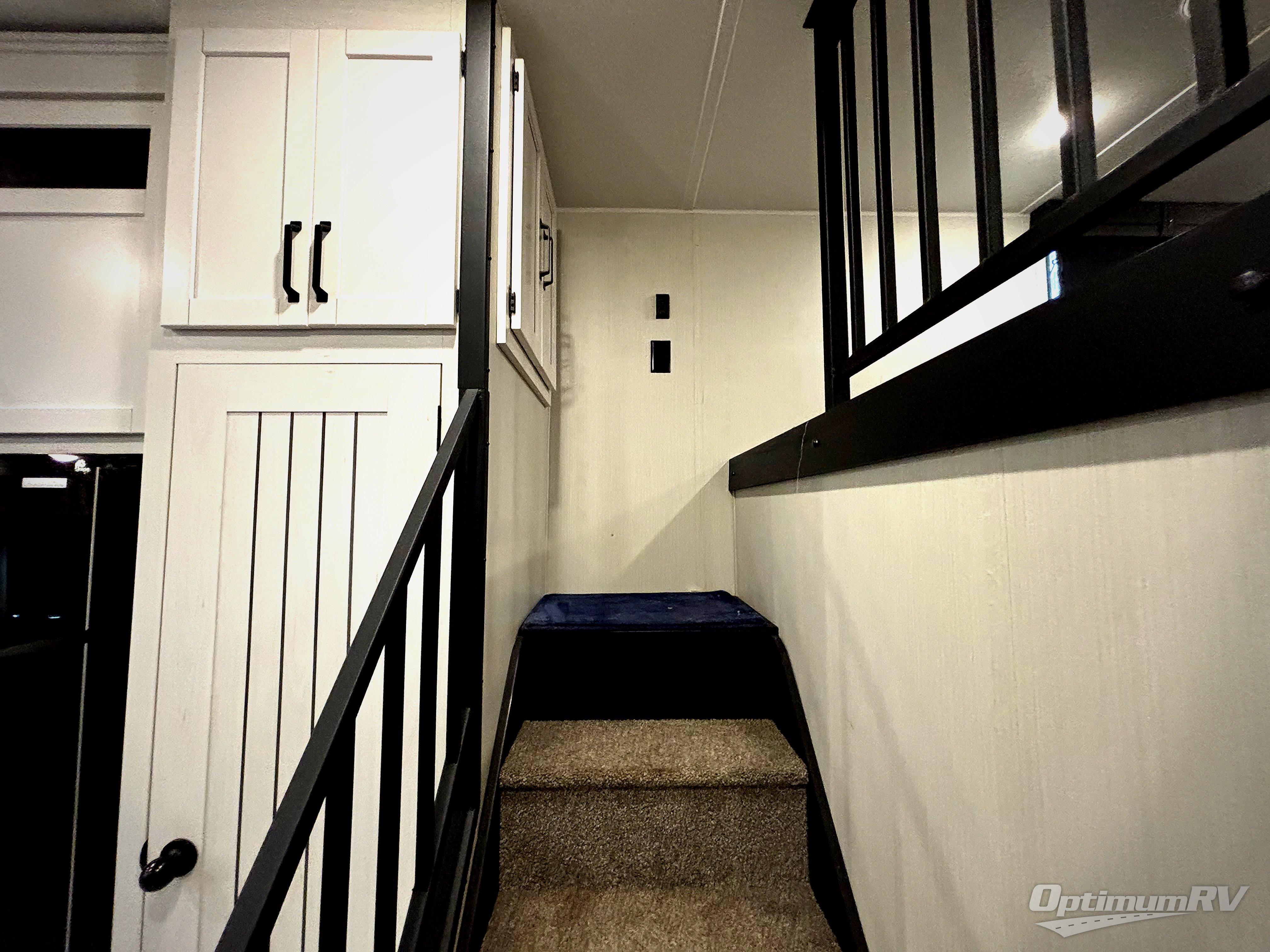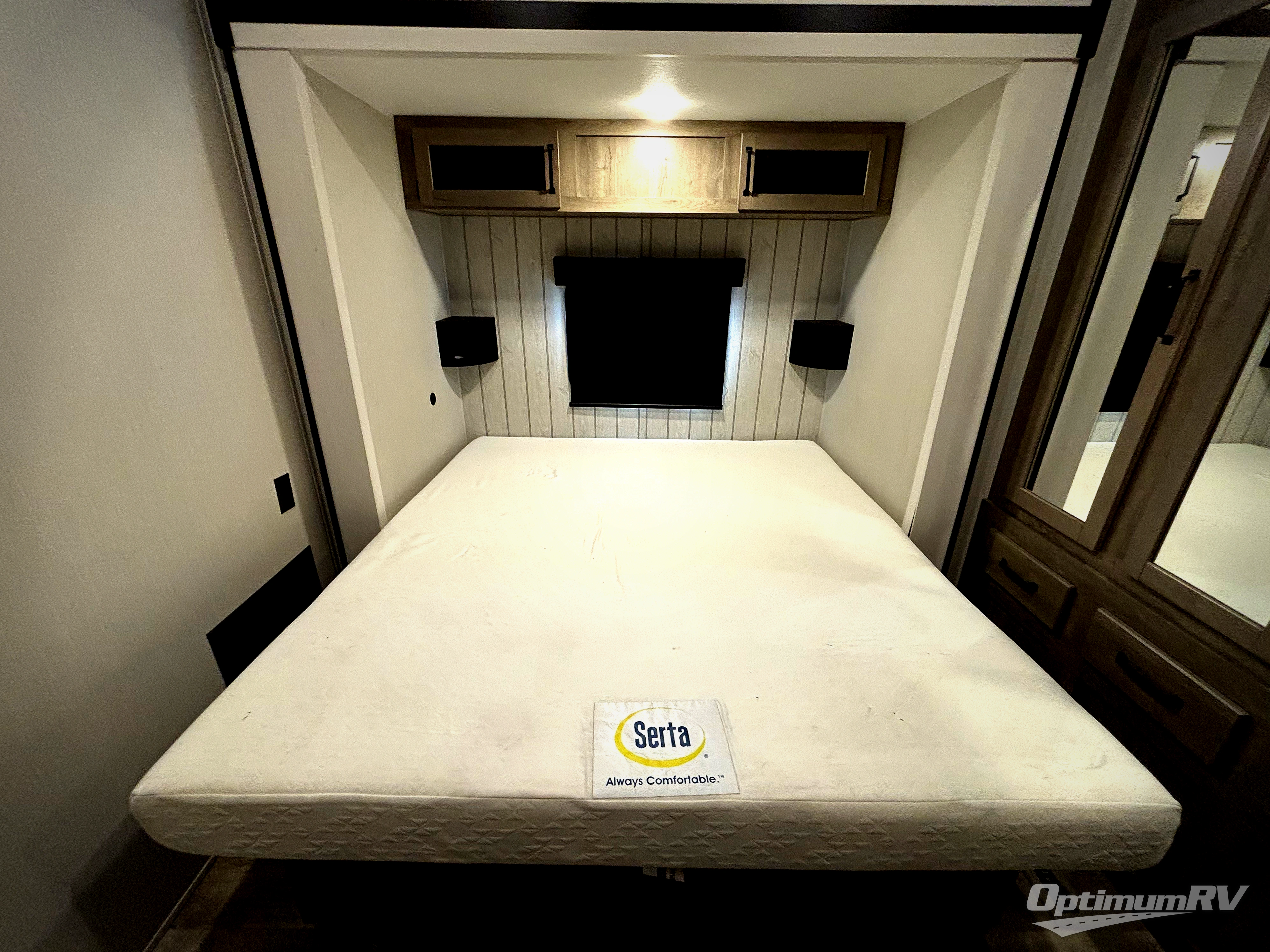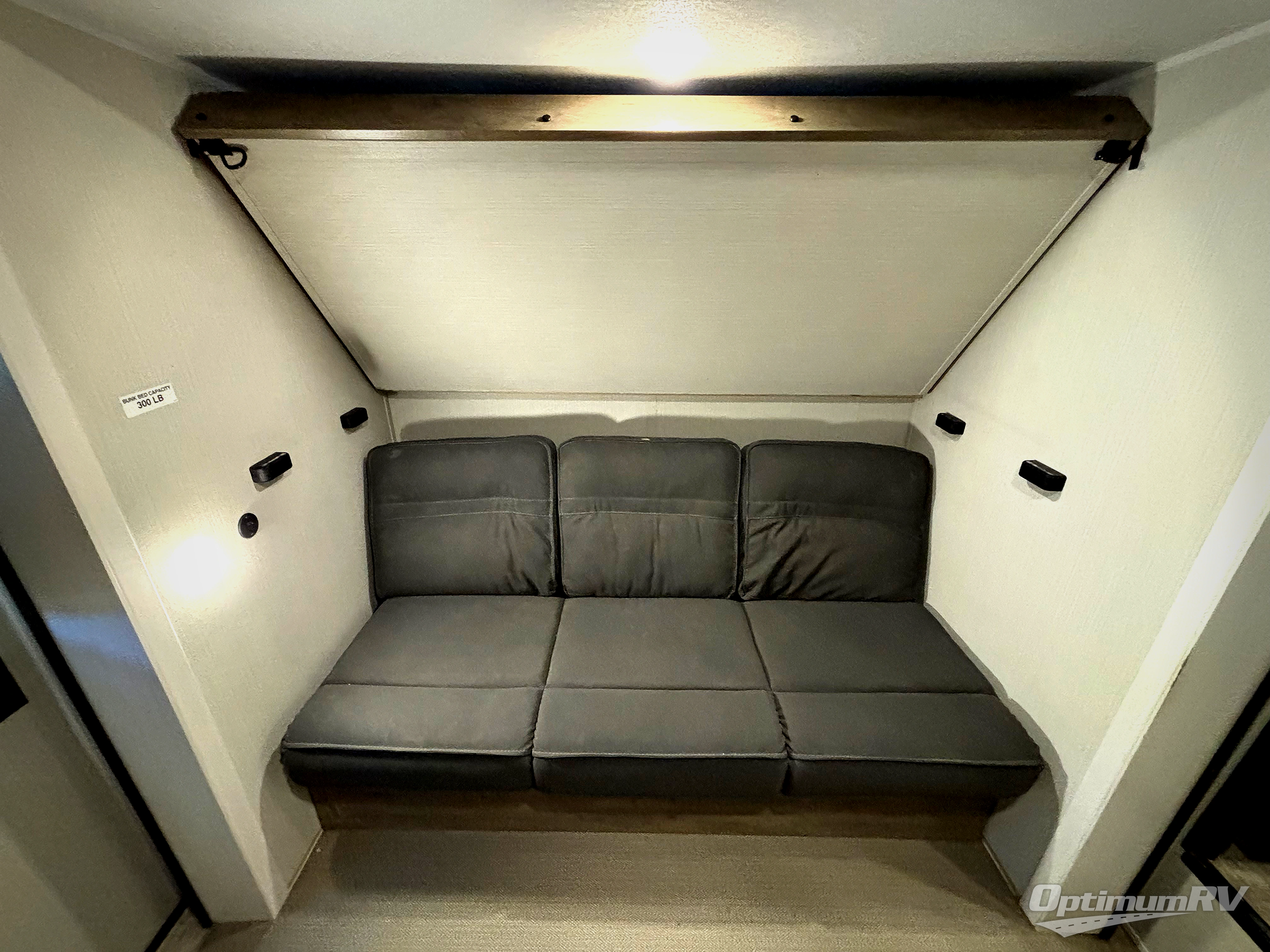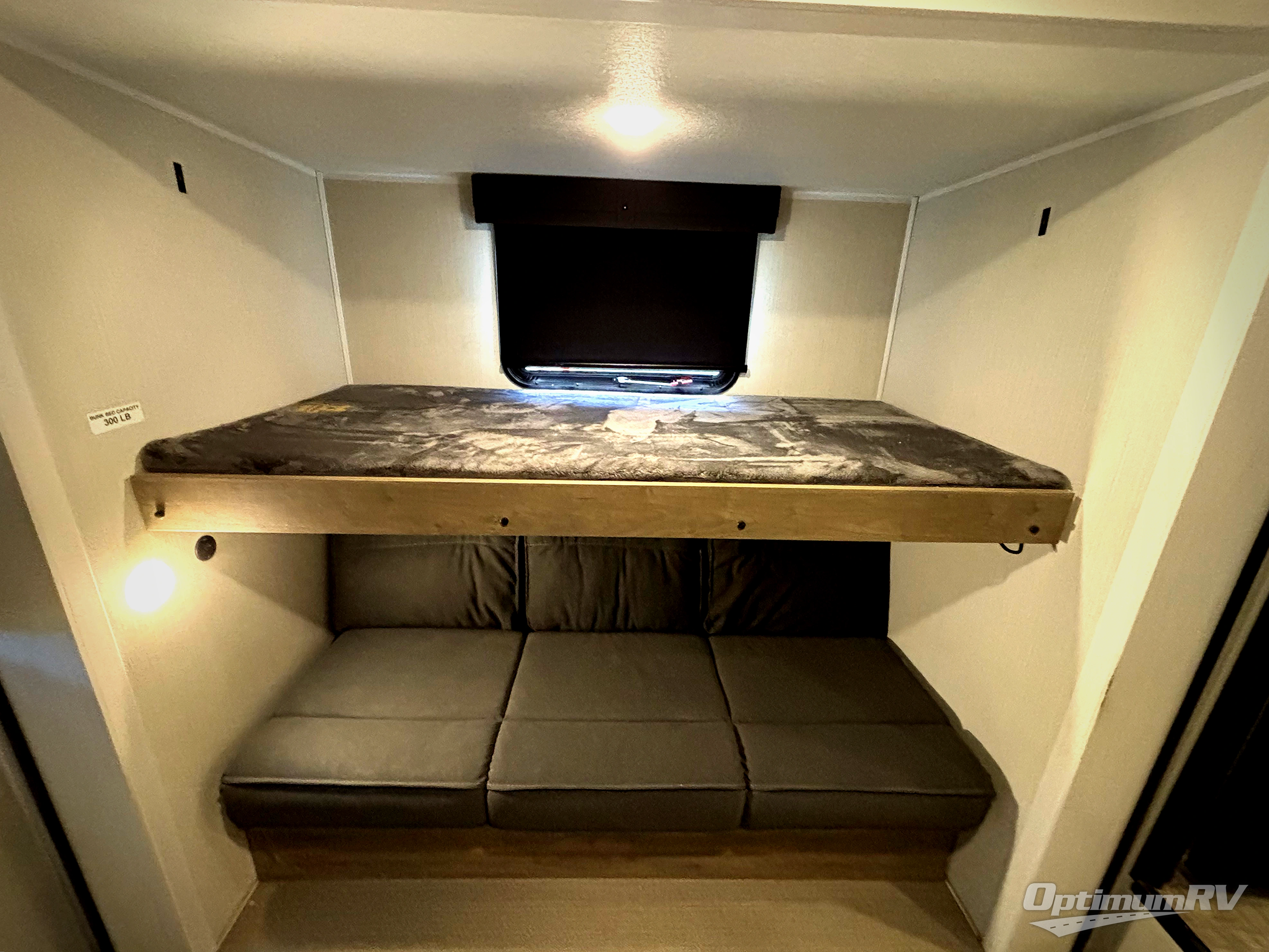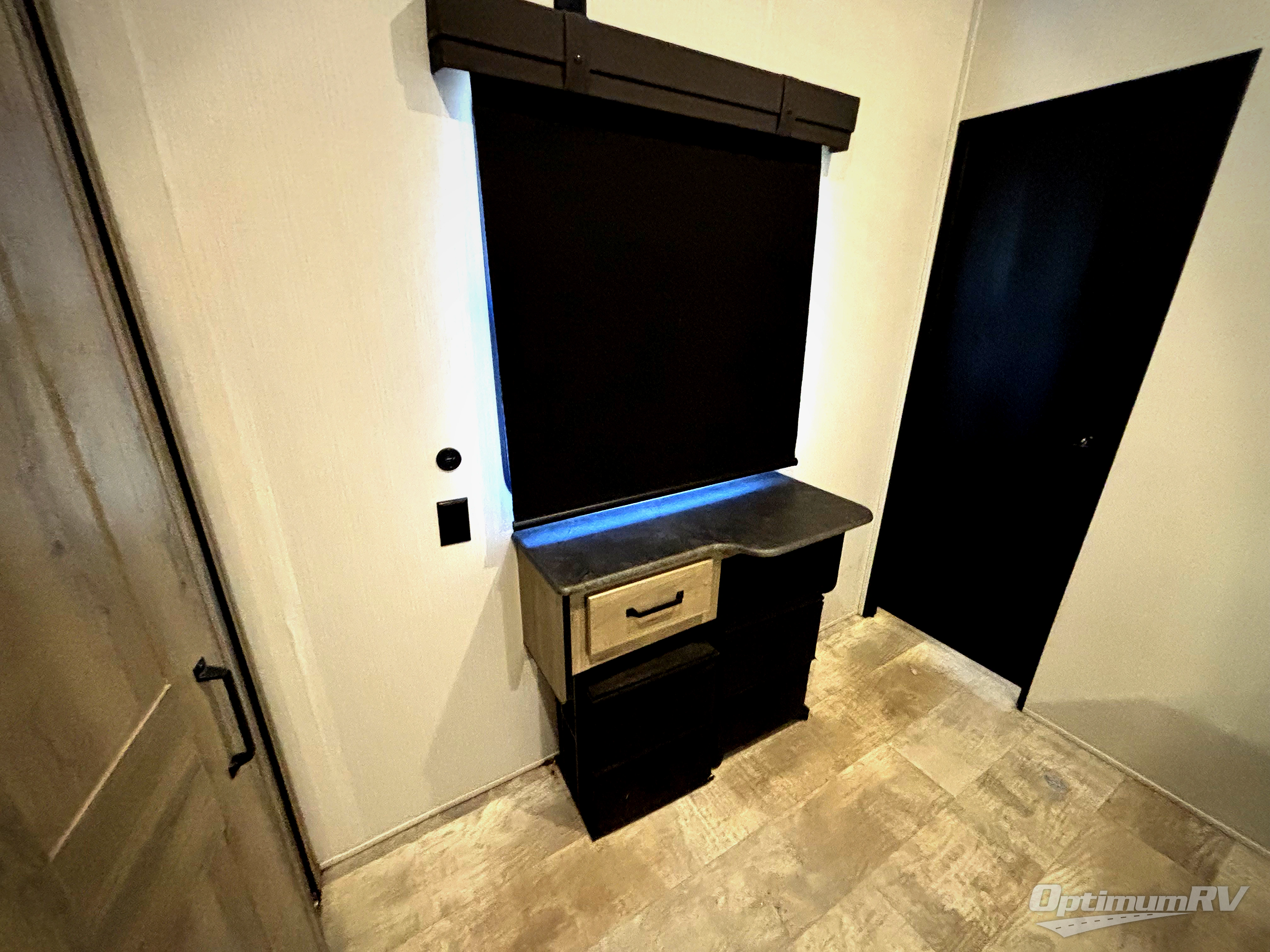 If you're planning to camp with a larger group or your family, this destination trailer will provide everything you're looking for! Your guests can take the rear bunkhouse suite that includes a slide out with a jiffy sofa and bunk bed, an entertainment center, and a full bath. You'll also find one of the dual entry doors here for added convenience. There are steps just outside the bunkhouse that lead to the loft with two bunk mats and storage space to keep this space tidy! The front private bedroom will be perfect for you with its king bed slide out, wardrobe/closet, and bedroom desk if you're needing to work from home. There is even a closet with the option to add washer and dryer prep. In the morning, everyone can meet in the combined middle living area and kitchen. A large slide out here houses the free-standing table and sofa, and the fireplace is close by to make it feel a little more like home!
