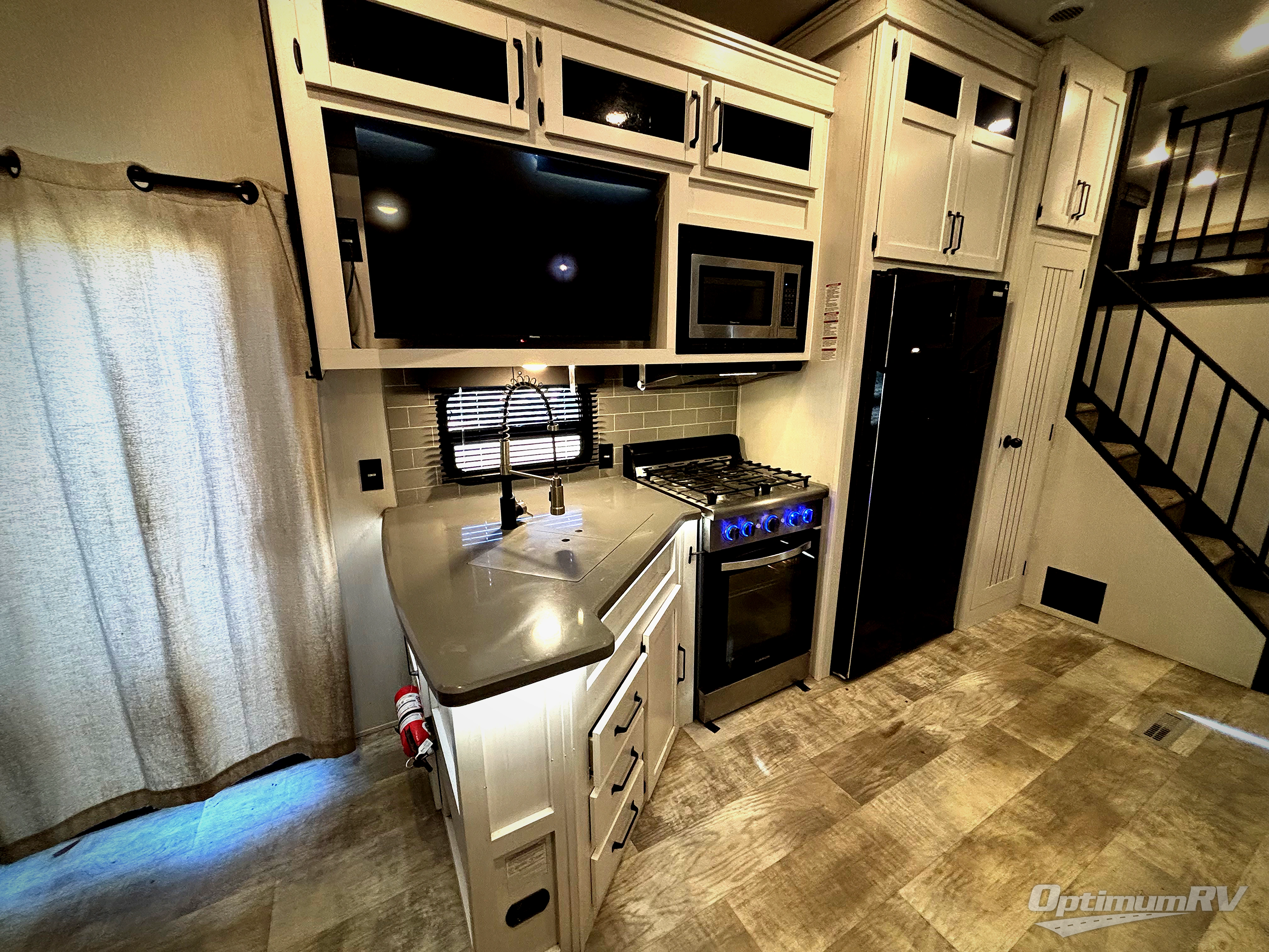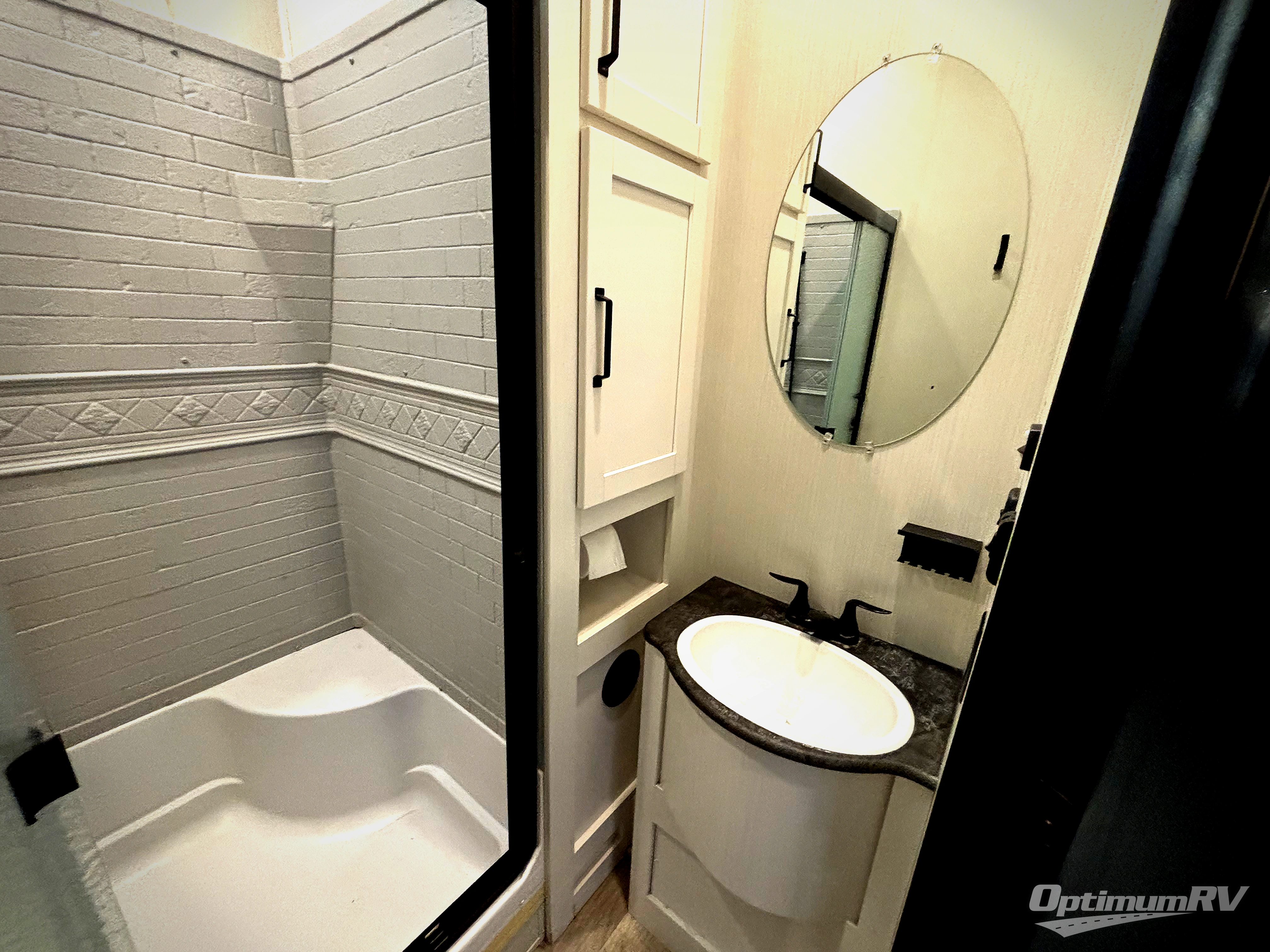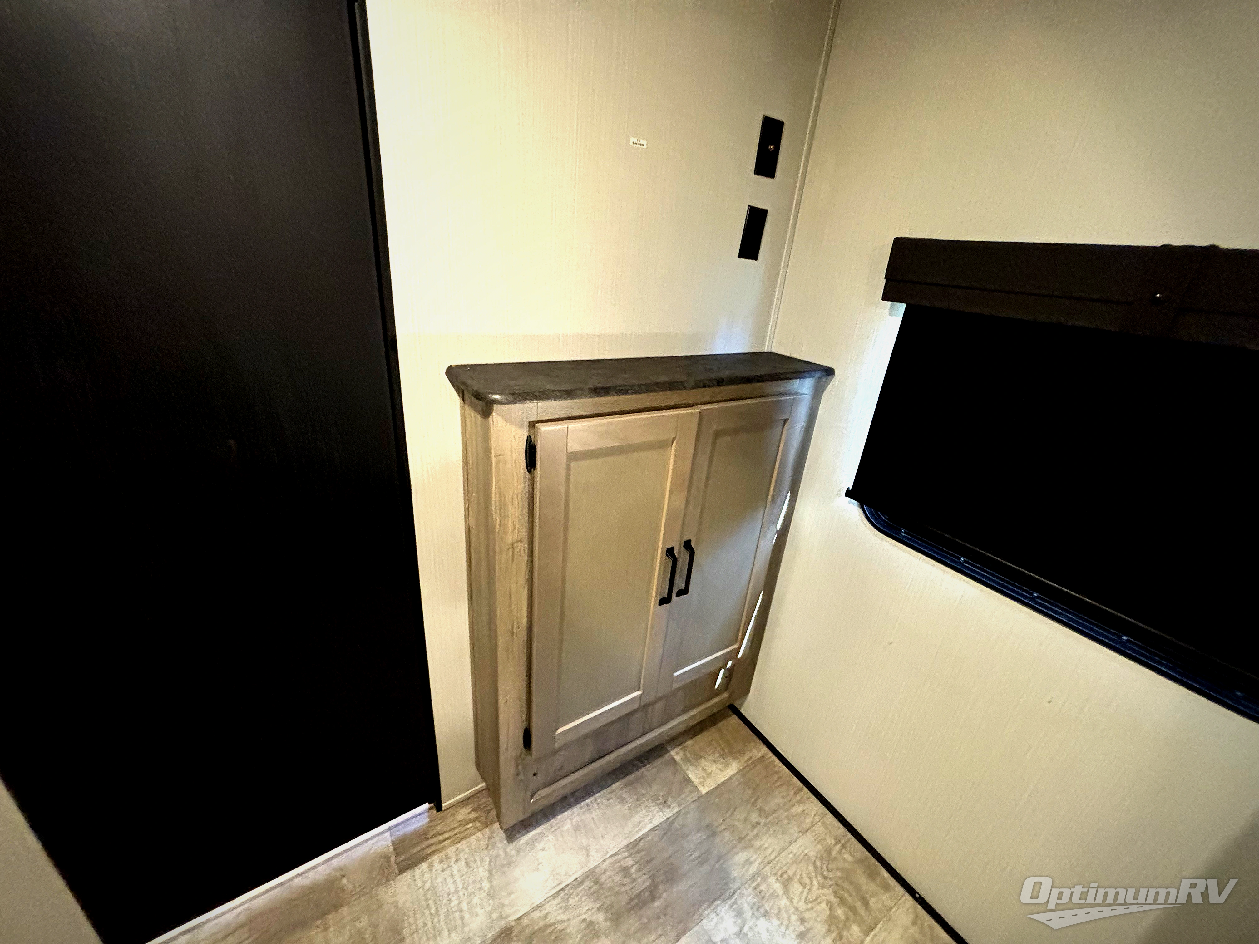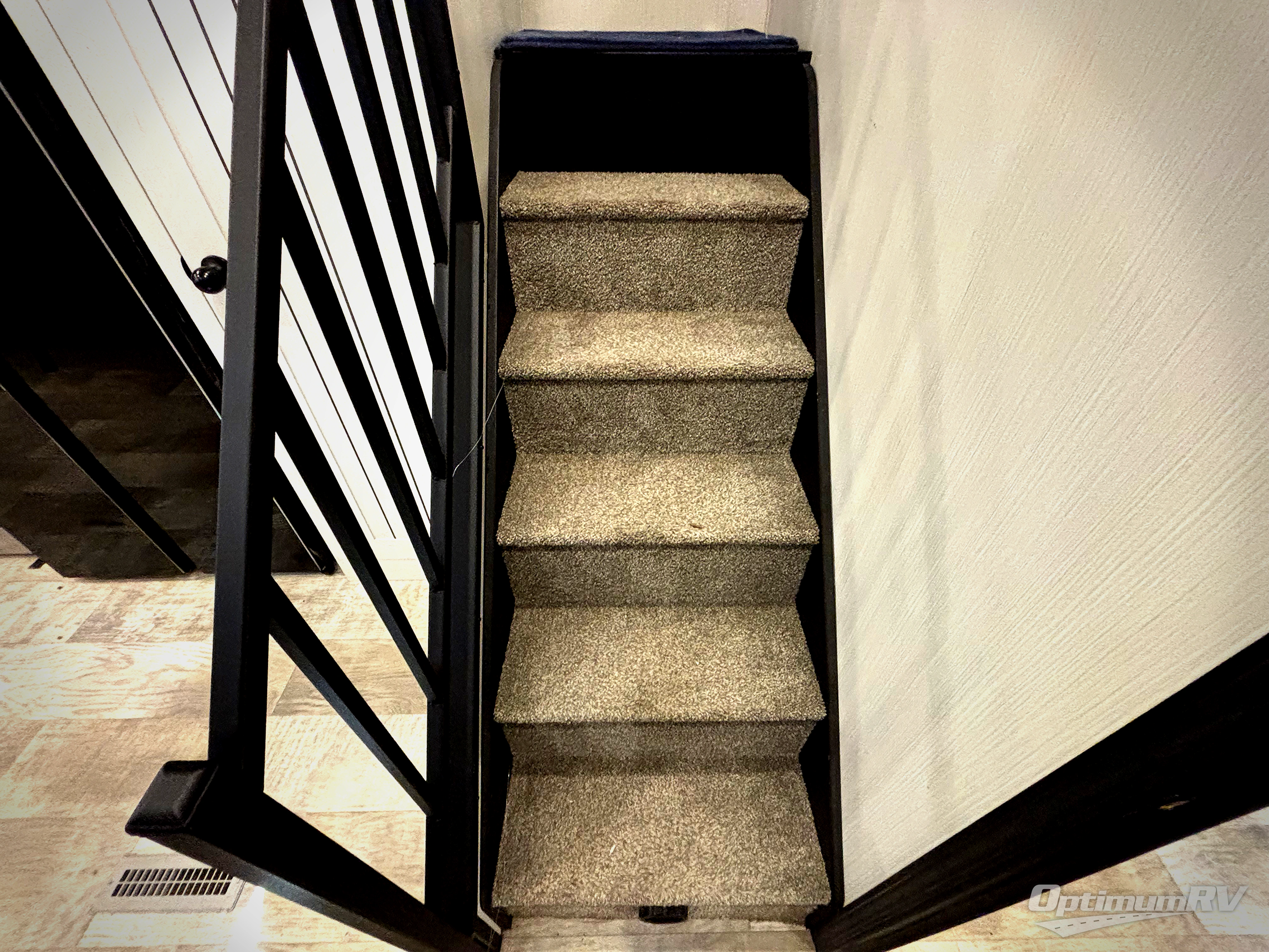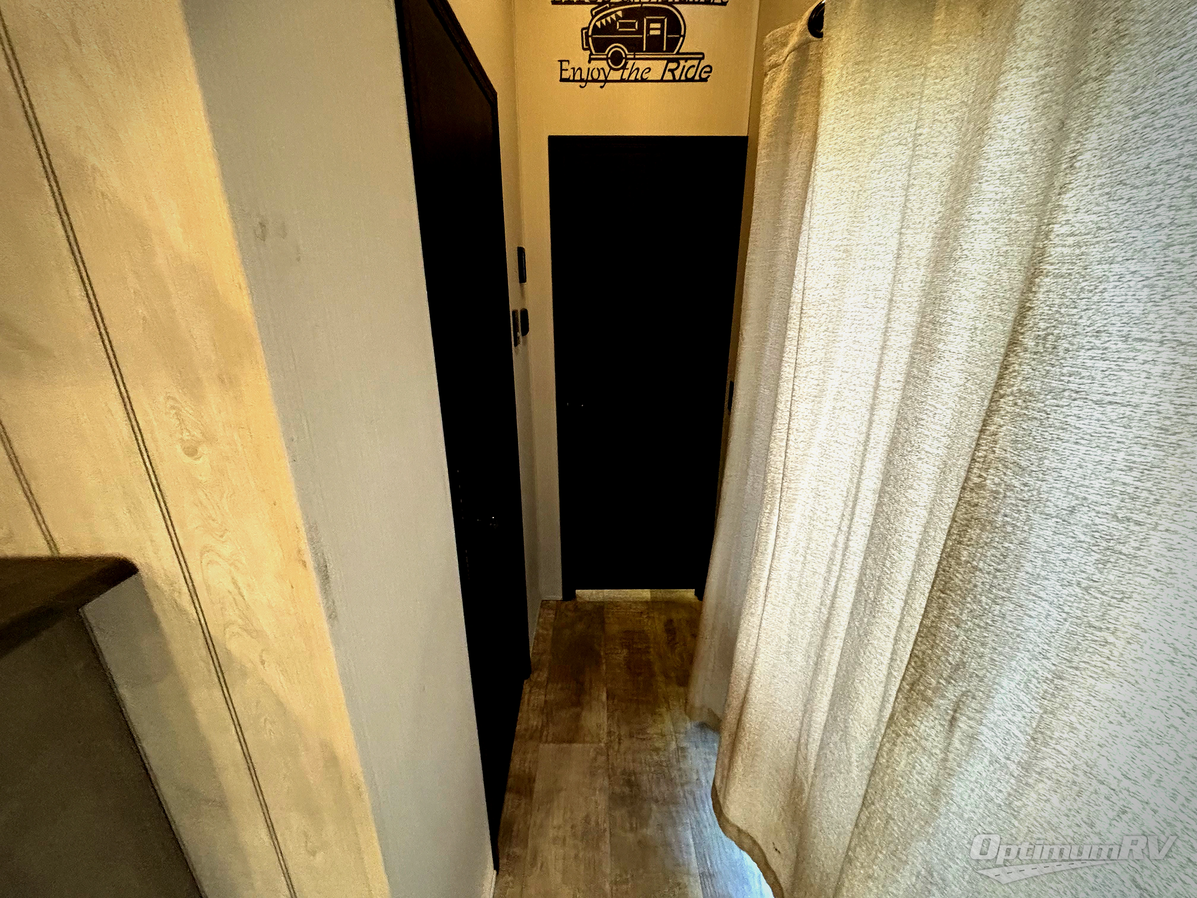 If you're planning to camp with a larger group or your family, this destination trailer will provide everything you're looking for! Your guests can take the rear bunkhouse suite that includes a slide out with a jiffy sofa and bunk bed, an entertainment center, and a full bath. You'll also find one of the dual entry doors here for added convenience. There are steps just outside the bunkhouse that lead to the loft with two bunk mats and storage space to keep this space tidy! The front private bedroom will be perfect for you with its king bed slide out, wardrobe/closet, and bedroom desk if you're needing to work from home. There is even a closet with the option to add washer and dryer prep. In the morning, everyone can meet in the combined middle living area and kitchen. A large slide out here houses the free-standing table and sofa, and the fireplace is close by to make it feel a little more like home!