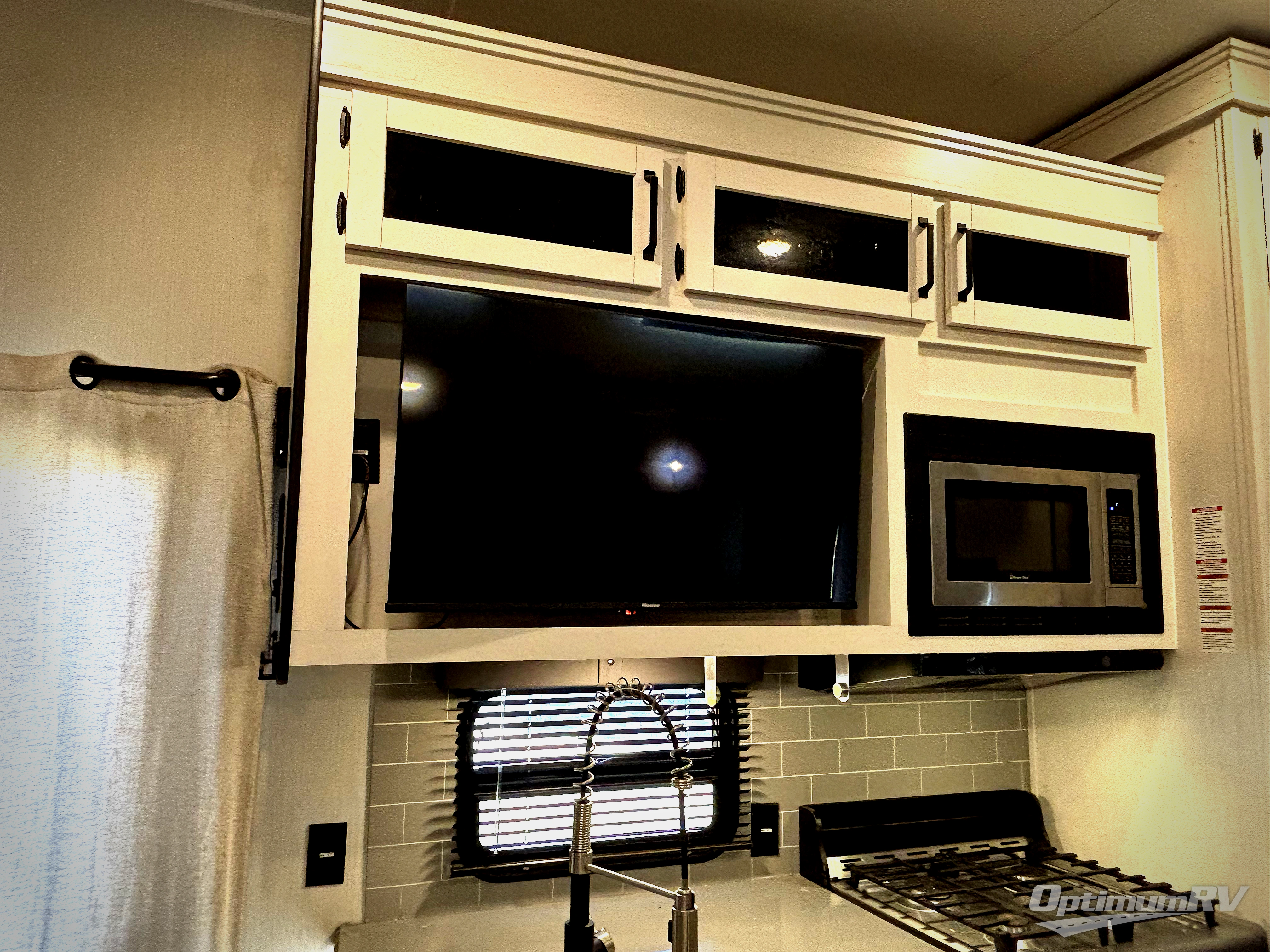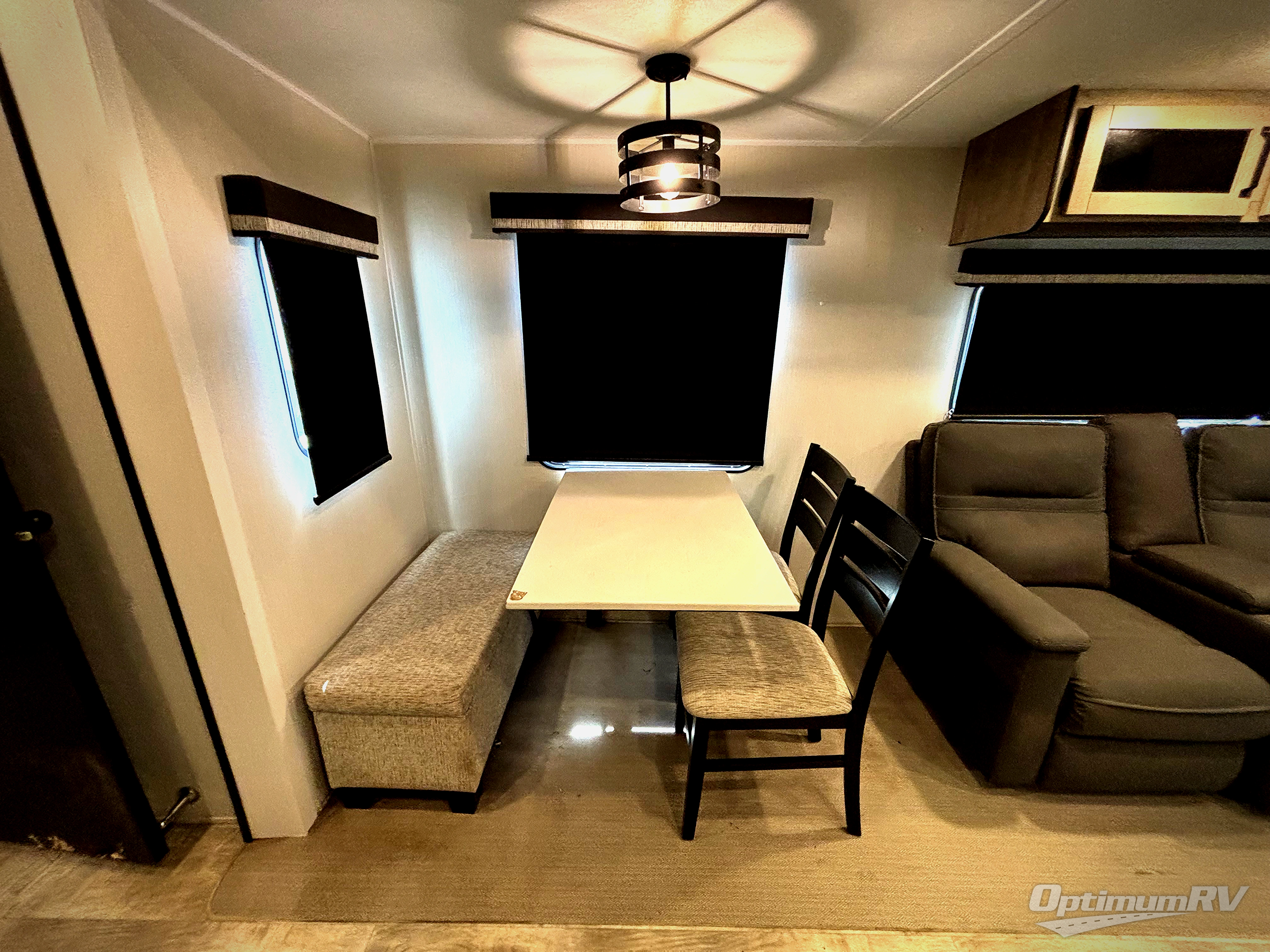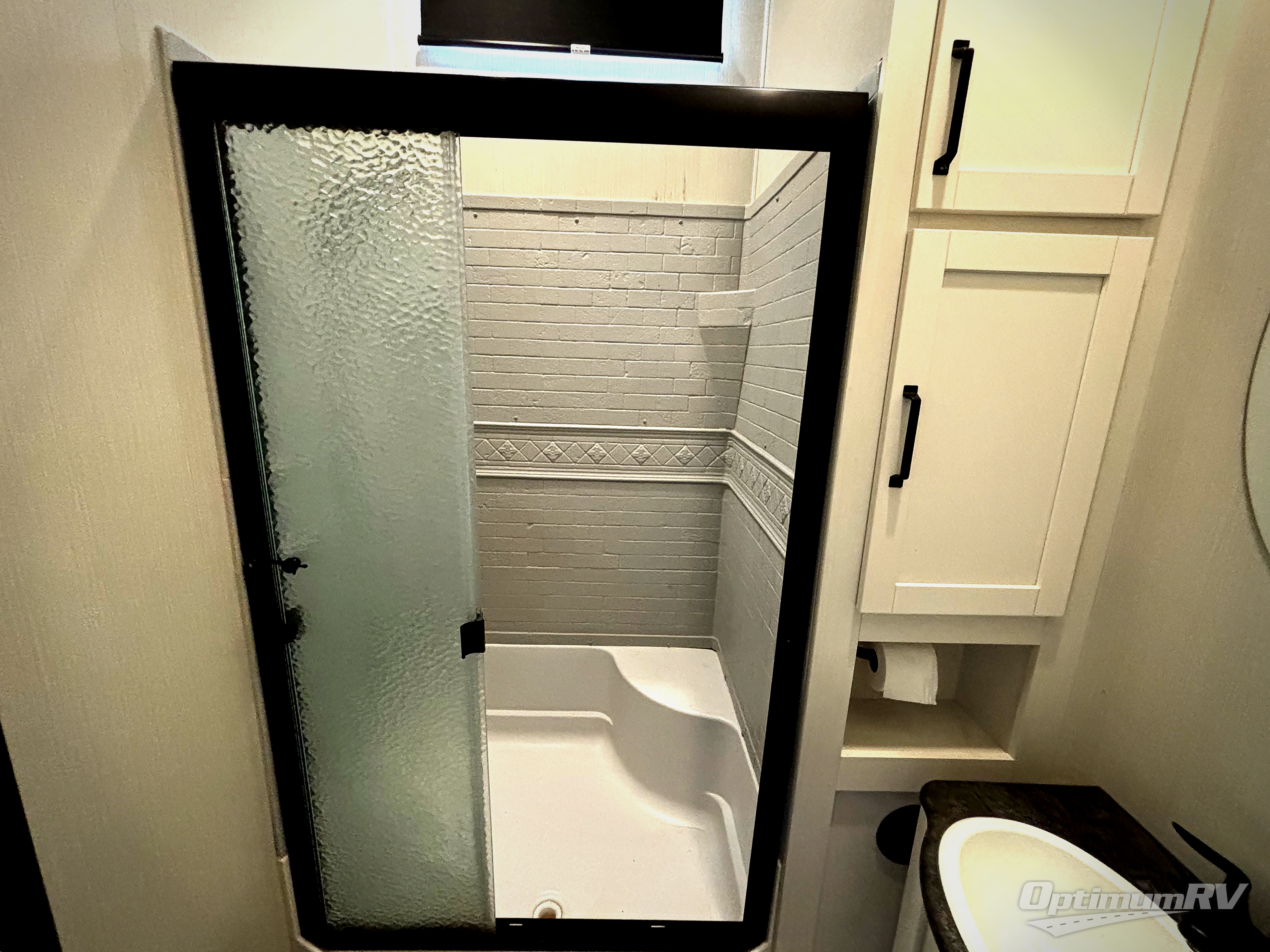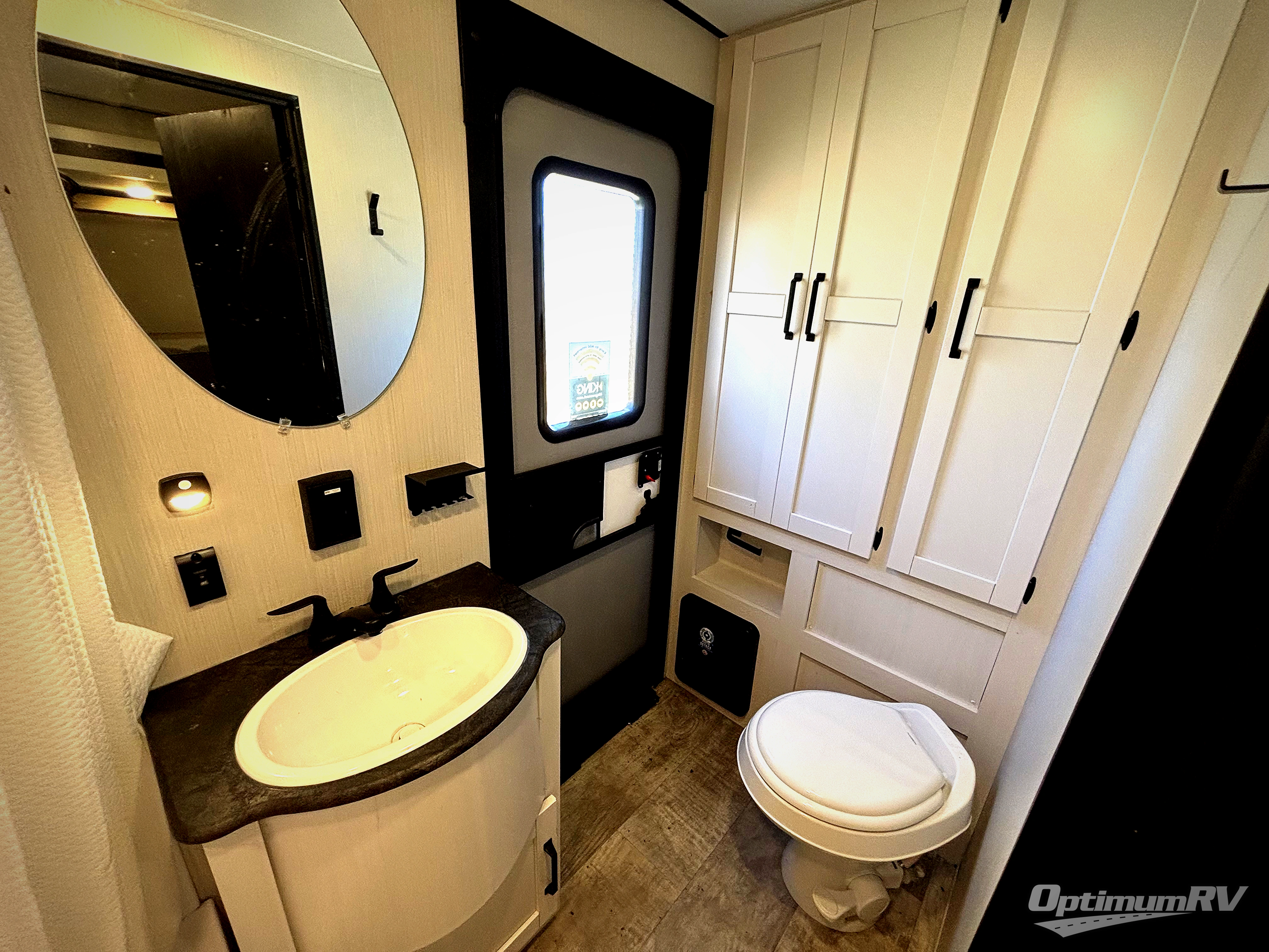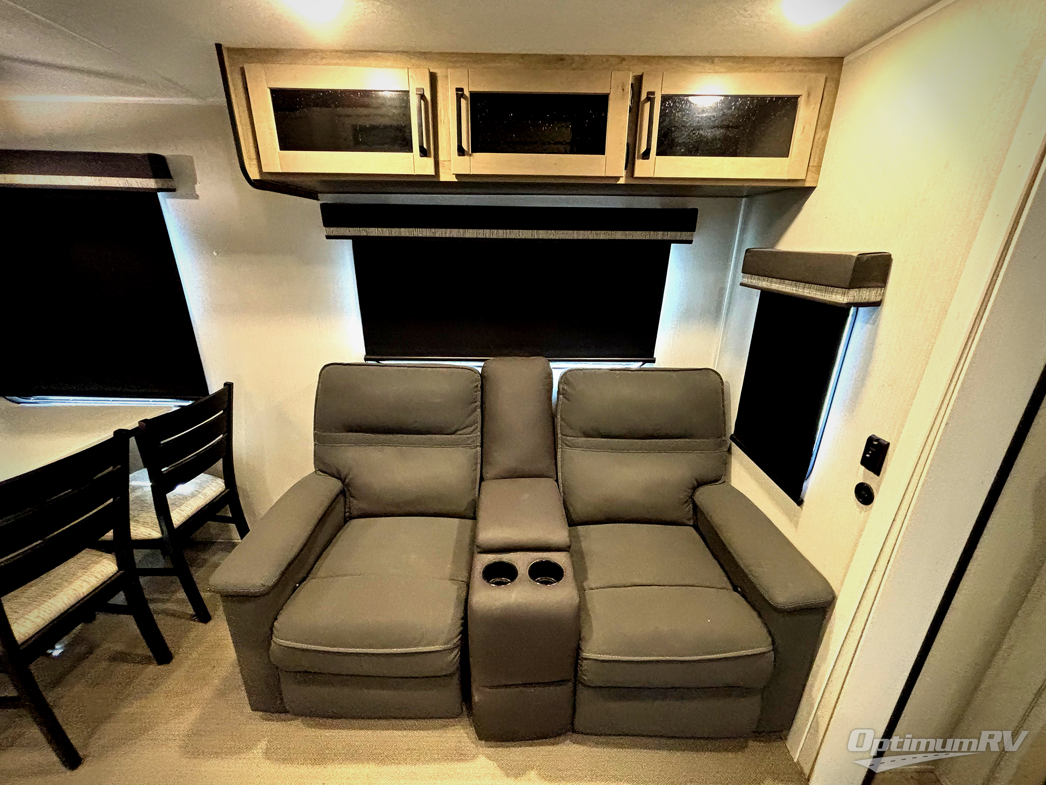 If you're planning to camp with a larger group or your family, this destination trailer will provide everything you're looking for! Your guests can take the rear bunkhouse suite that includes a slide out with a jiffy sofa and bunk bed, an entertainment center, and a full bath. You'll also find one of the dual entry doors here for added convenience. There are steps just outside the bunkhouse that lead to the loft with two bunk mats and storage space to keep this space tidy! The front private bedroom will be perfect for you with its king bed slide out, wardrobe/closet, and bedroom desk if you're needing to work from home. There is even a closet with the option to add washer and dryer prep. In the morning, everyone can meet in the combined middle living area and kitchen. A large slide out here houses the free-standing table and sofa, and the fireplace is close by to make it feel a little more like home!