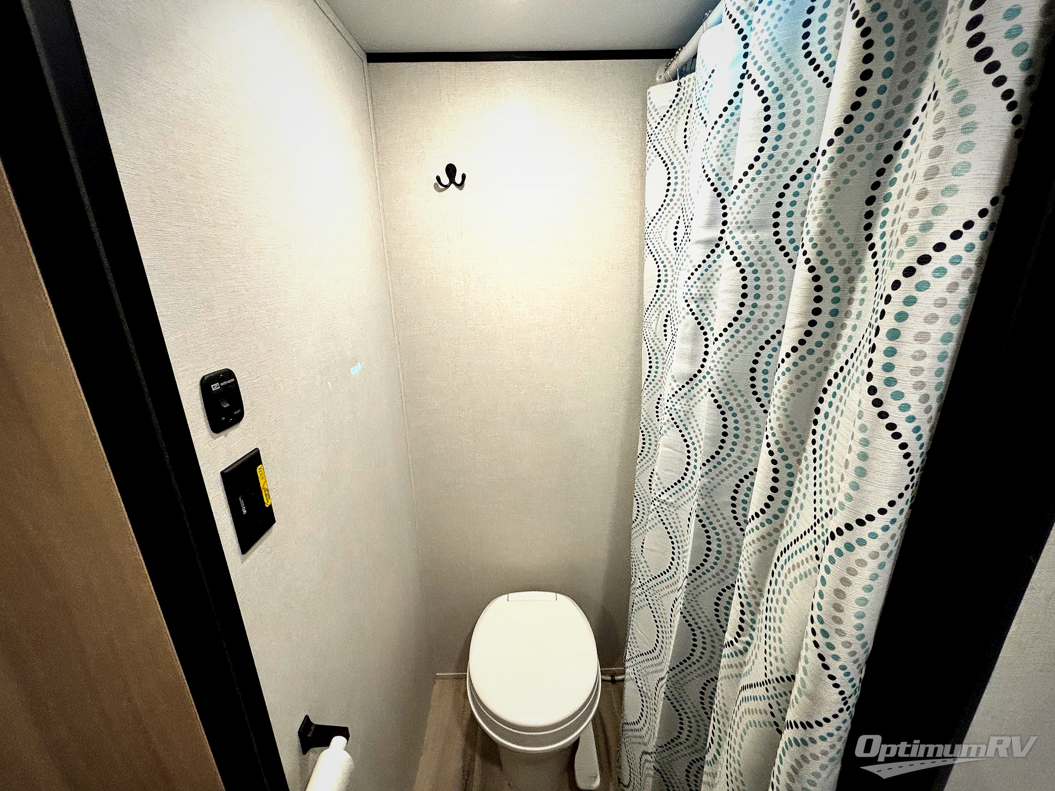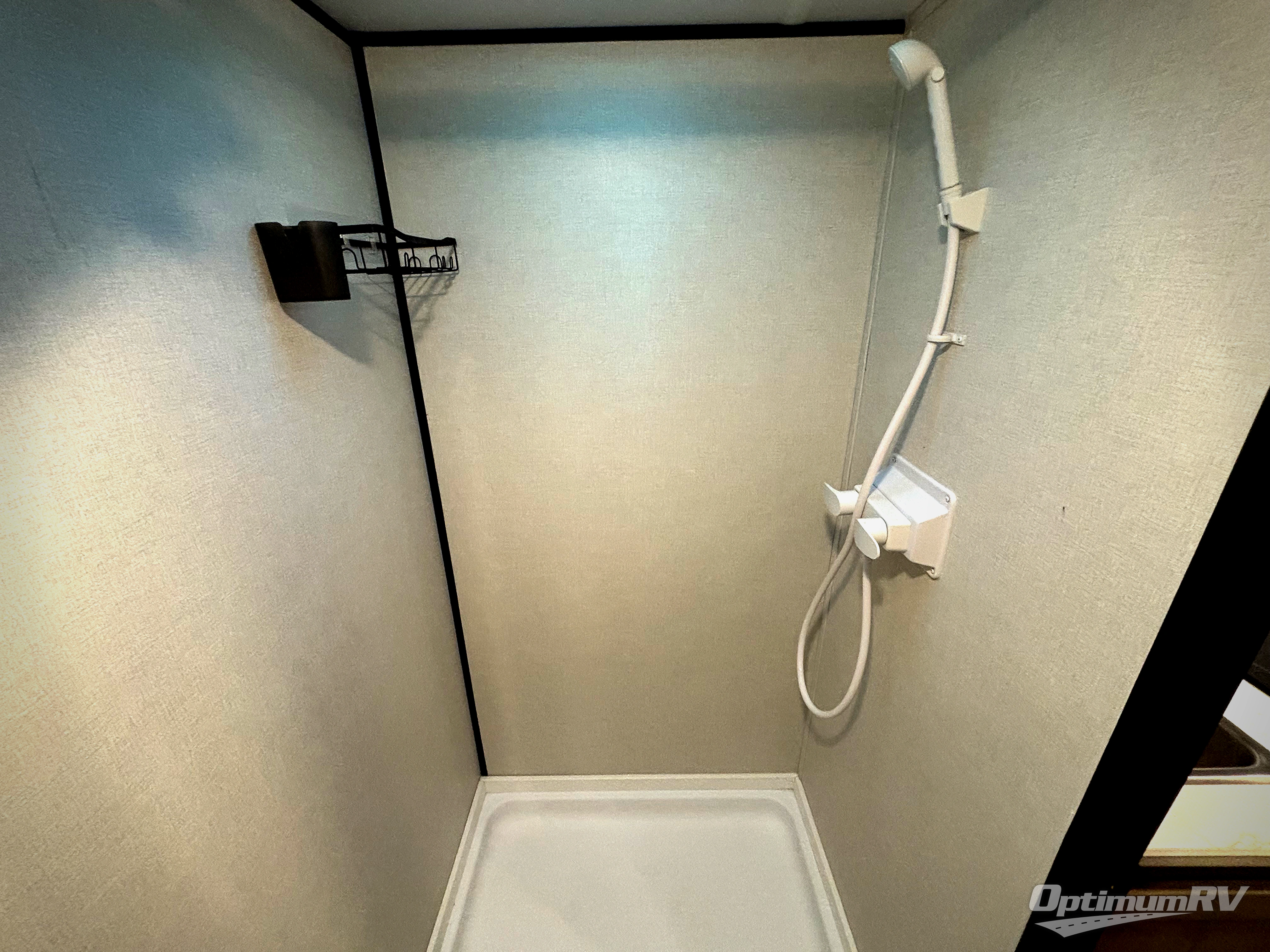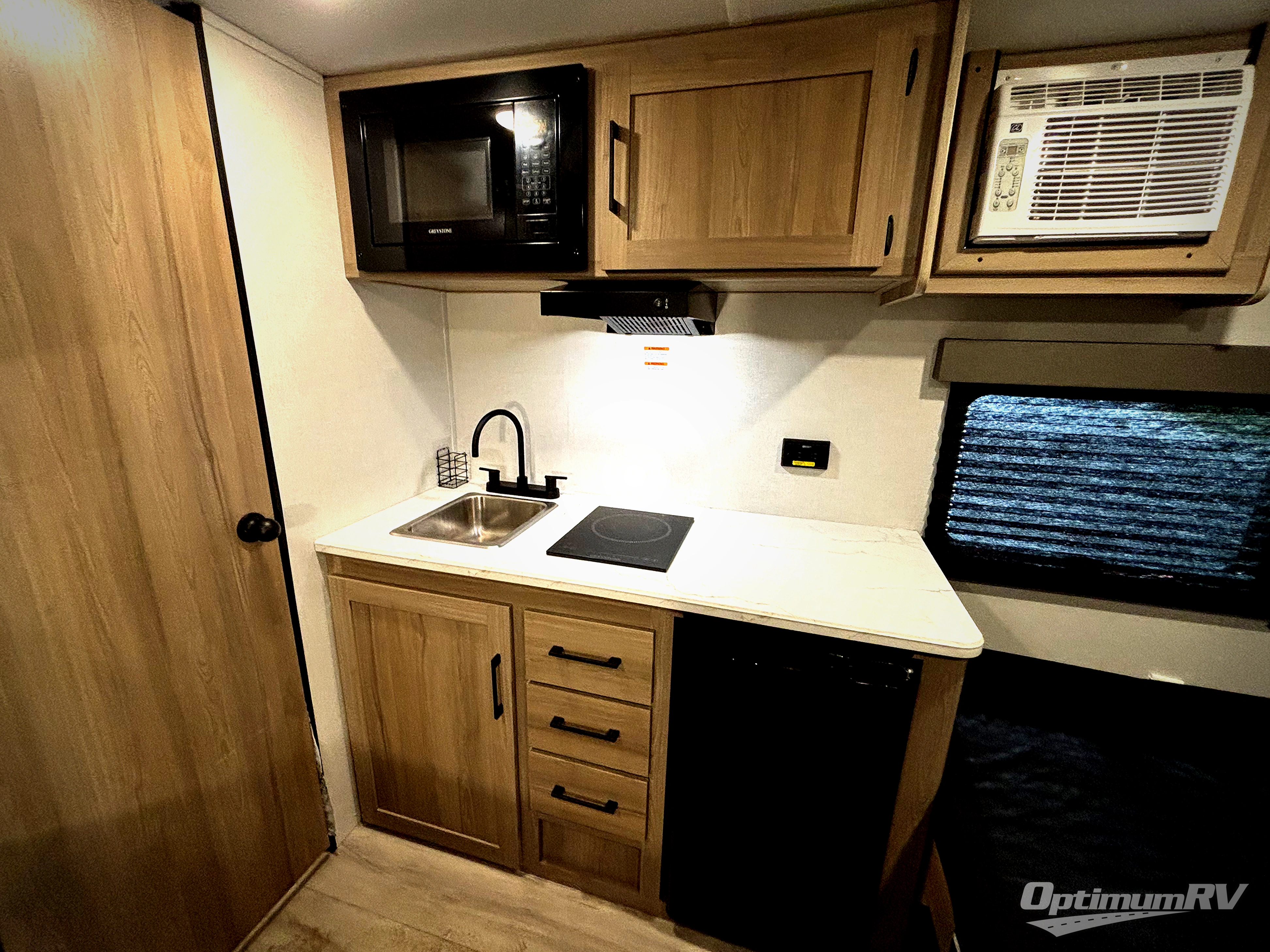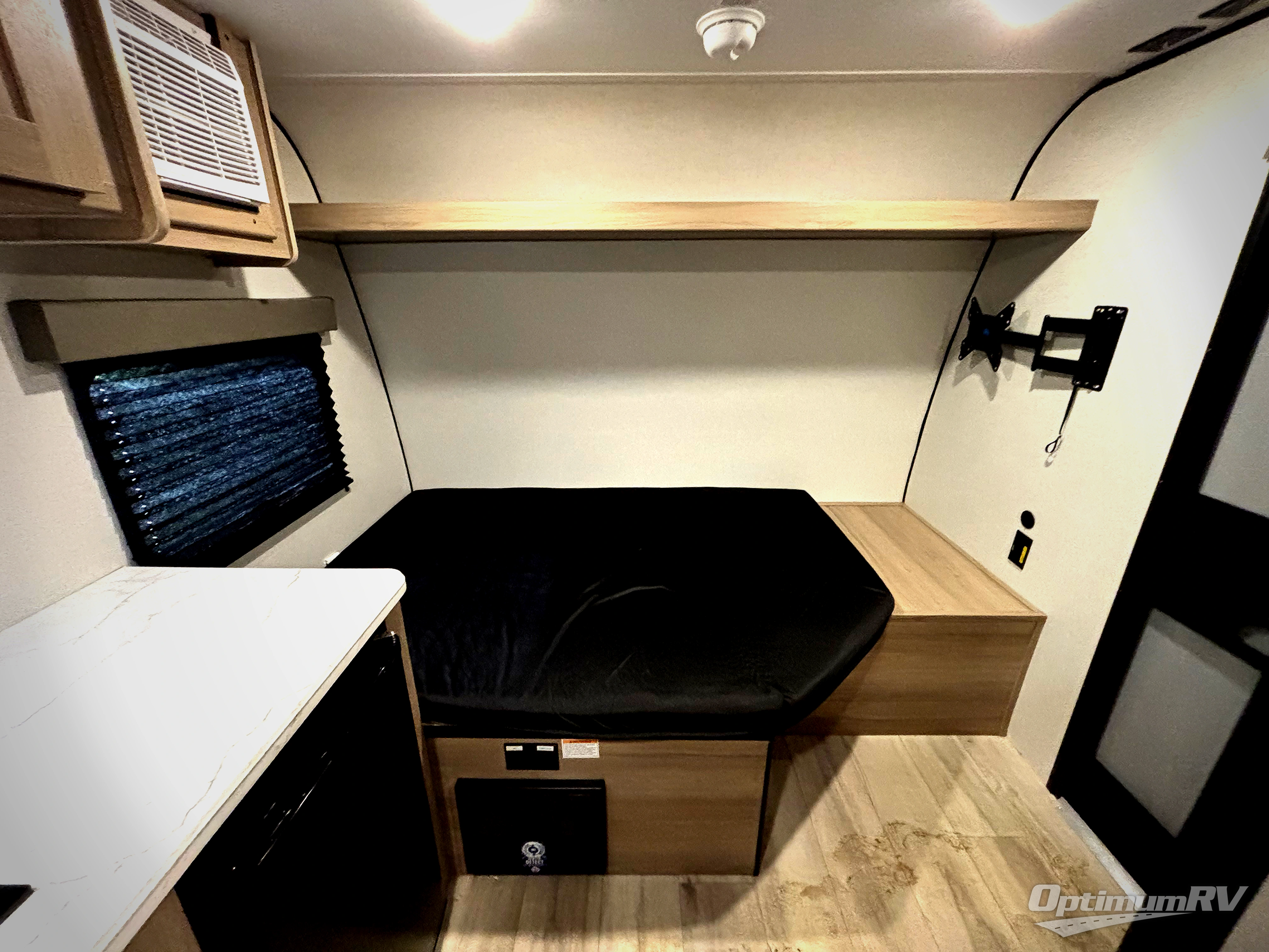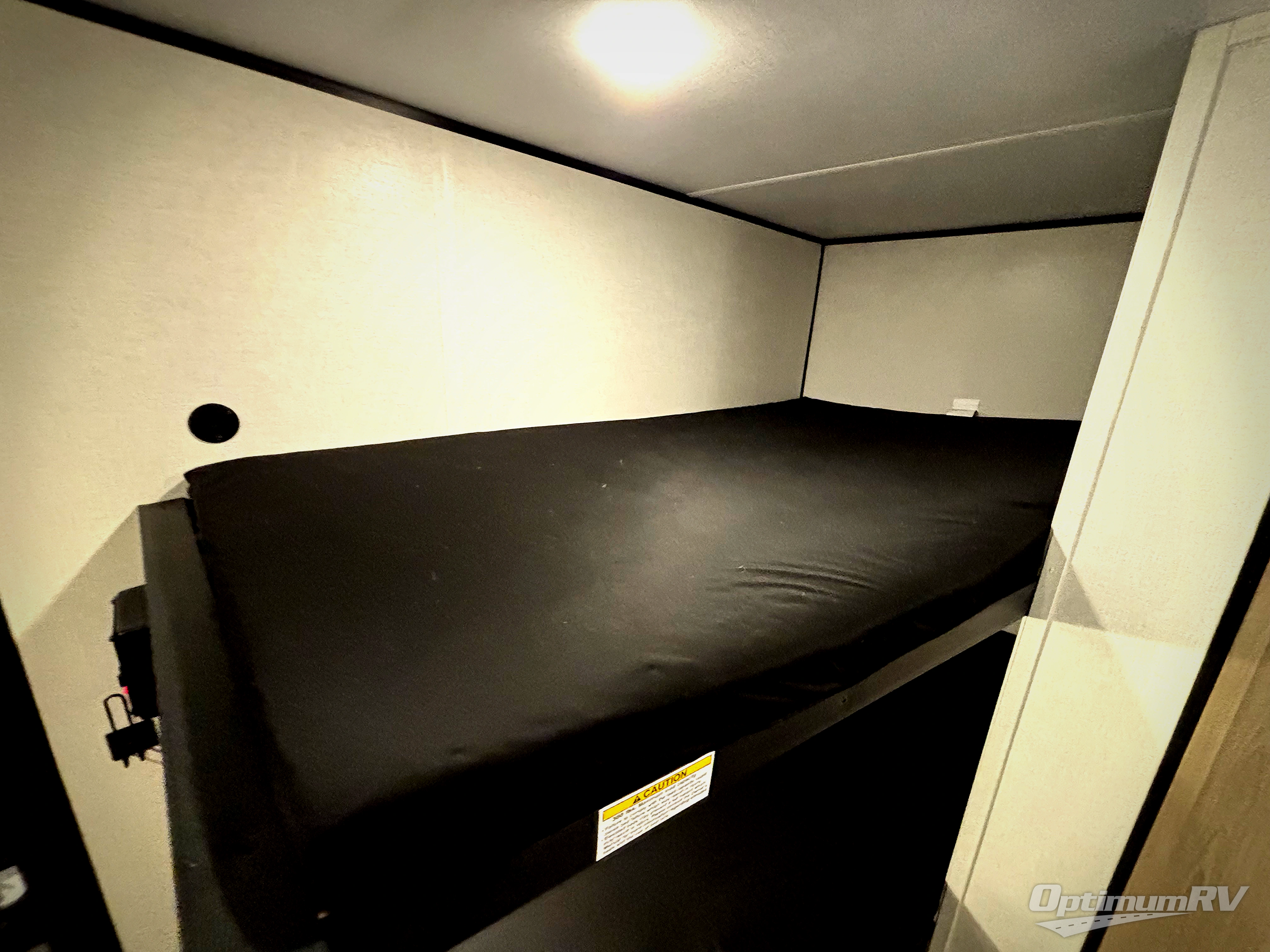 This compact travel trailer lets you camp in comfort at the location of your choice! Since there is a front queen bed, you won't have to sleep on an air mattress, and the shelf above the bed will be perfect for your belongings. Bunk beds provide additional sleeping space for your guests or little ones, and the private bath includes a shower and toilet so you won't have to use the camp's facilities at night. This model includes an induction cooktop and microwave oven to cook meals, plus a 3.2 cu. ft. 110V refrigerator for food storage. And the 8' power awning outdoors provides a place for you to sit in your camp chairs after dinner!