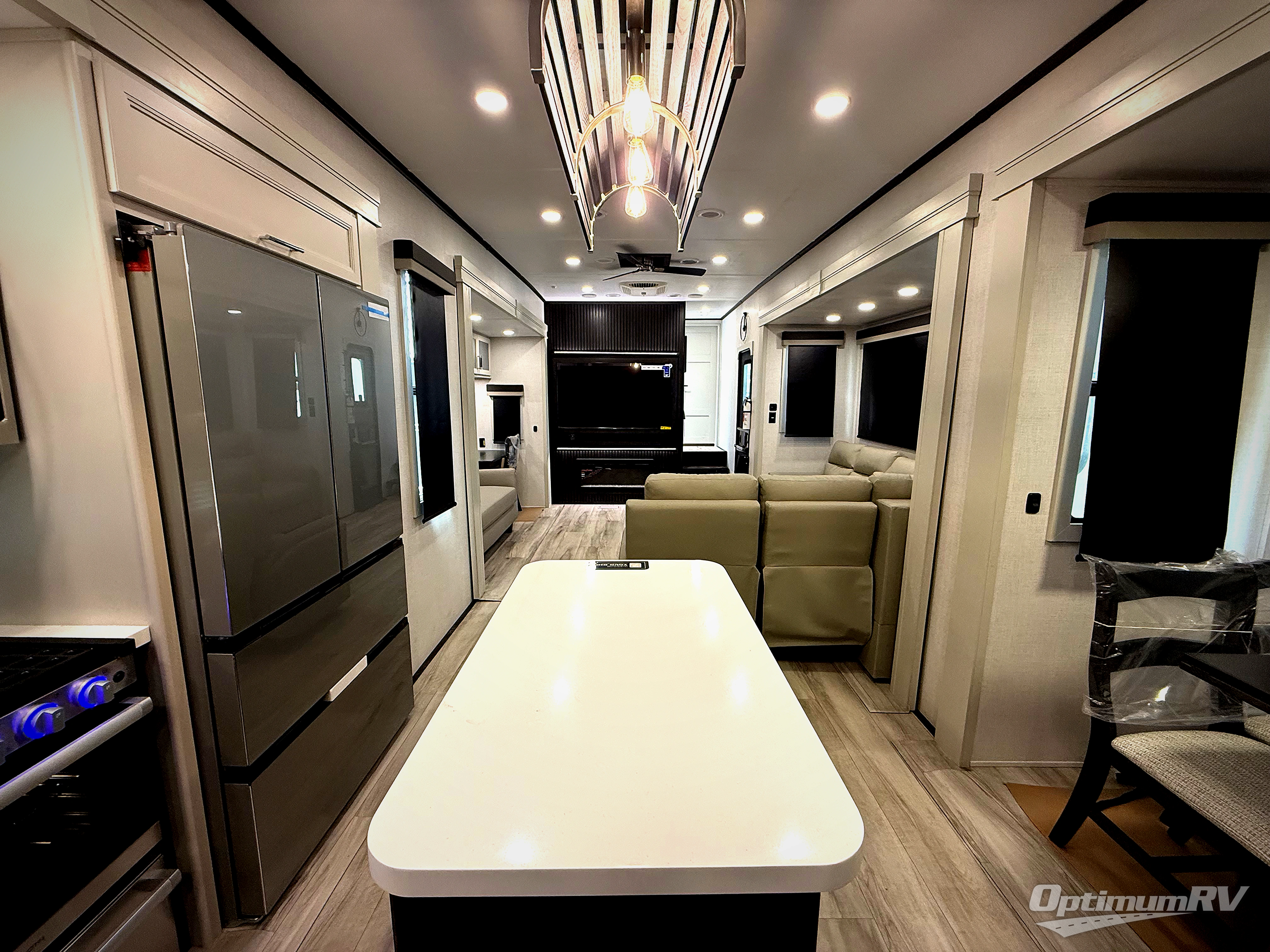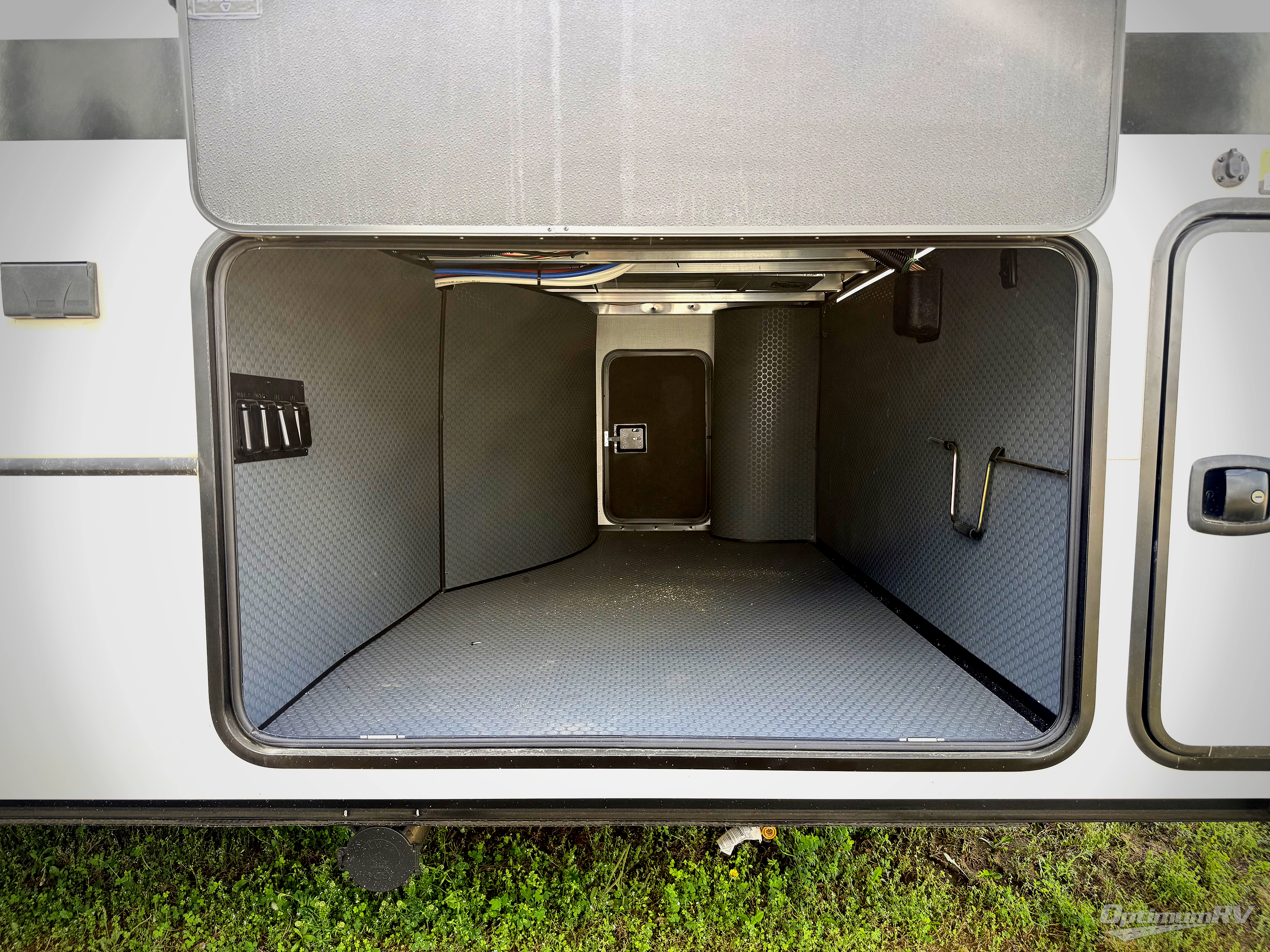 This rear kitchen fifth wheel makes extended stays or weekend trips to the lake enjoyable! The chef of your group will find plenty of counter space with the included kitchen island, plus there is a pantry and 18 cu. ft. residential refrigerator for food storage. A free-standing dinette provides a place to dine together, and the largest L-shaped sofa with recliners will be the perfect spot to relax with a movie. If you have guests, they could sleep here or on the hide-a-bed sofa sleeper. The dual entry bath includes a shower with a seat for added comfort, and the front master bedroom will feel just like home with its king bed slide out and master closet. There is also a dresser and stackable washer and dryer prep if you want to add those appliances!