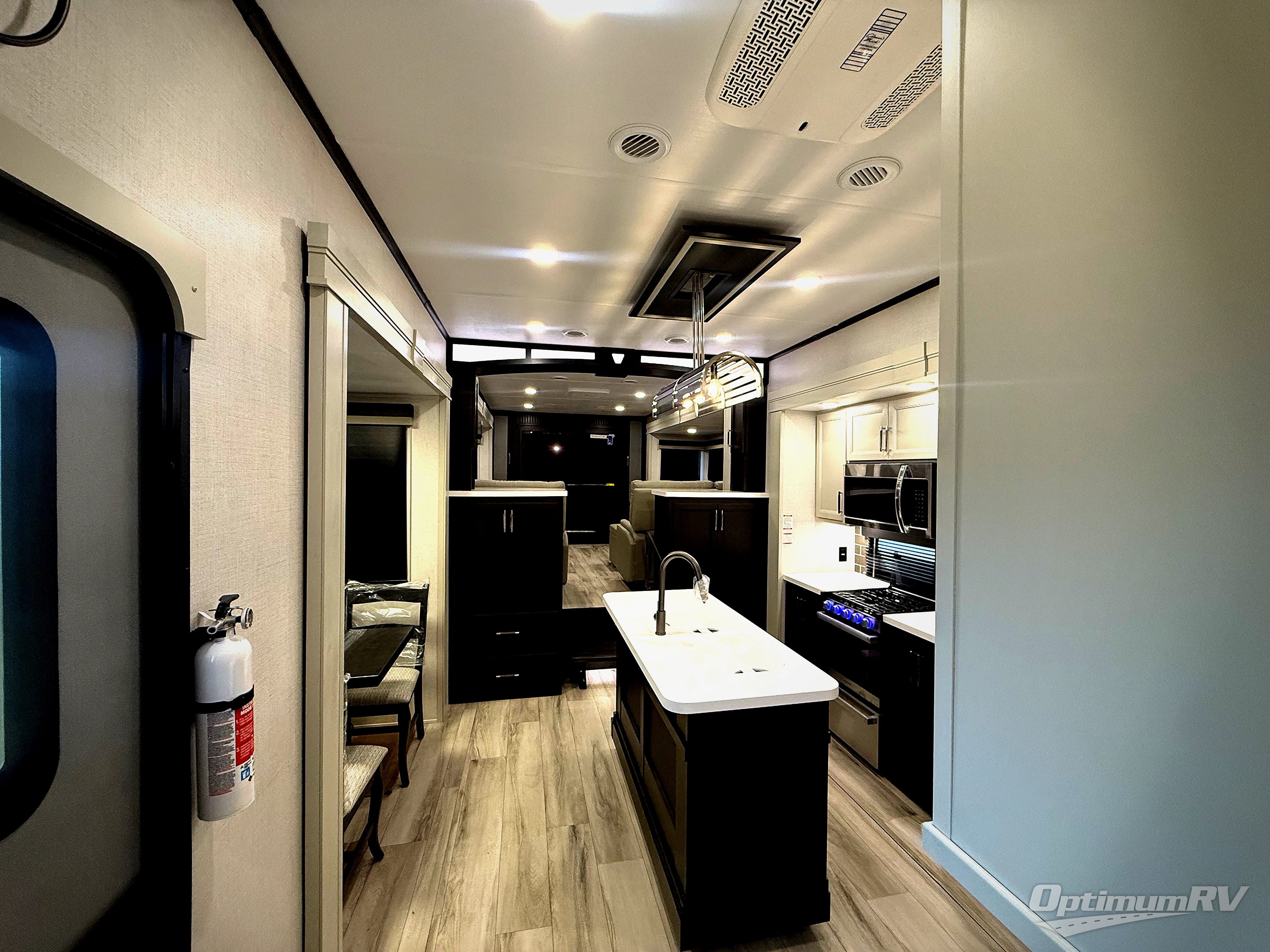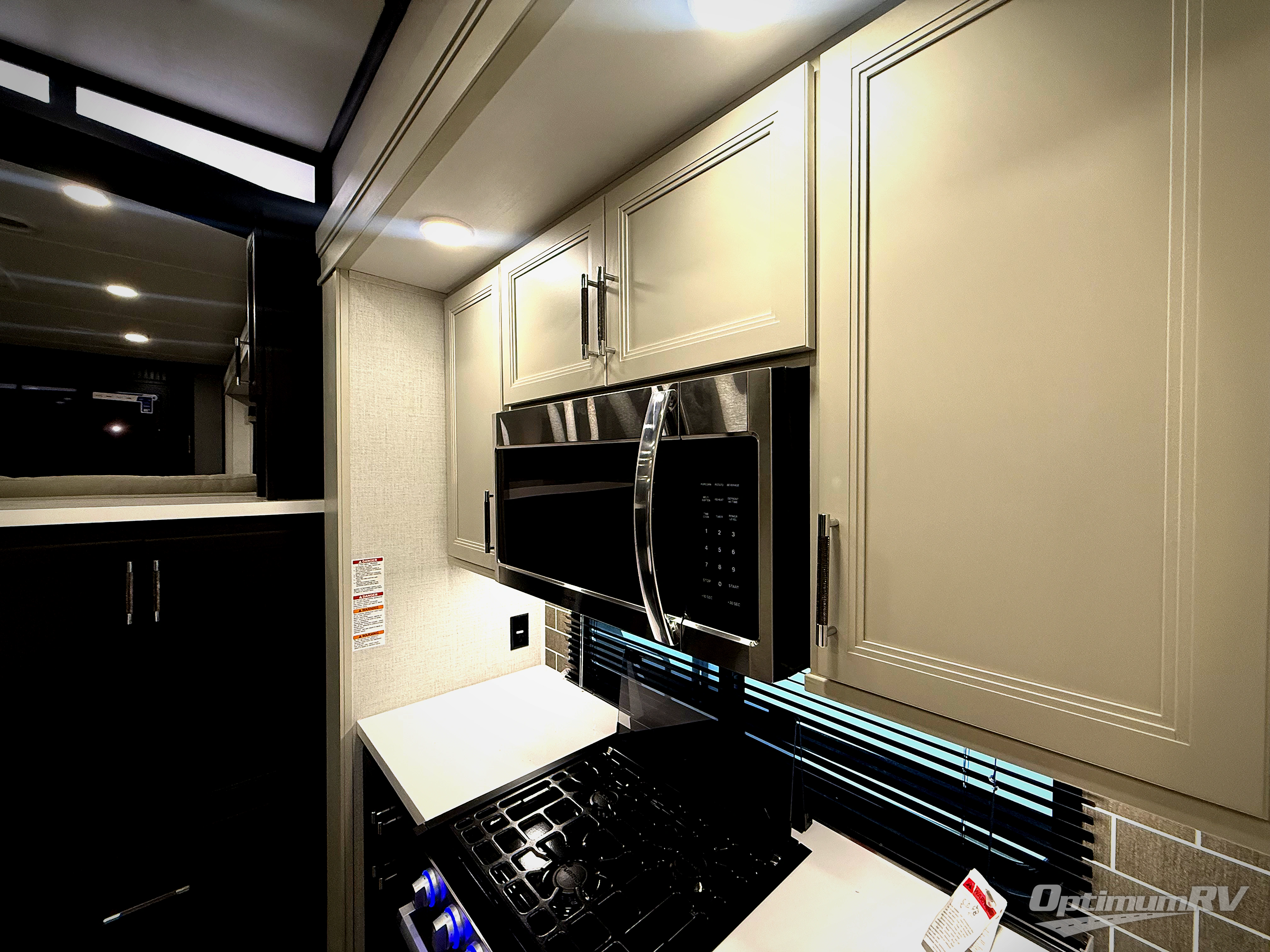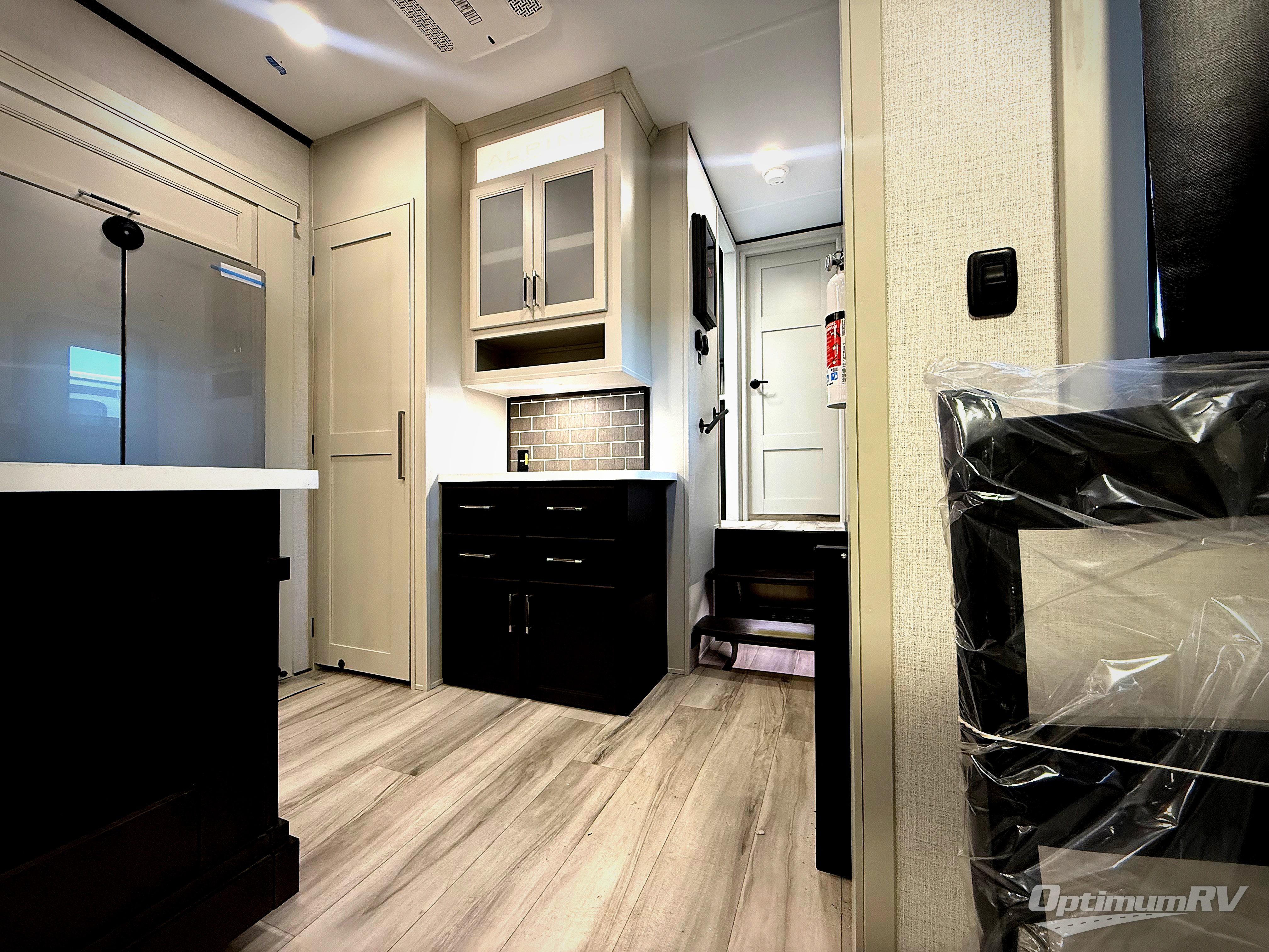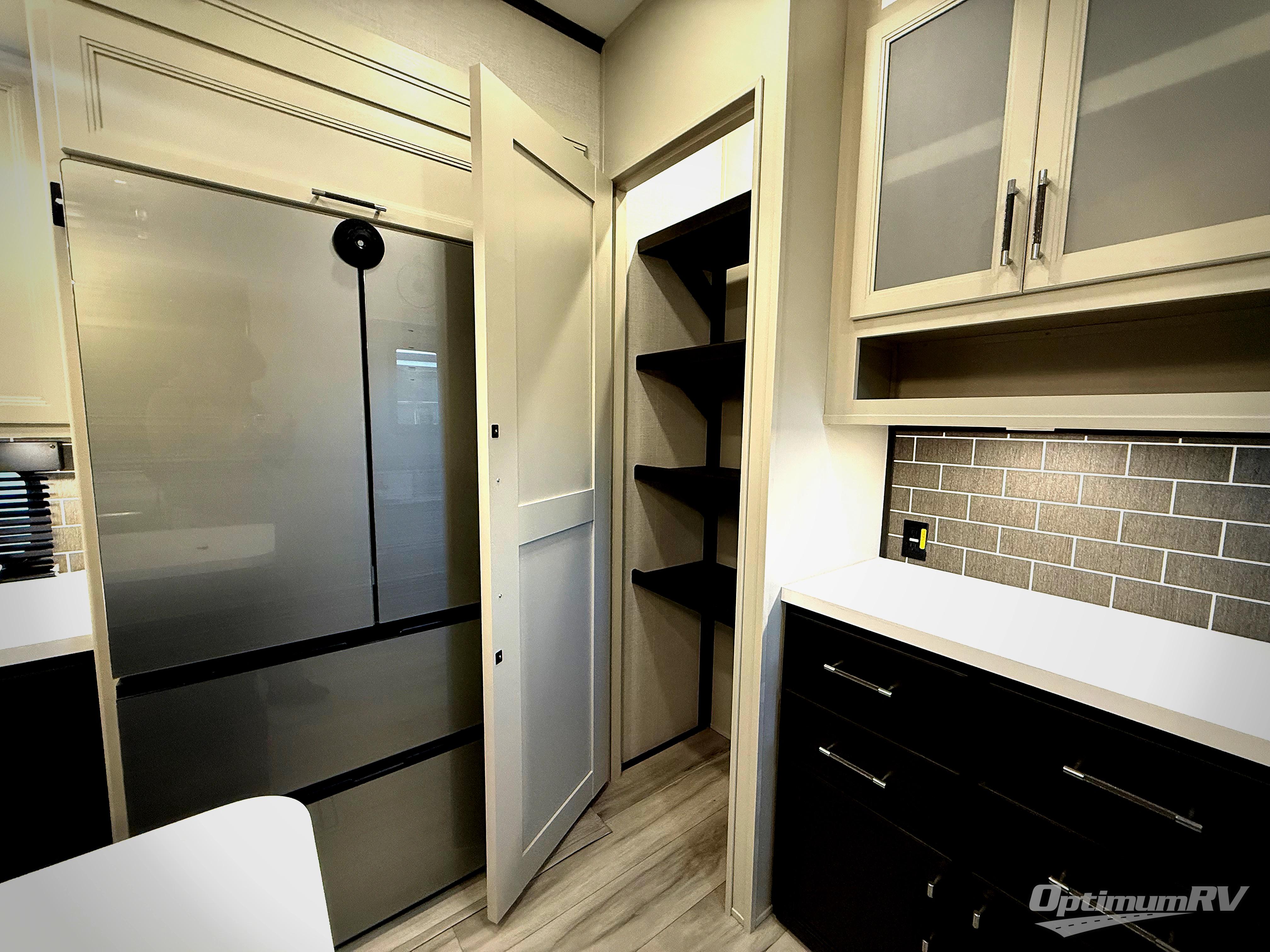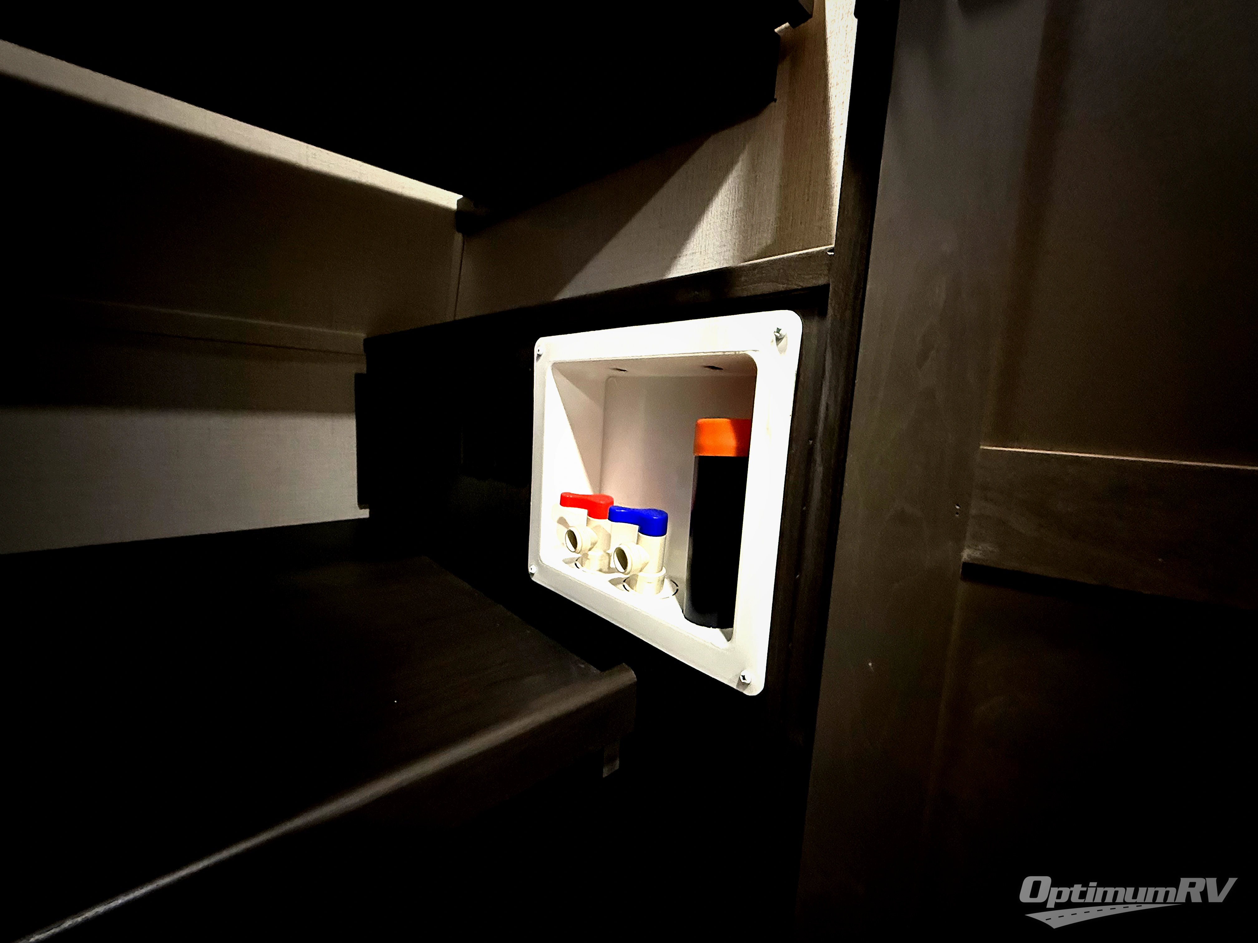 It will be so easy to enjoy trips in this spacious fifth wheel that can sleep six each night! The rear living room features L-shaped sofa slide outs with ottomans, a 65" TV with a large feature wall, and a fireplace to make it cozier. There is a stylish lighted beam and lighted steps that lead to the middle kitchen with dual opposing slides, a kitchen island, triple pantries, and a free-standing dinette. And the chef will appreciate all the kitchen appliances to make their best meals for the whole gang. As you head up the steps, you'll find a full bath to easily freshen up each day, and you'll love the front private bedroom with a king bed slide, master closet with hidden shoe storage, plus stackable washer and dryer prep!