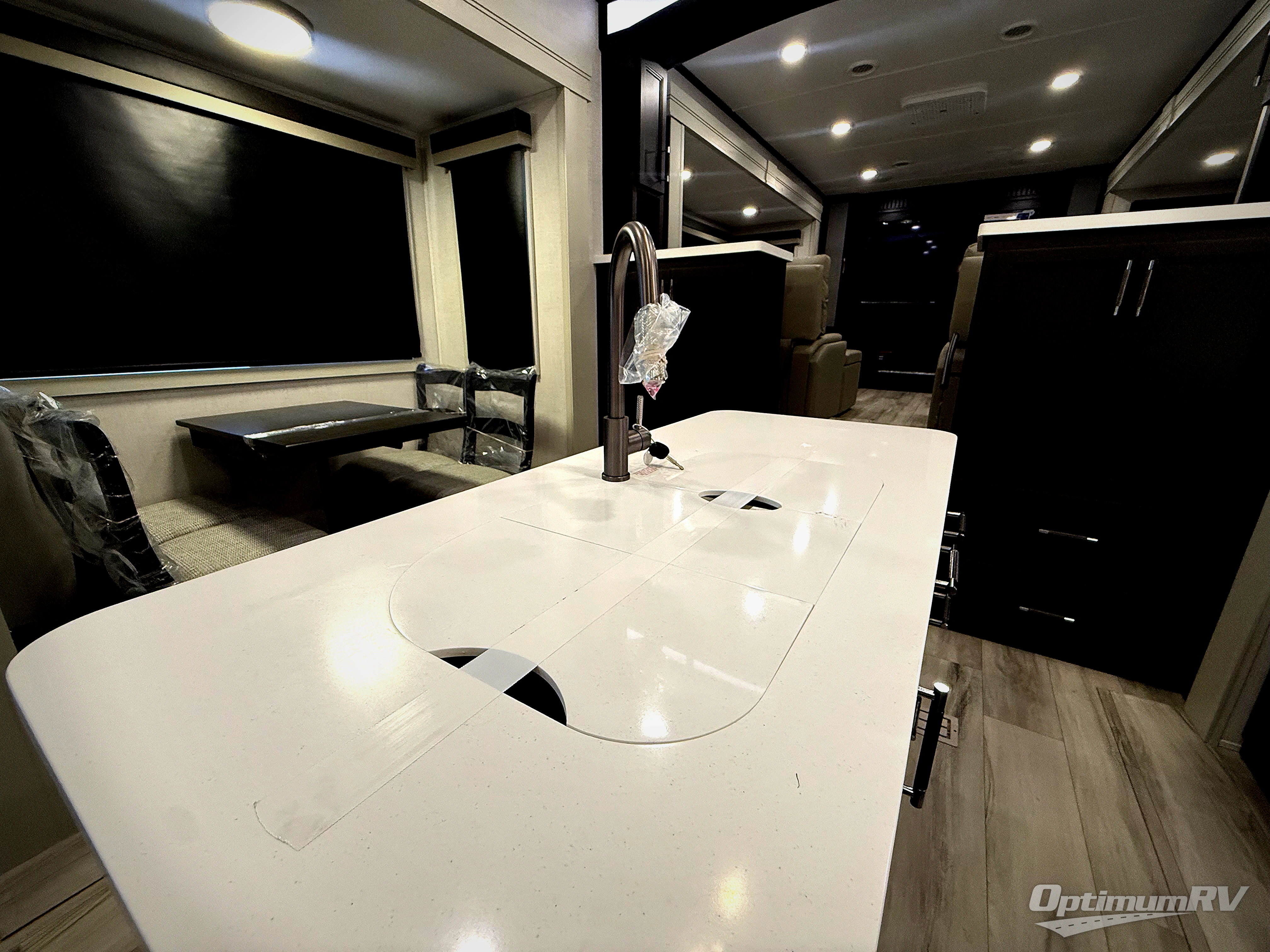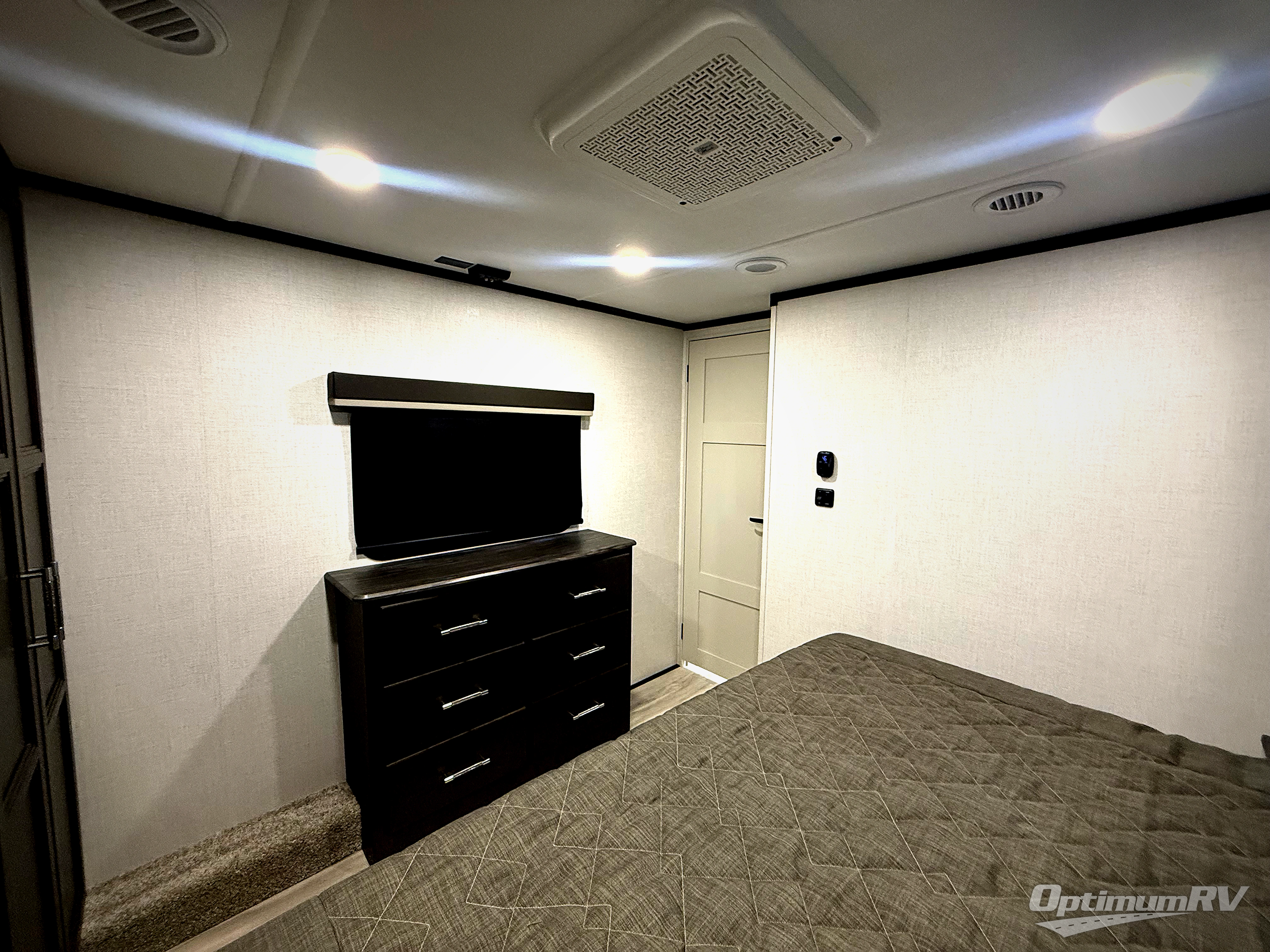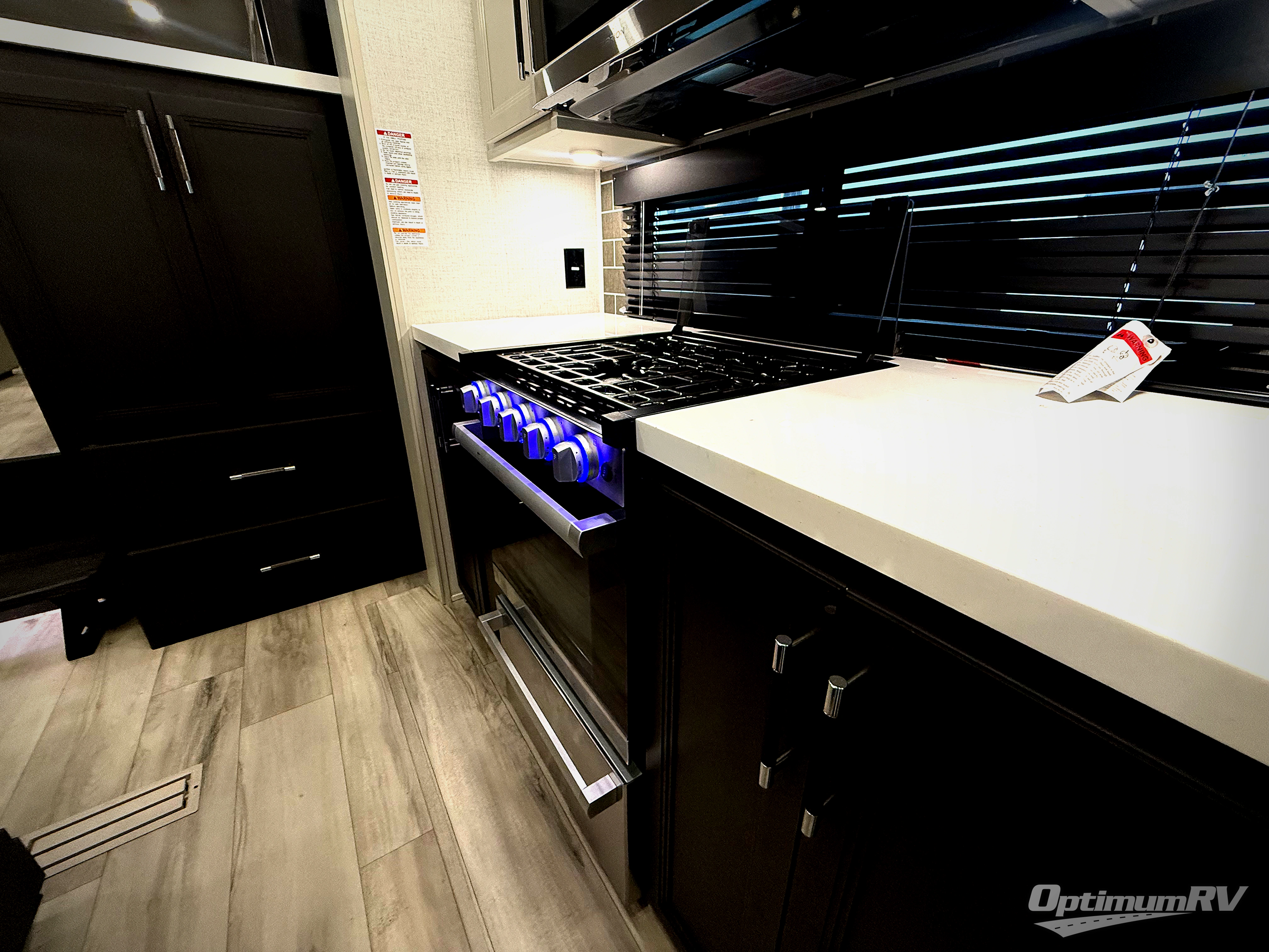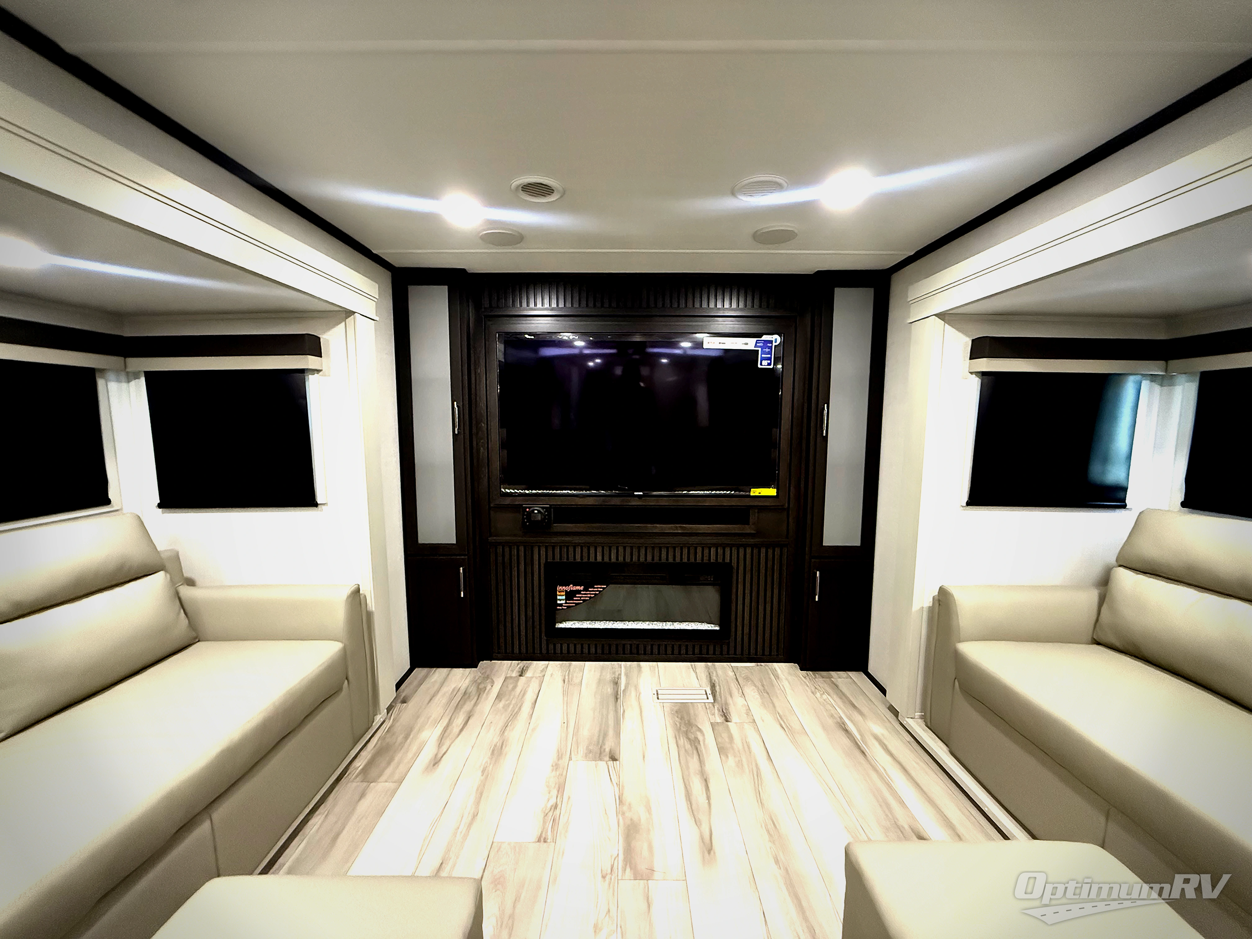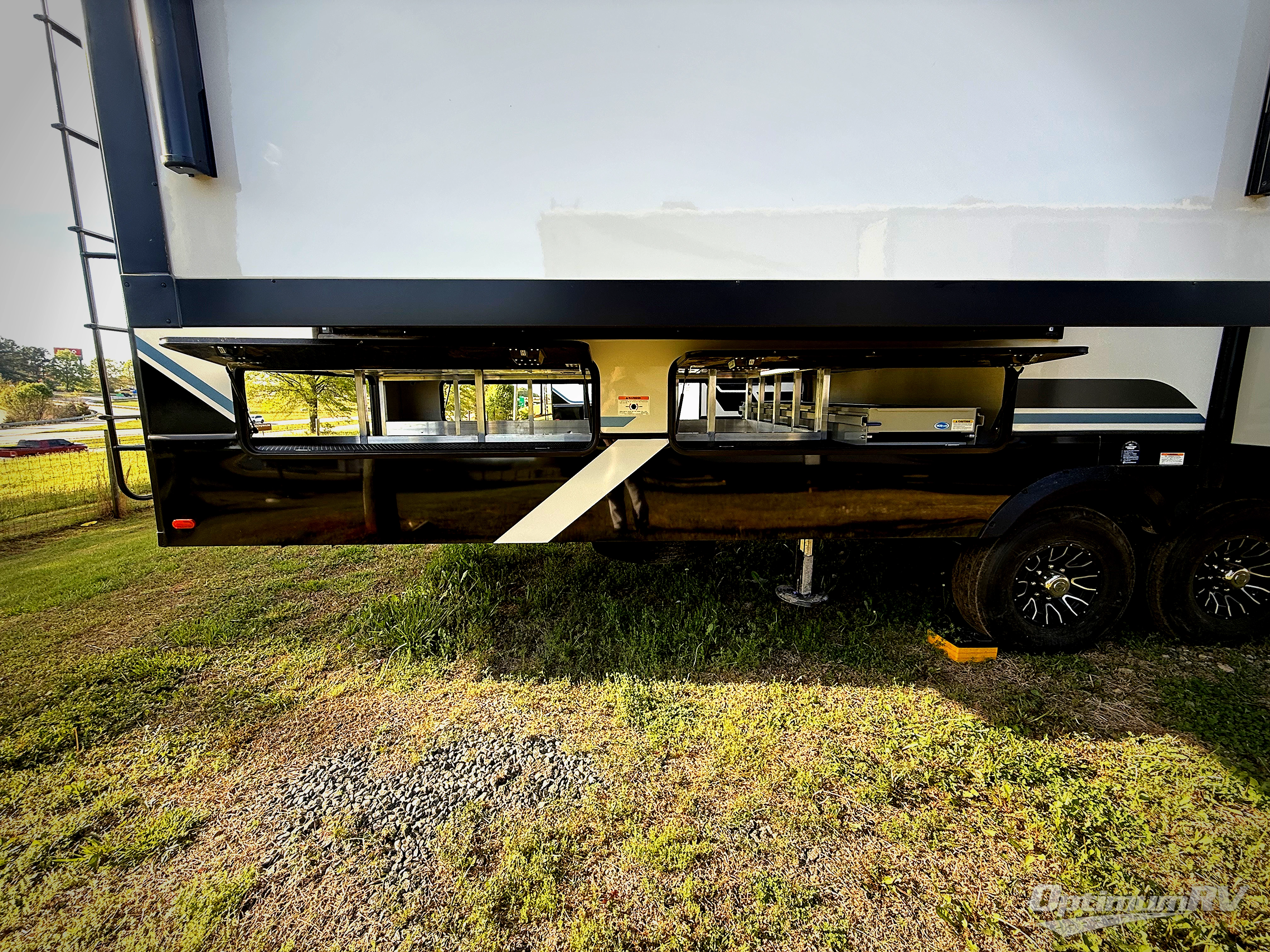 It will be so easy to enjoy trips in this spacious fifth wheel that can sleep six each night! The rear living room features L-shaped sofa slide outs with ottomans, a 65" TV with a large feature wall, and a fireplace to make it cozier. There is a stylish lighted beam and lighted steps that lead to the middle kitchen with dual opposing slides, a kitchen island, triple pantries, and a free-standing dinette. And the chef will appreciate all the kitchen appliances to make their best meals for the whole gang. As you head up the steps, you'll find a full bath to easily freshen up each day, and you'll love the front private bedroom with a king bed slide, master closet with hidden shoe storage, plus stackable washer and dryer prep!