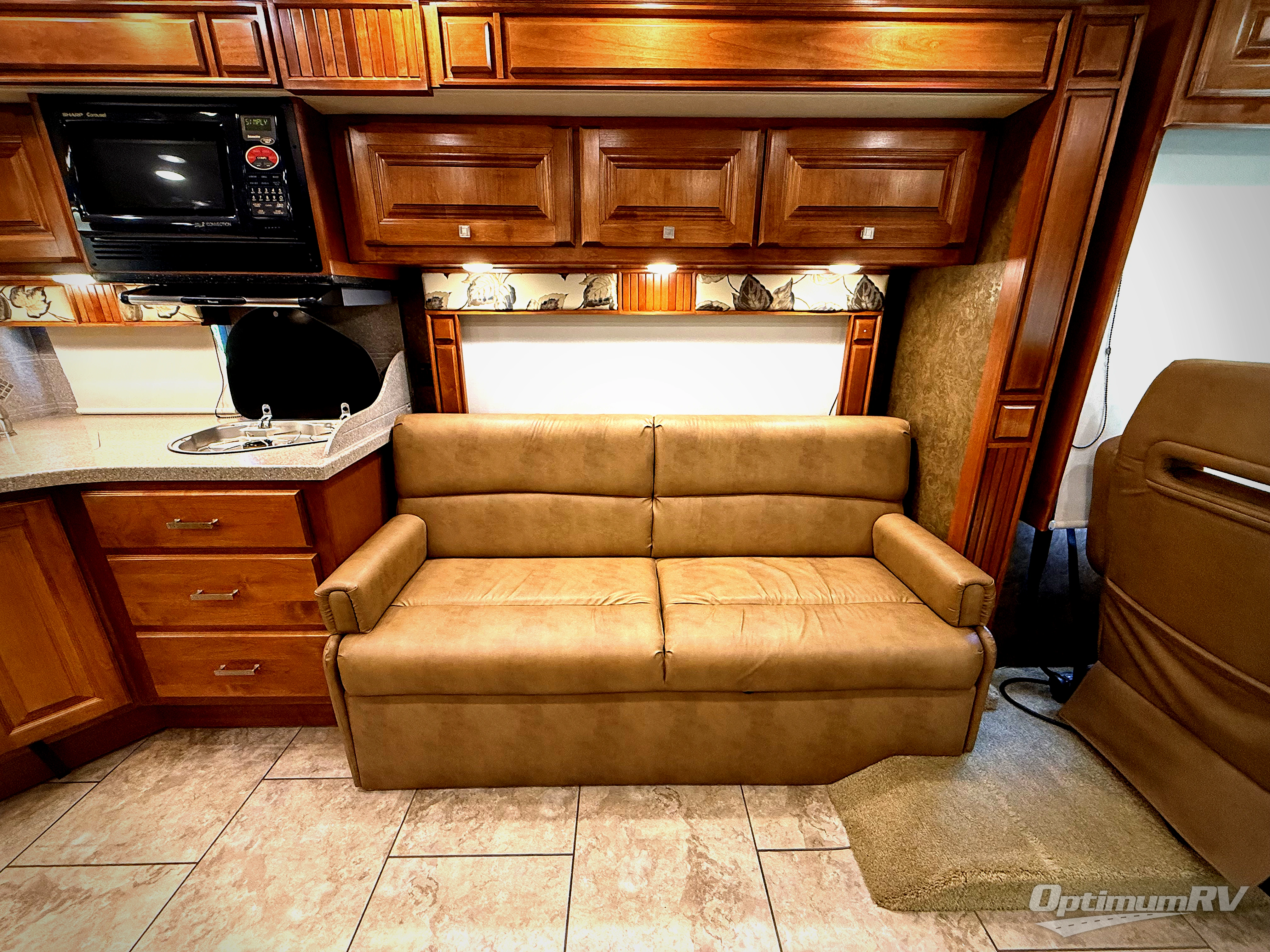 The road side features a slide housing a sofa bed, two burner range top, overhead microwave, corner angled double sink and lots of overhead cabinets. A TV is on an inside wall near the sink, and it faces the front of the coach.