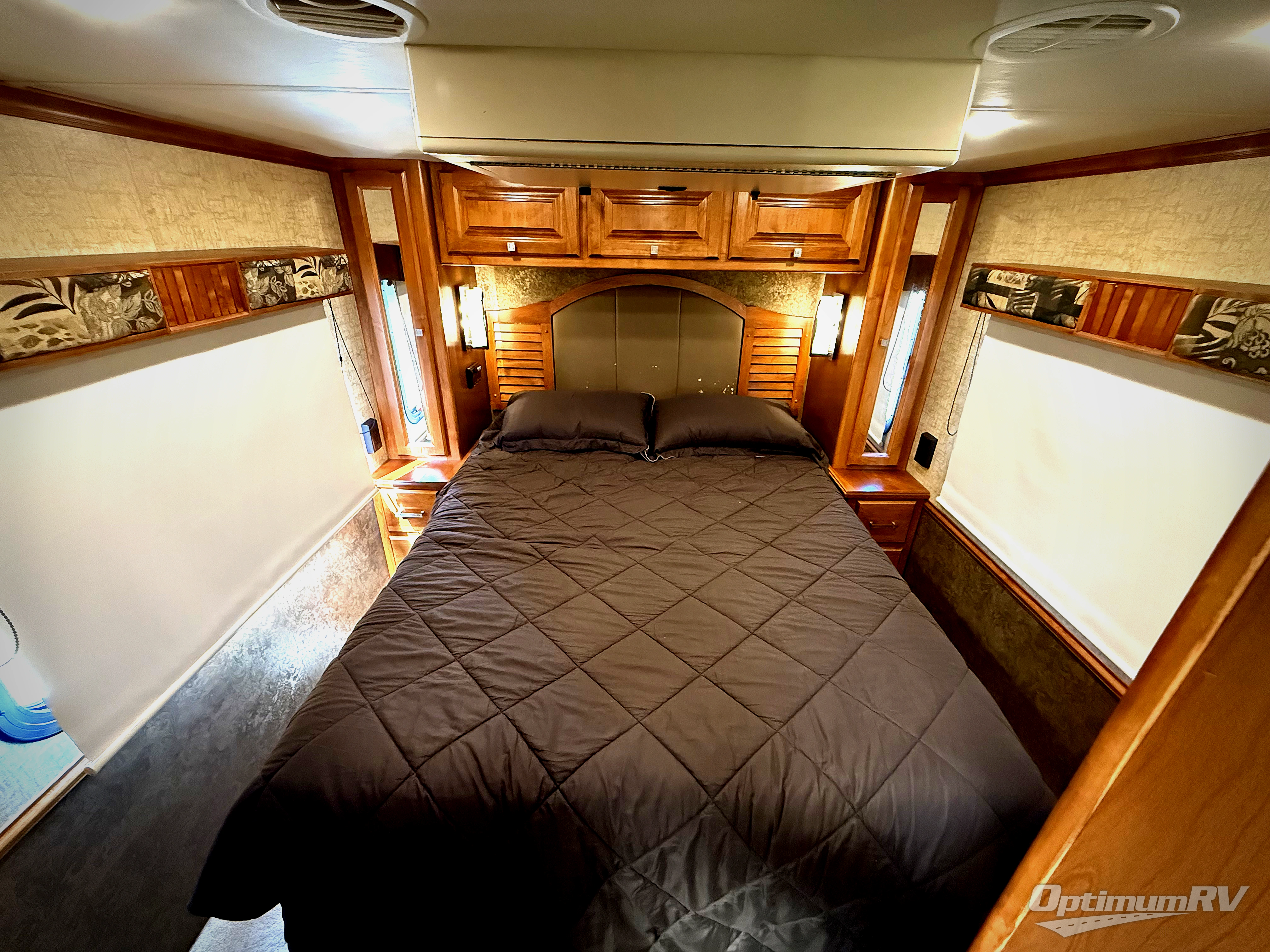 The rear bedroom holds a queen size bed with closets above nightstands at each side of the bed. There is a closet opposite the bed, as well as space for an optional TV.