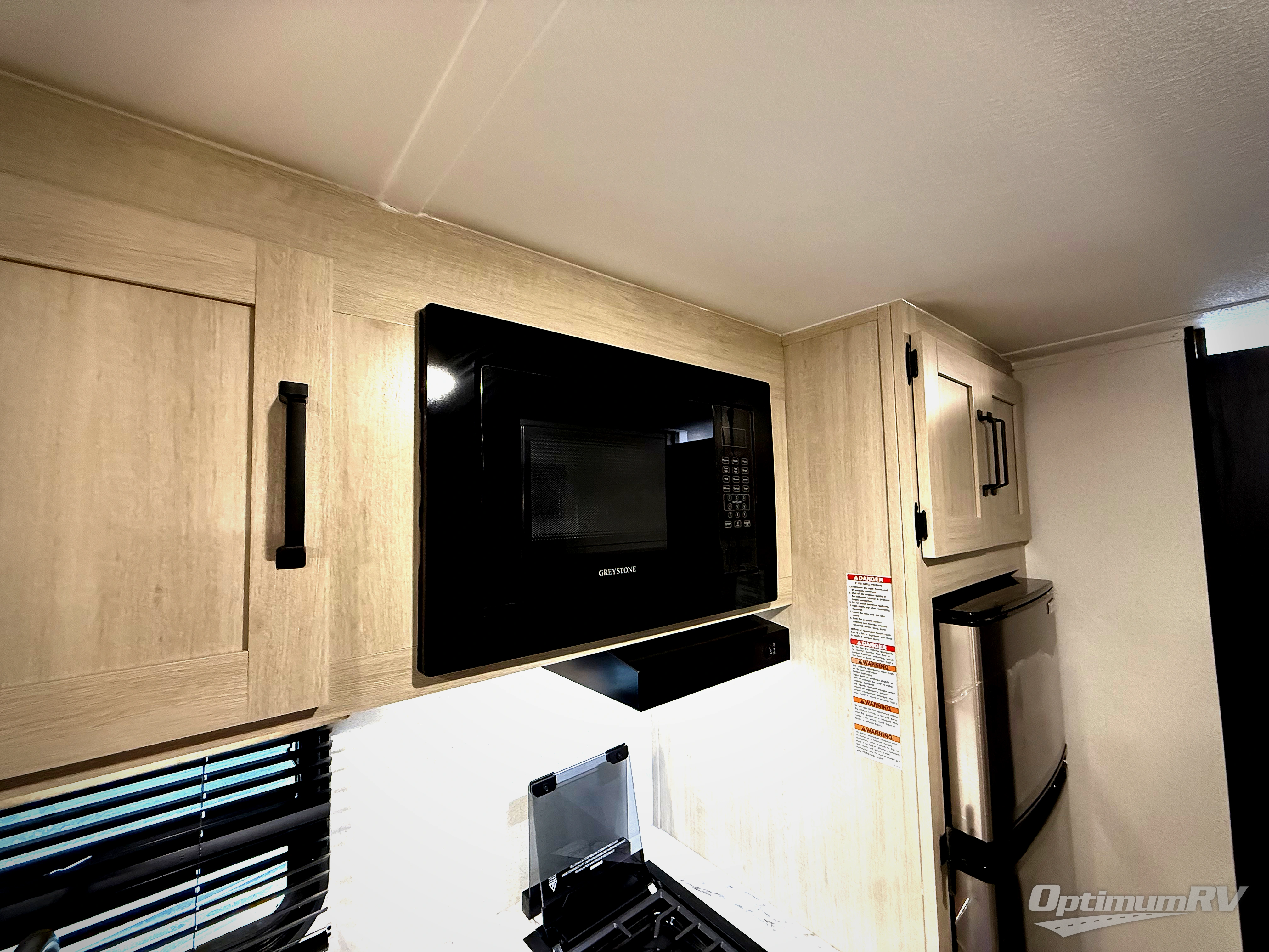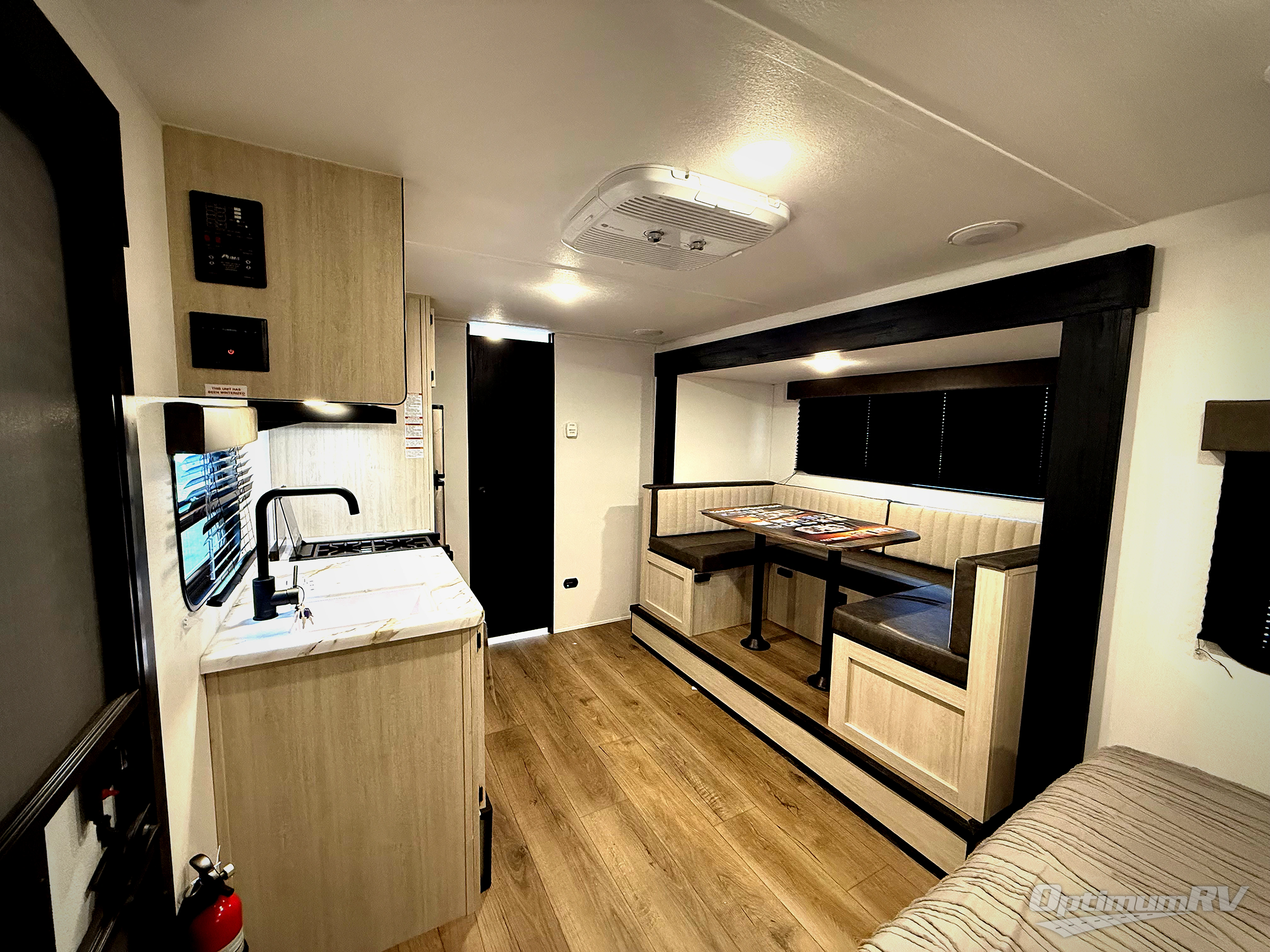 This travel trailer includes everything you need for camping trips at the lake. You'll sleep great each night on the front RV queen bed with a shirt closet to keep your things organized, or you can choose the optional Murphy bed with a shelf. The chef of your group can make meals on the two-burner cooktop or in the microwave oven, then you can dine around the U-shaped dinette slide. A full rear bath includes a 36" x 30" shower, a toilet, vanity, plus a medicine cabinet to keep your things organized.