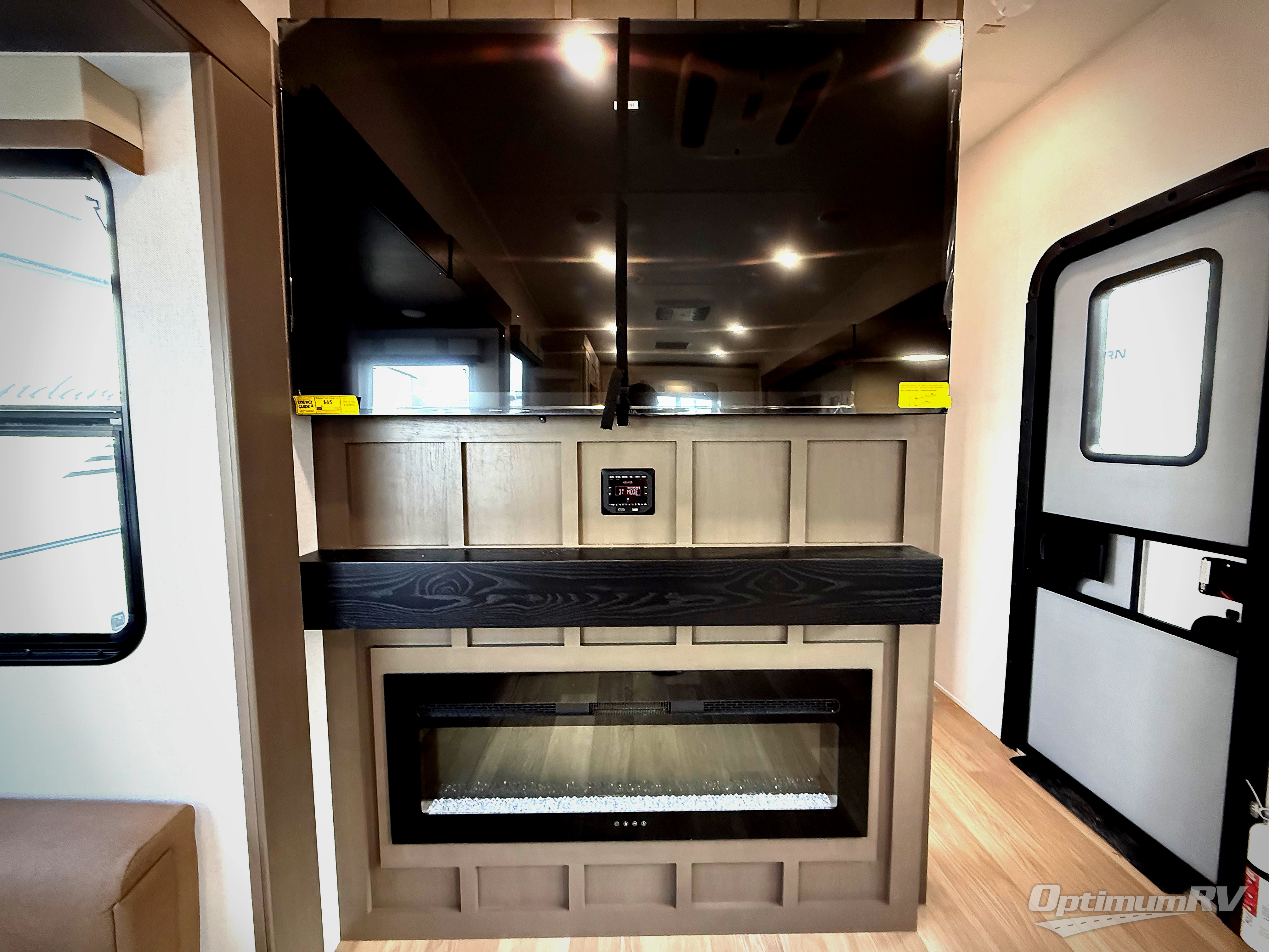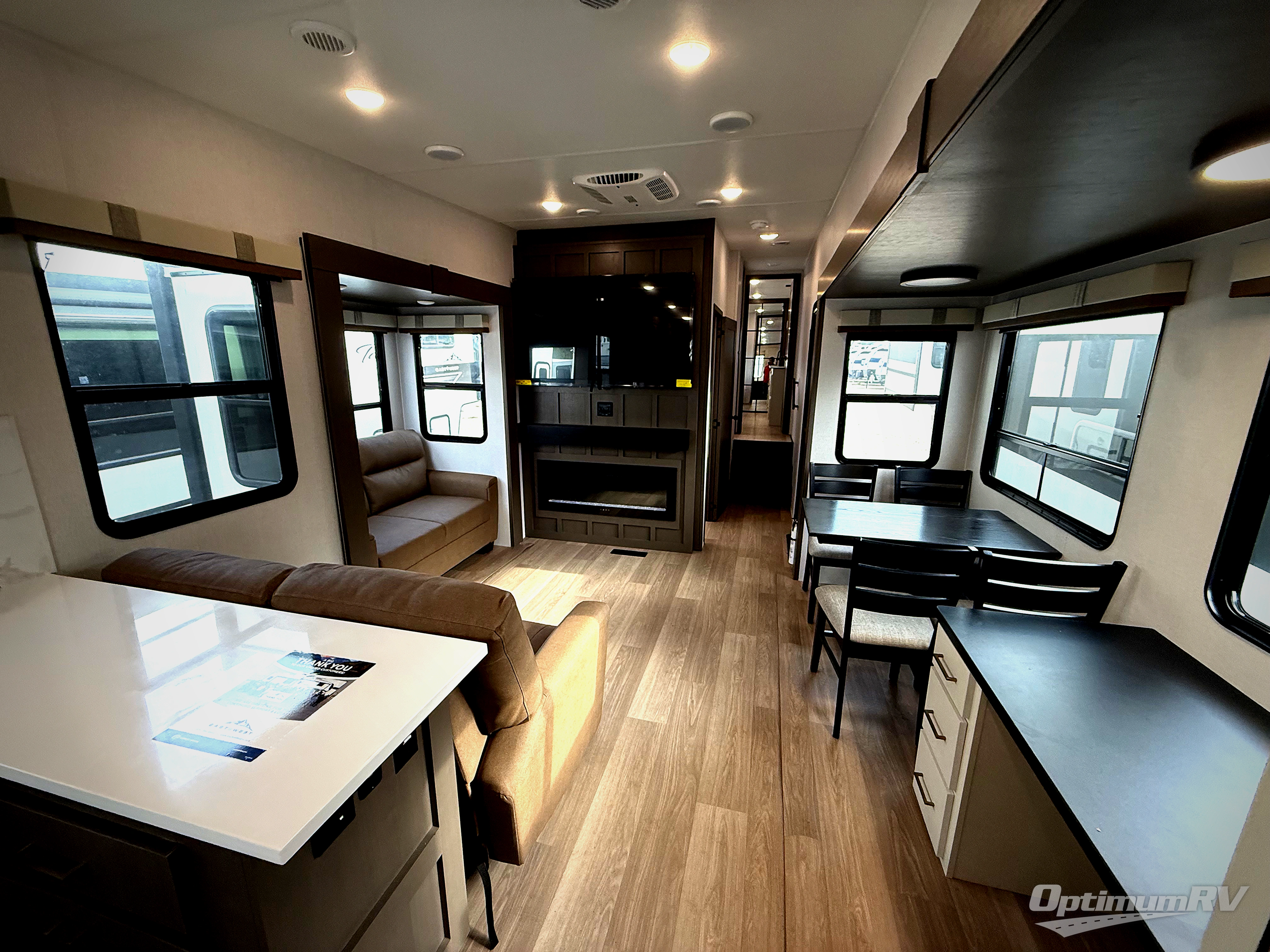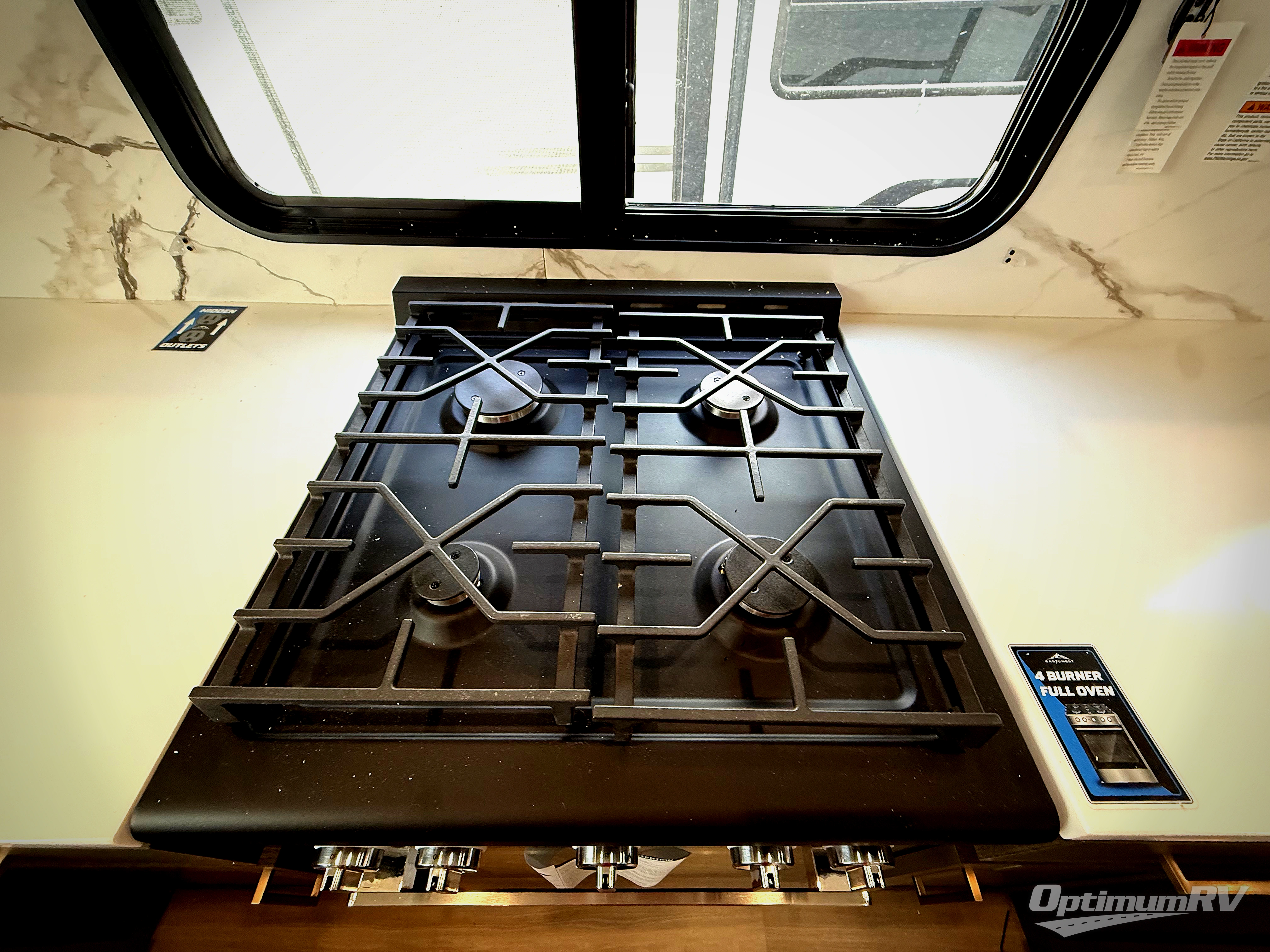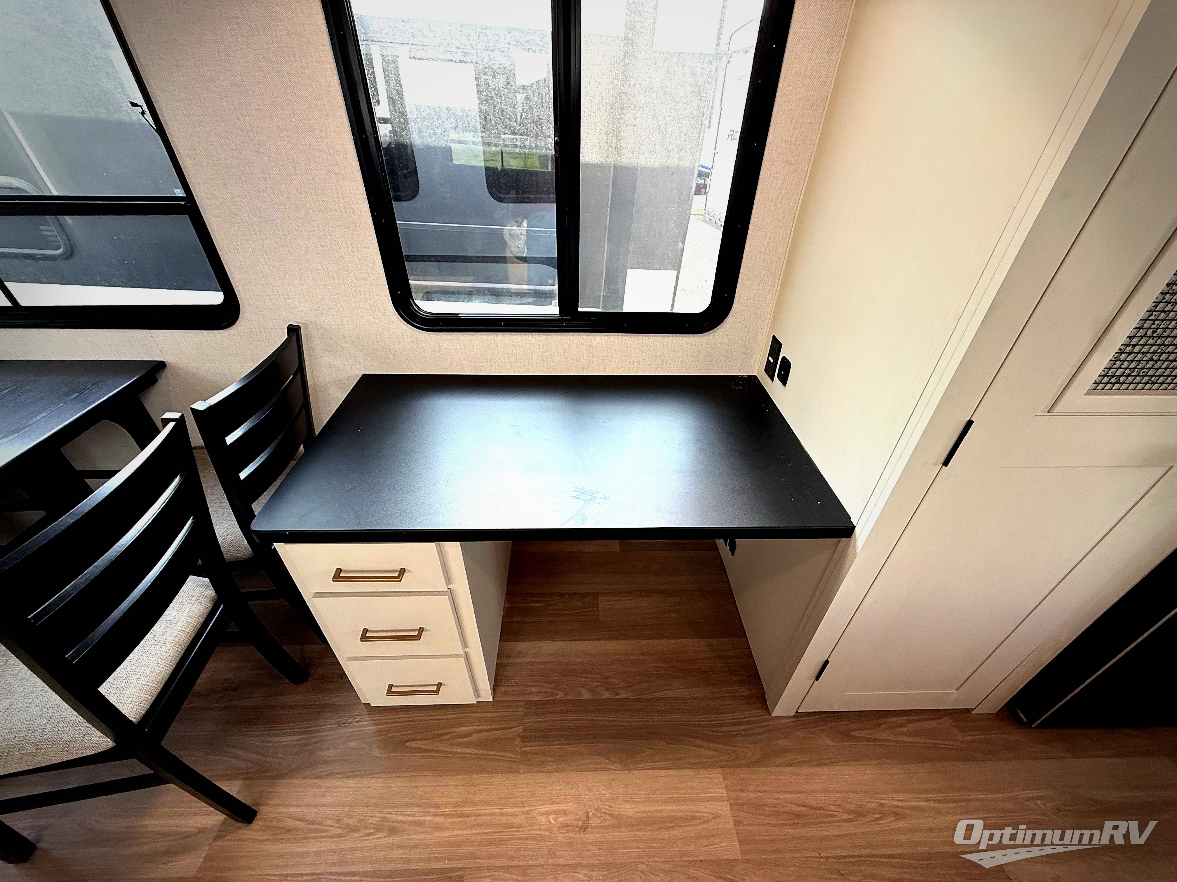 It won't be hard to find comfort and convenience in this spacious fifth wheel! The rear kitchen features ample counter space, a four burner 24" range, plus a 16 cu. ft. 12V refrigerator and pantry for food storage. There is also a desk here if you plan to work while you're away from home, and the coffee station by the pantry will be the perfect place to set up your own Keurig machine. The middle living area includes theater seating across from the 65" TV and fireplace, and there is a hide-a-bed sofa for guests to sleep on. A convenient utility room includes a sink with counter space plus stackable washer/dryer prep to make this an optional laundry room! A full bath will let you freshen up each day, and the front private bedroom will feel just like home with its king bed slide out, dresser and full-width wardrobe!