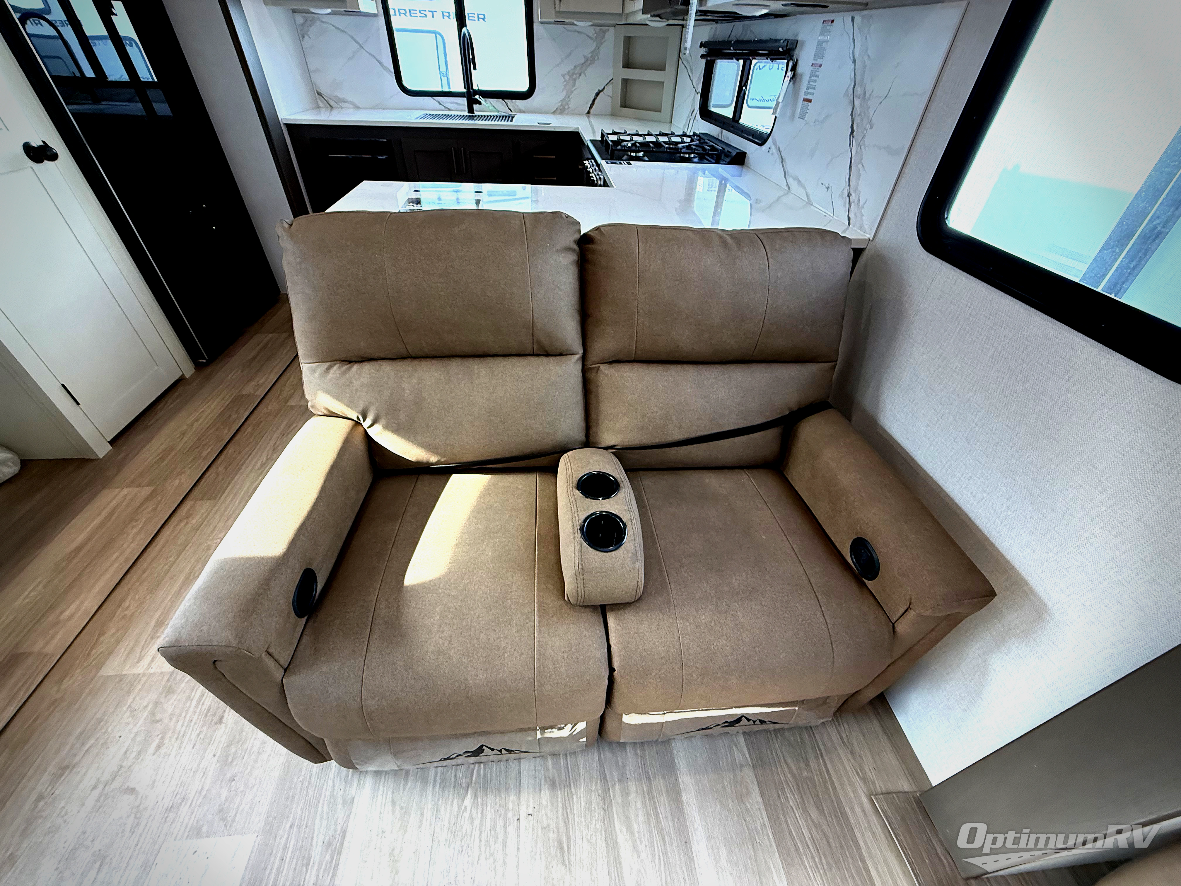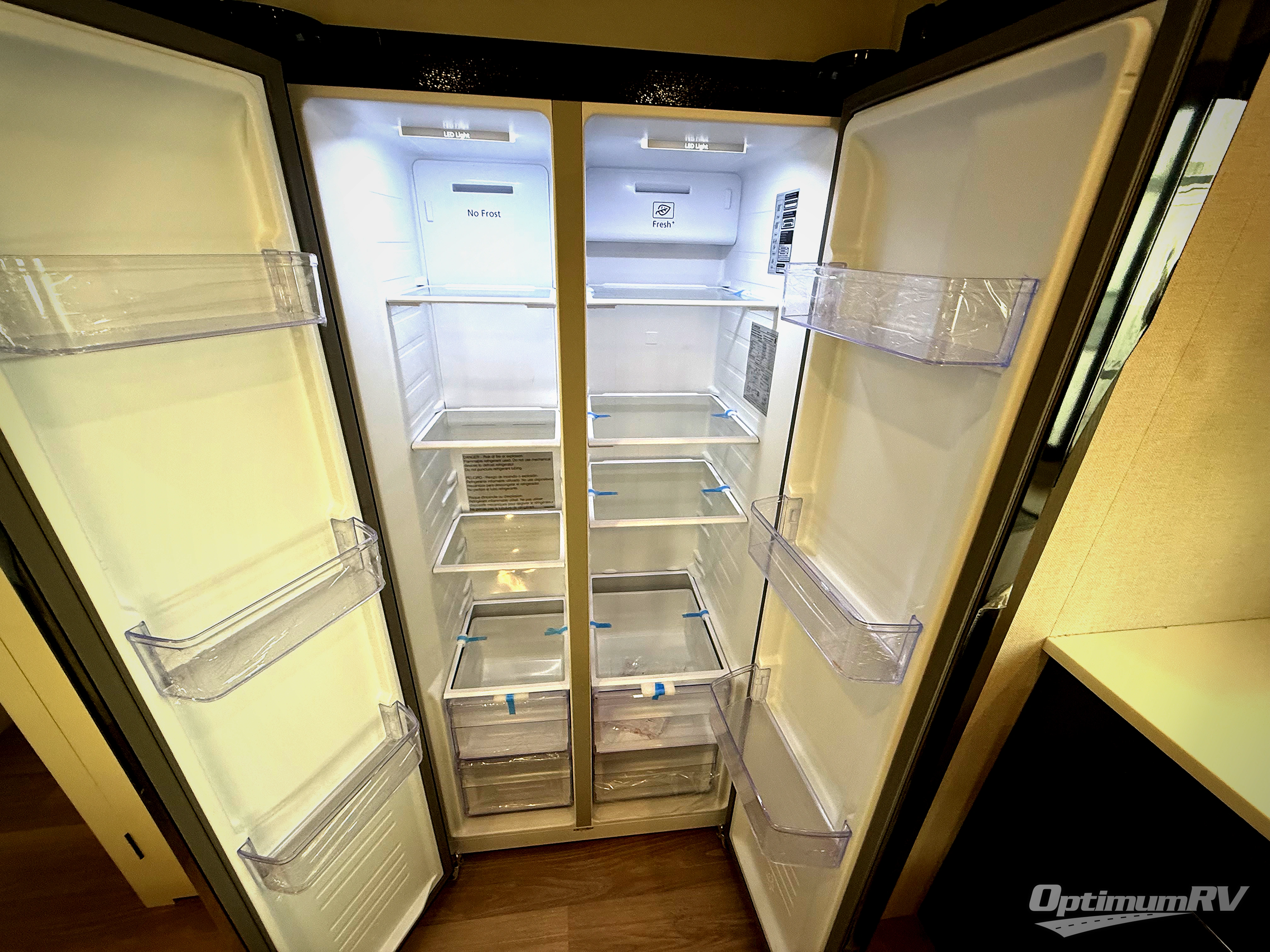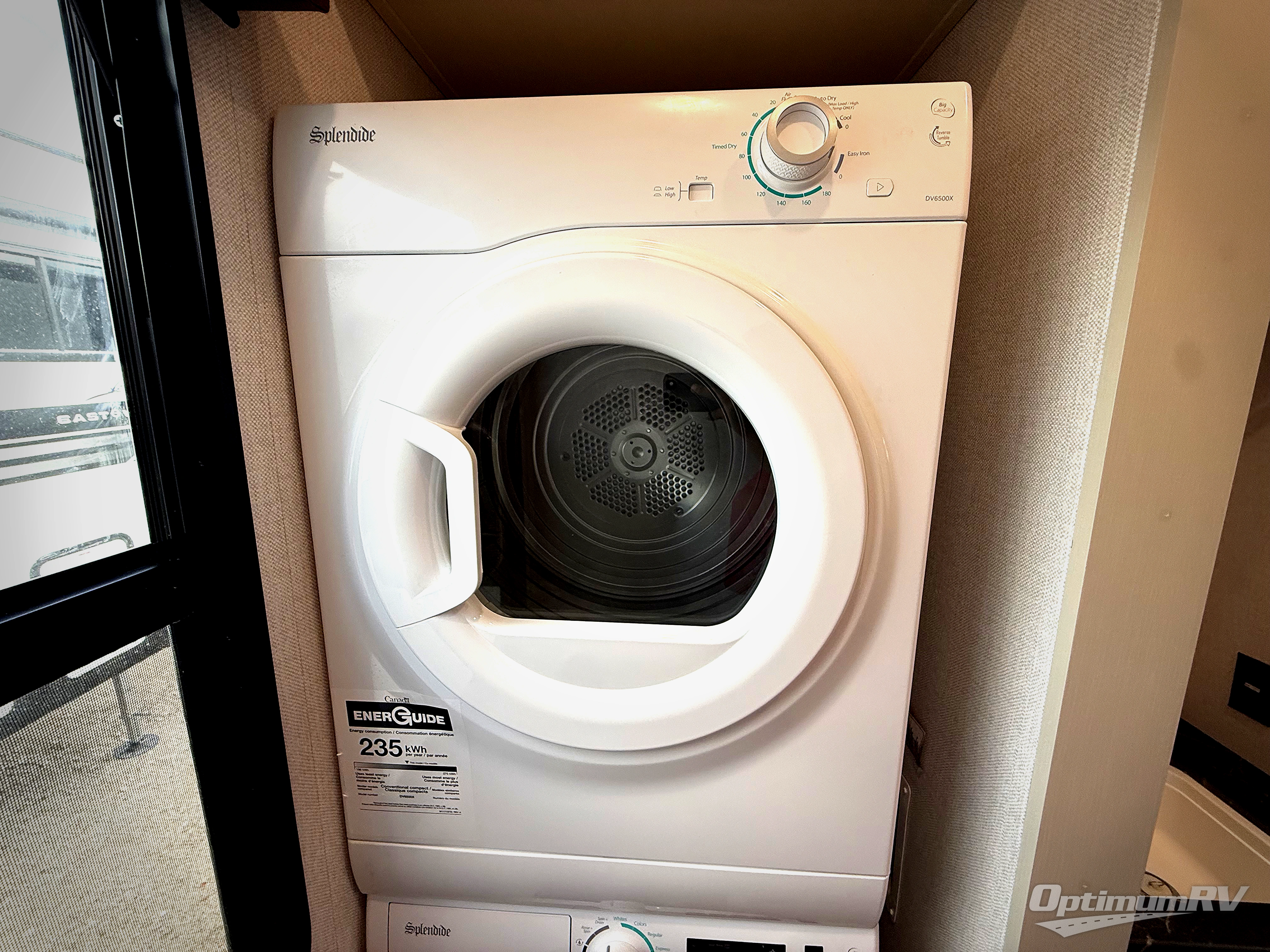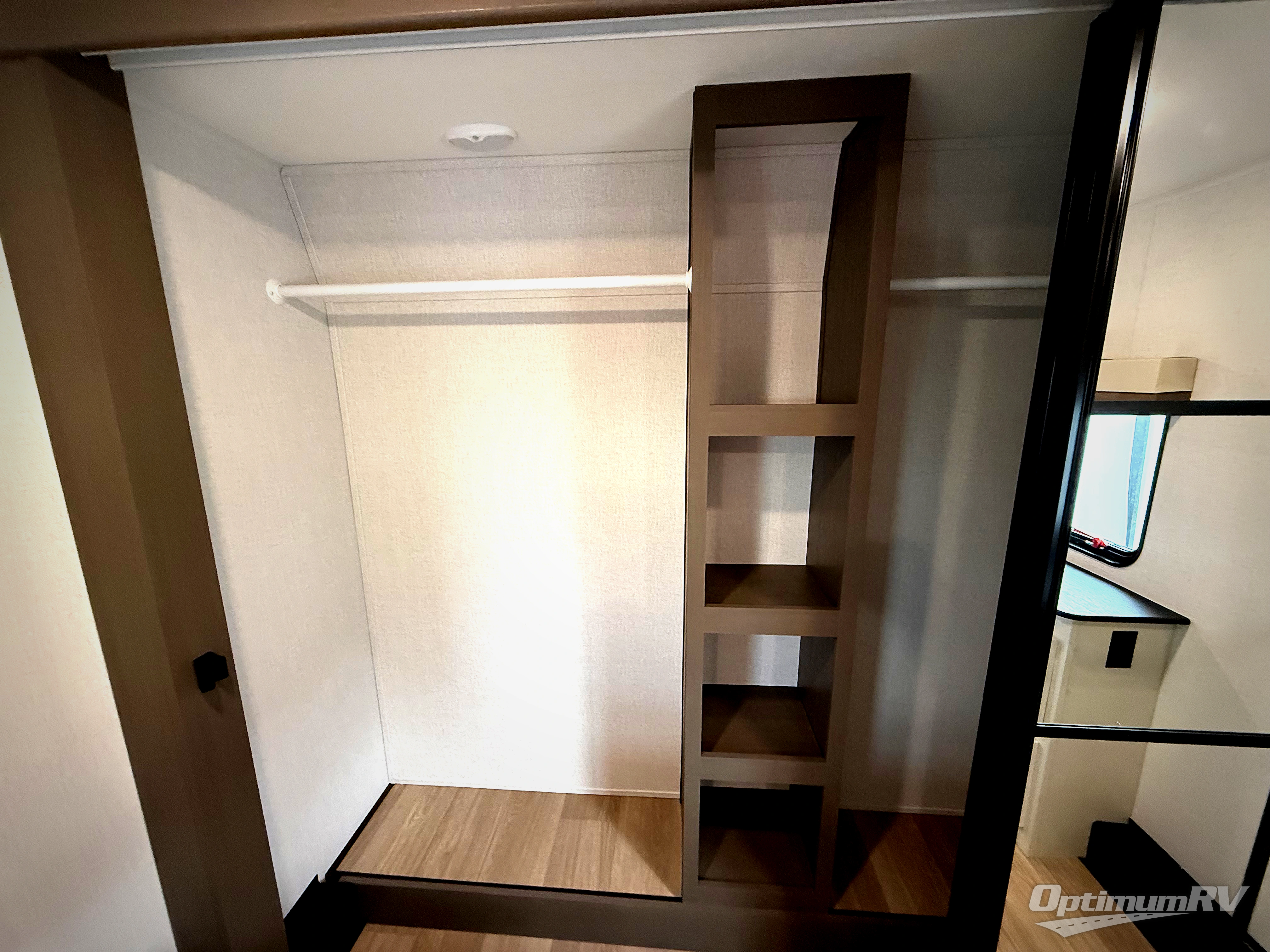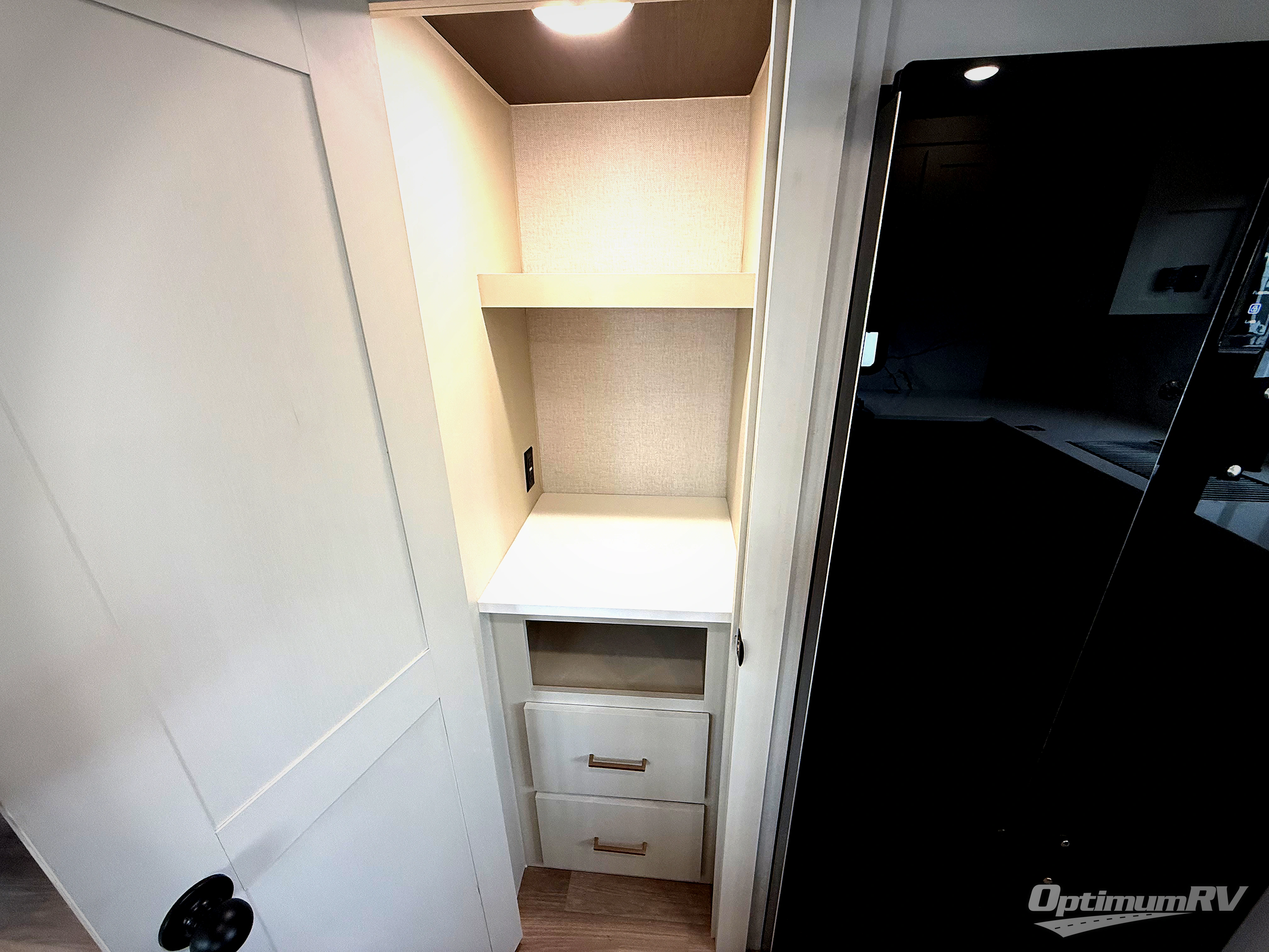 It won't be hard to find comfort and convenience in this spacious fifth wheel! The rear kitchen features ample counter space, a four burner 24" range, plus a 16 cu. ft. 12V refrigerator and pantry for food storage. There is also a desk here if you plan to work while you're away from home, and the coffee station by the pantry will be the perfect place to set up your own Keurig machine. The middle living area includes theater seating across from the 65" TV and fireplace, and there is a hide-a-bed sofa for guests to sleep on. A convenient utility room includes a sink with counter space plus stackable washer/dryer prep to make this an optional laundry room! A full bath will let you freshen up each day, and the front private bedroom will feel just like home with its king bed slide out, dresser and full-width wardrobe!