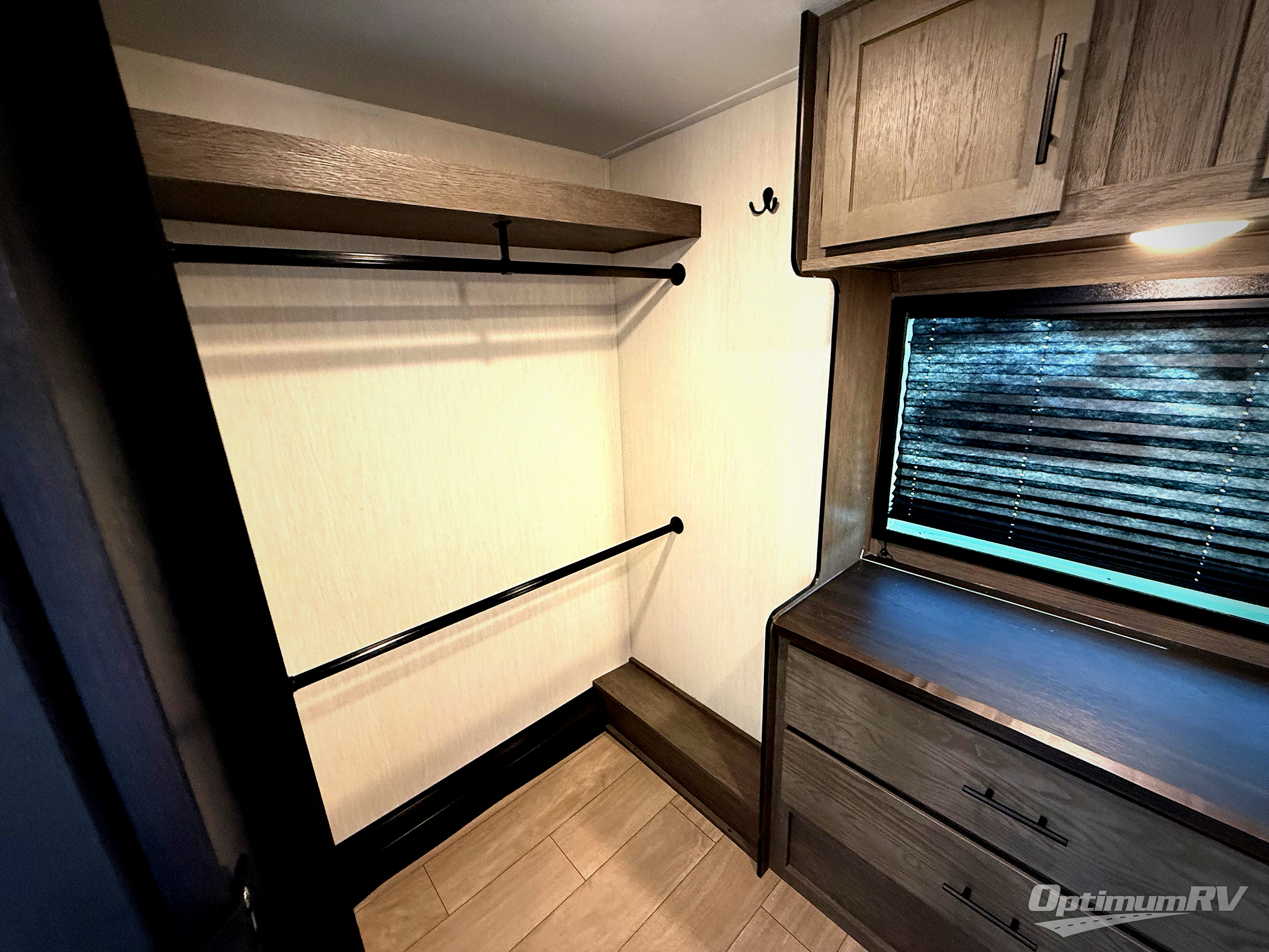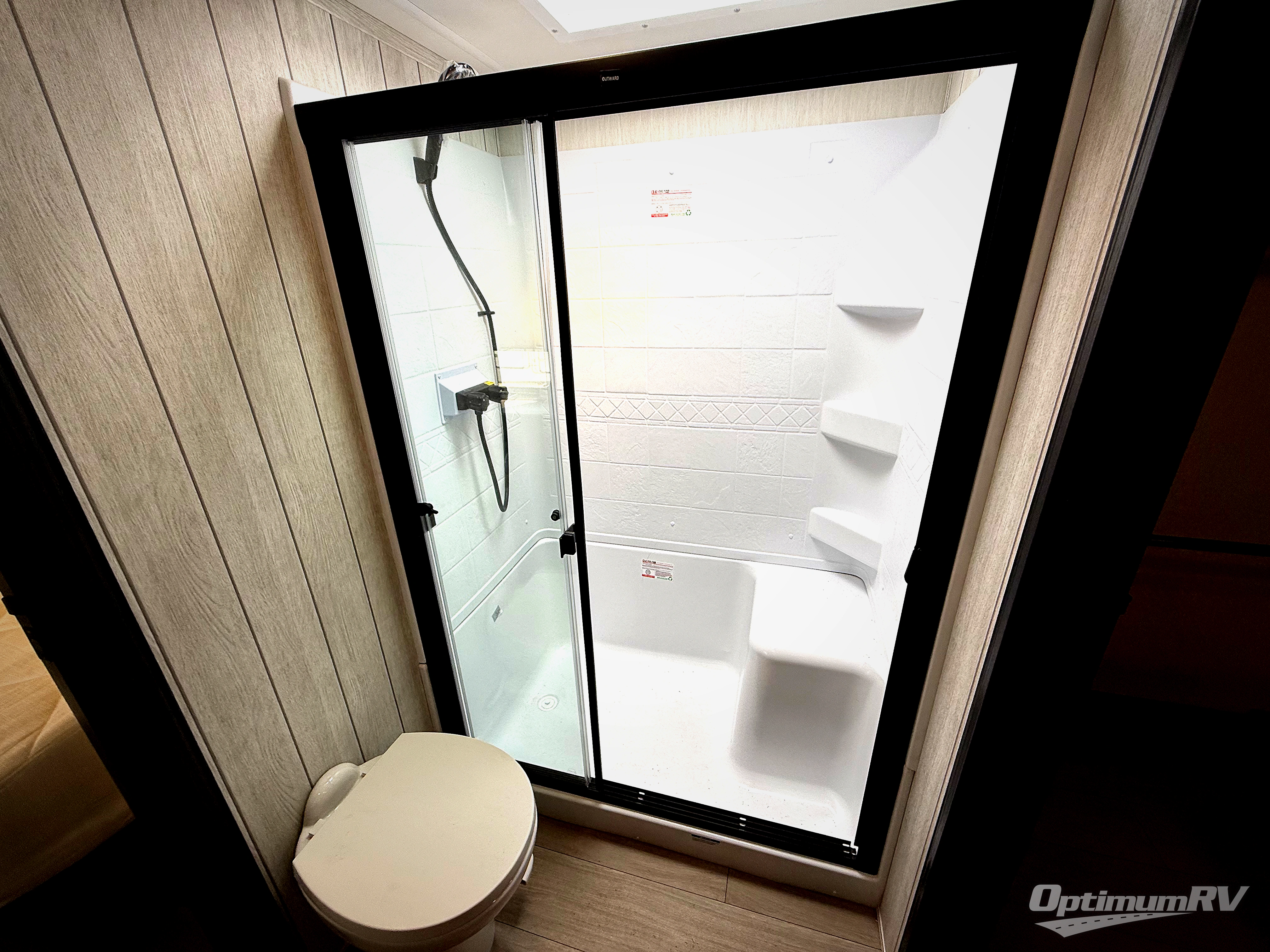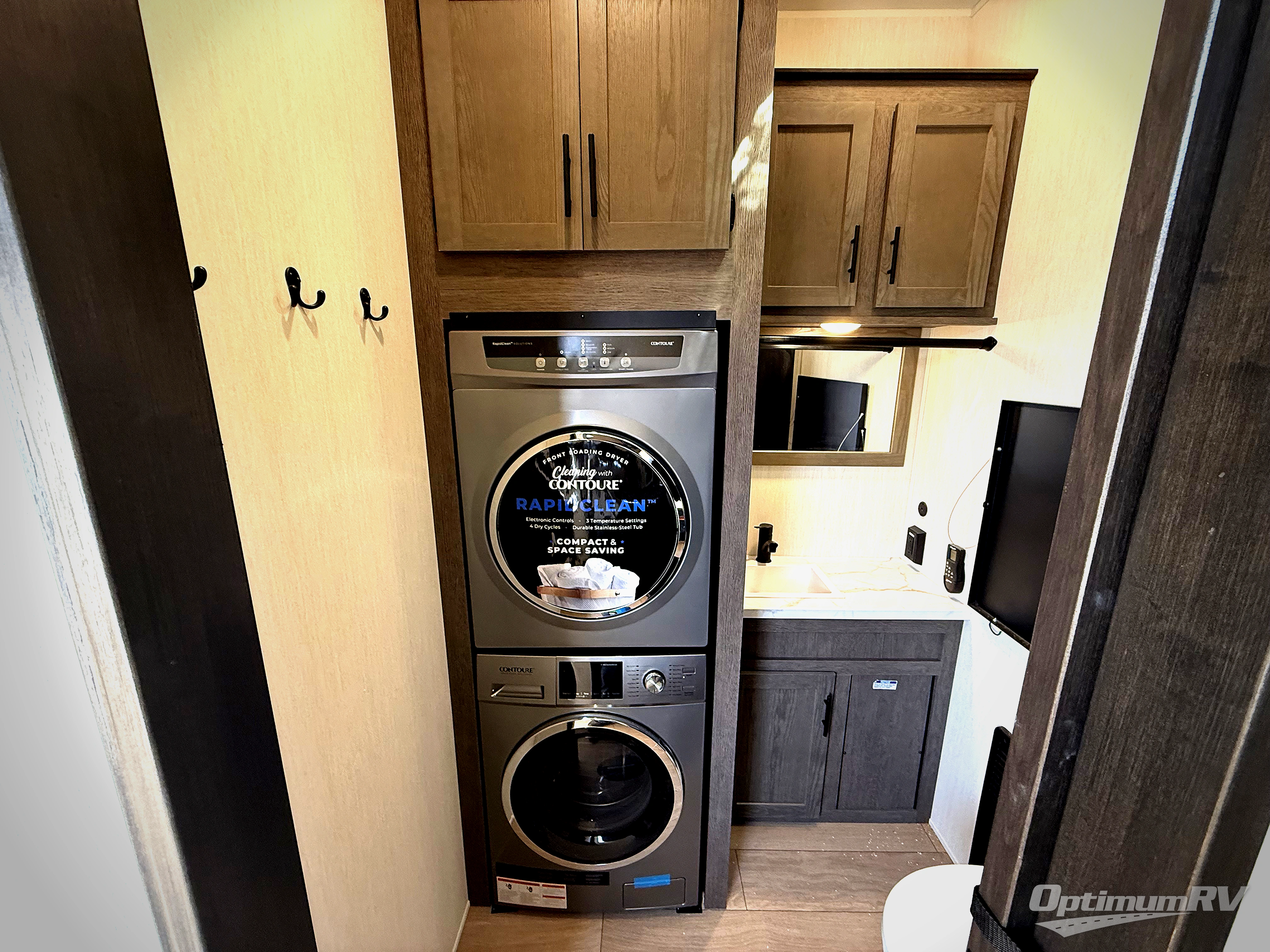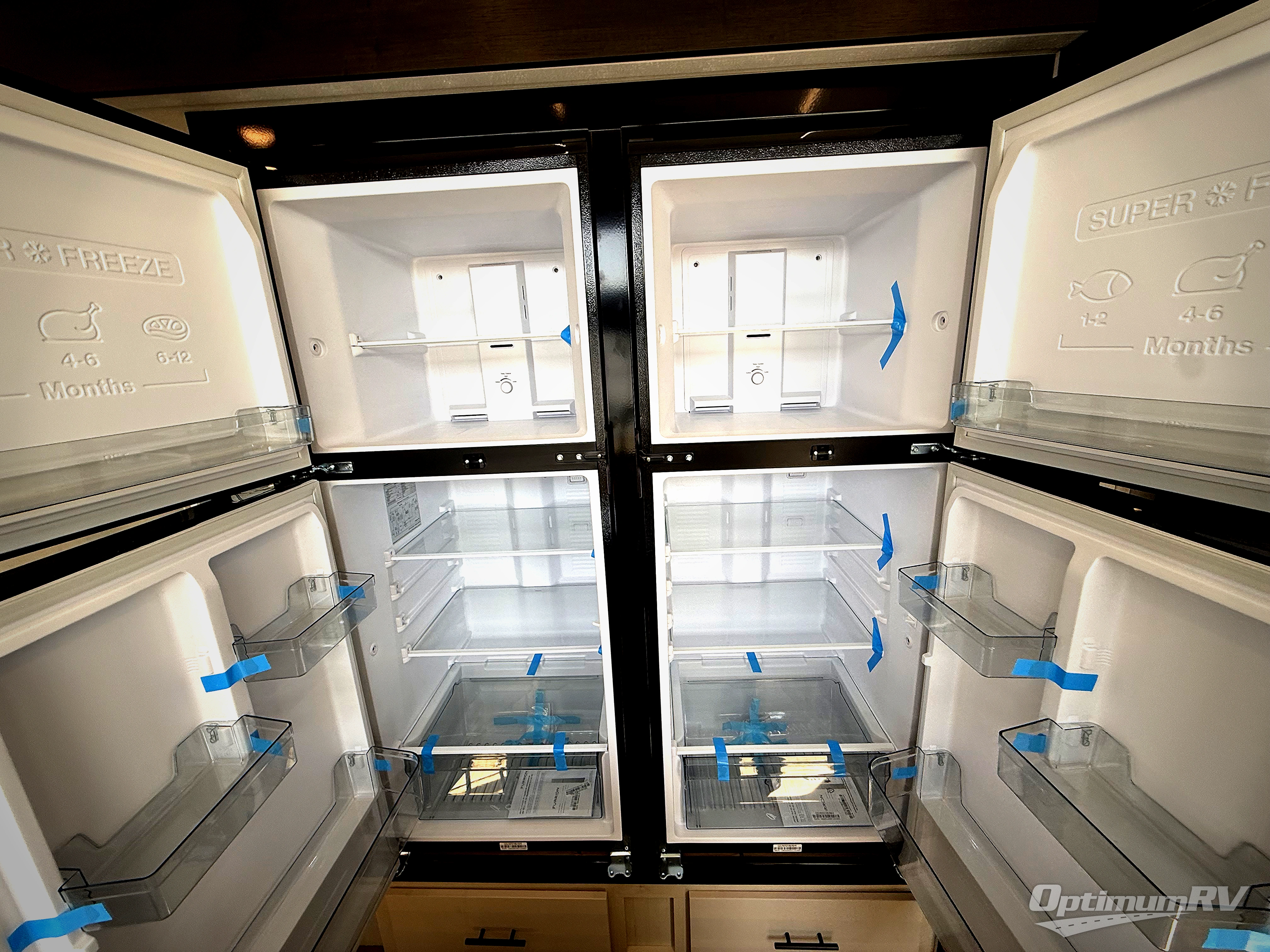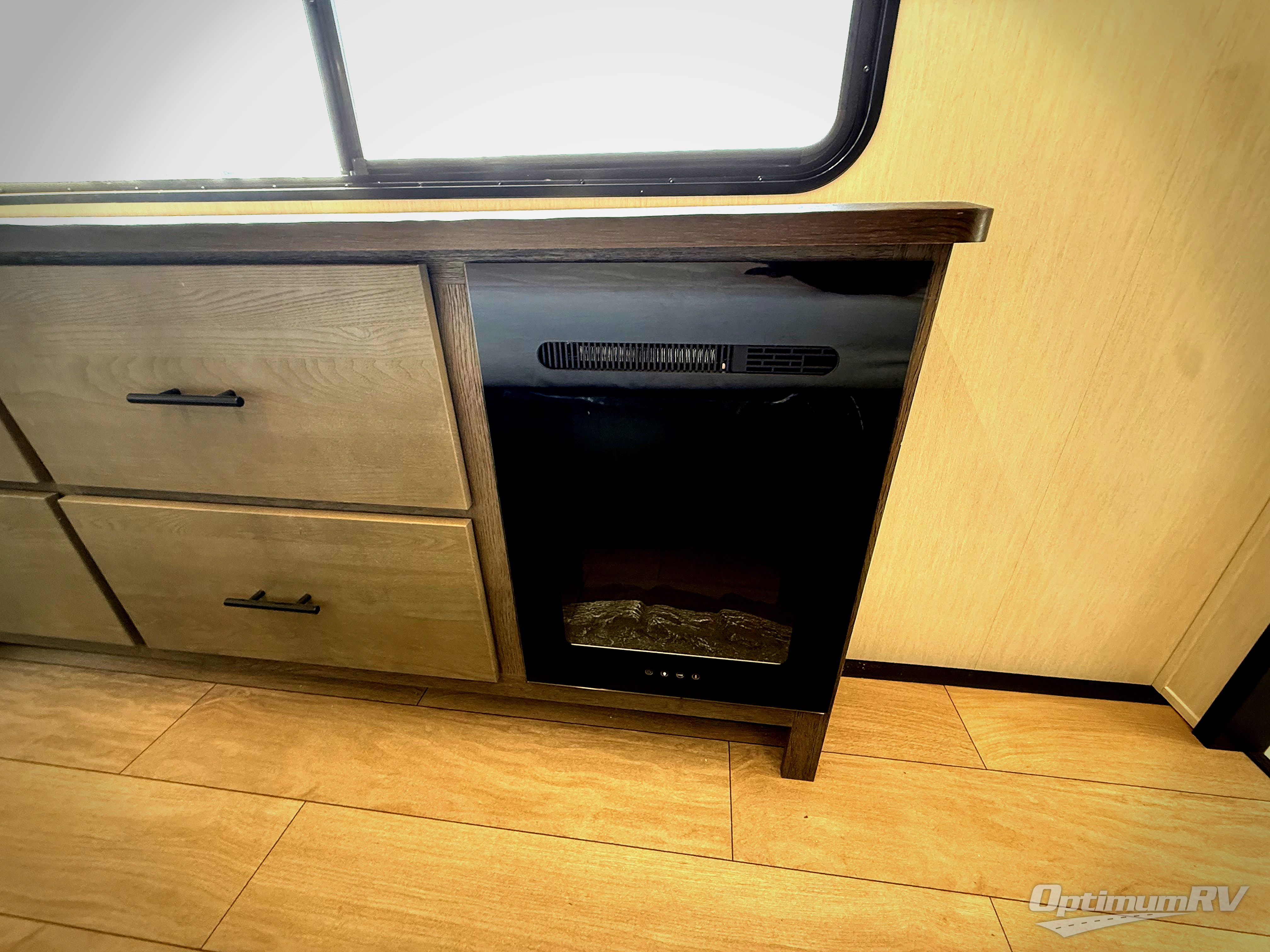 This thoughtfully arranged floorplan is built for extended stays and easy daily living. The rear lounge centers around an L-shaped sectional facing the entertainment wall and fireplace, with a nearby desk for work or hobbies. The kitchen’s island anchors a generous prep area, oversized pantry, and full cooking suite, so meals are simple whether you’re weekending or full-timing. Mid-coach, the guest half bath is convenient for all. Up front, the private bedroom’s king bed slide connects to a spa-style bath with large shower and dressing space, plus a substantial wardrobe to keep clutter out of sight. Outside, enjoy the campsite under dual power awnings that stretch along the patio side.