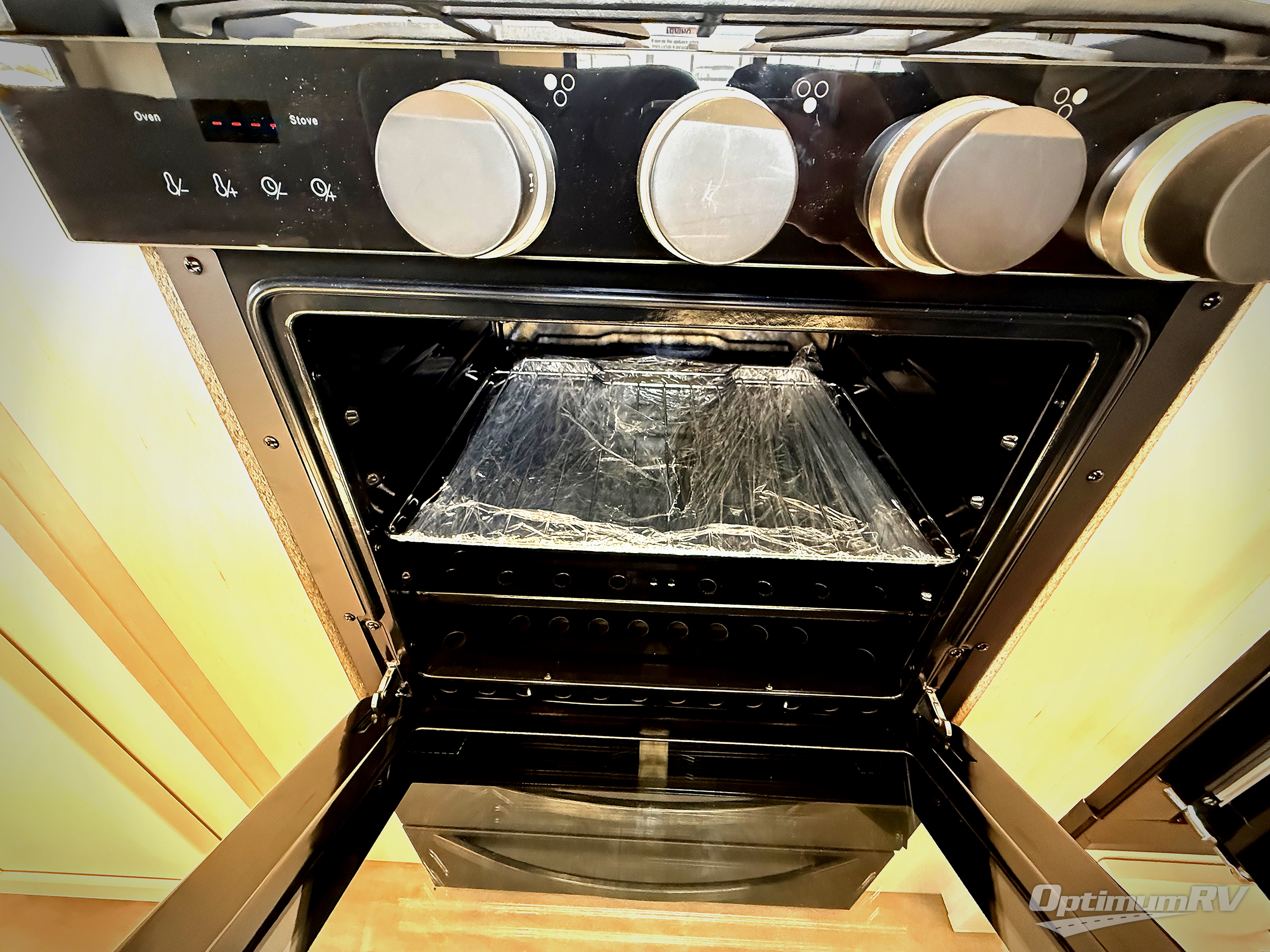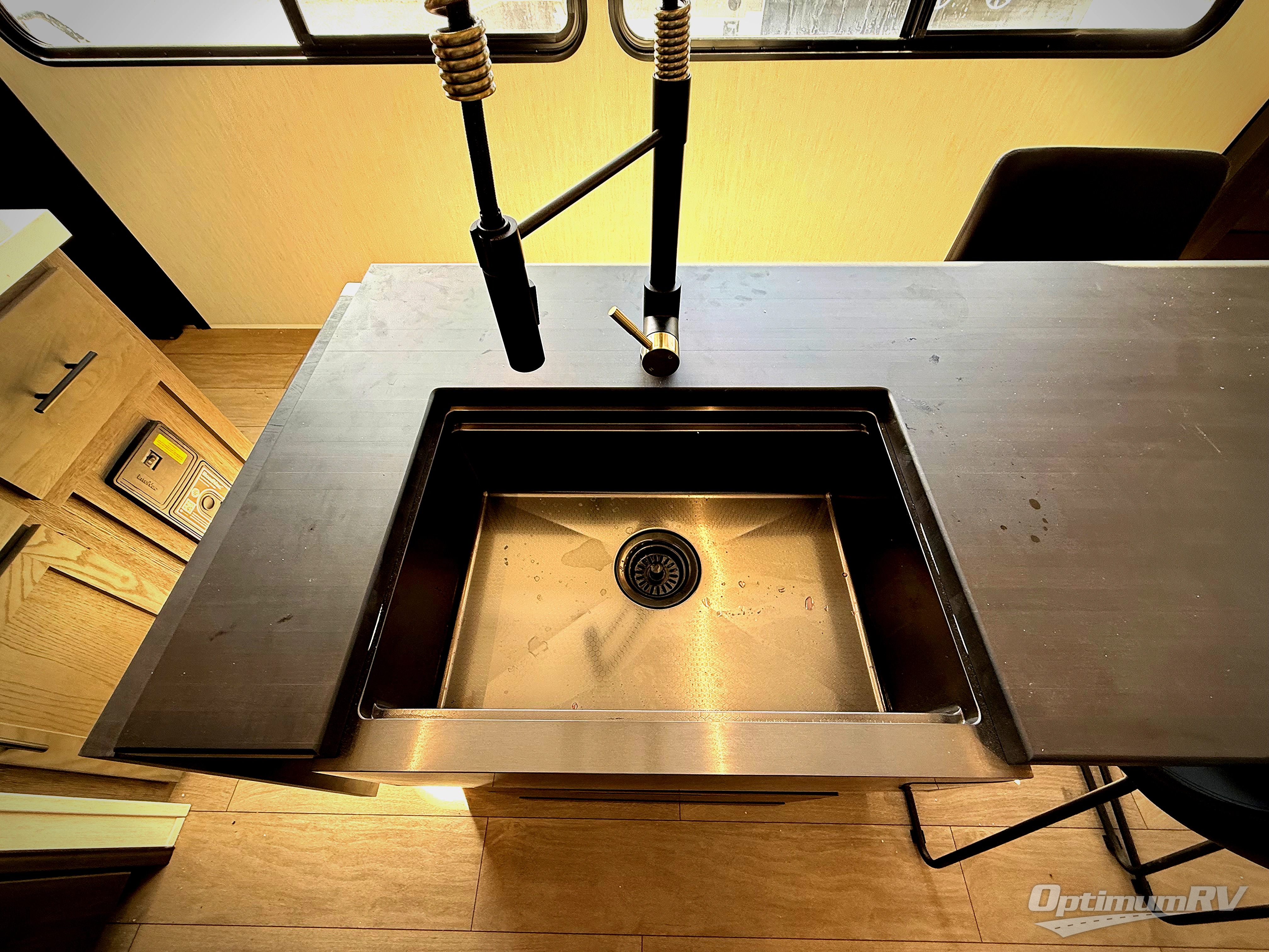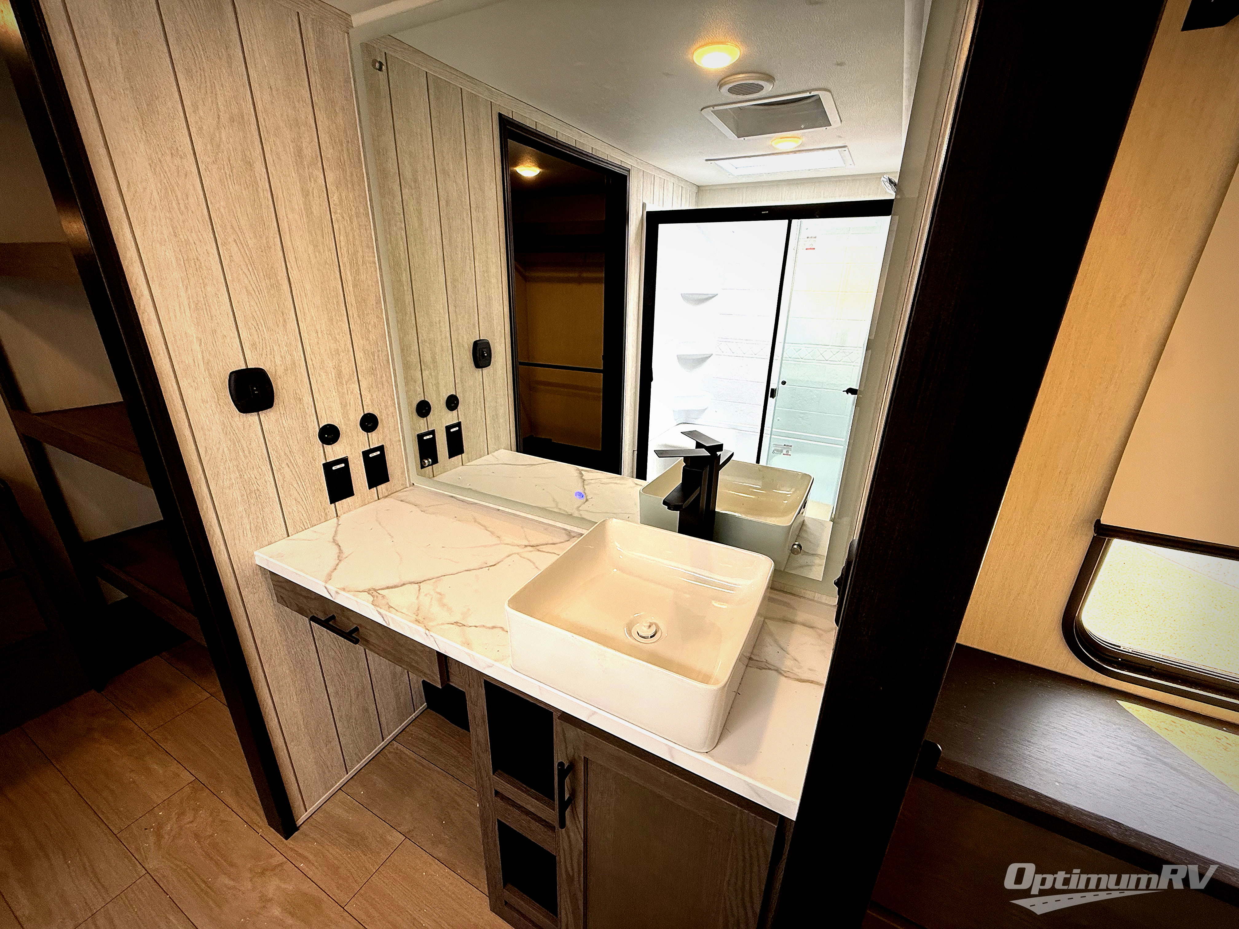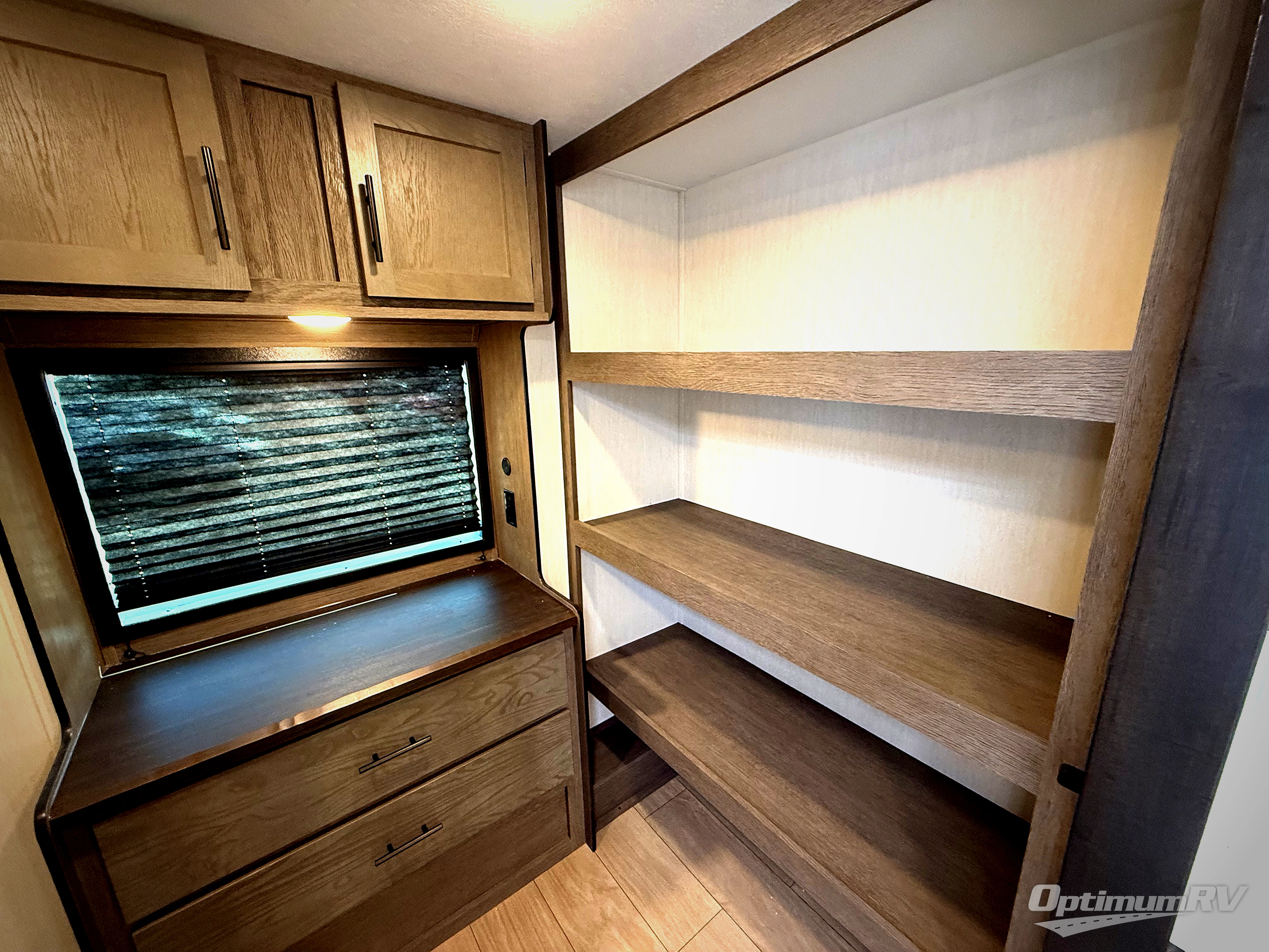 This thoughtfully arranged floorplan is built for extended stays and easy daily living. The rear lounge centers around an L-shaped sectional facing the entertainment wall and fireplace, with a nearby desk for work or hobbies. The kitchen’s island anchors a generous prep area, oversized pantry, and full cooking suite, so meals are simple whether you’re weekending or full-timing. Mid-coach, the guest half bath is convenient for all. Up front, the private bedroom’s king bed slide connects to a spa-style bath with large shower and dressing space, plus a substantial wardrobe to keep clutter out of sight. Outside, enjoy the campsite under dual power awnings that stretch along the patio side.