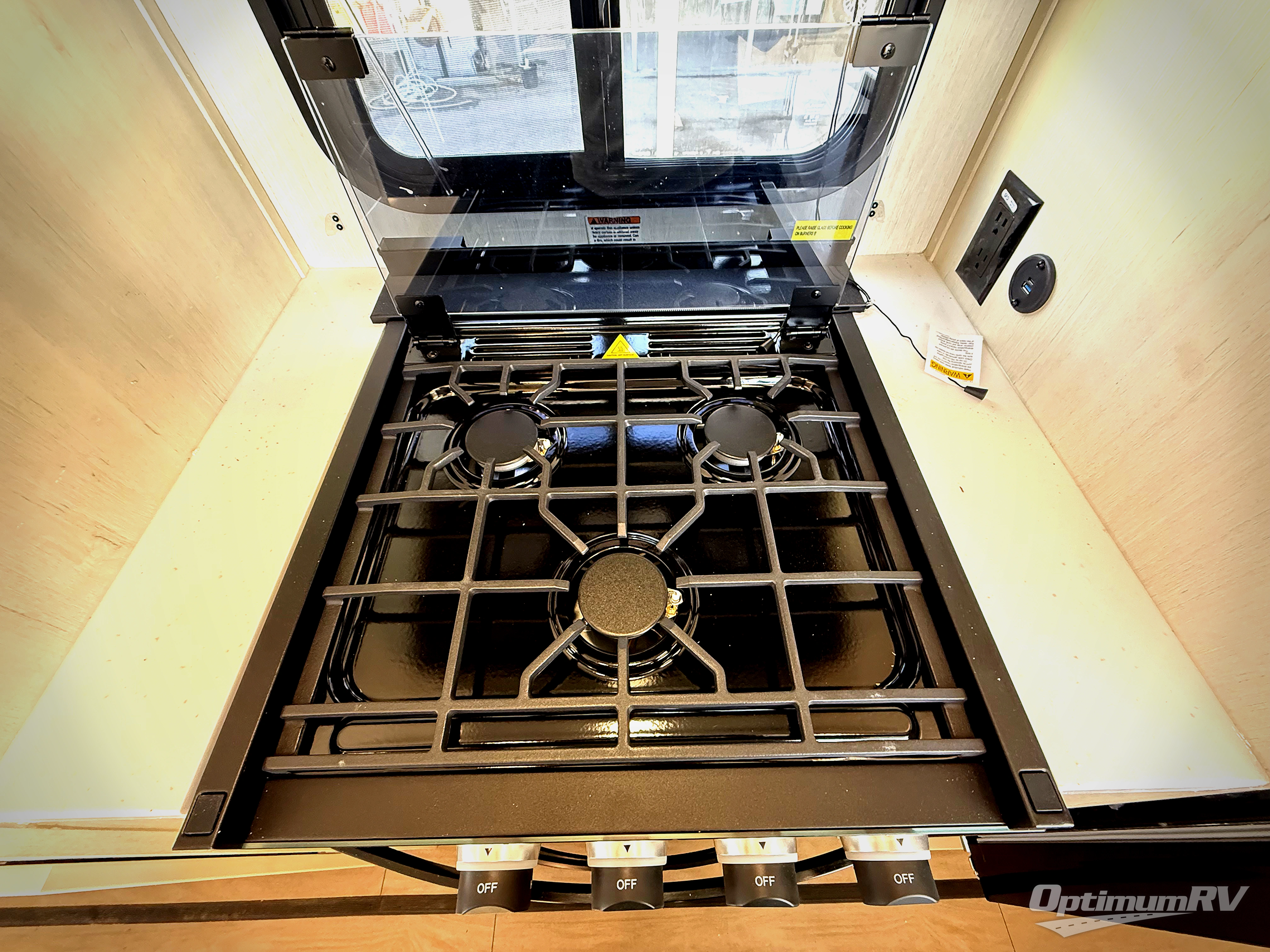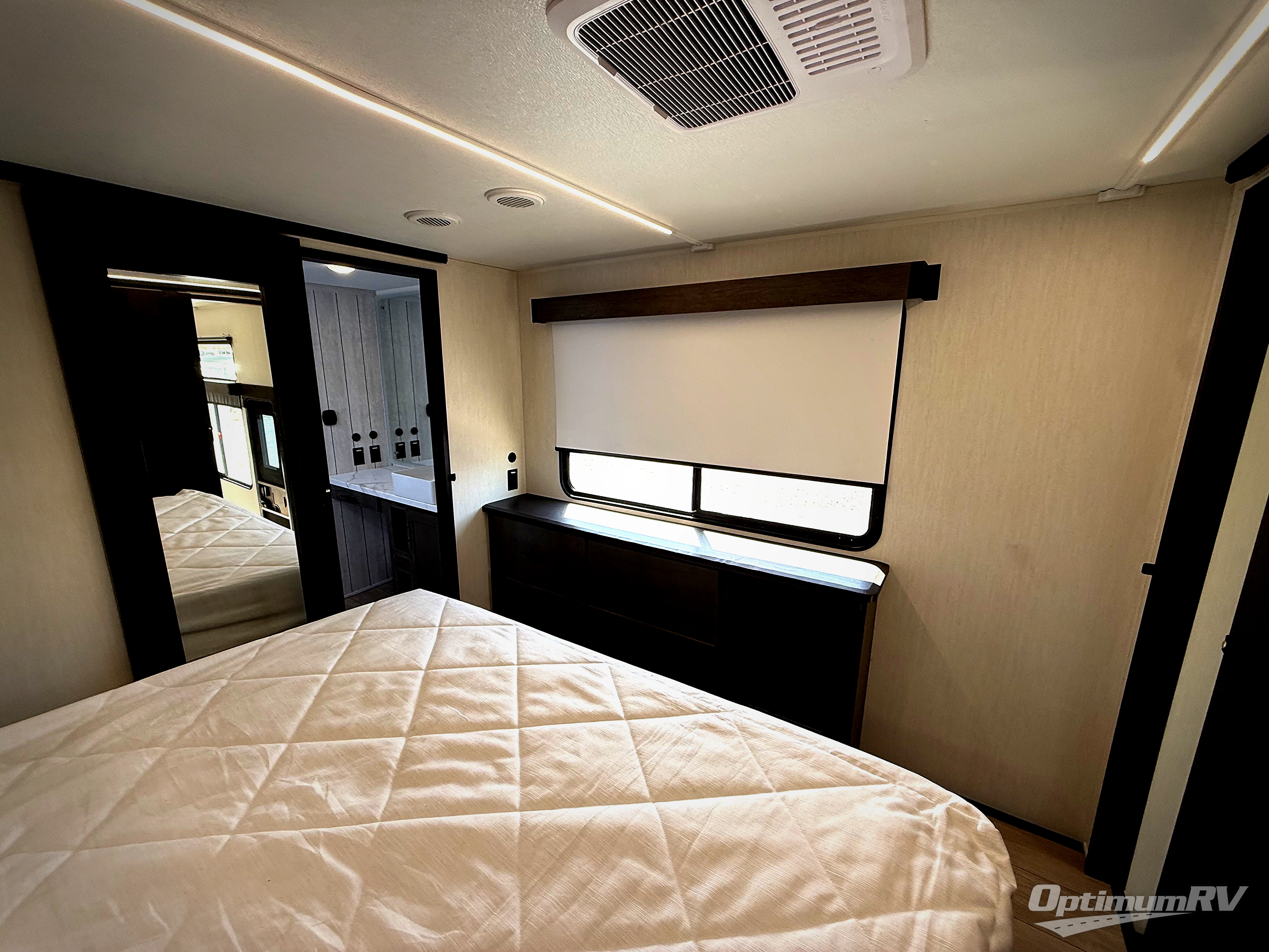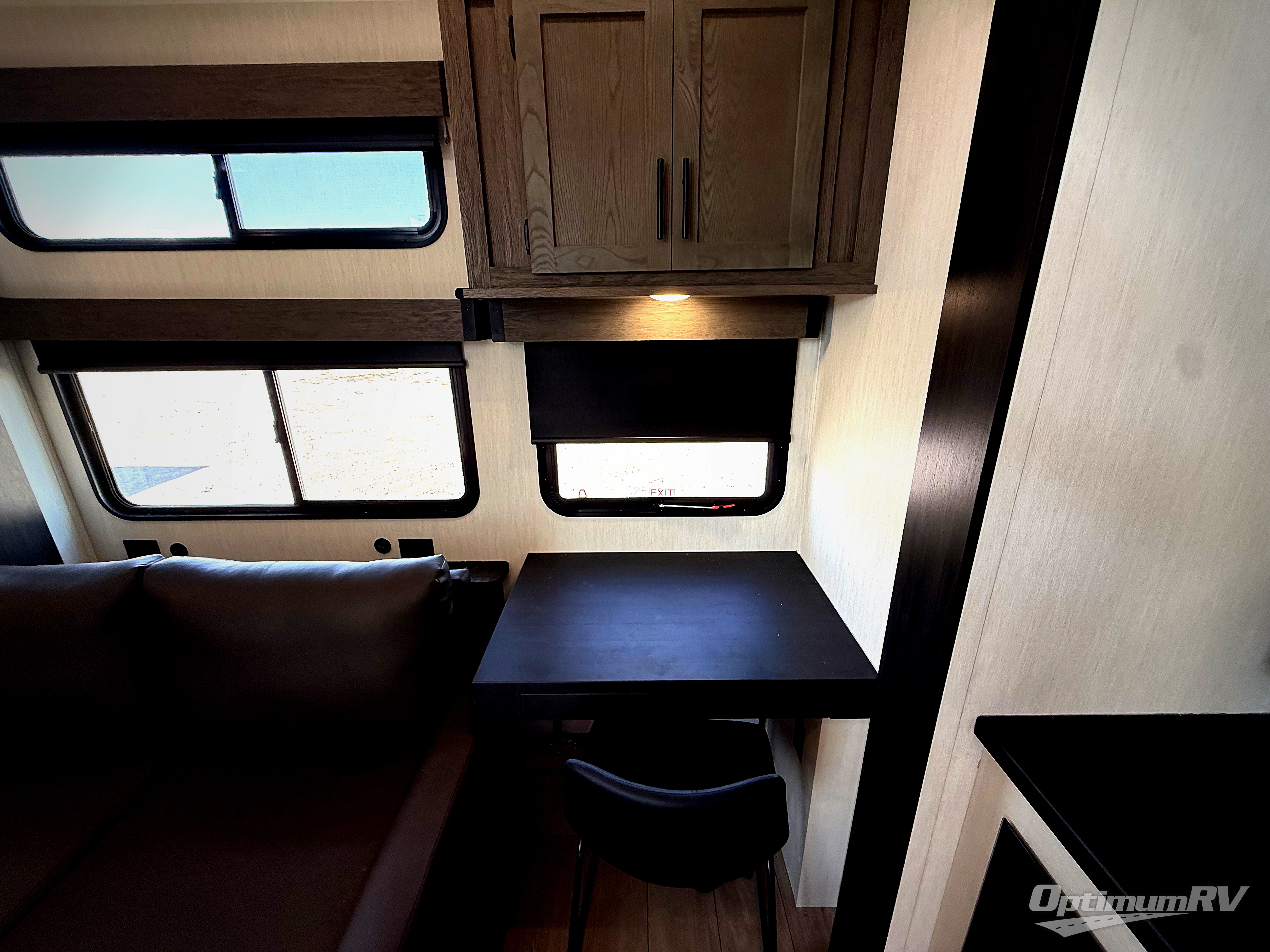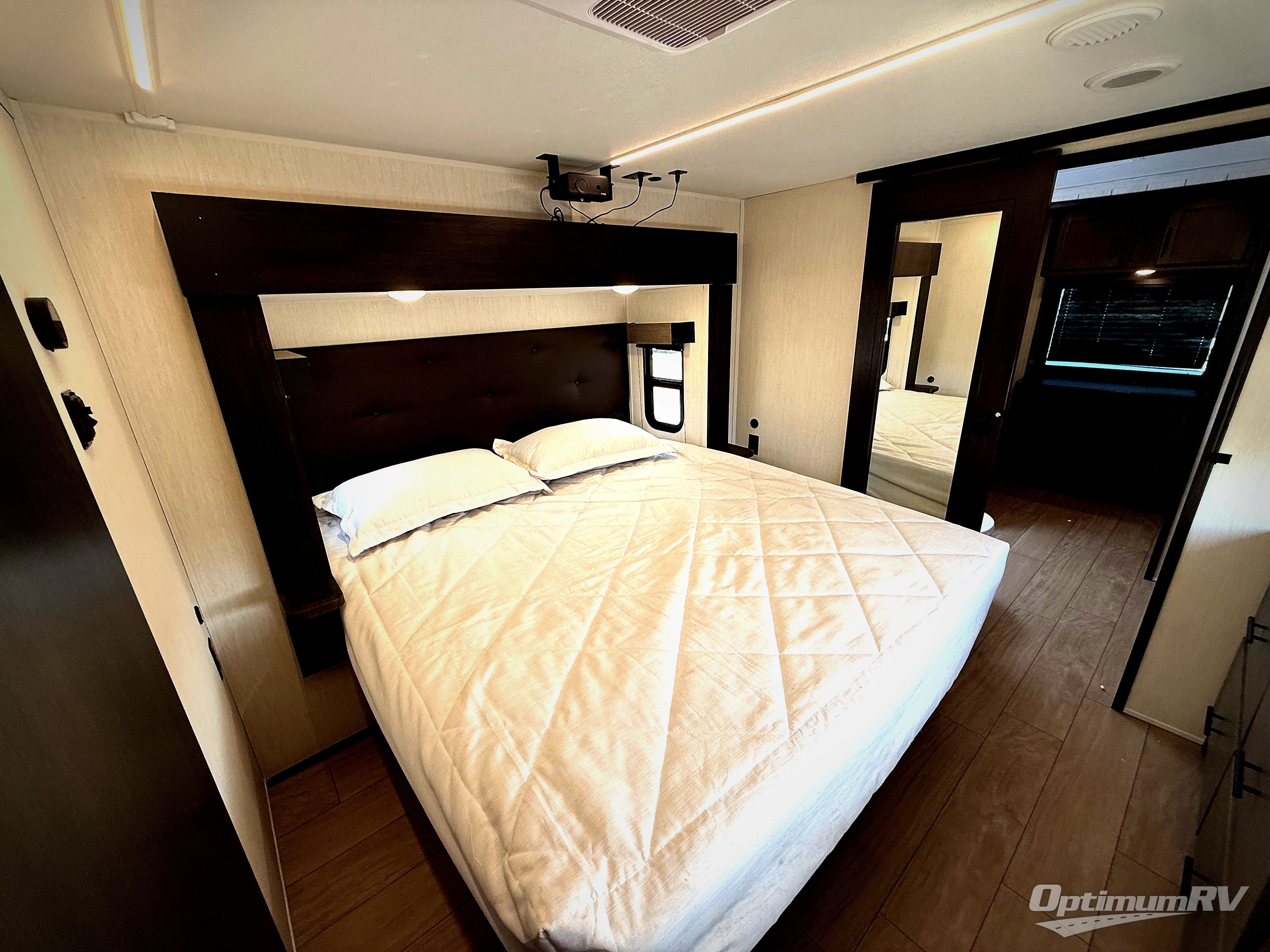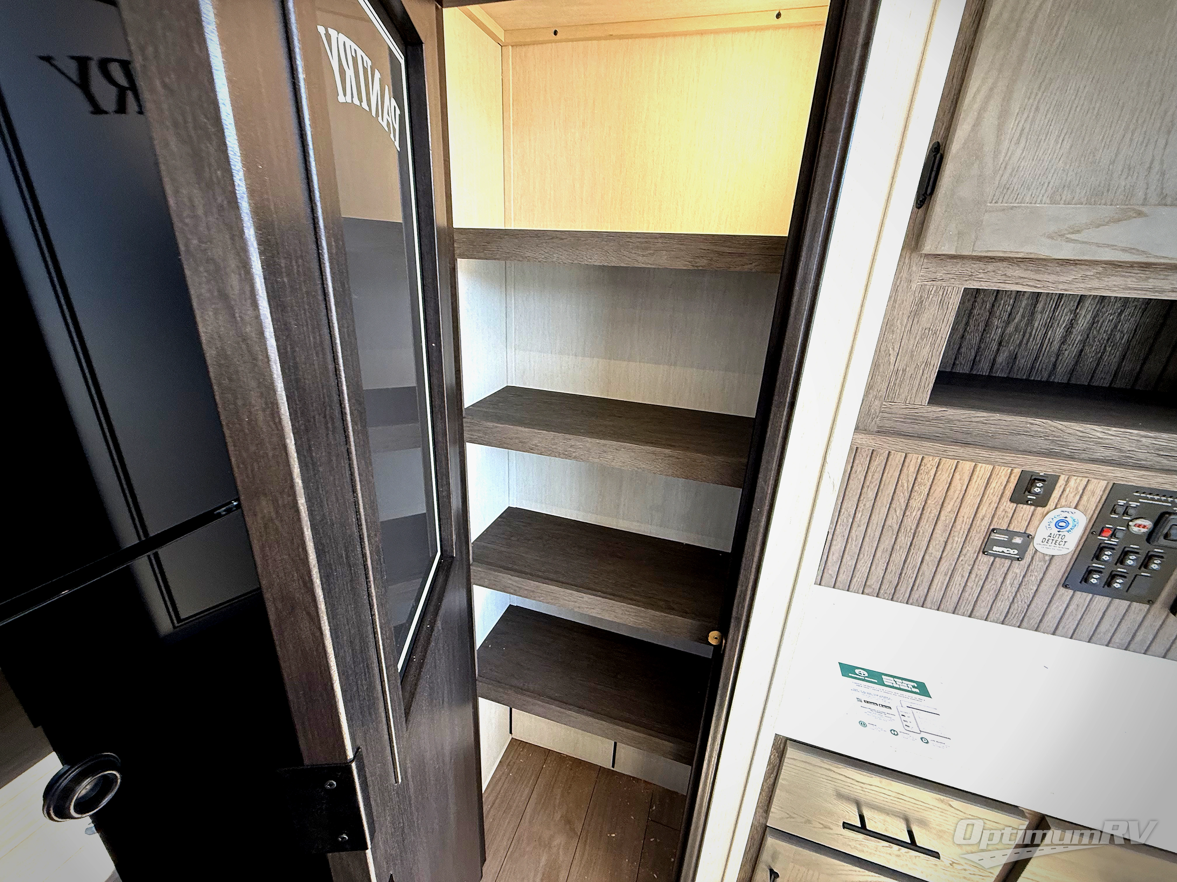 This thoughtfully arranged floorplan is built for extended stays and easy daily living. The rear lounge centers around an L-shaped sectional facing the entertainment wall and fireplace, with a nearby desk for work or hobbies. The kitchen’s island anchors a generous prep area, oversized pantry, and full cooking suite, so meals are simple whether you’re weekending or full-timing. Mid-coach, the guest half bath is convenient for all. Up front, the private bedroom’s king bed slide connects to a spa-style bath with large shower and dressing space, plus a substantial wardrobe to keep clutter out of sight. Outside, enjoy the campsite under dual power awnings that stretch along the patio side.