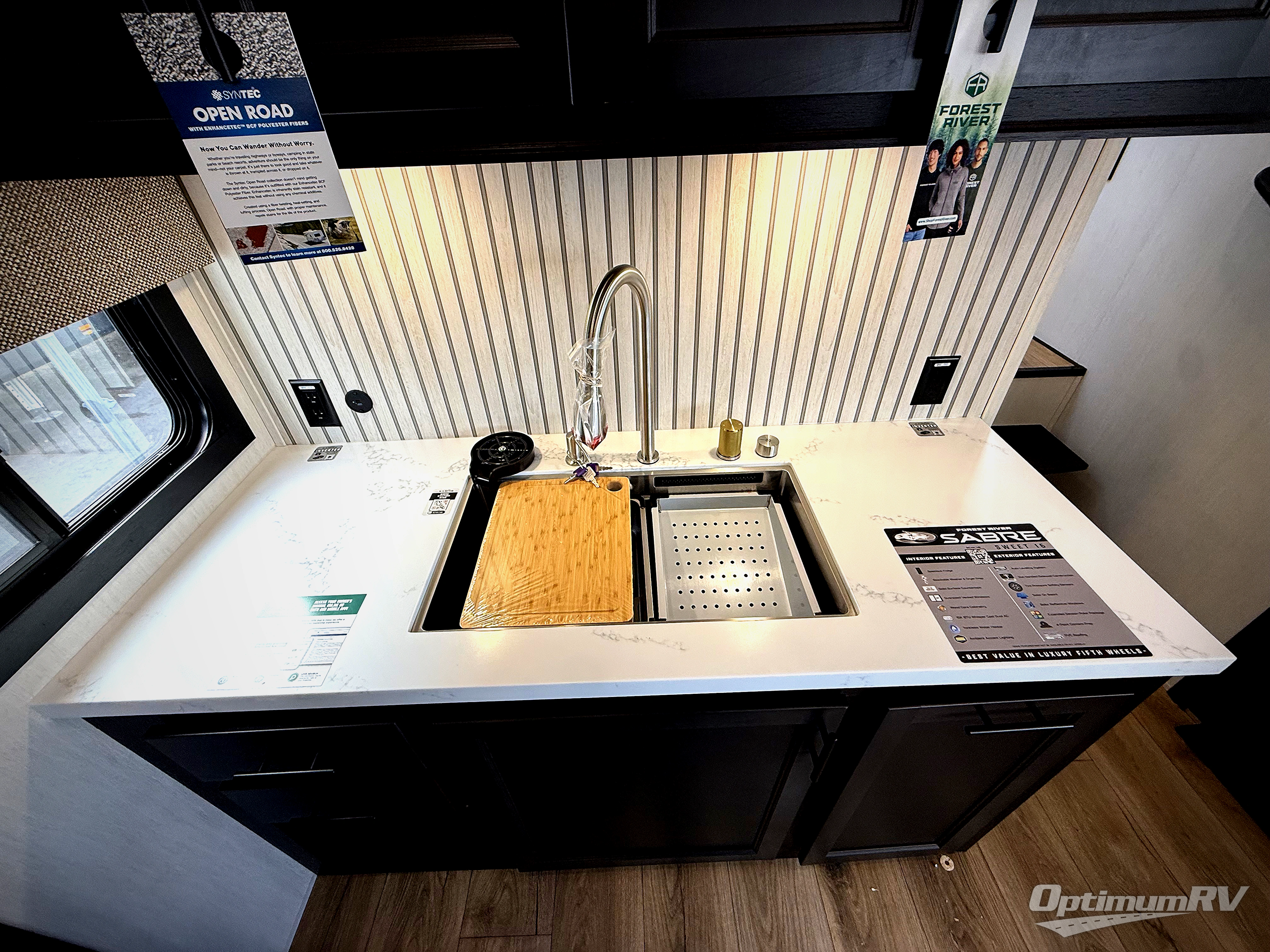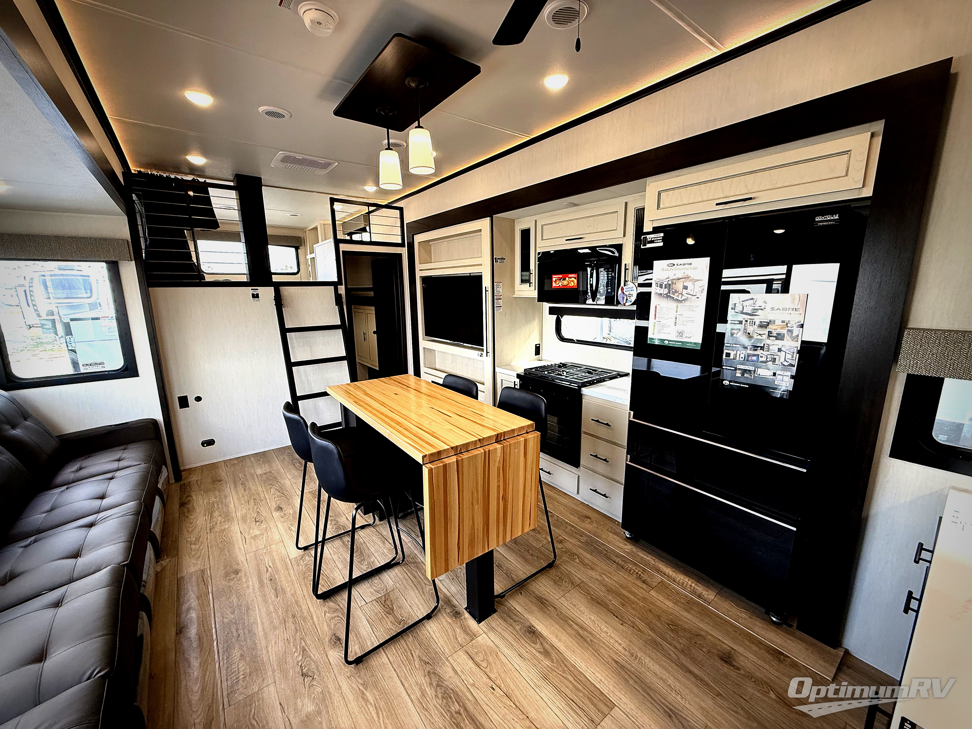 You will experience luxurious camping trips at an affordable price with any one of these Forest River Cherokee Sabre fifth wheels! These models are durable and ready to travel anytime of the year thanks to features like the high-gloss gel-coat front cap with LED lighting, the PVC roof membrane, and the forced air underbelly with enclosed gate valves. The electric auto-leveling system makes setting up easy and safe, and the adjustable power awning with LED lighting will create an inviting outdoor living space. Each model includes a universal docking station which includes a black tank flush and an outside shower, and adjustable stable steps for you to enter and exit the unit safely. Inside, you will love the design of the ambient accent lighting in the living area, the real wood lumbercore cabinetry, and the linoleum flooring!