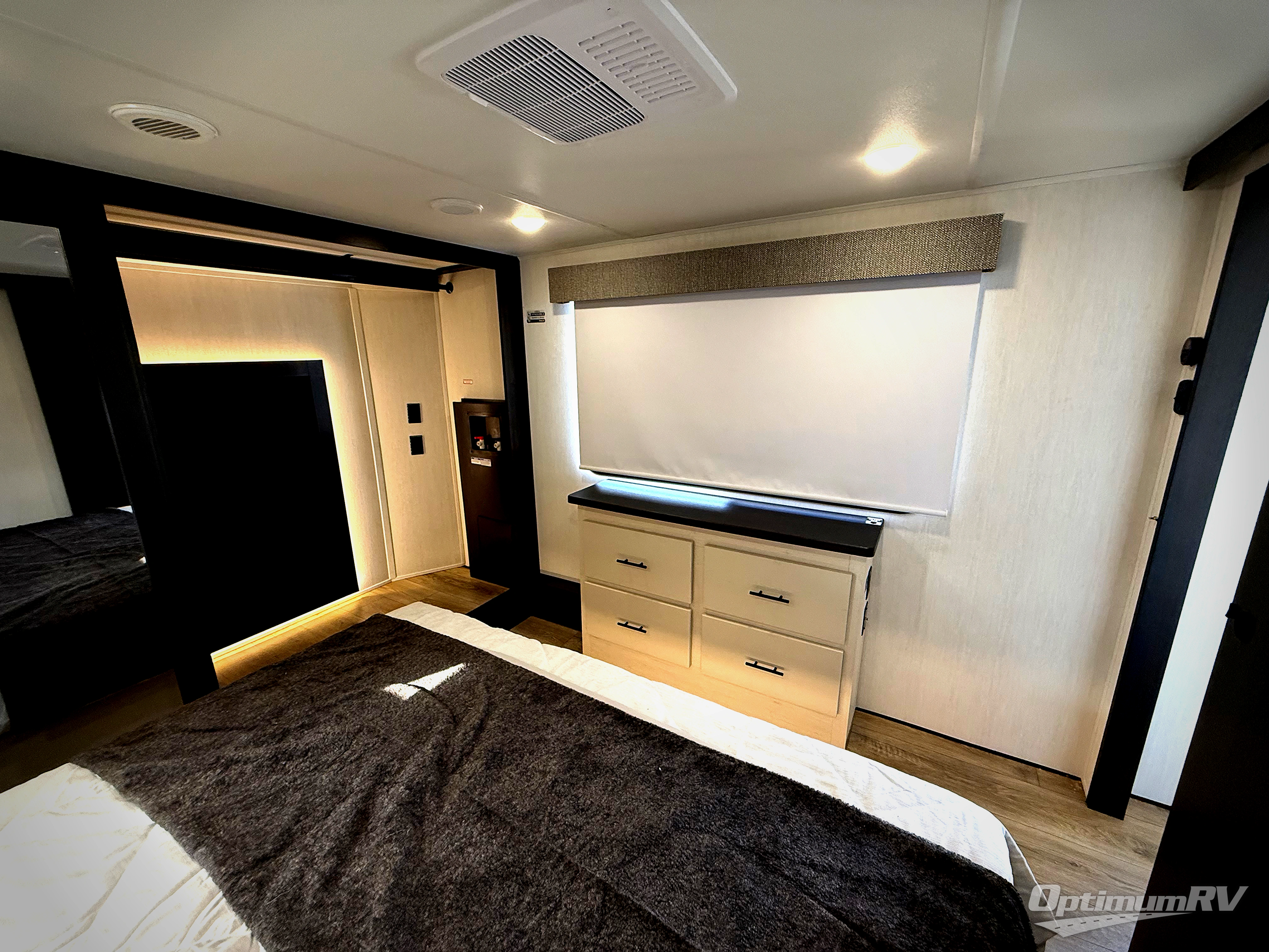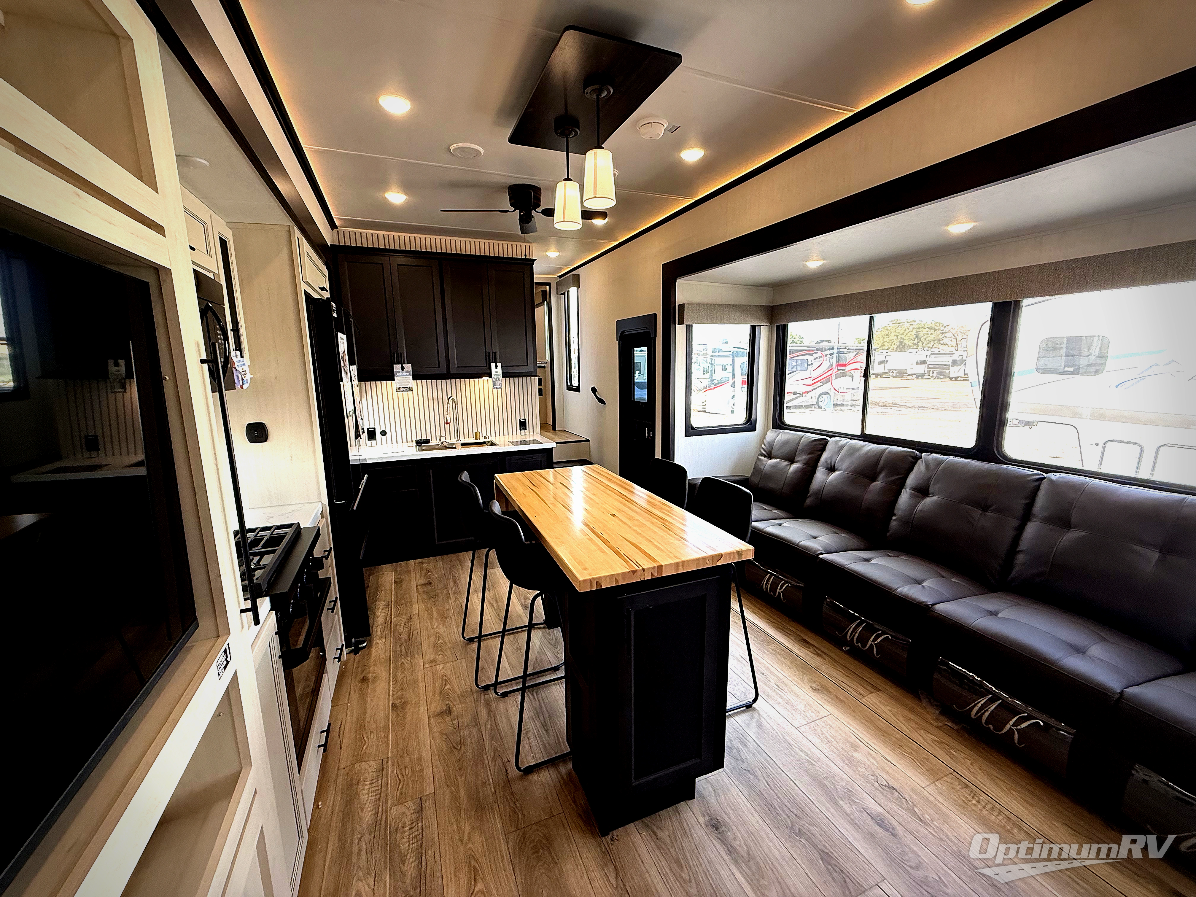 Are you looking for a fifth wheel where you can bring along your neighbor friends? You can do just that since there are two bedrooms in this unit, one of which includes a master bath with its own exterior entry door! The front bedroom is right next to the second full bath for convenience, and includes a camper king bed slide, a dresser, and front wardrobe. The rear master bedroom has a queen bed slide out across from a second slide for more floor space, and there is a loft above this room for more sleeping or storage space. Everyone can meet in the middle kitchen and living room since there are recliners, a ceiling fan, and kitchen island with four chairs. There is also storage below the island for kitchen necessities, and the hidden pantry behind the TV will be perfect for snacks, board games and more!