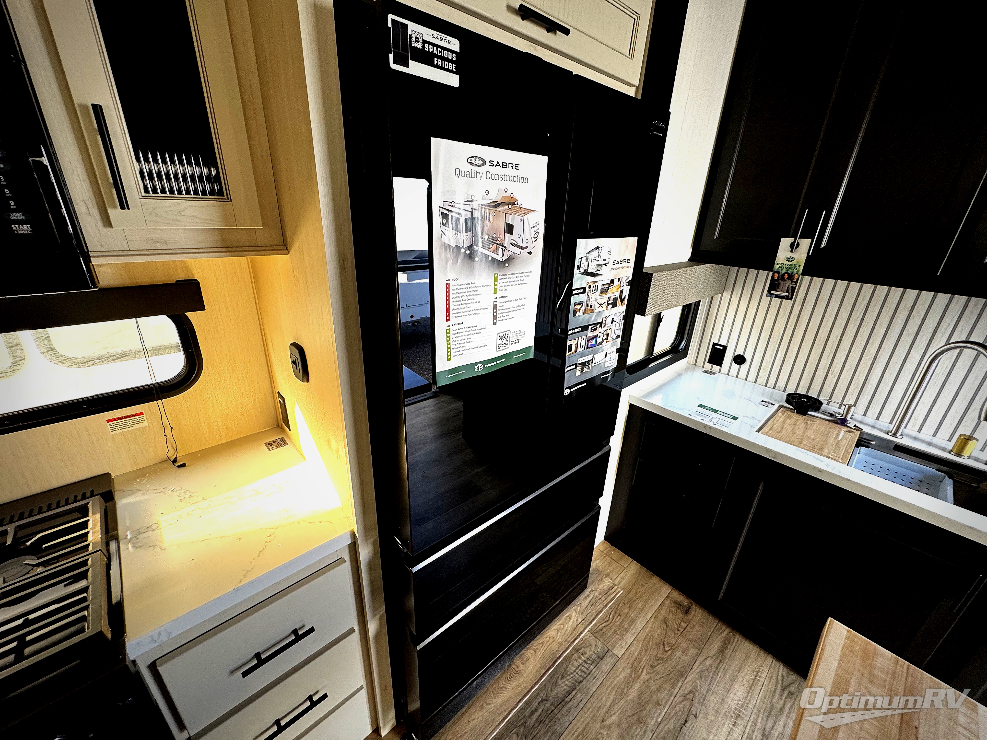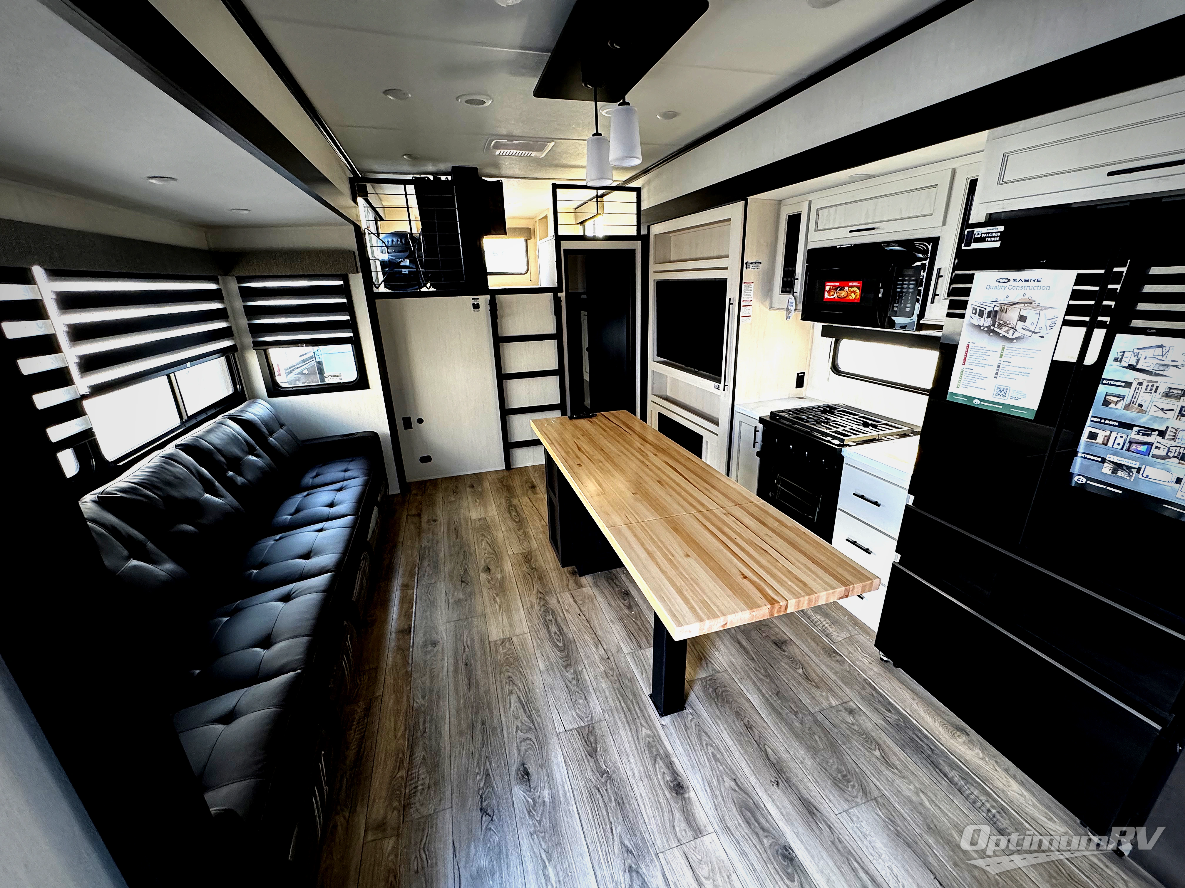 You will experience luxurious camping trips at an affordable price with any one of these Forest River Cherokee Sabre fifth wheels! These models are durable and ready to travel anytime of the year thanks to features like the high-gloss gel-coat front cap with LED lighting, the PVC roof membrane, and the forced air underbelly with enclosed gate valves. The electric auto-leveling system makes setting up easy and safe, and the adjustable power awning with LED lighting will create an inviting outdoor living space. Each model includes a universal docking station which includes a black tank flush and an outside shower, and adjustable stable steps for you to enter and exit the unit safely. Inside, you will love the design of the ambient accent lighting in the living area, the real wood lumbercore cabinetry, and the linoleum flooring!