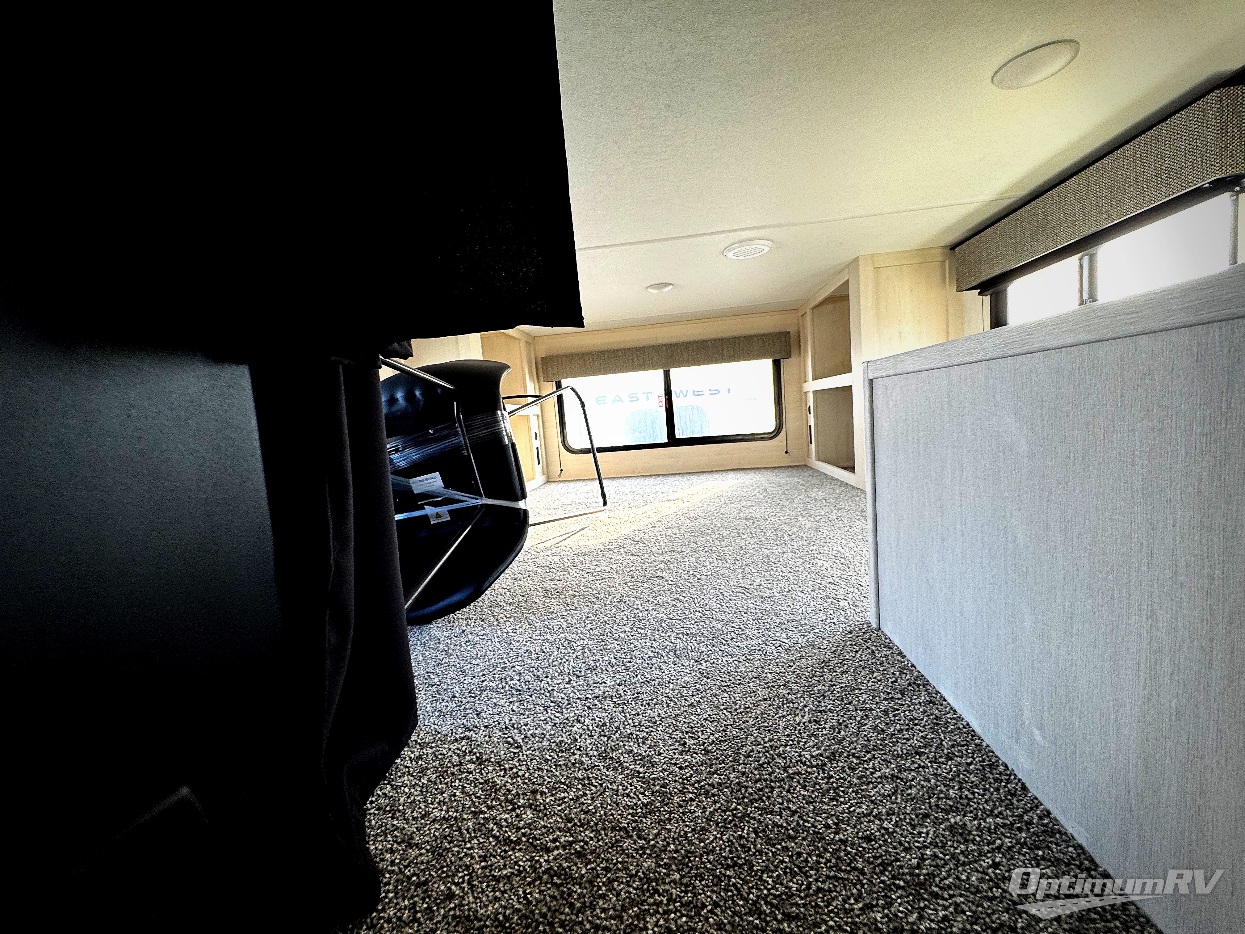 Are you looking for a fifth wheel where you can bring along your neighbor friends? You can do just that since there are two bedrooms in this unit, one of which includes a master bath with its own exterior entry door! The front bedroom is right next to the second full bath for convenience, and includes a camper king bed slide, a dresser, and front wardrobe. The rear master bedroom has a queen bed slide out across from a second slide for more floor space, and there is a loft above this room for more sleeping or storage space. Everyone can meet in the middle kitchen and living room since there are recliners, a ceiling fan, and kitchen island with four chairs. There is also storage below the island for kitchen necessities, and the hidden pantry behind the TV will be perfect for snacks, board games and more!