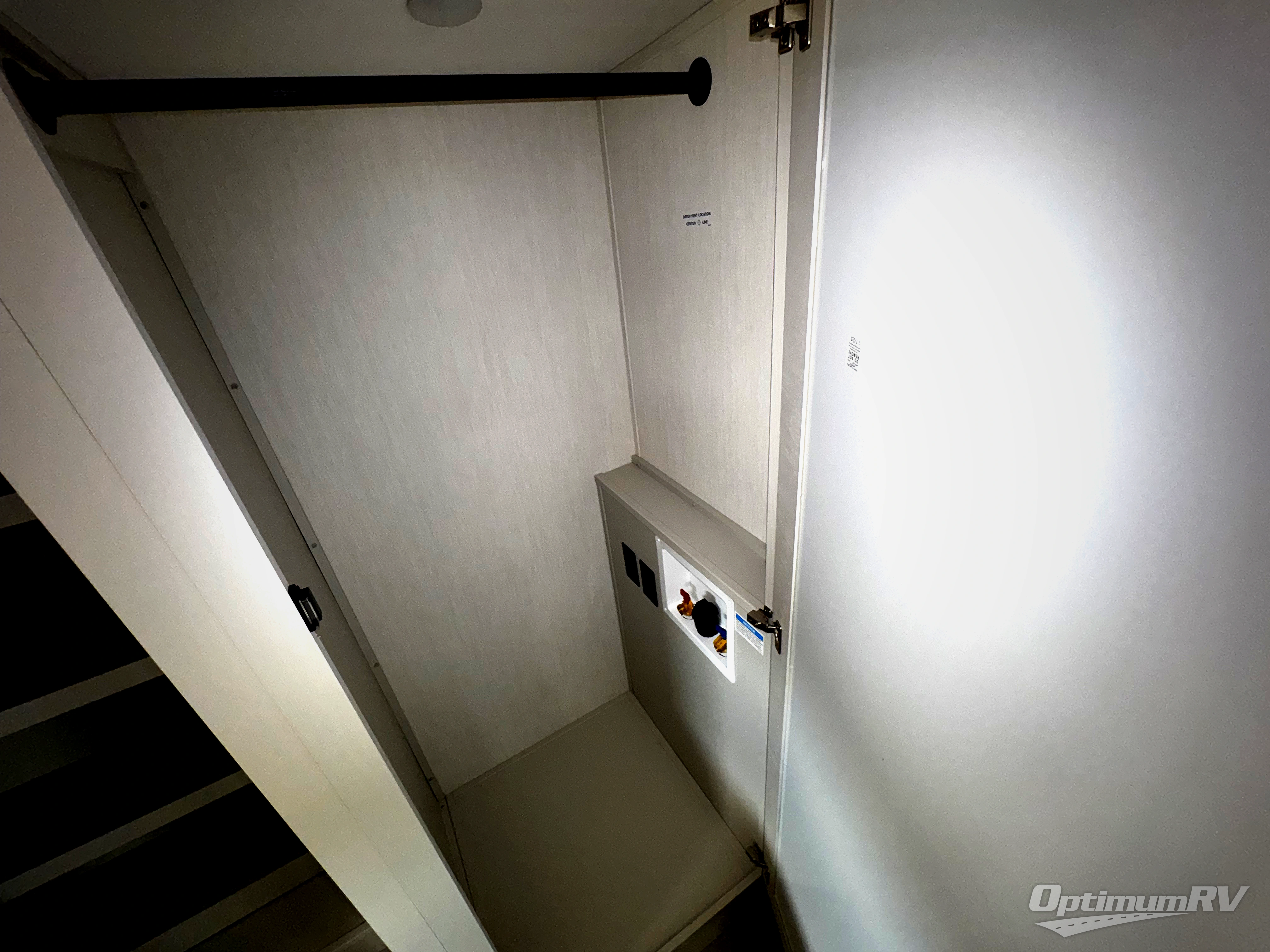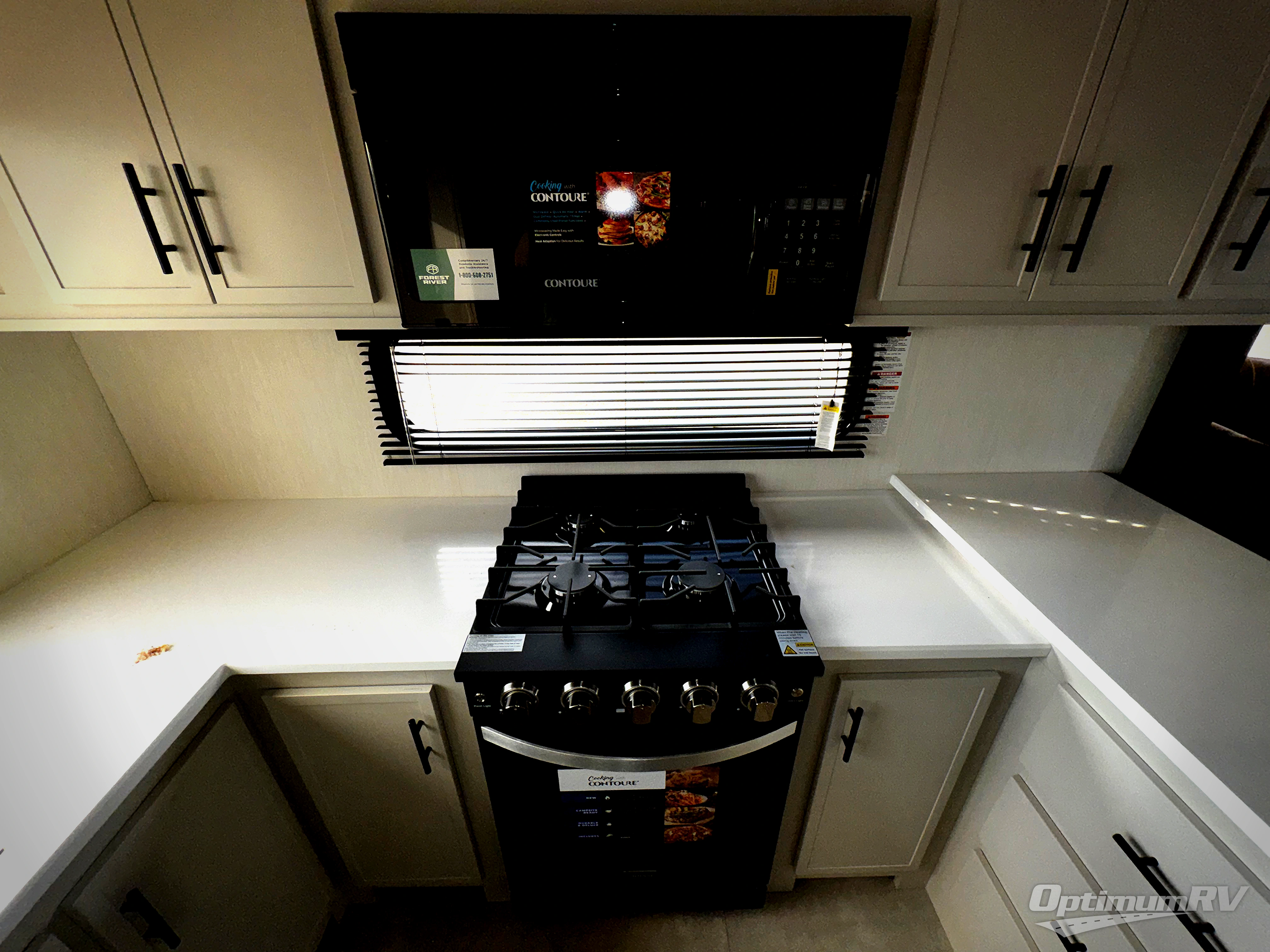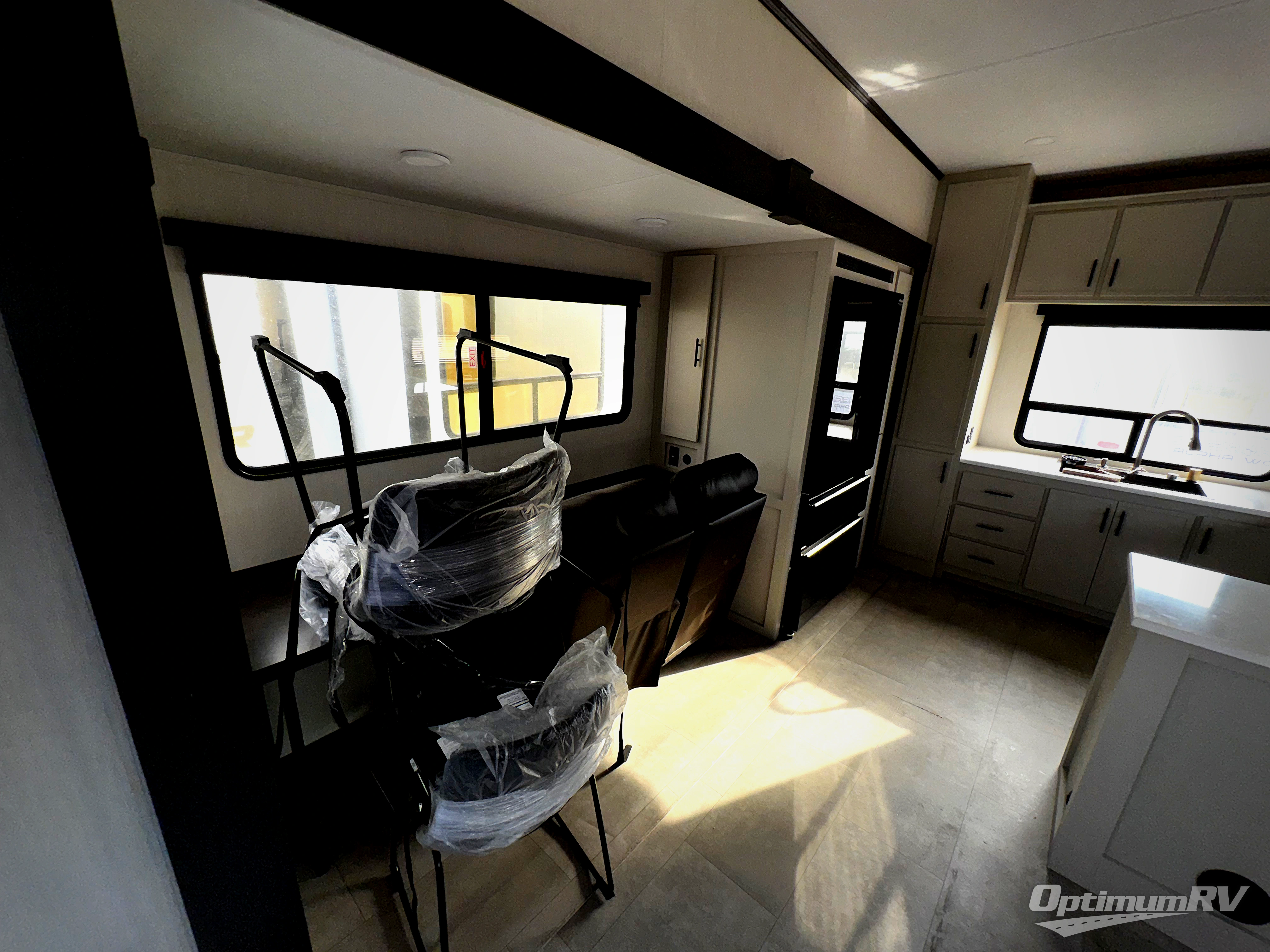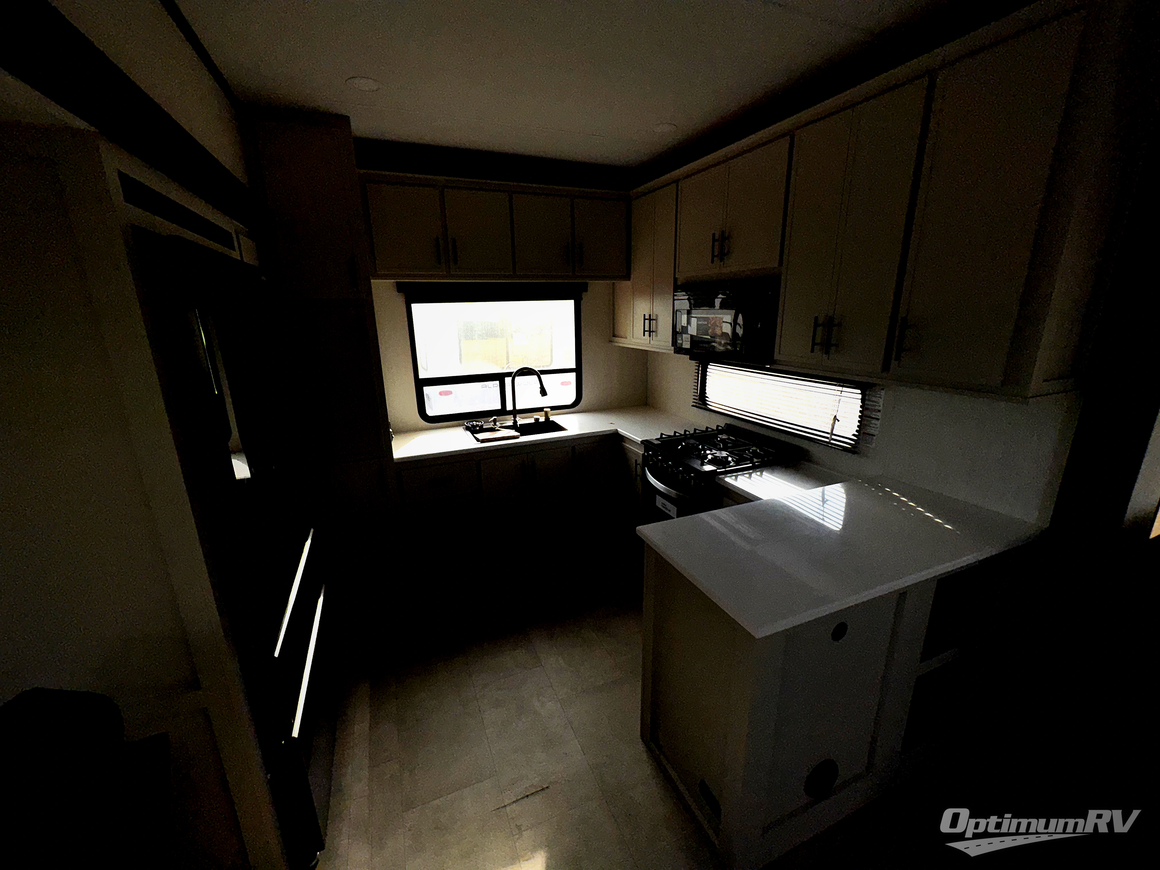 If you enjoy camping with family or friends, this fifth wheel is sure to meet all of your needs! The front bedroom includes a King bed slide out for more space and comfort, plus a front wardrobe/washer and dryer prep. And the full bath is right next door for easy nighttime use. The living room is made spacious thanks to the dual opposing slides, and you'll find a sectional sleeper sofa here, as well as a hybrid desk/dinette, perfect for a quick meal and to catch up with some emails. And don't overlook the rear kitchen with ample counter space, a four burner range, an accessory sink and a French door 12V refrigerator!