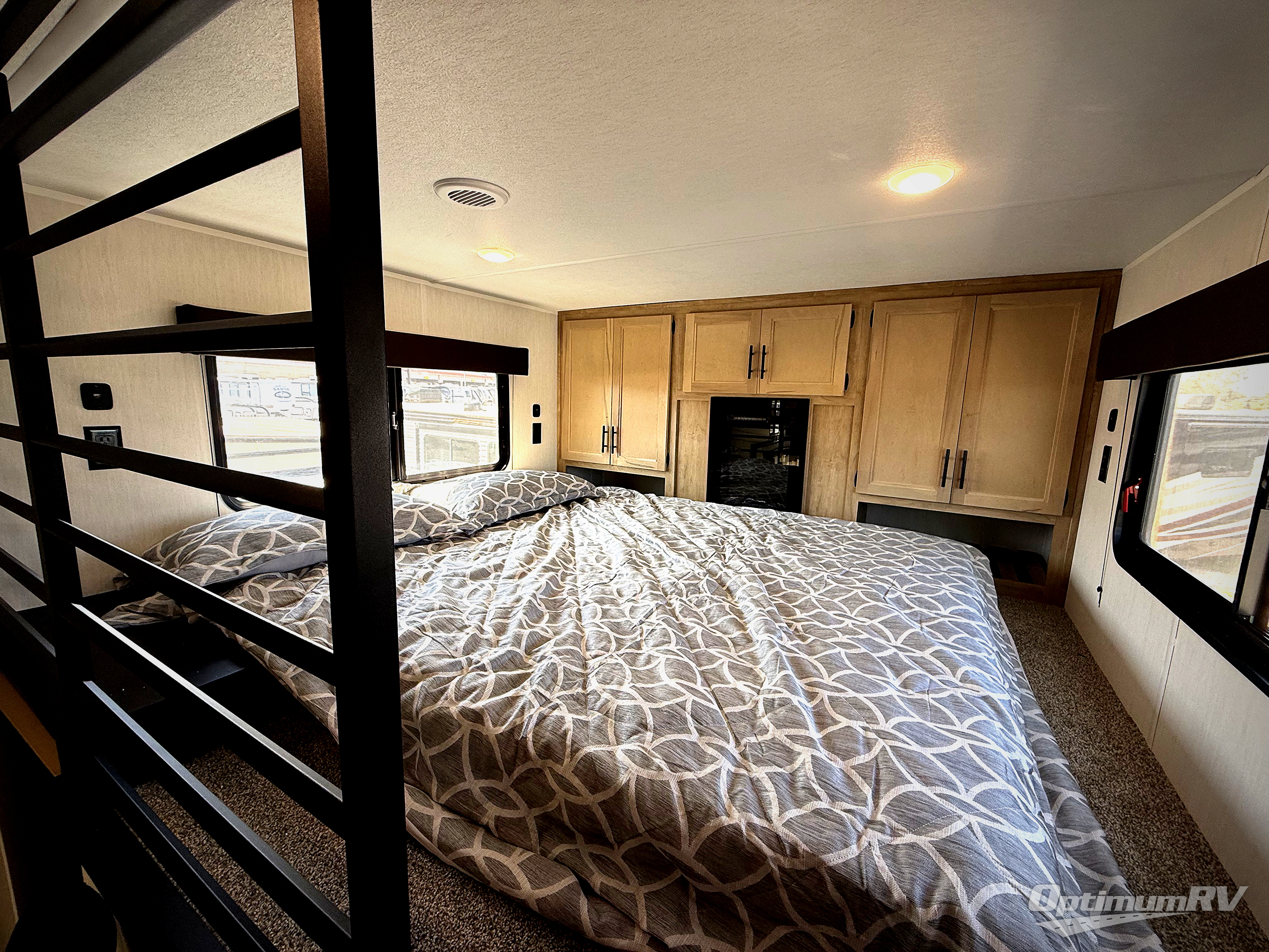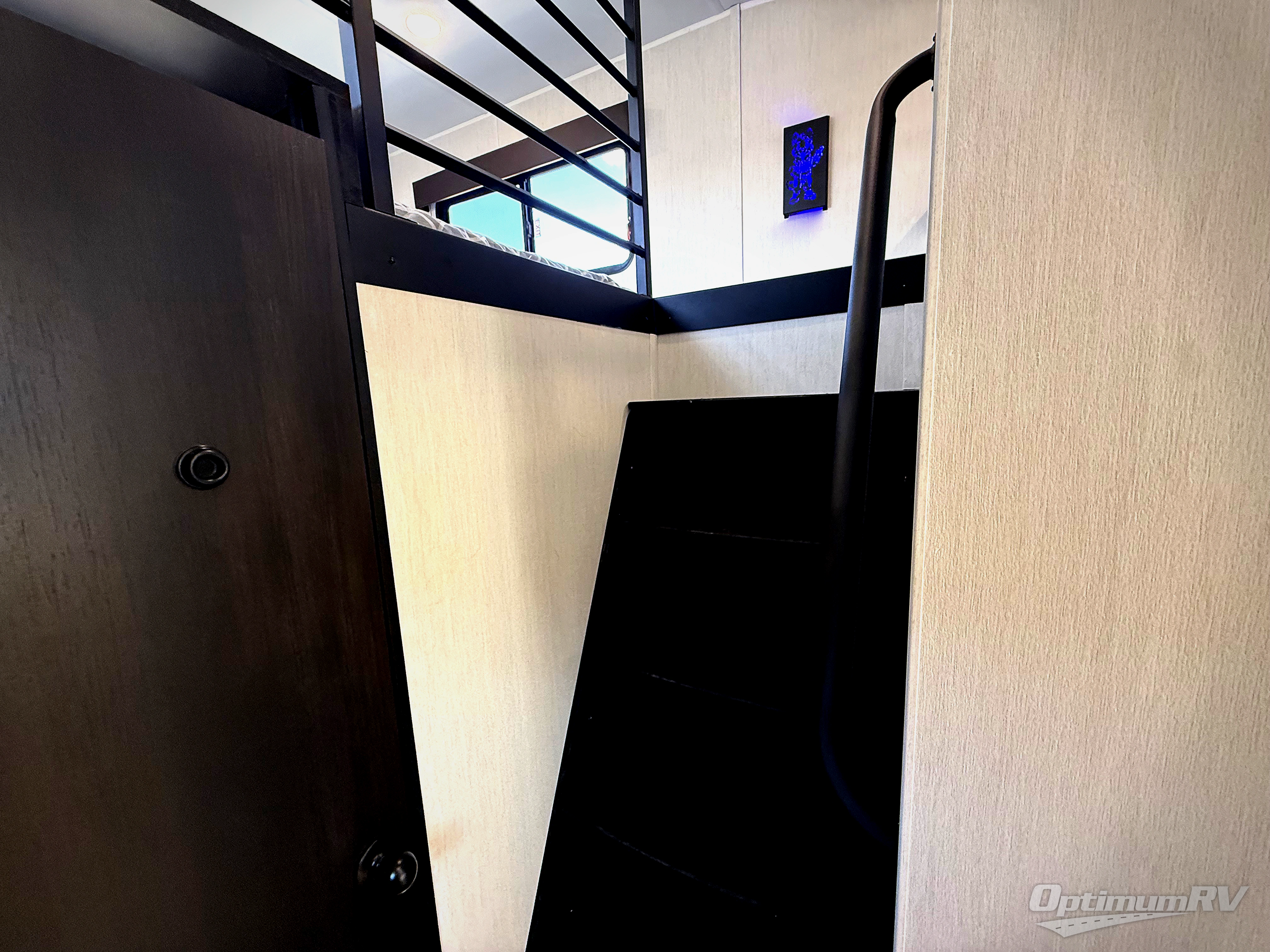You'll feel right at home in this feature-packed destination trailer! The rear private bedroom features one of the dual entry doors, an RV king bed, and a side patio for great outdoor views! There is also a wardrobe with washer/dryer prep if you want the option to add these appliances. Above the bedroom, you'll find a loft with a queen bed, a fireplace and a storage cabinet to keep the space tidy. The chef of your group can whip up their best meals in the middle kitchen, and there is a spacious pantry to keep snacks stocked. Your crew can relax on the L-shaped sofa in the front living room, enjoy the fireplace and TV, or just take in the outdoor views provided by the huge side patio!
