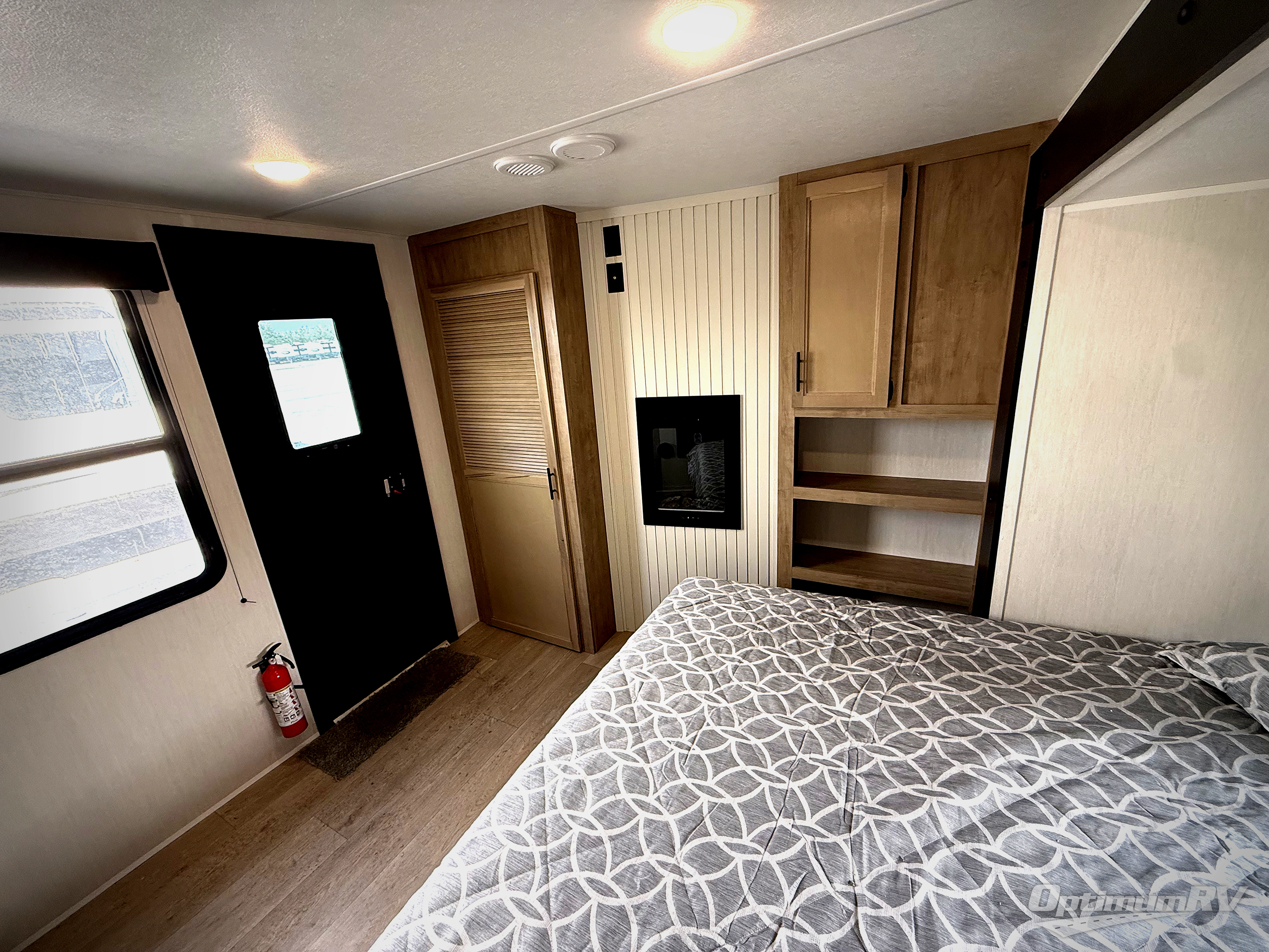 It won't be hard to find comfort in this front kitchen destination trailer! There is ample counter space to prep meals, a free-standing dinette with a slide out, plus a large pantry and 18 cu. ft. refrigerator for food storage. The bar top with stools overlooks the middle living area, where you'll also find dual hide-a-bed sofas and an entertainment center with a fireplace. The full bath includes a shower with a seat for more comfort, and one of the dual entry doors is right across from the bath so you can quickly get back outside. Head up the steps to the dual loft areas with two bunk mats and cabinets on one side, and an open area on the other, perfect for a play room or extra storage! And under the loft you'll find the rear private bedroom with a king bed slide, a wardrobe and an entertainment center, plus washer and dryer prep if you want to add these appliances!