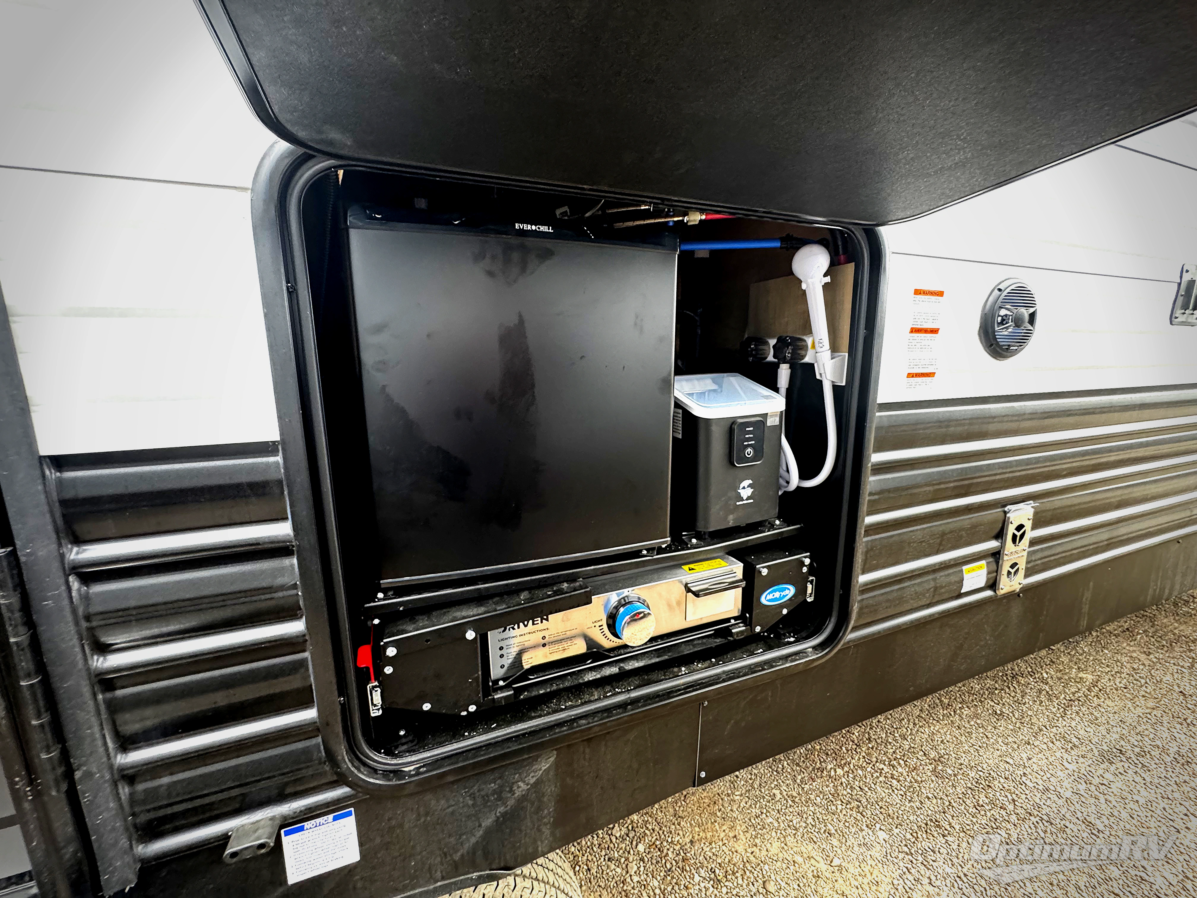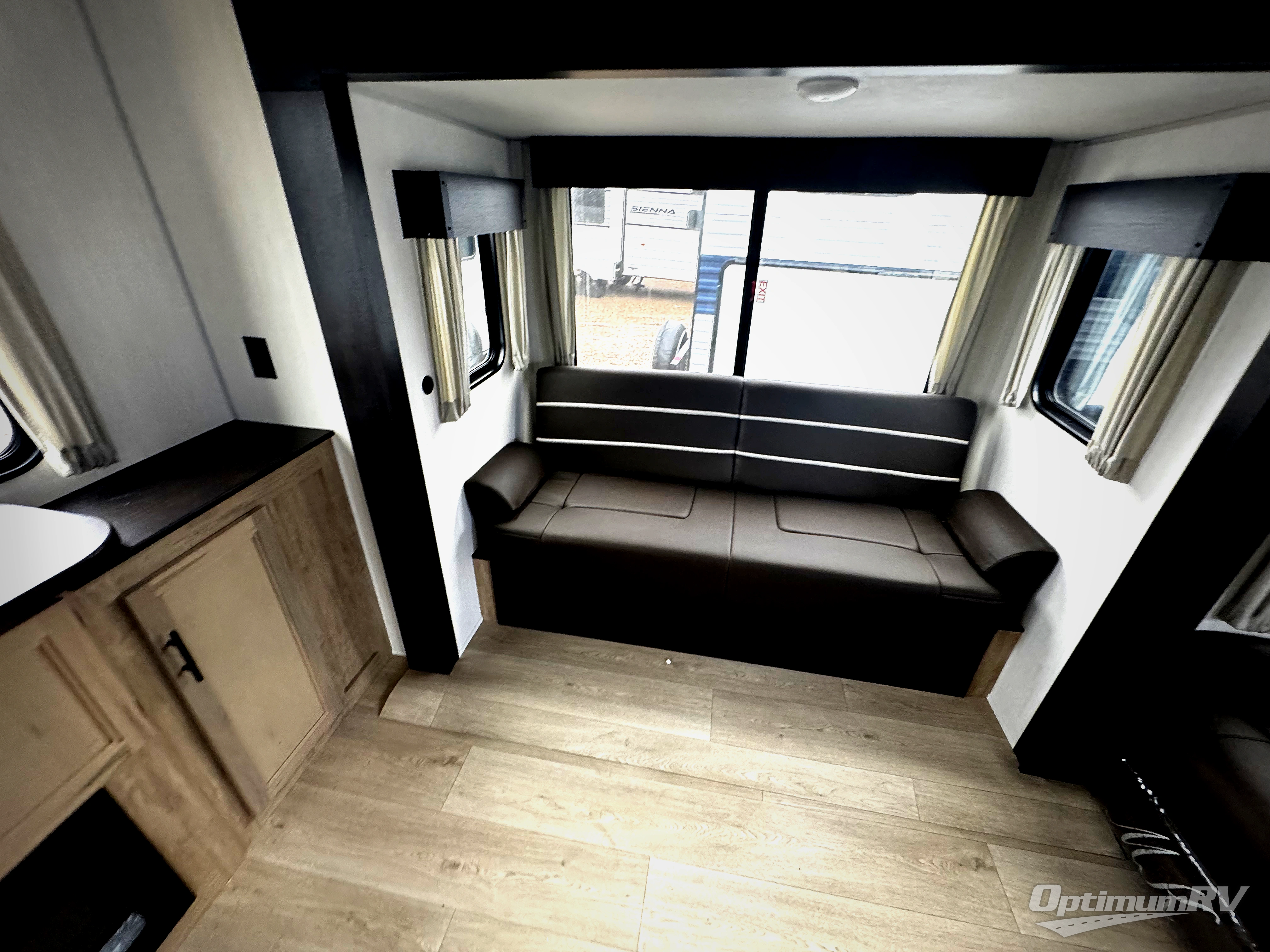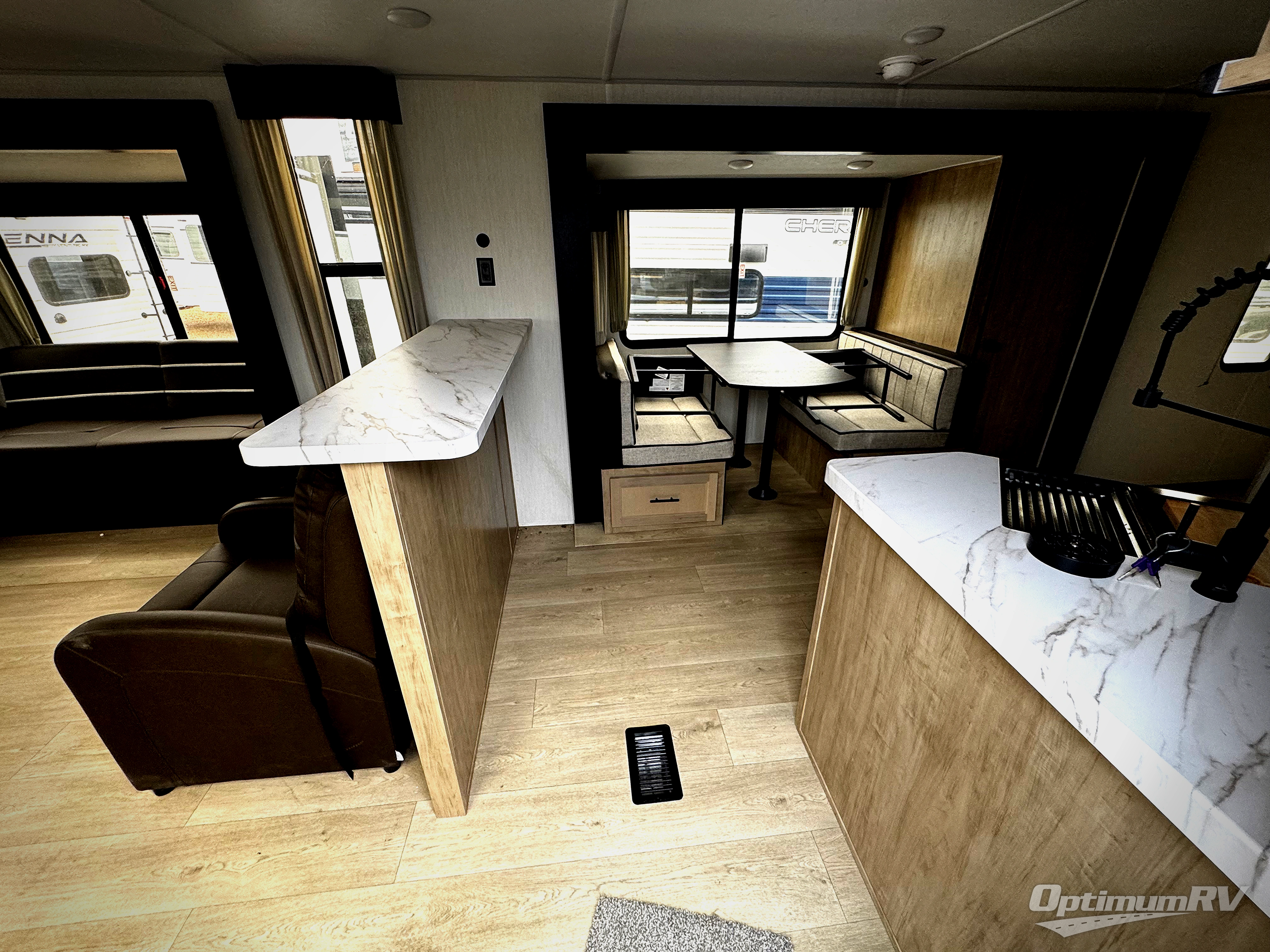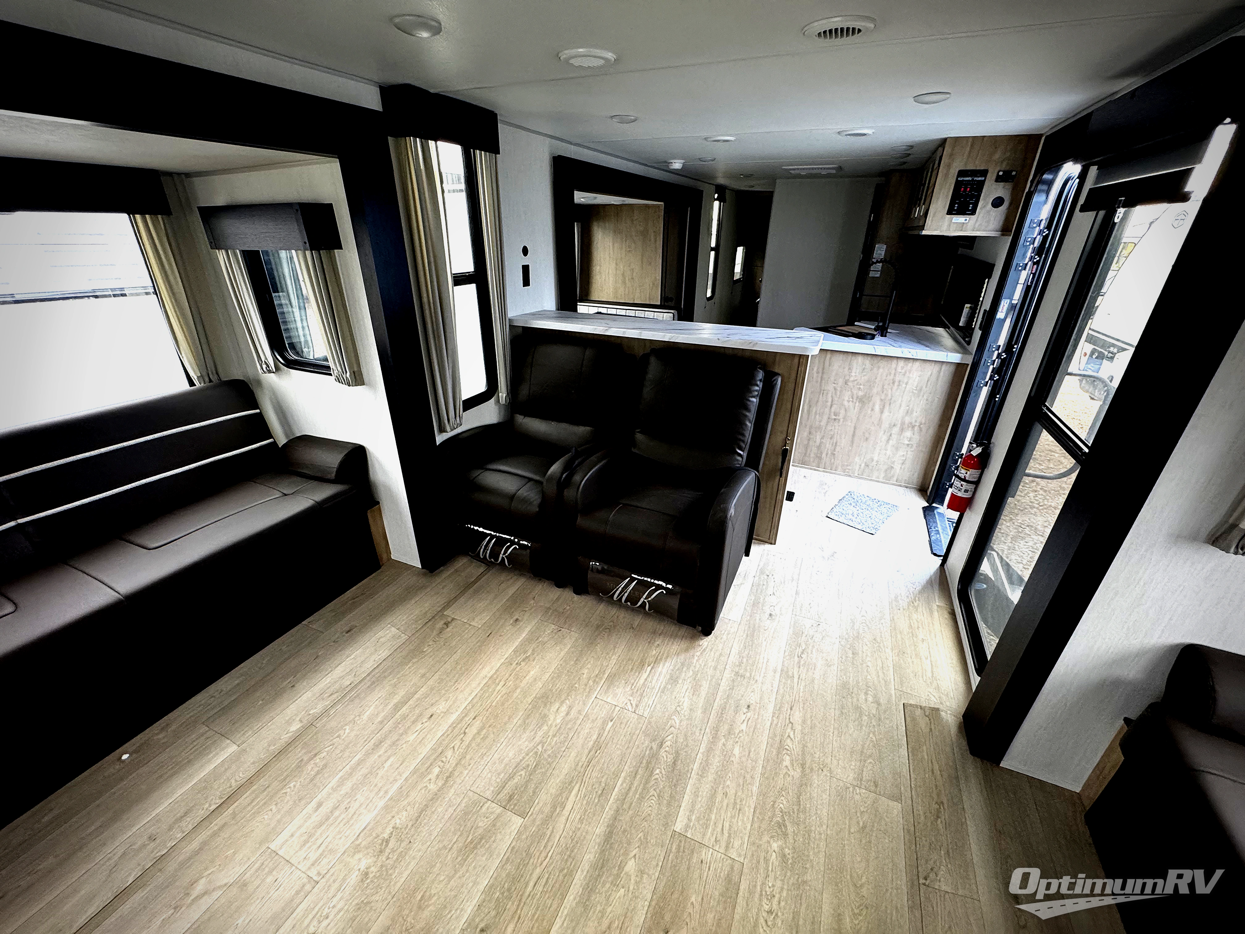 Affordable luxury and livability is what you will find in this travel trailer! The rear living area has opposing sofa slides, two recliners, a rear entertainment center with a fireplace, and a panoramic window for added natural lighting. There is even a bar top with two bar stools overlooking the living area so you can enjoy a meal and a movie. The booth dinette slide has a full door pantry next to it so you can quickly grab a snack during game night. Freshen up each morning in the full bathroom with the shower with a seat. The front private bedroom has a walk around RV king bed for a good night's rest and a linen closet with optional washer and dryer prep. You even have an outside kitchen, a rear storage rack, outside storage areas, and an outside TV mount!
