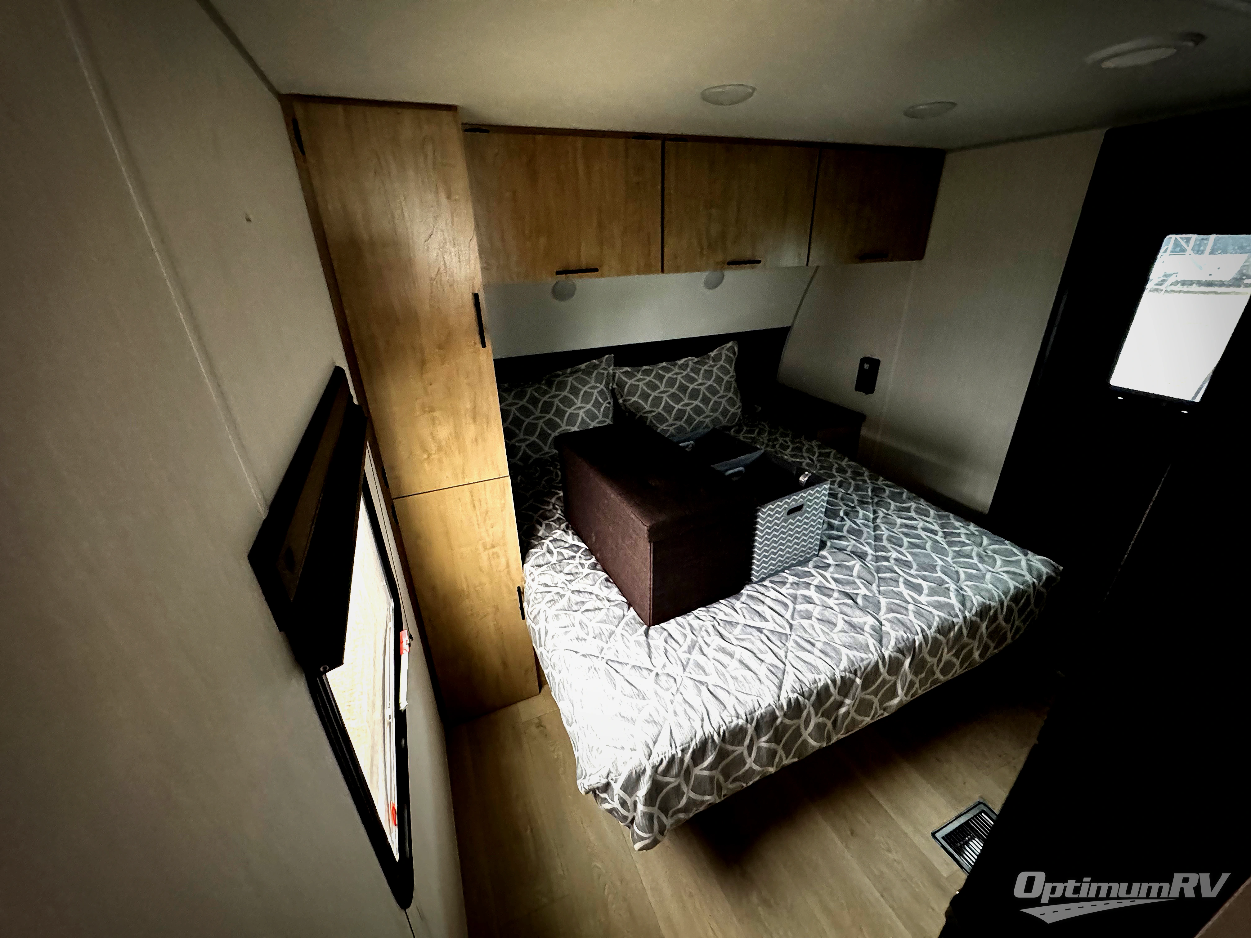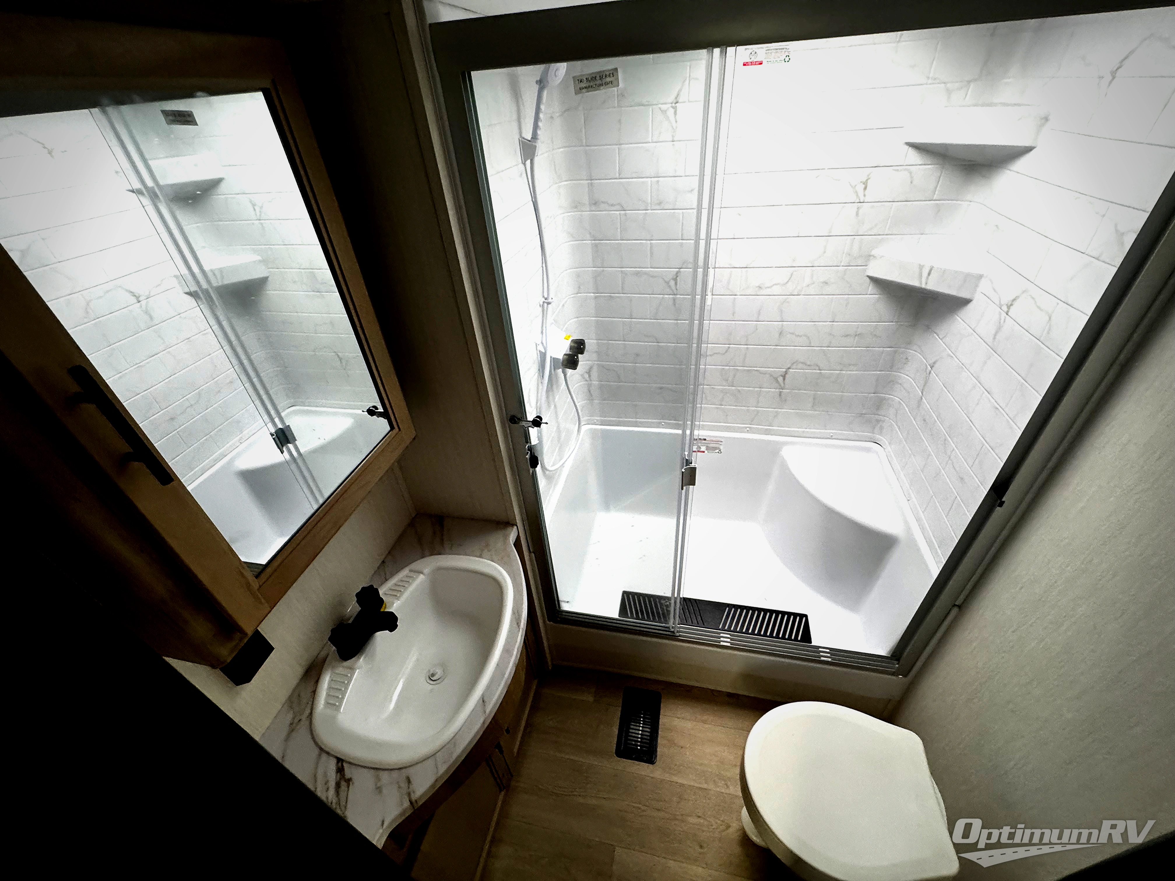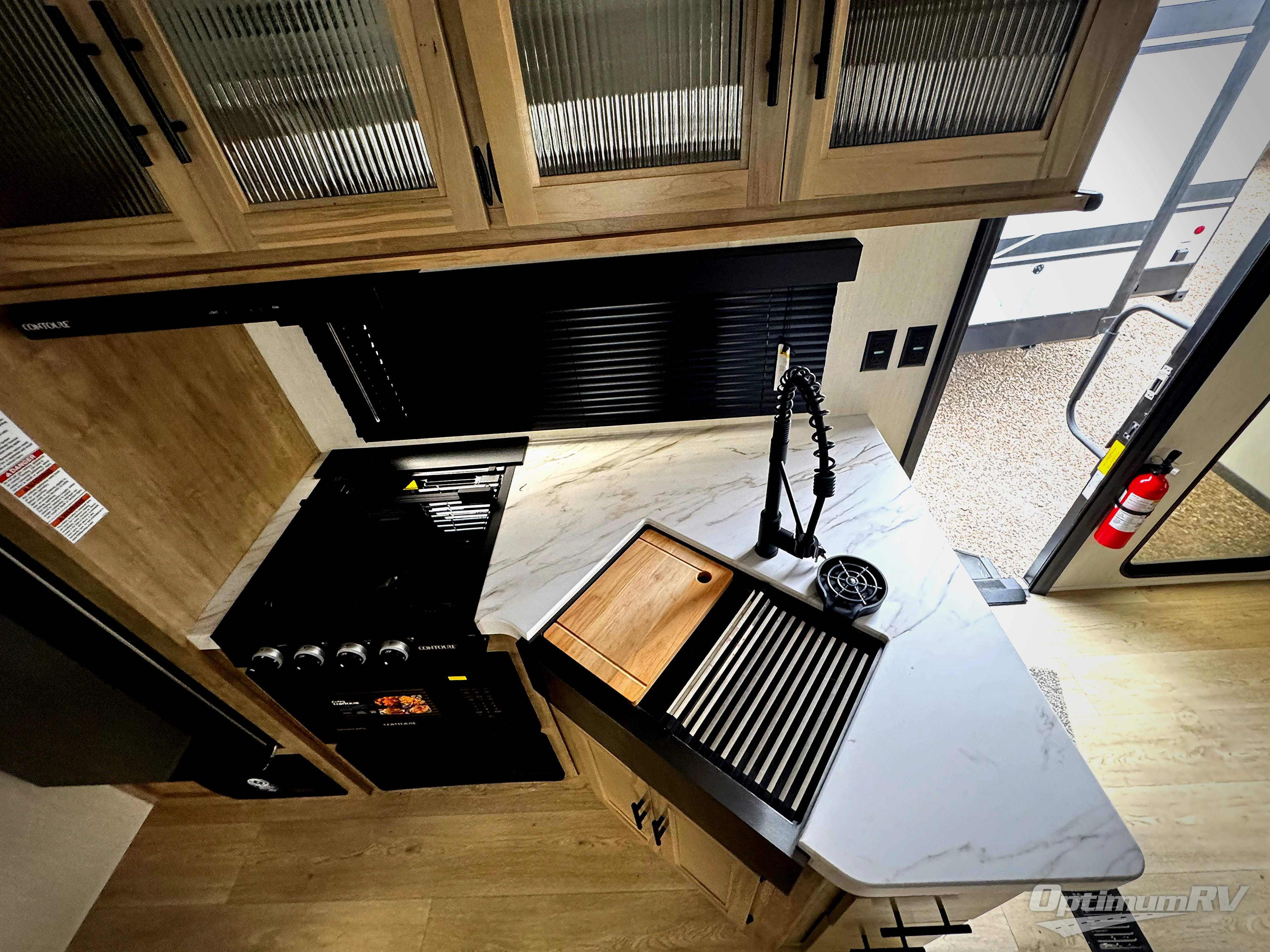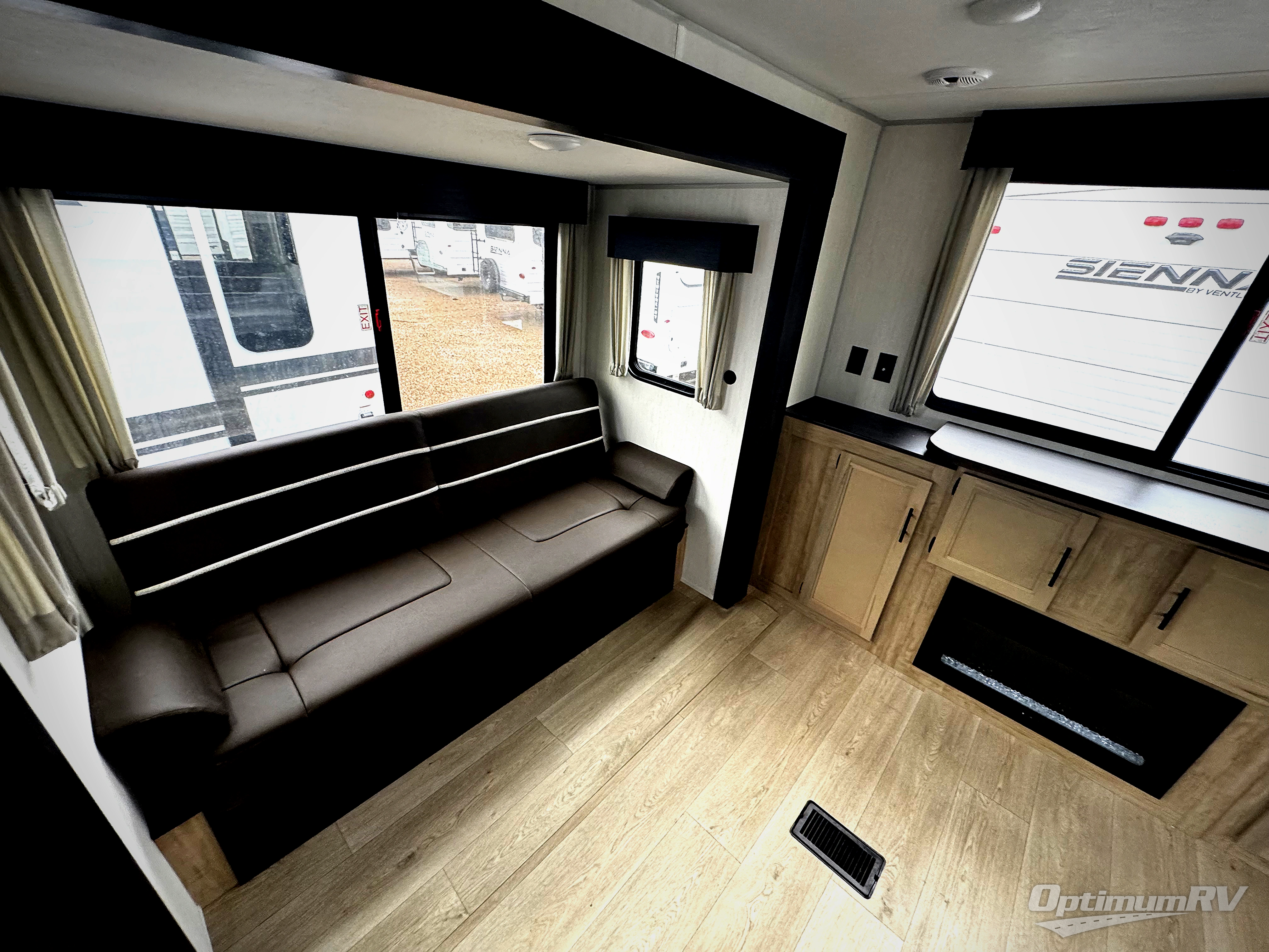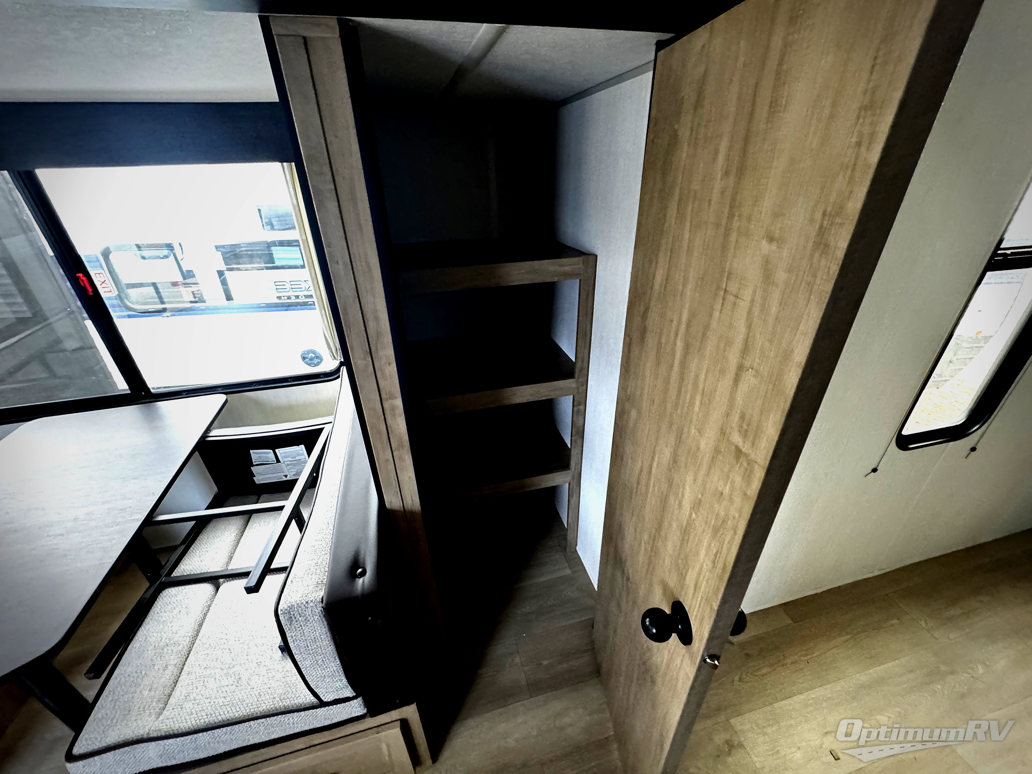 Affordable luxury and livability is what you will find in this travel trailer! The rear living area has opposing sofa slides, two recliners, a rear entertainment center with a fireplace, and a panoramic window for added natural lighting. There is even a bar top with two bar stools overlooking the living area so you can enjoy a meal and a movie. The booth dinette slide has a full door pantry next to it so you can quickly grab a snack during game night. Freshen up each morning in the full bathroom with the shower with a seat. The front private bedroom has a walk around RV king bed for a good night's rest and a linen closet with optional washer and dryer prep. You even have an outside kitchen, a rear storage rack, outside storage areas, and an outside TV mount!