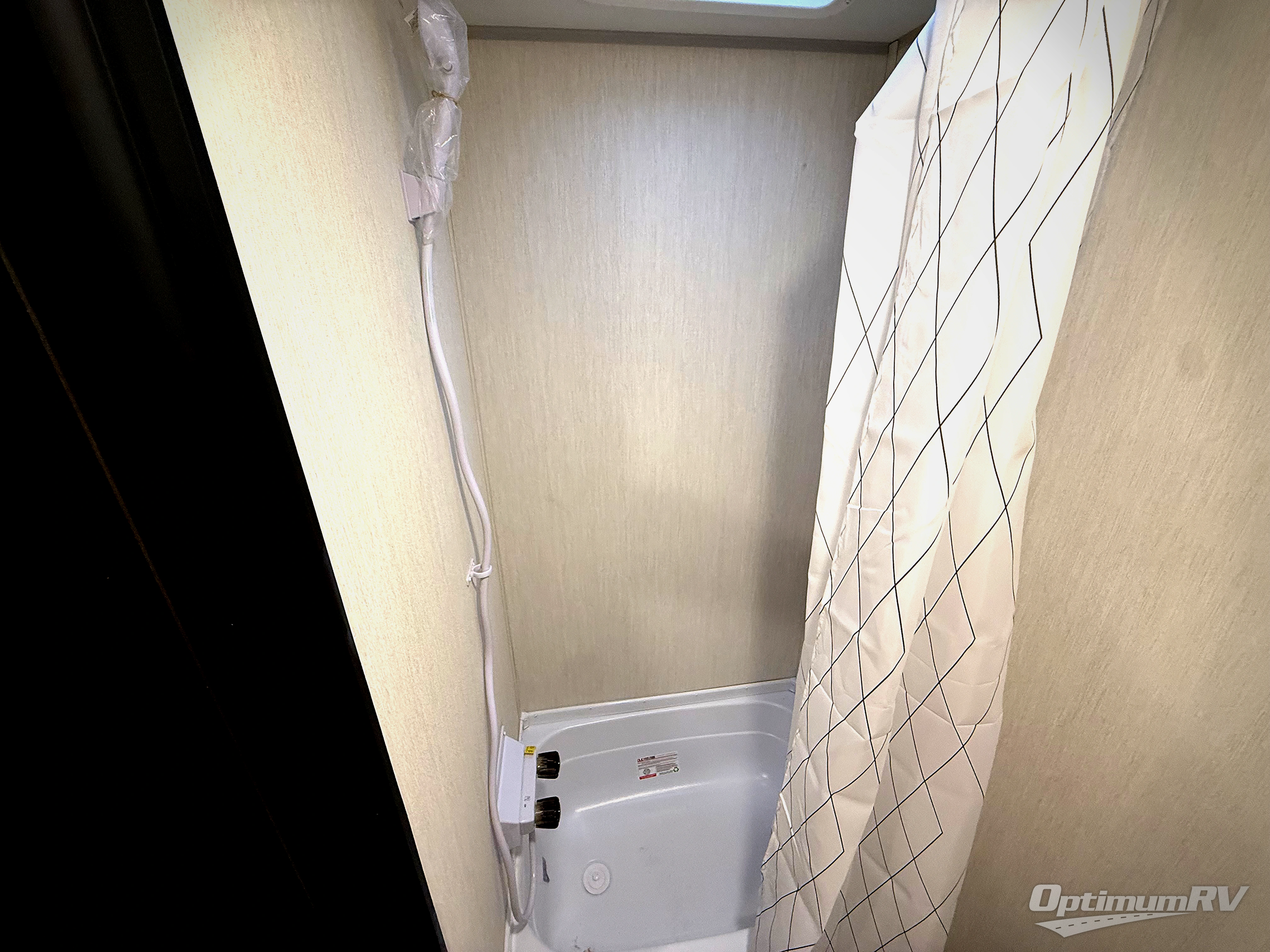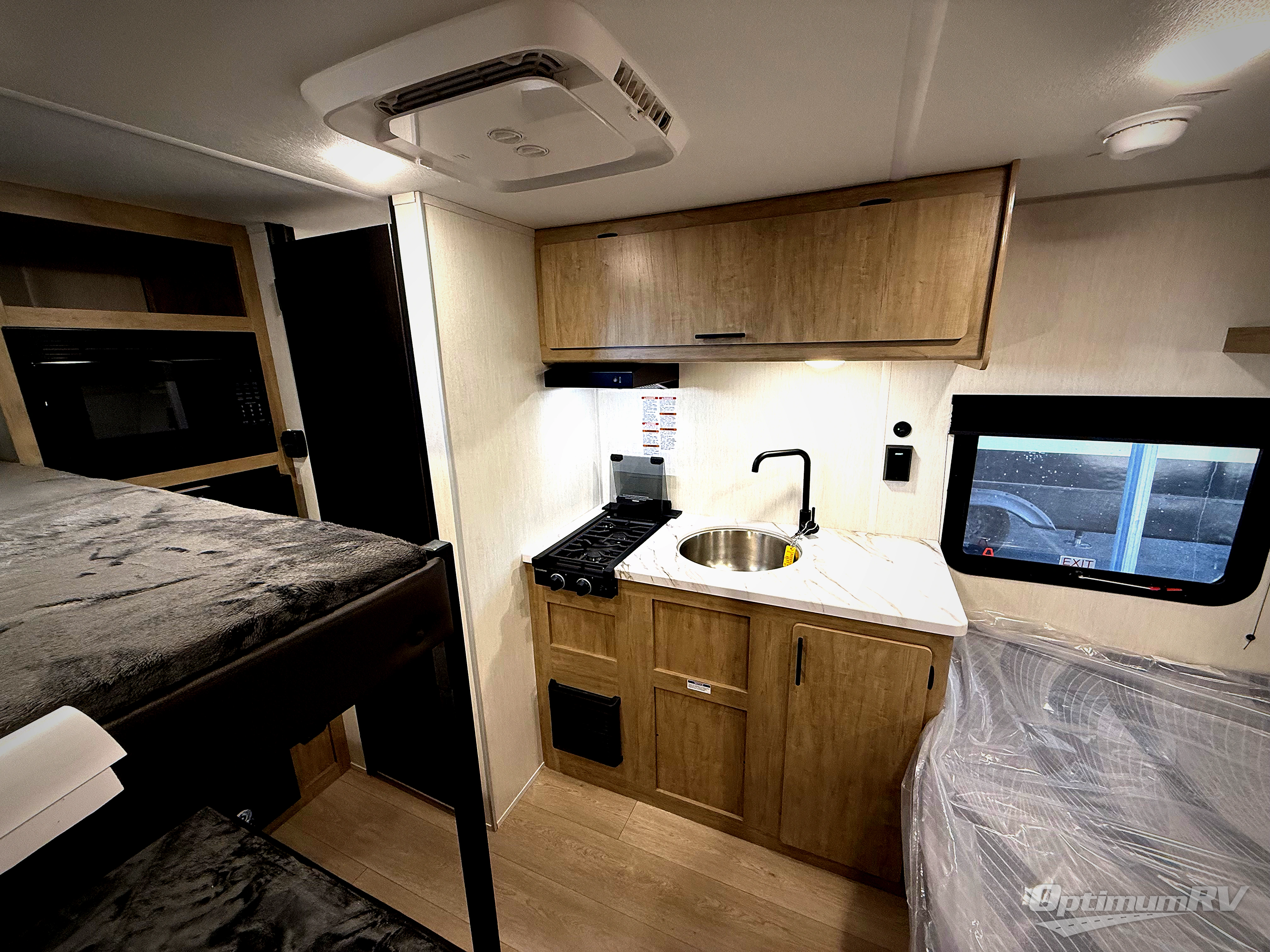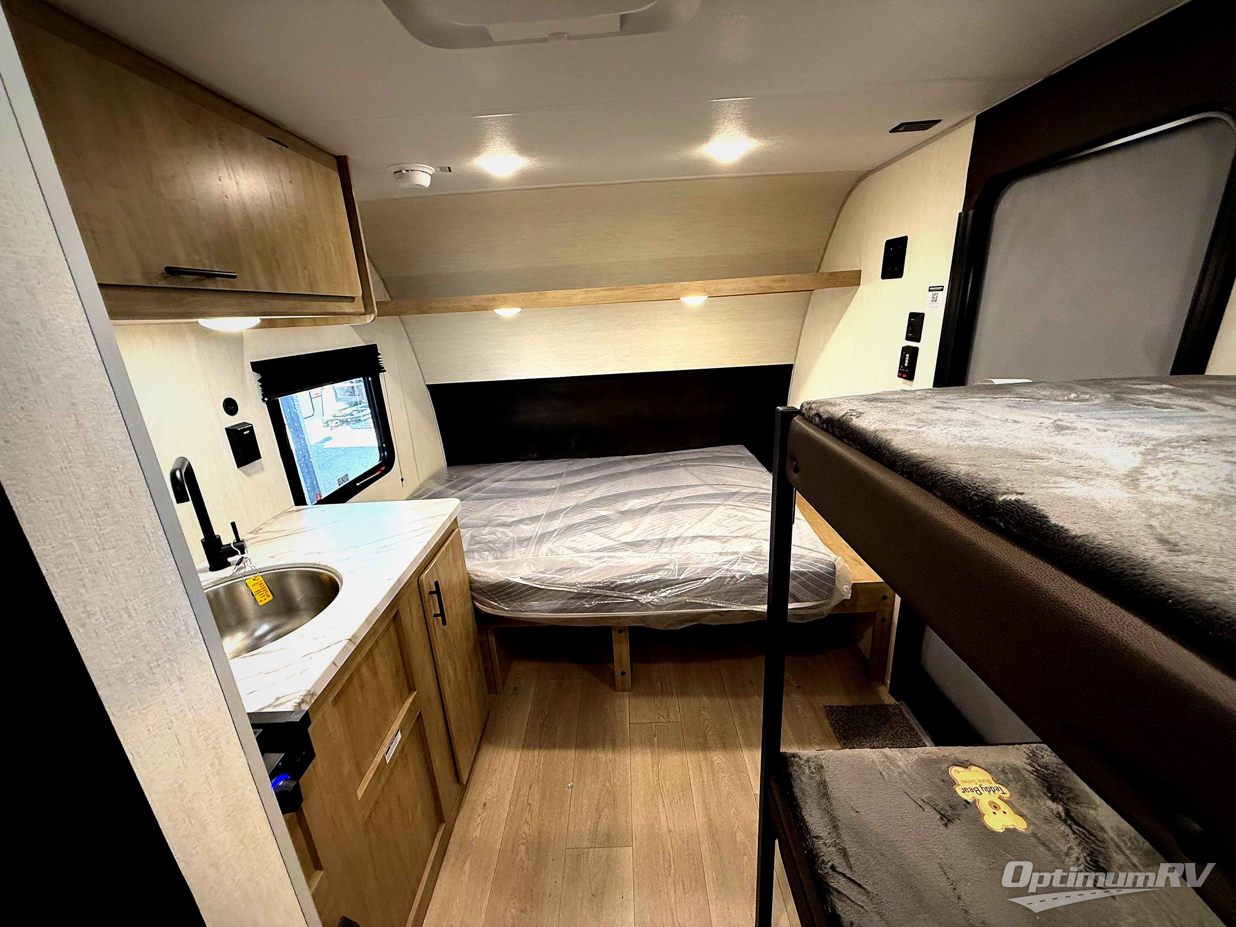 This travel trailer is perfect for epic road trips, memorable camping excursions, or rejuvenating getaways. The private bathroom is equipped with everything you need for a comfortable stay, providing a convenient spot to freshen up after a long day of exploring. The kitchen is equipped with a refrigerator for keeping drinks and ingredients fresh, and a microwave for quick reheating. The bunk beds are a great spot to take a nap or a kid's sleeping space. Overhead cabinets provide additional storage for cookware, dishes, and other essentials. In addition, the queen-sized bed provides a comfortable sleeping space, perfect for relaxing after a long day.