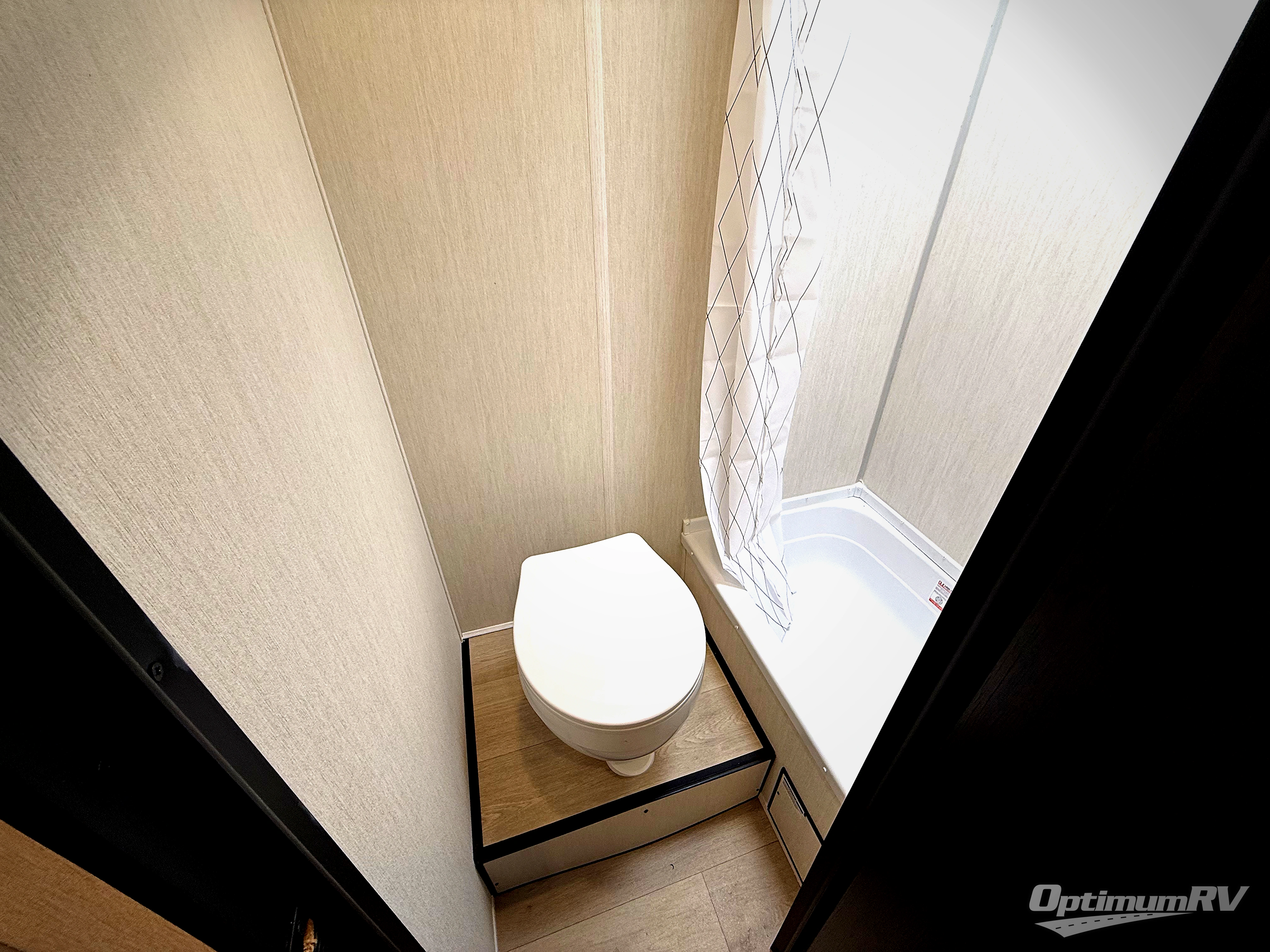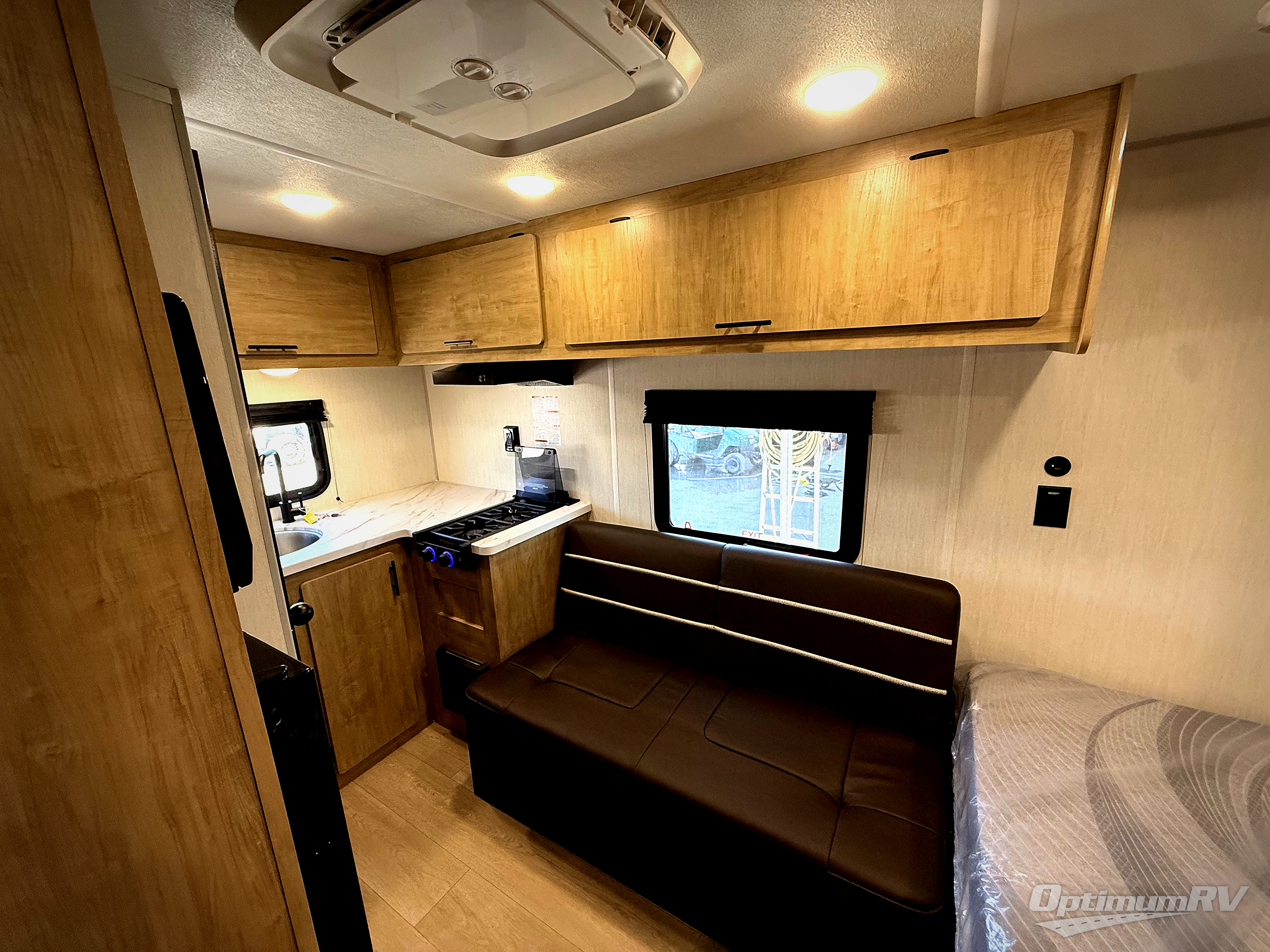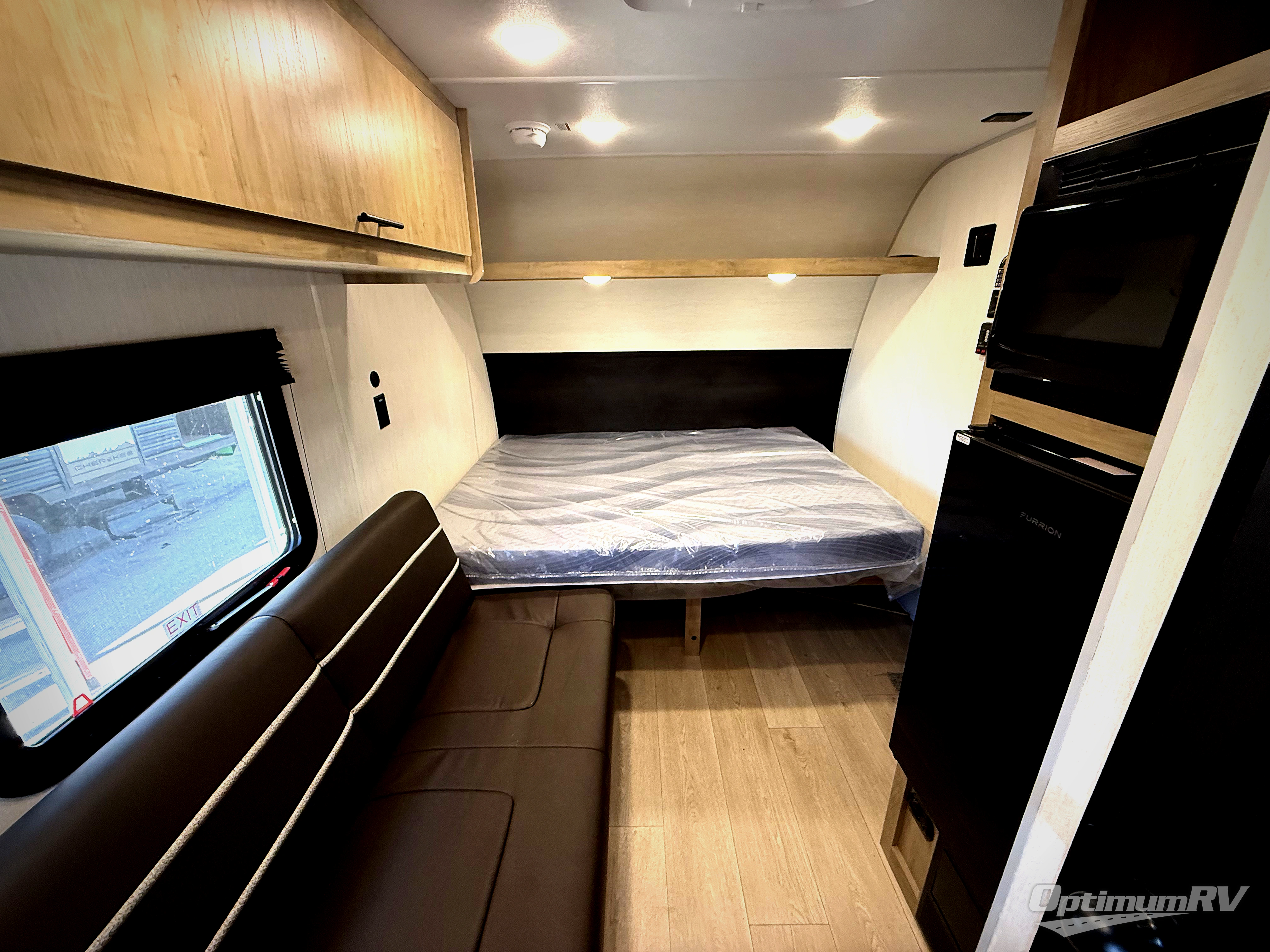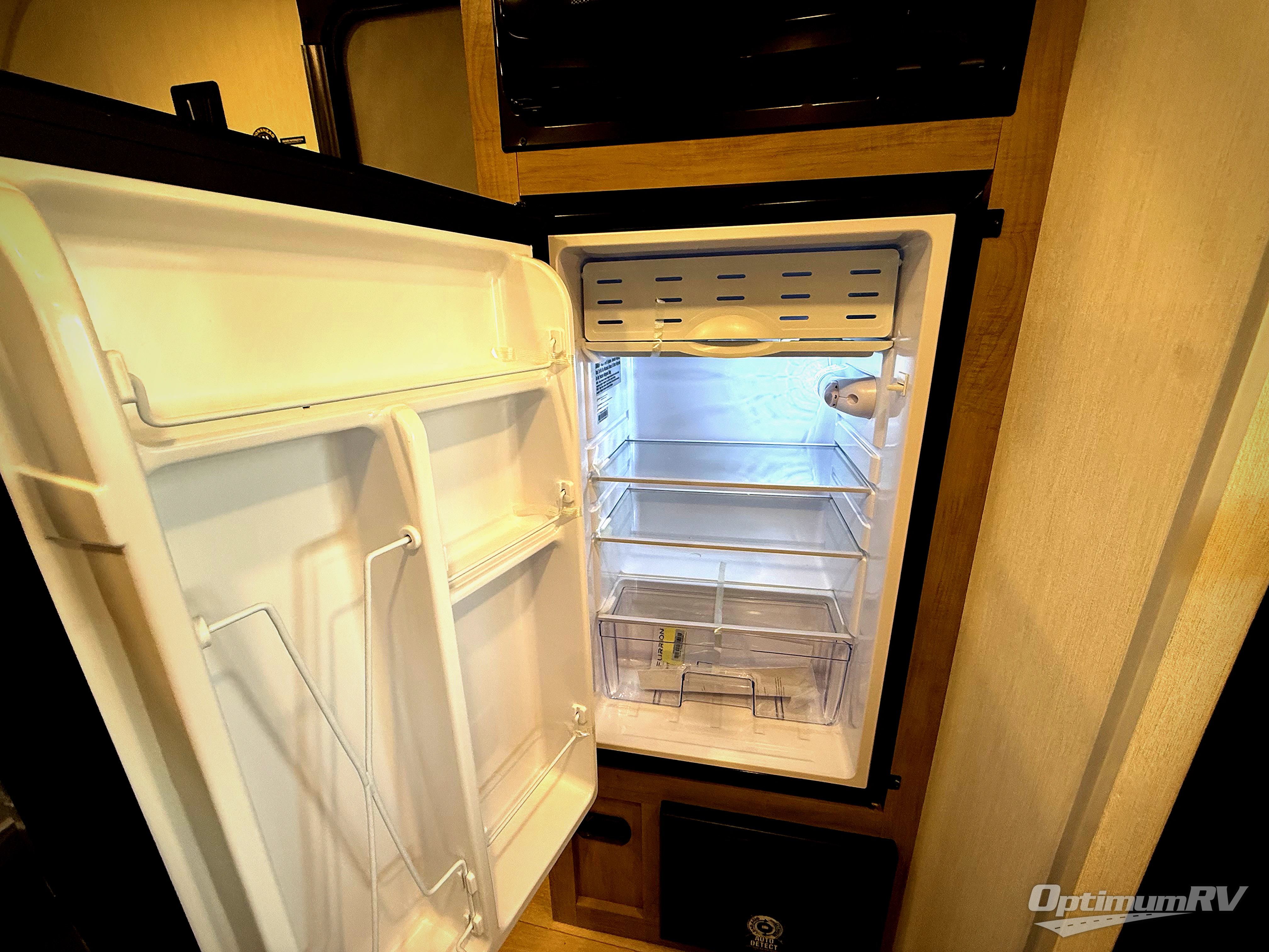 You will be enchanted by this travel trailer! The bathroom is equipped with everything you need for a comfortable stay. The kitchen is equipped with a refrigerator for keeping drinks and perishables fresh, a microwave for quick reheating, and a cooktop for preparing meals. The sofa provides a comfortable seating area for relaxation and an extra sleeping area. Overhead cabinets and a shelf provide additional storage for essentials, cookware, and dishes. The queen-sized bed allows a comfortable sleeping space, perfect for unwinding after a long day.