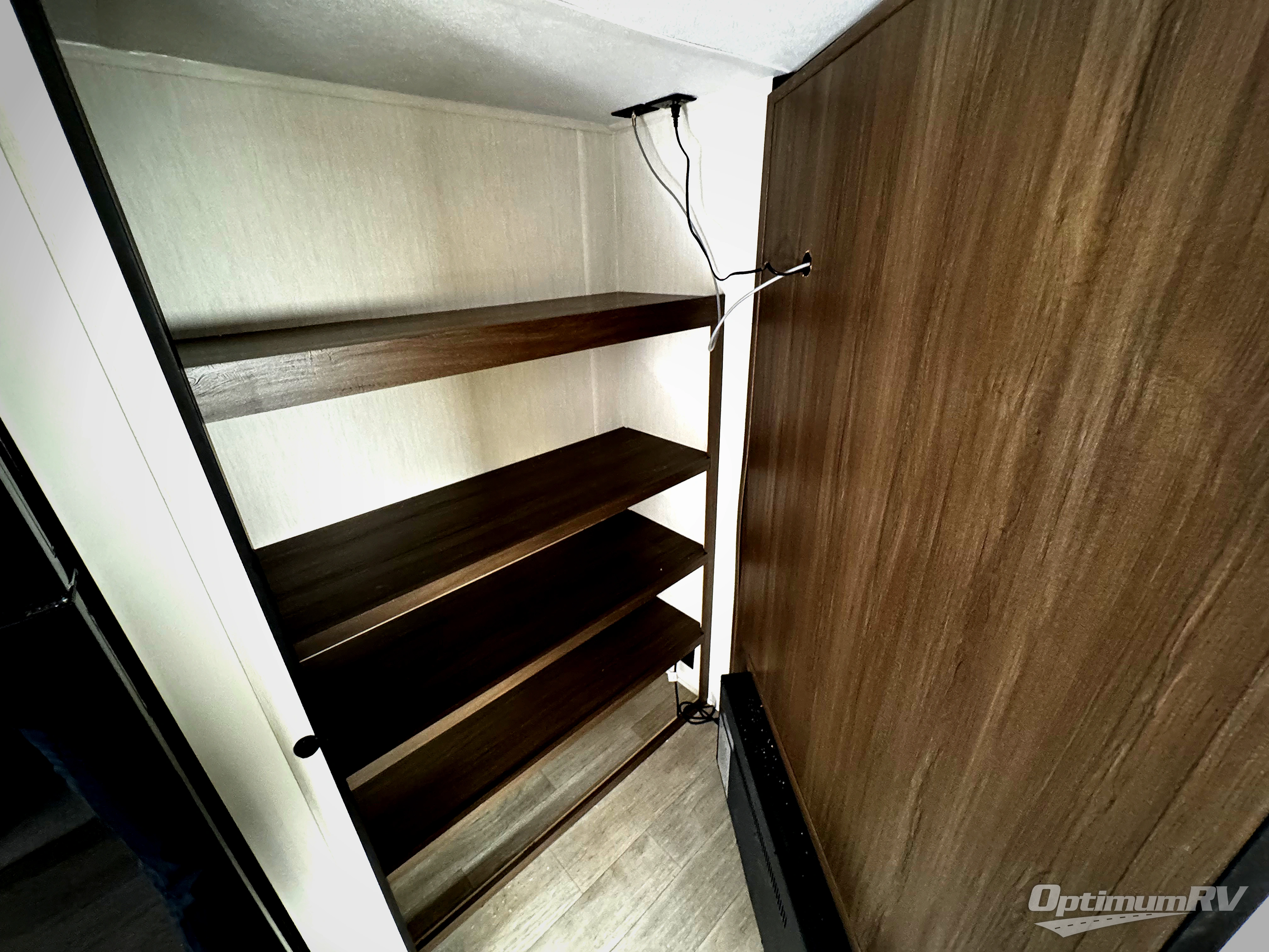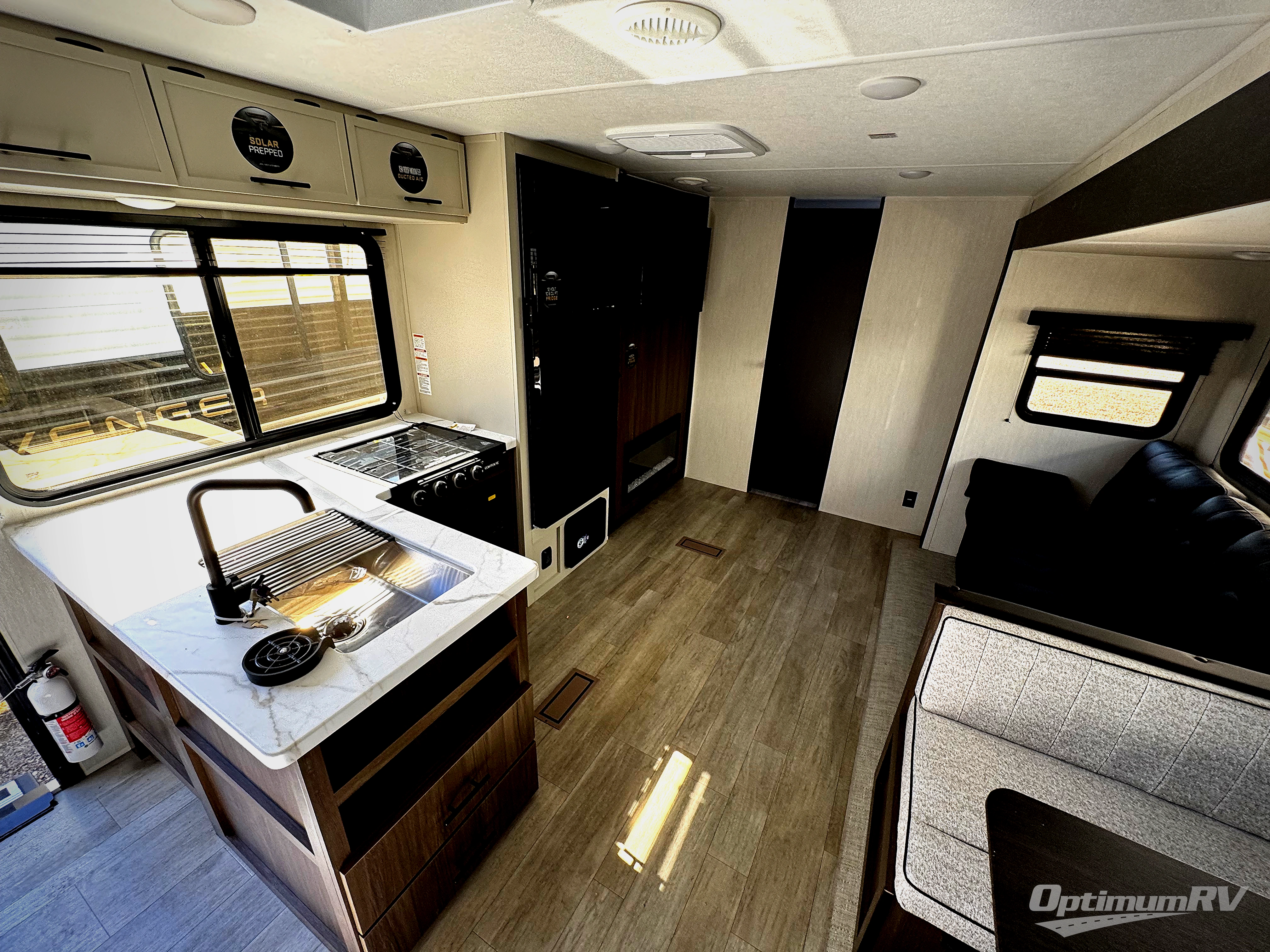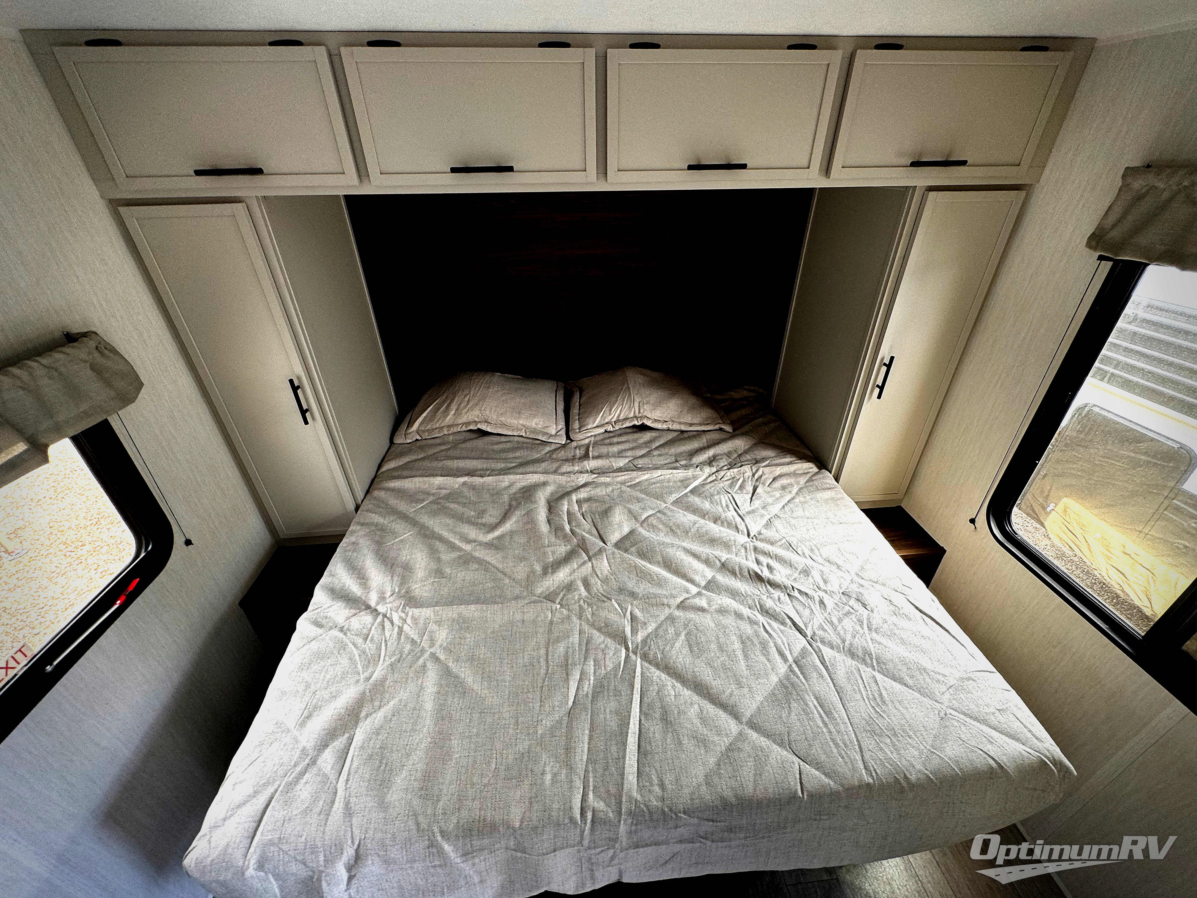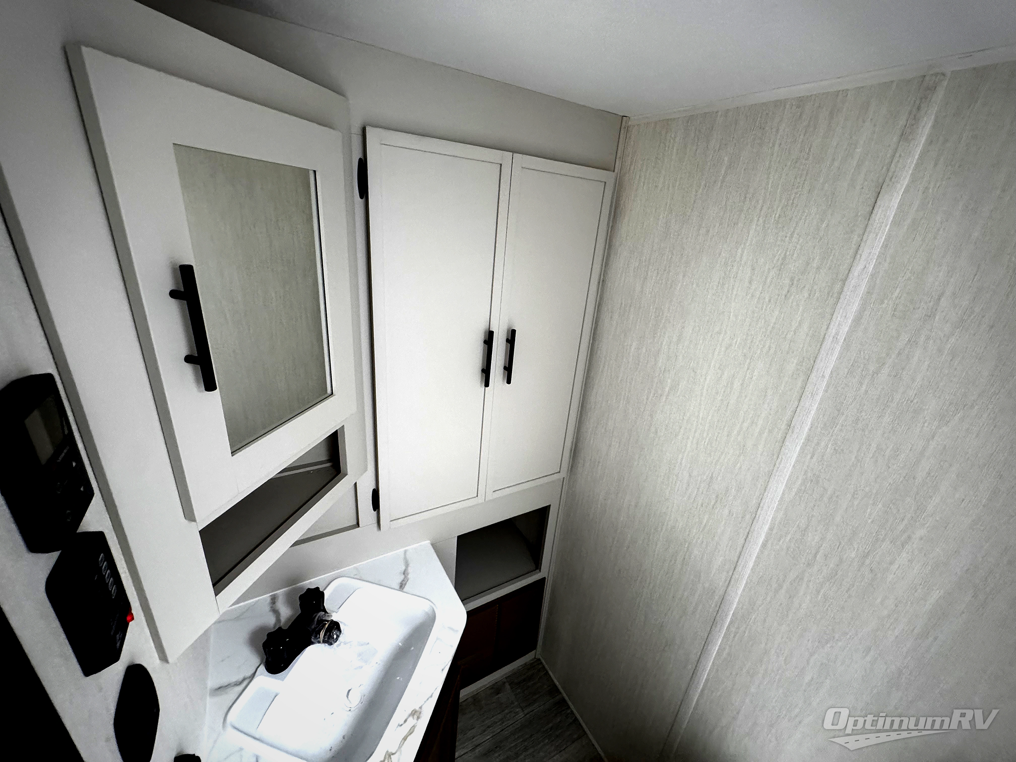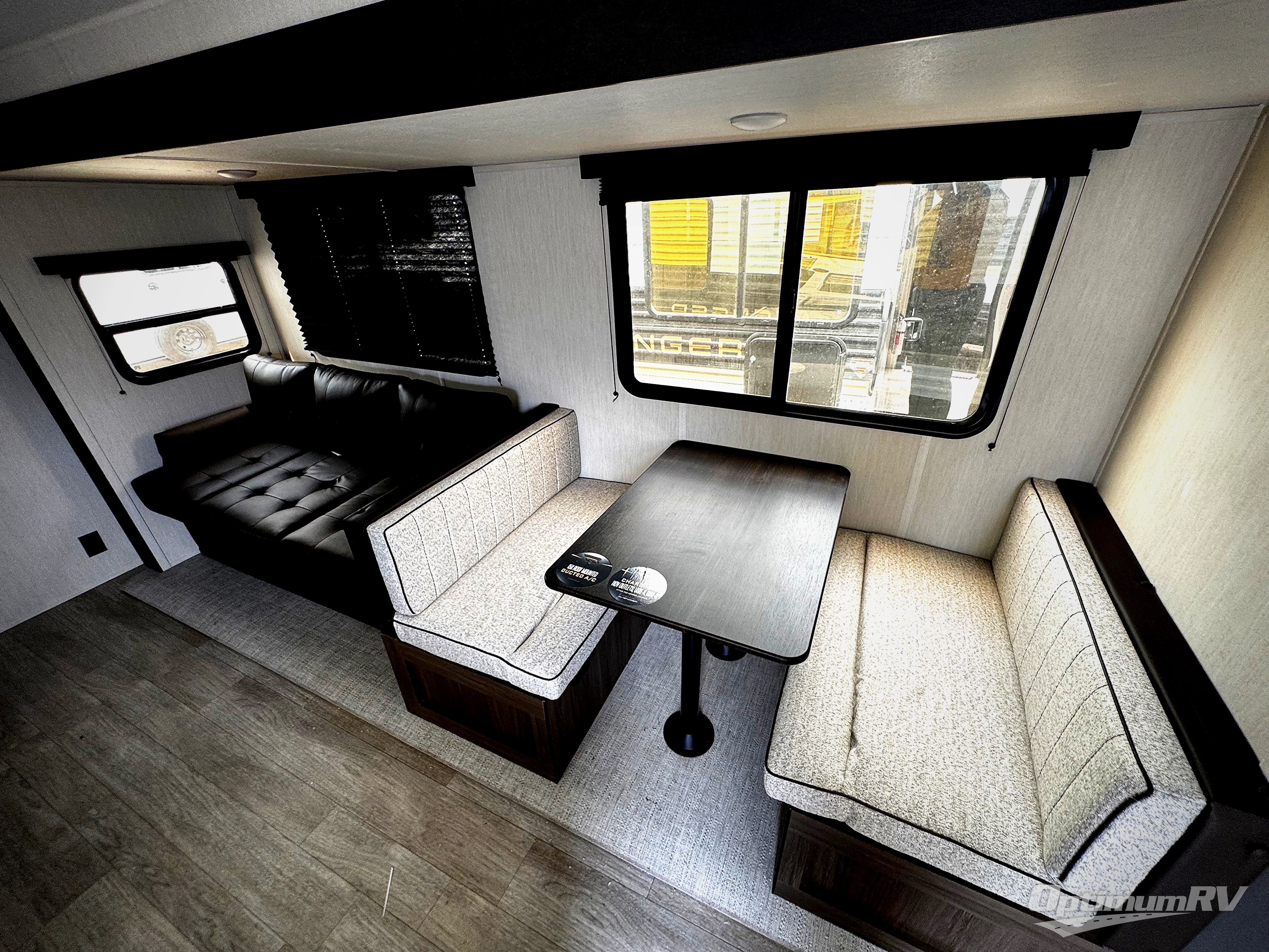 You'll appreciate the added space in this travel trailer thanks to the large slide out! The booth dinette and sofa are found here, and there is a moveable storage ottoman for extra blankets or board games. You'll have your own space up front in the private bedroom, complete with a camp king bed and storage for your things. The chef of your group will find a three burner cooktop and a built-in convection microwave with an air fryer to cook meals, plus there is a 12V refrigerator and hidden pantry for food storage. This unit also includes a power awning outdoors and an outside refrigerator to keep cold drinks close by.