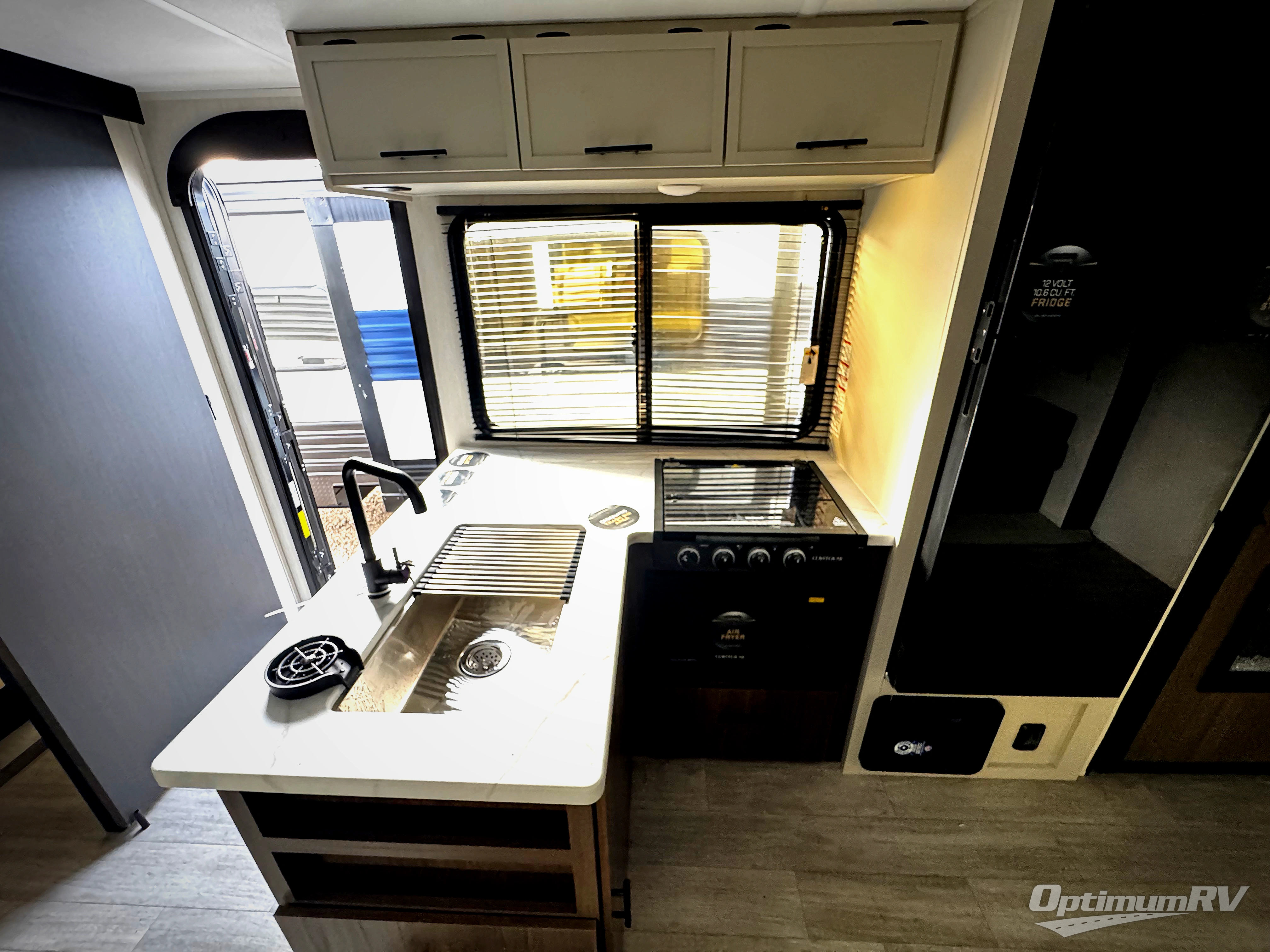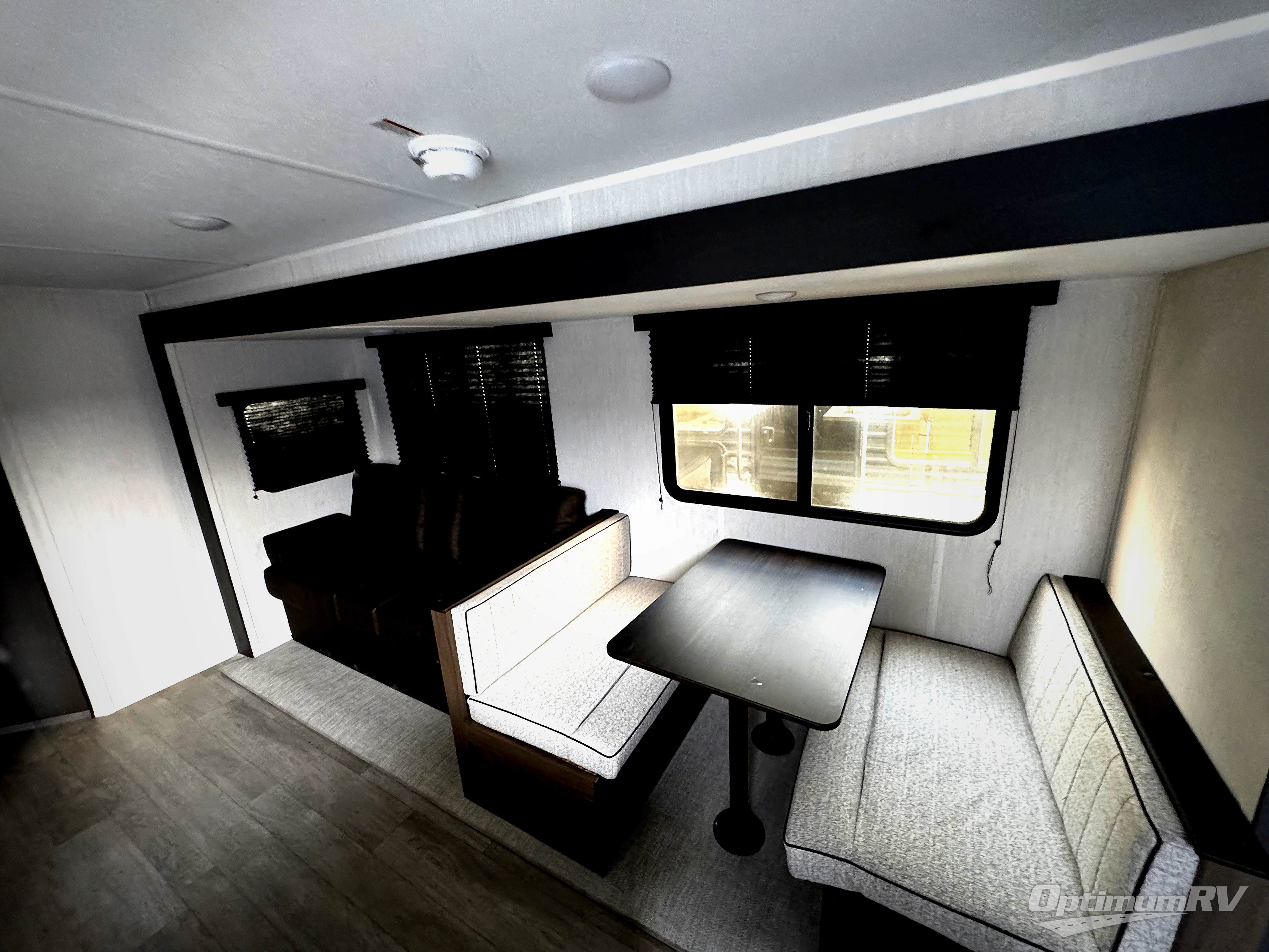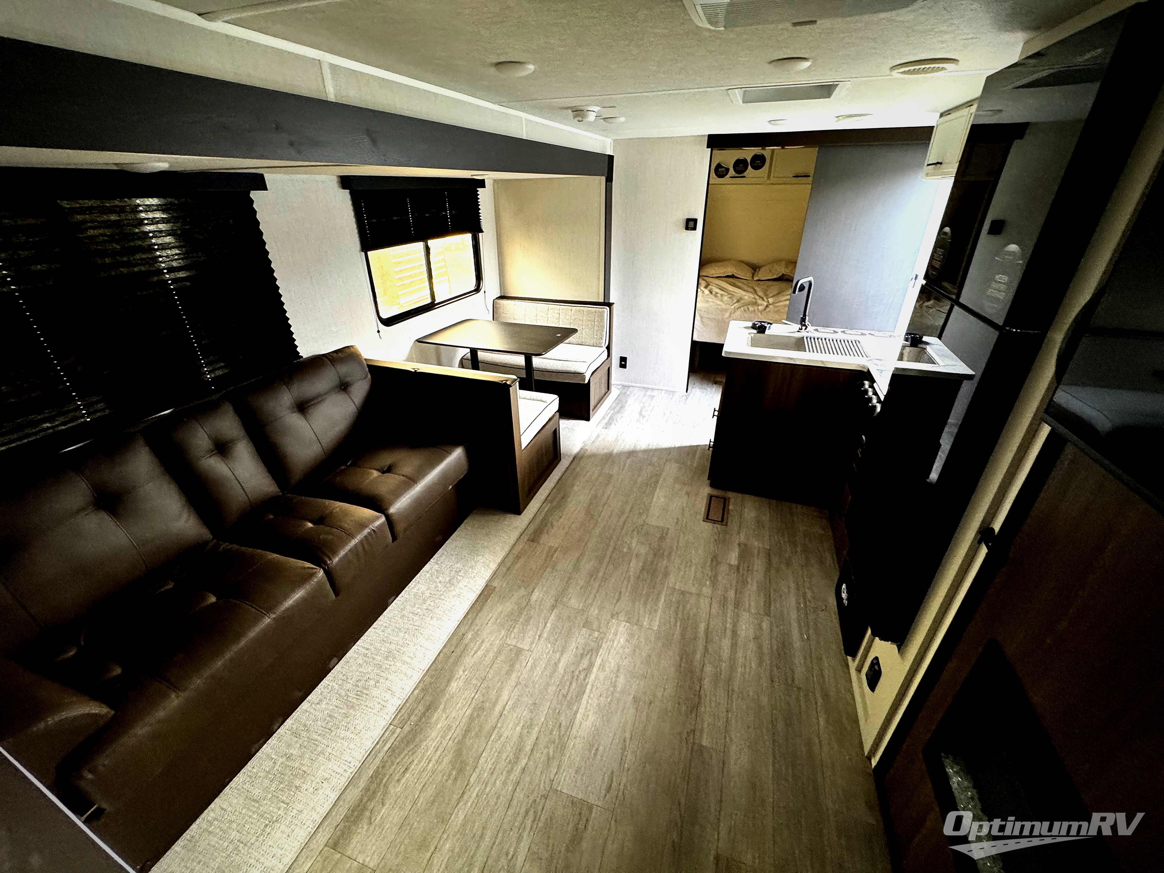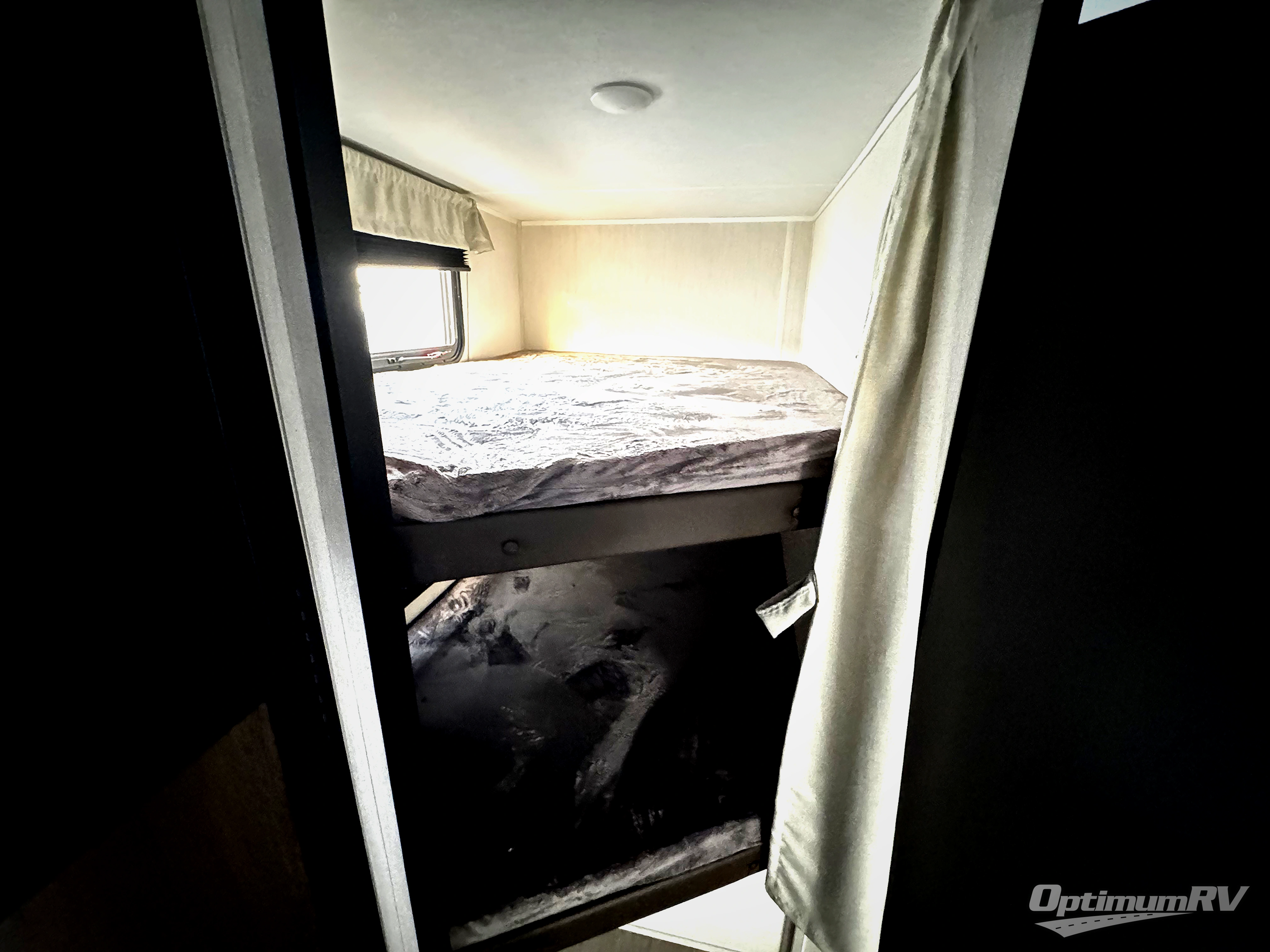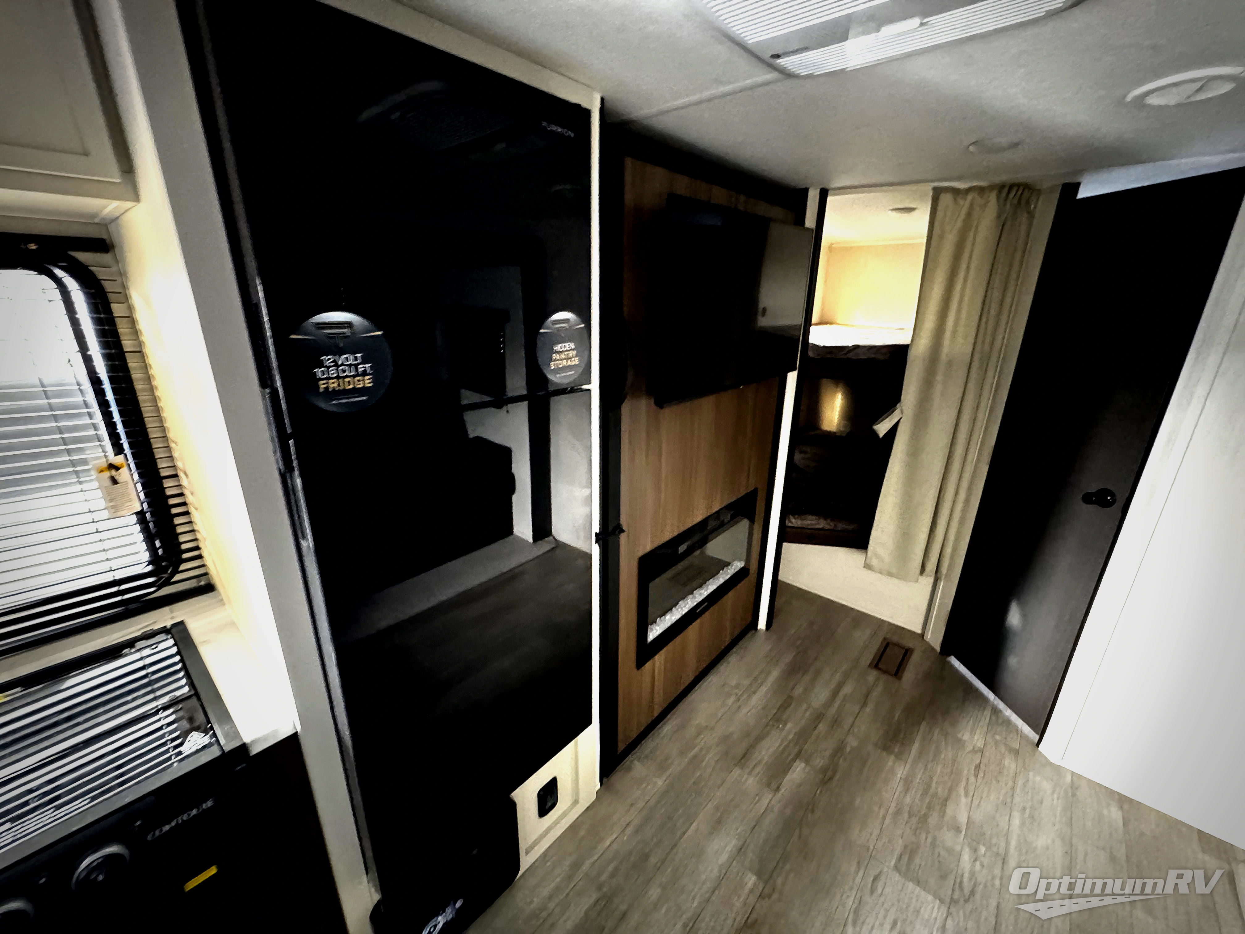 You'll appreciate the added space in this travel trailer thanks to the large slide out! The booth dinette and sofa are found here, and there is a moveable storage ottoman for extra blankets or board games. You'll have your own space up front in the private bedroom, complete with a camp king bed and storage for your things, while your guests take the double-size bunk beds towards the back. The chef of your group will find a three-burner cooktop and a built-in convection microwave with an air fryer to cook meals, plus there is a 12V refrigerator and large hidden pantry for food storage. This unit also includes a power awning outdoors and an outside refrigerator to keep cold drinks close by.