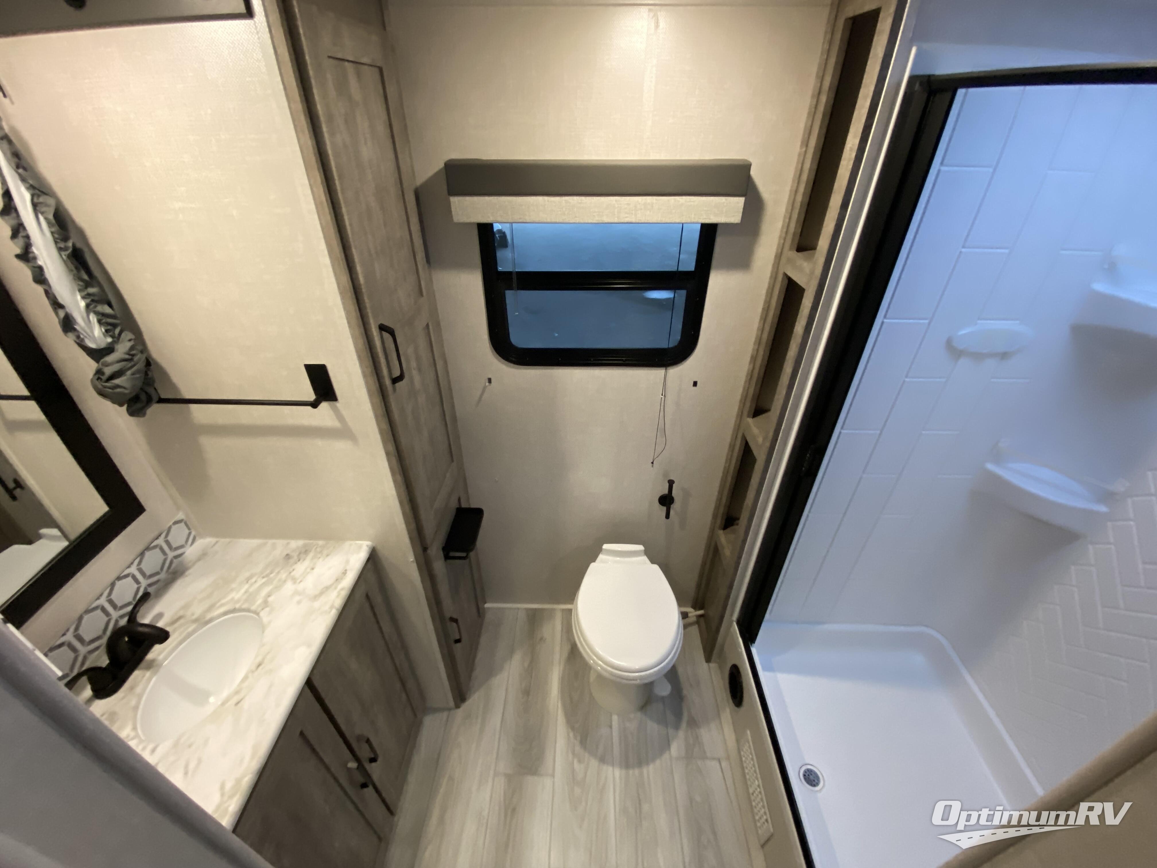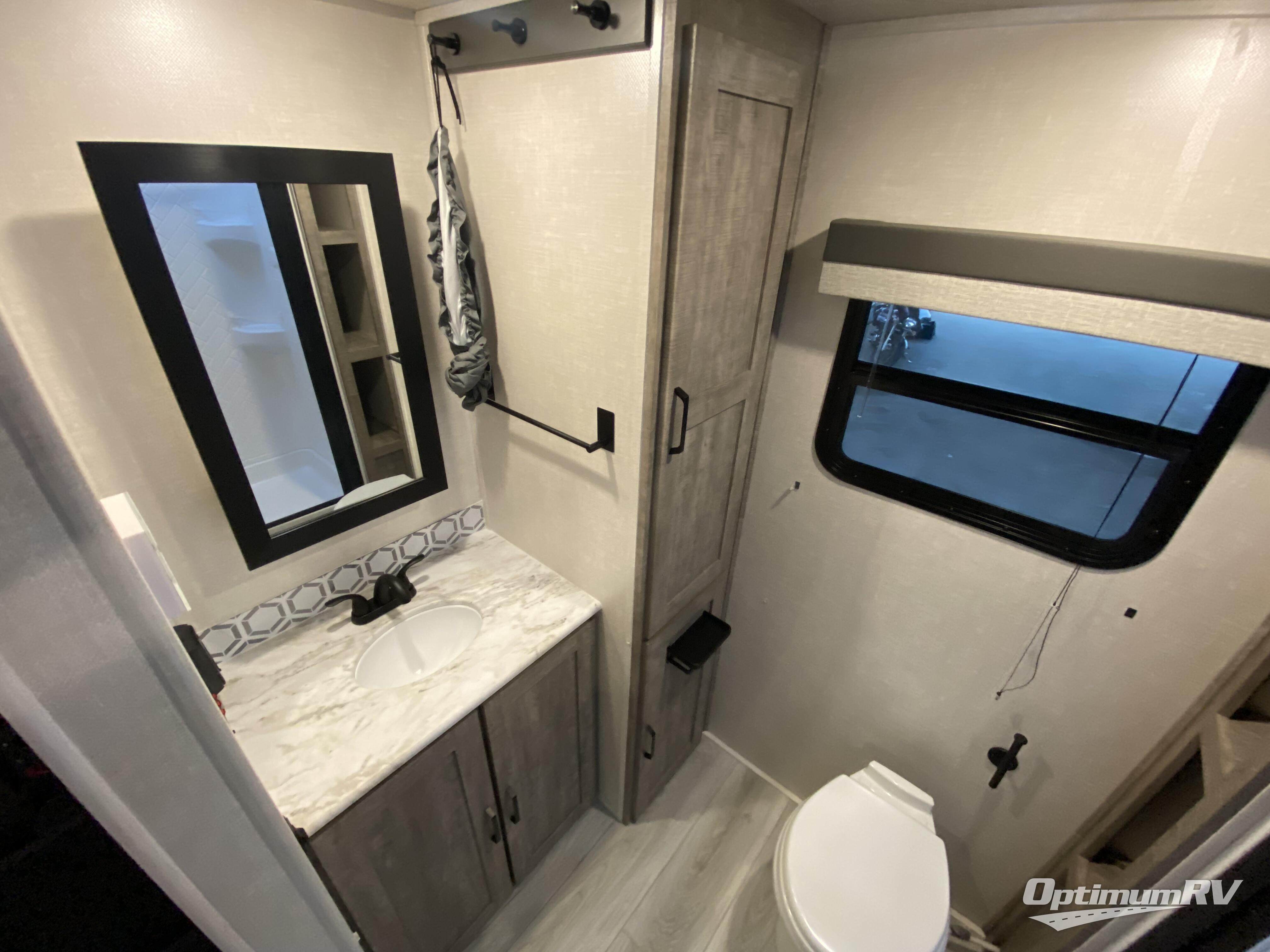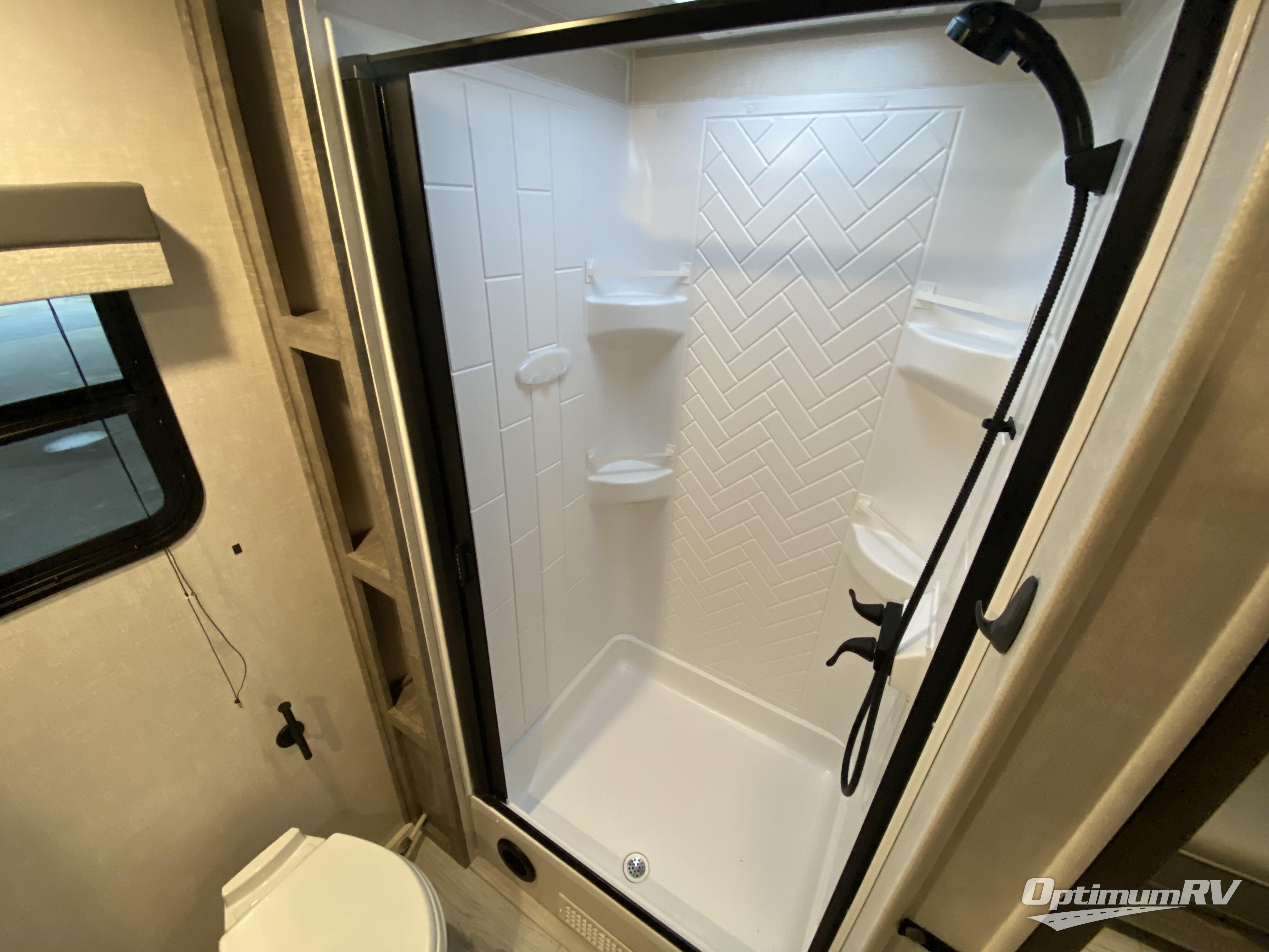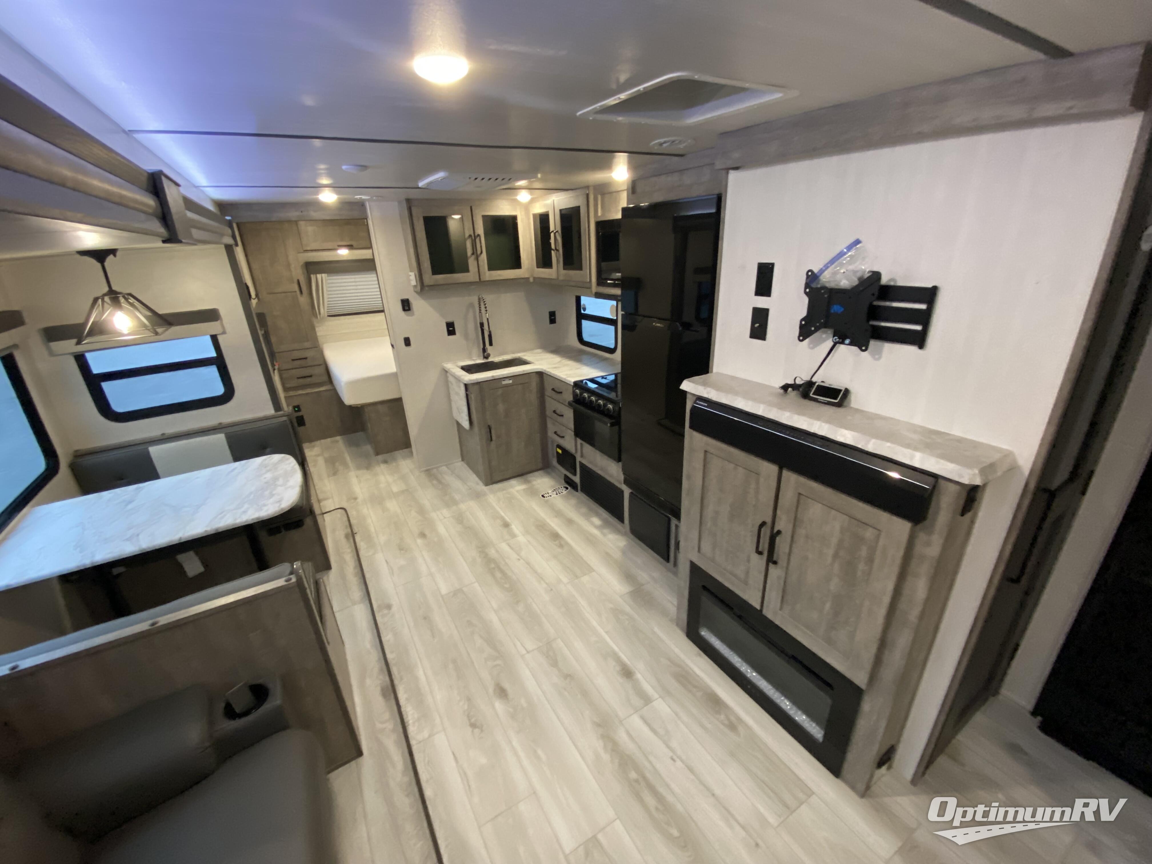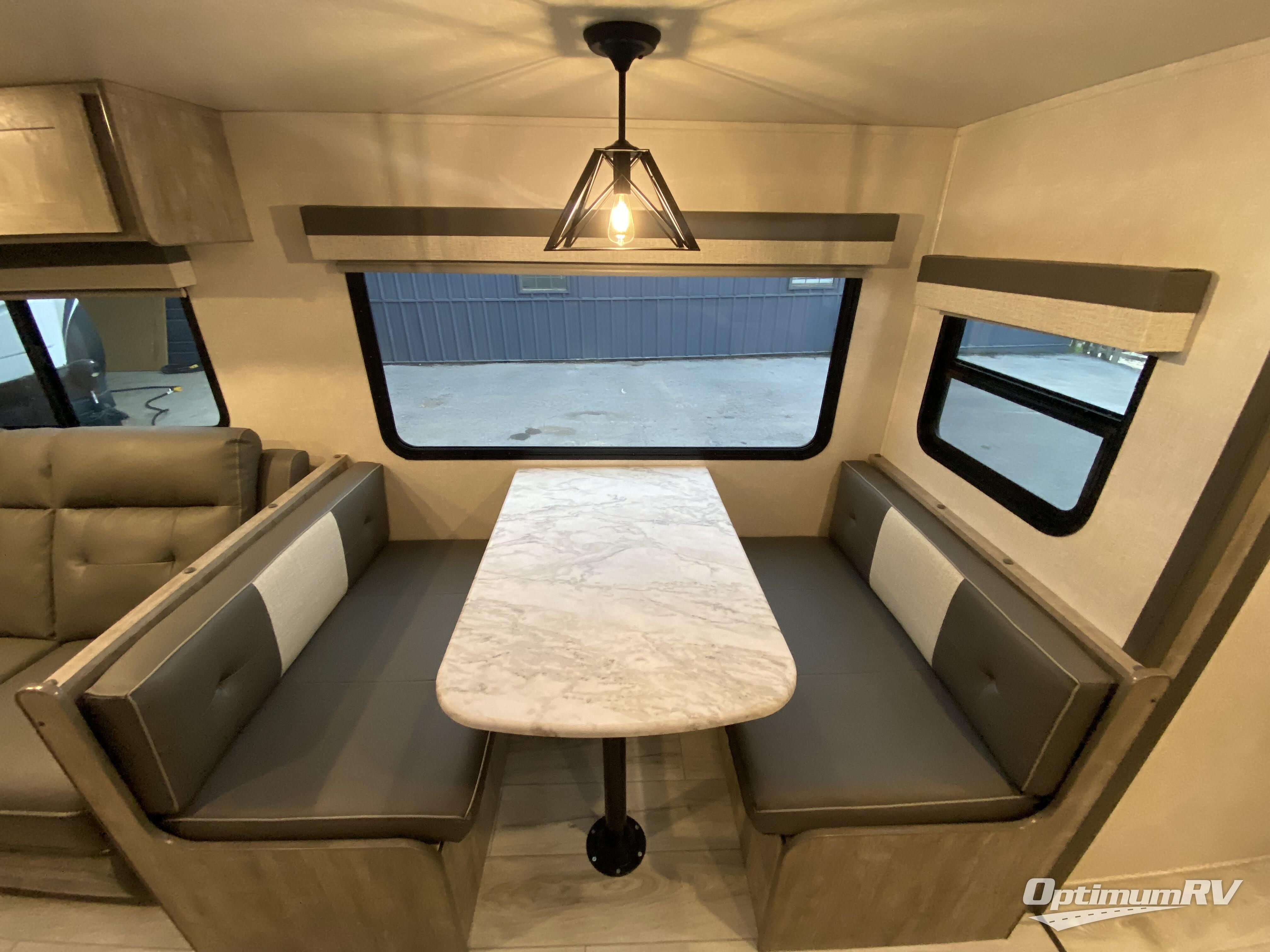 No need to rough it when you camp; this trailer offers amenities that allow you to "Glamp" if you want! The rear spacious bathroom is tucked away behind a beautiful barn door, and inside features a 30" x 36" shower, wardrobe, and linen storage. The front master bedroom offers privacy, a walk-around queen bed, two wardrobes, "Cubbie" storage at the head of the bed, USB ports for your electronics, and massive under bed storage for extra blankets and pillows. The L-shaped counter in the kitchen provides enough space to have everything at your fingertips while you cook, plus there is a countertop extension for more prep and serving space if needed. A nice walk-in pantry just inside the entry door will be perfect for chips and snacks or canned goods for those longer camping trips. If dining inside, the booth dinette with EZ-Access storage beneath will be comfortable plus you will enjoy the view provided by the panoramic windows within the slide out. An outside kitchen will be a favorite for anyone that cooks, and the 19' awning will provide some protection from the elements and offering an outdoor living area to enjoy with everyone.
