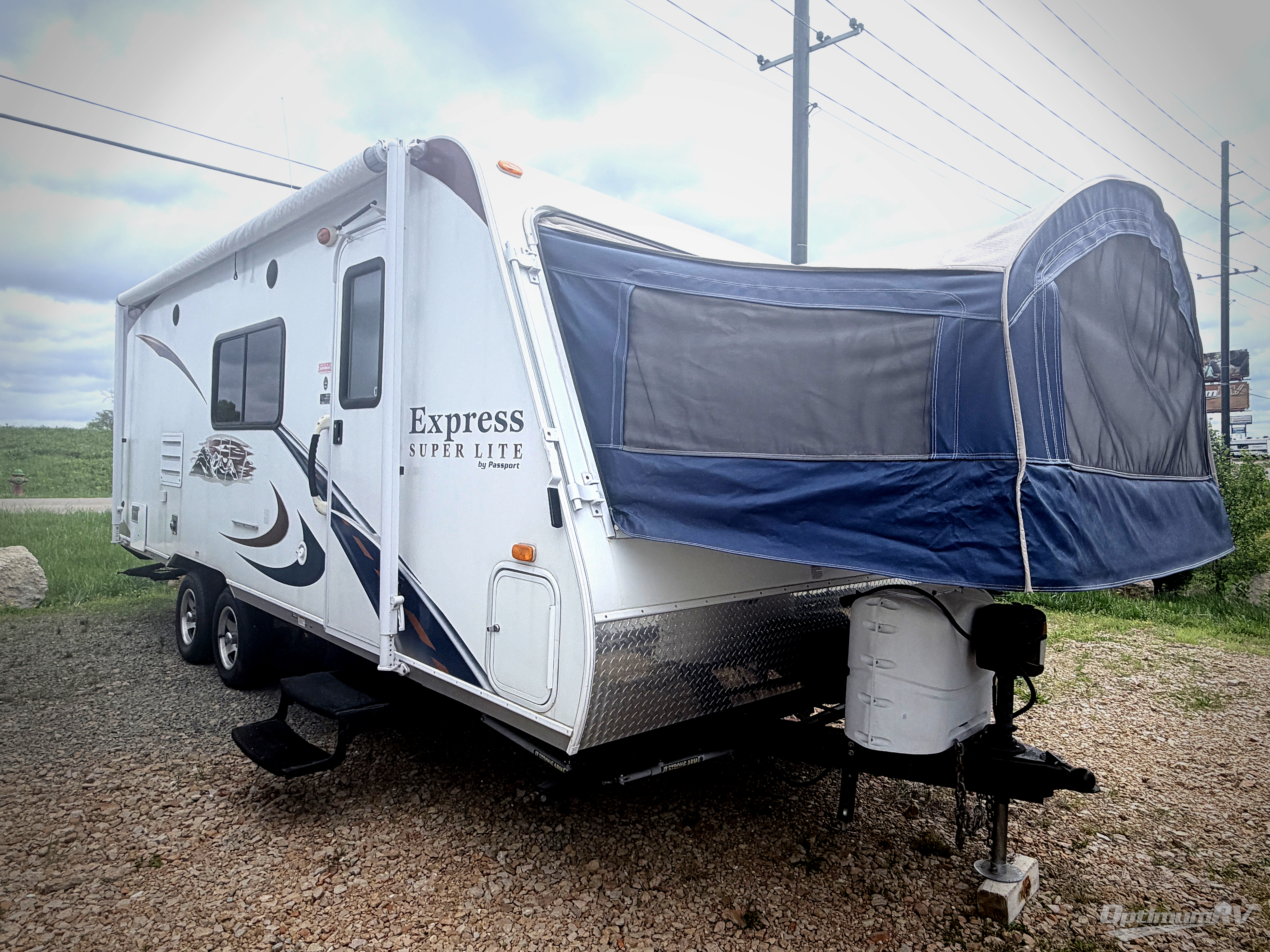 Passport Express SL Expandable by Keystone RV w/Front & Rear Queen Tent End Beds, Corner Bath w/Angle Shower, Toilet & Sink, Wardrobe, Refrigerator, U-Dinette w/Overhead Cabinet, 2 Small Wardrobes Each Side of Front Tent End Bed, 3 Burner Range/Dbl. Kitchen Sink & Fold-Down Sofa Slide, Pass-Thru Storage and More!