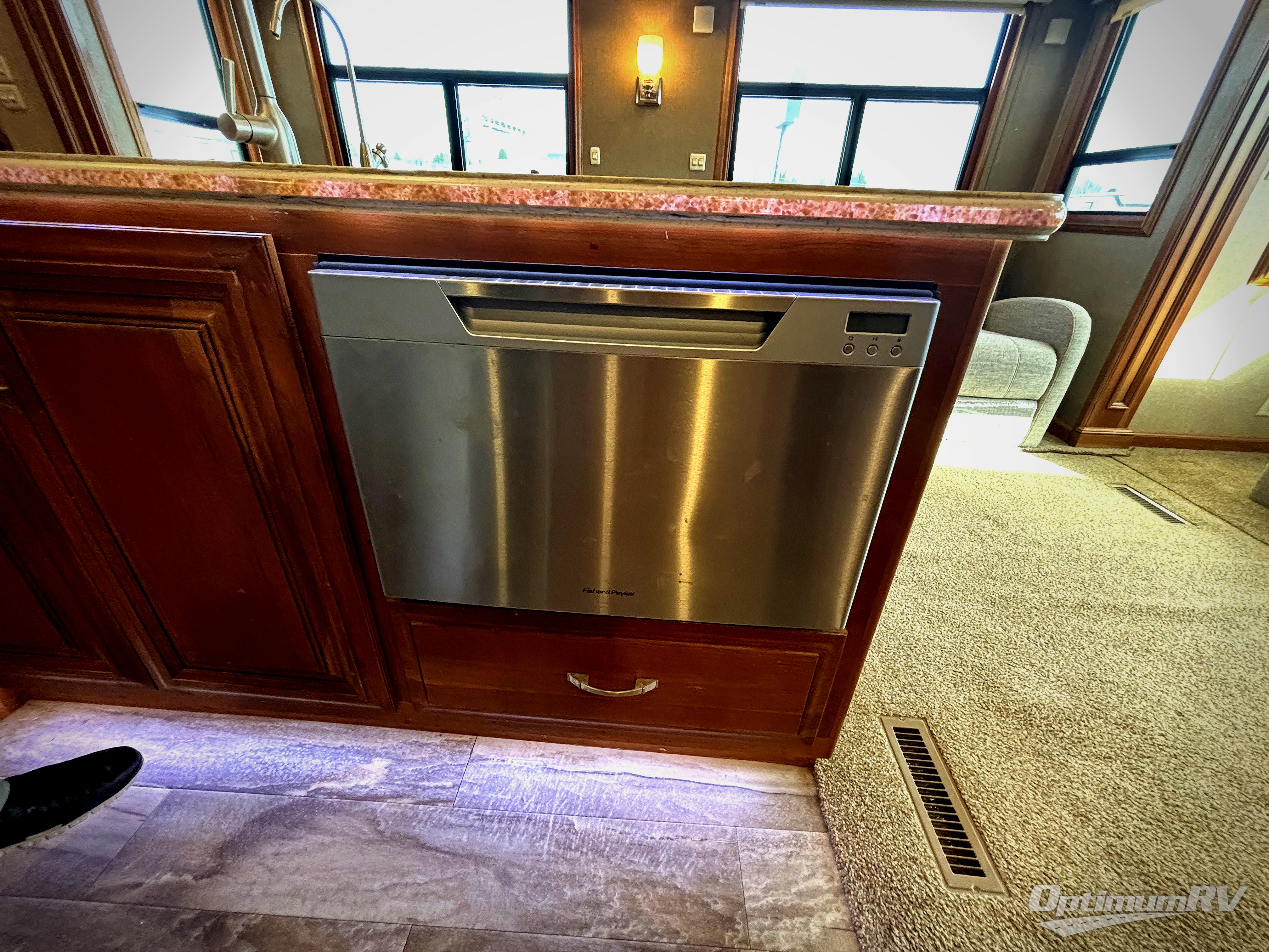 The opposite slide features the kitchen appliances and the living room entertainment center with power lift TV including an optional fireplace below. In the kitchen area you will find a refrigerator, a three burner range, counter space, and overhead storage in the slide. The convenient island provides more counter space, plus a dishwasher, double sinks, and trash container. Off to the side of the island there is a hutch with upper and lower storage, plus a pantry.