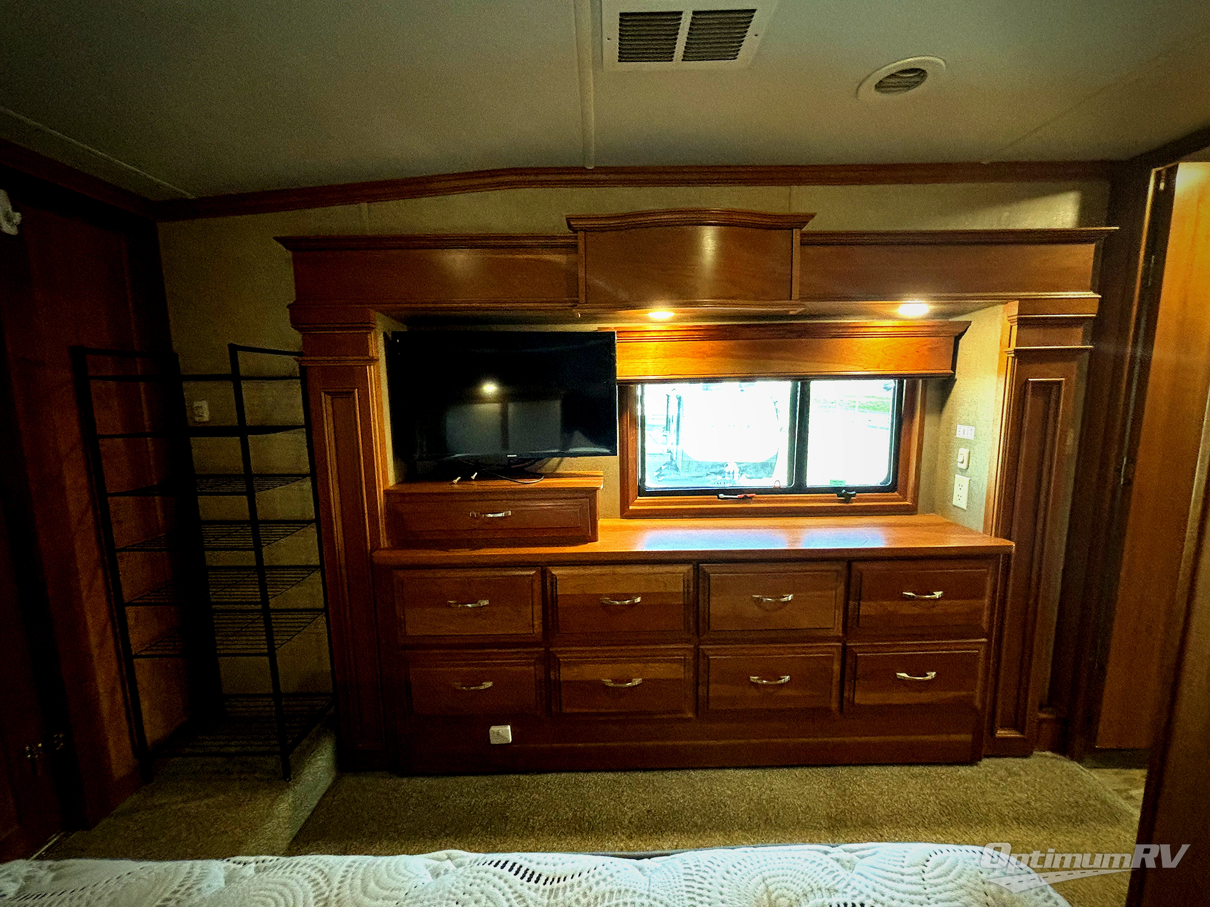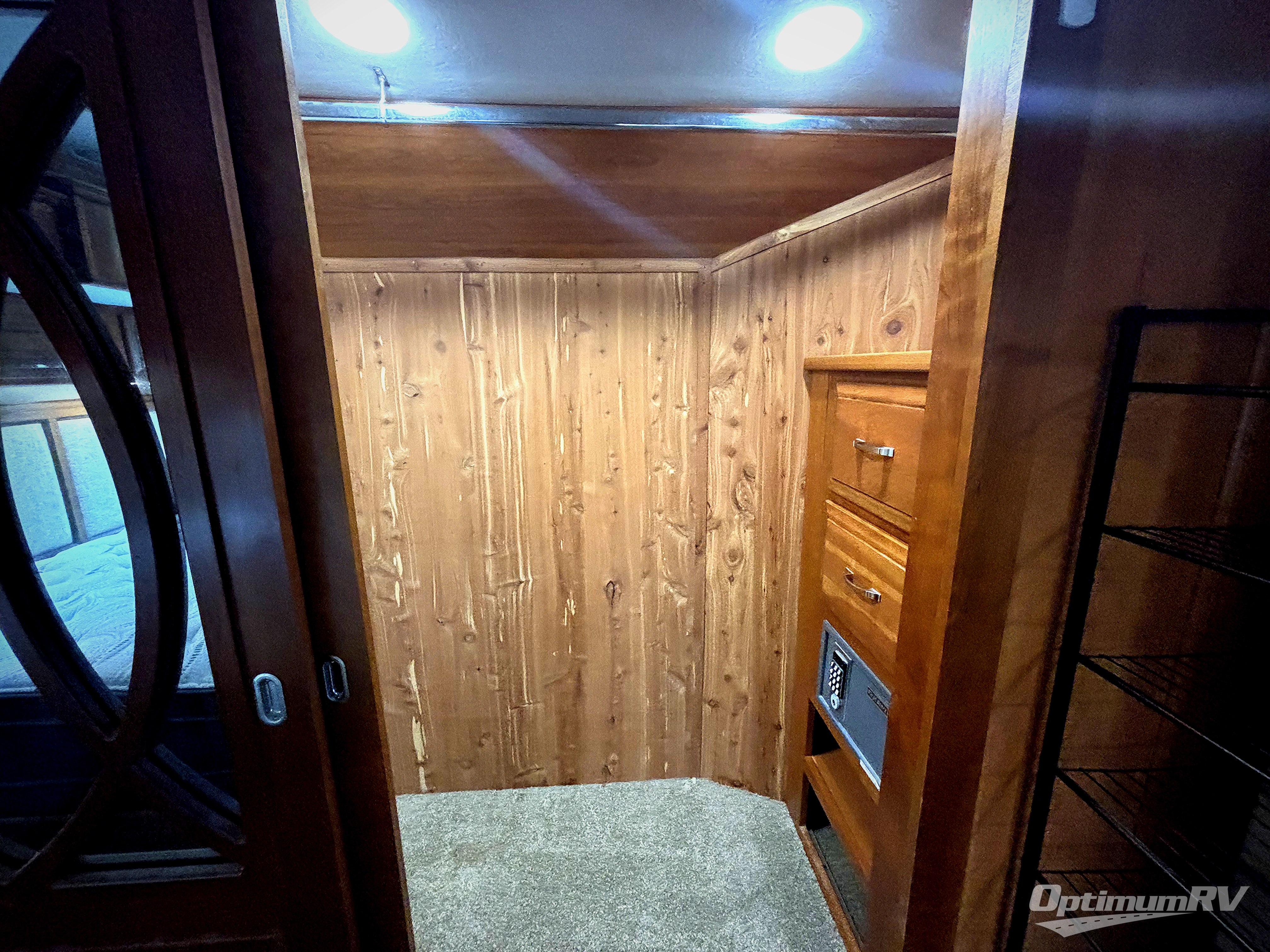 Beyond the bath is a front master bedroom with slide out king size bed. There is a full front wall wardrobe with sliding doors. Inside find a chest and dresser storage. A vanity slide out opposite the bed features drawers, a TV, and so much more!