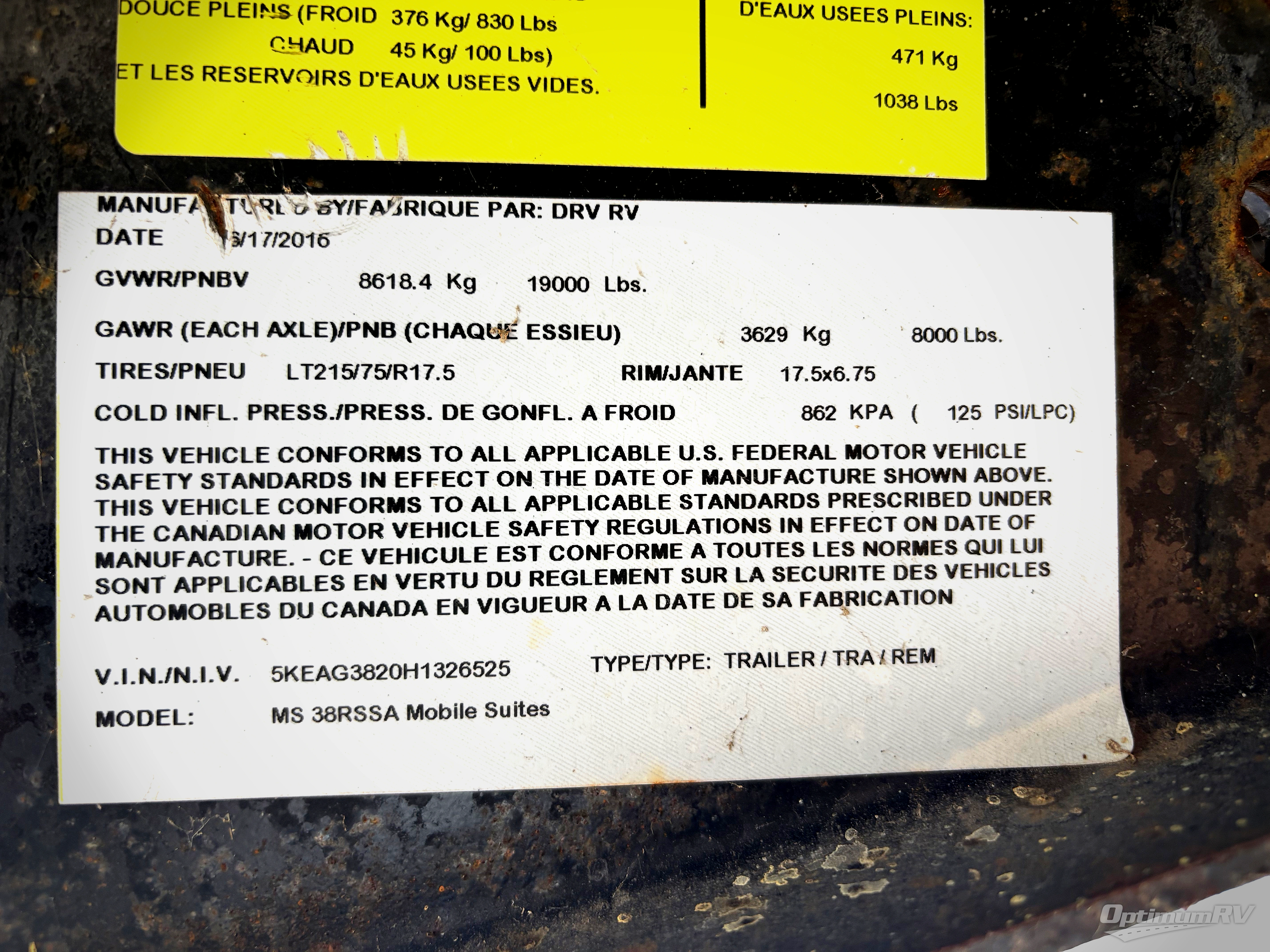 This Mobile Suites fifth wheel 38 RSSA by DRV Suites offers quadruple slide outs for added interior space, a rear living layout, king bed, kitchen island, and so much more!