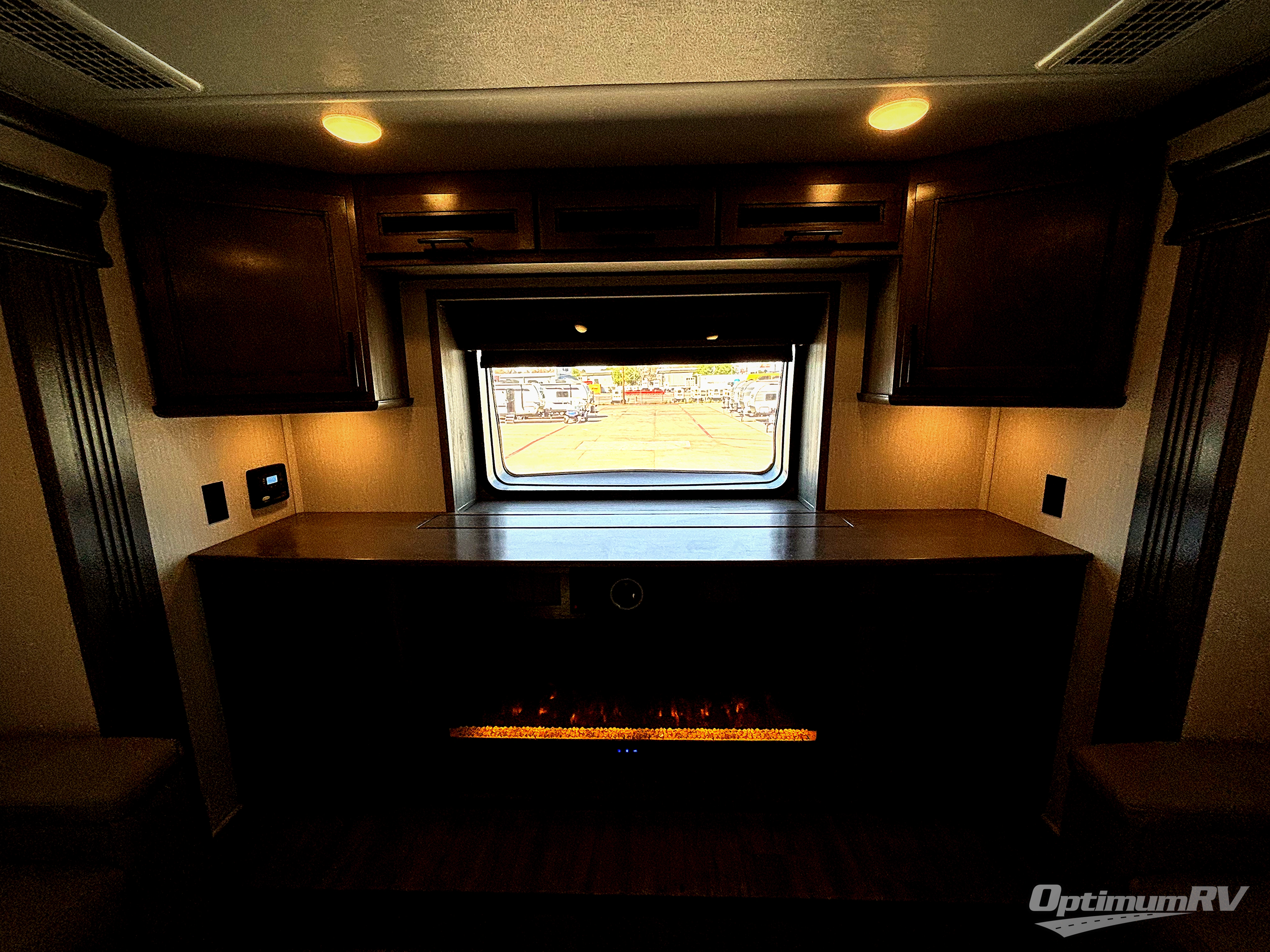 This RiverStone fifth wheel is a force to be reckoned with! It has a front living room that will make you feel right at home with its opposing E-Z glide sofa beds, theater sofa, 50" pop-up TV, and fireplace. The kitchen is where you will find the 18-cubic foot French door refrigerator with ice maker, the four-burner range, the island, and the half bathroom. In the back of this unit is a master suite that contains a king-size bed and a full bathroom, so you'll be spending each of your nights in great luxury. When you step outside, you'll be covered with two electric awnings with LED lights, so you won't have to worry about getting a sunburn.